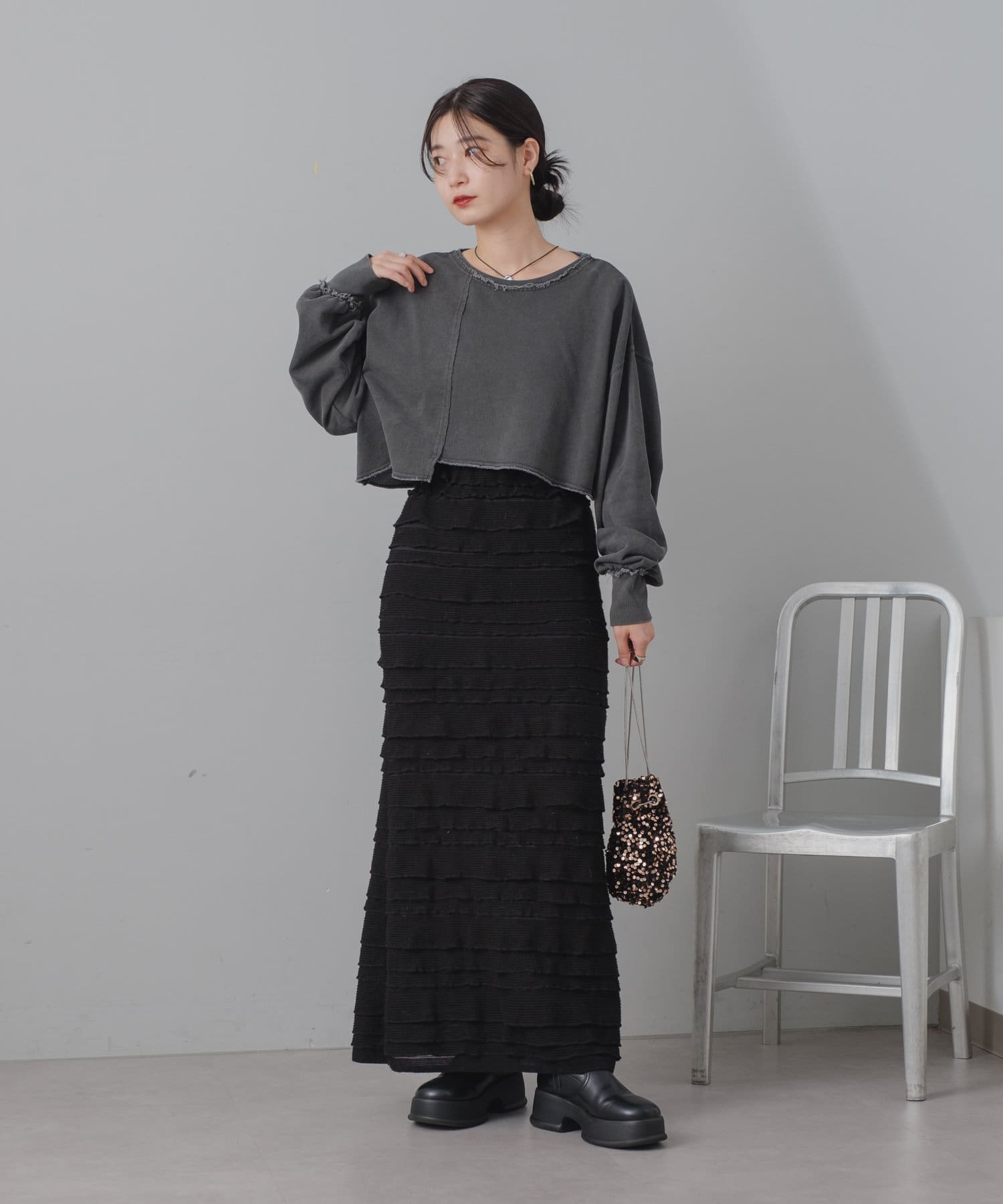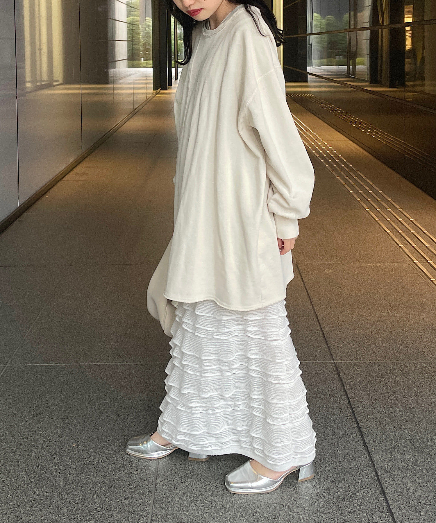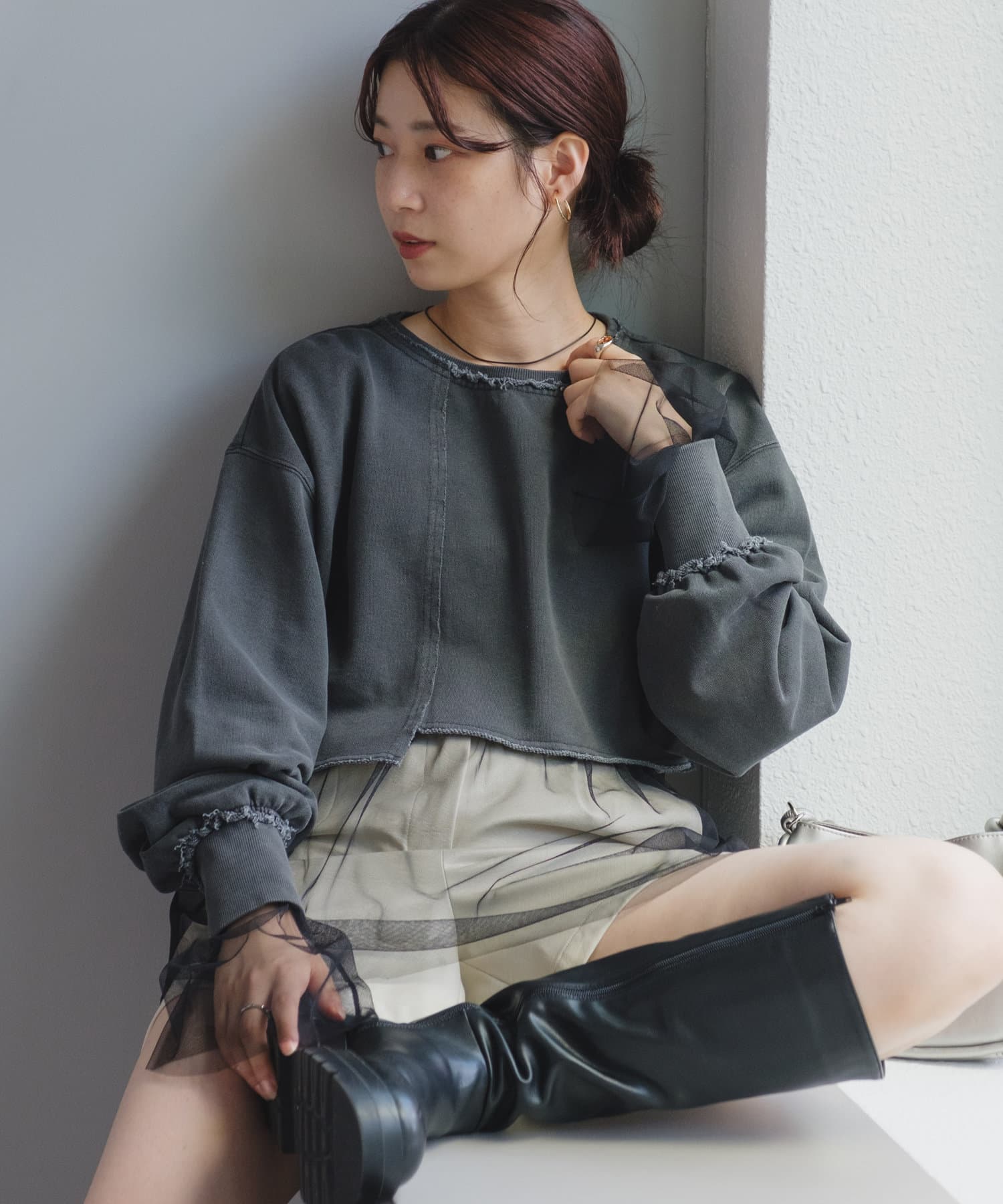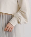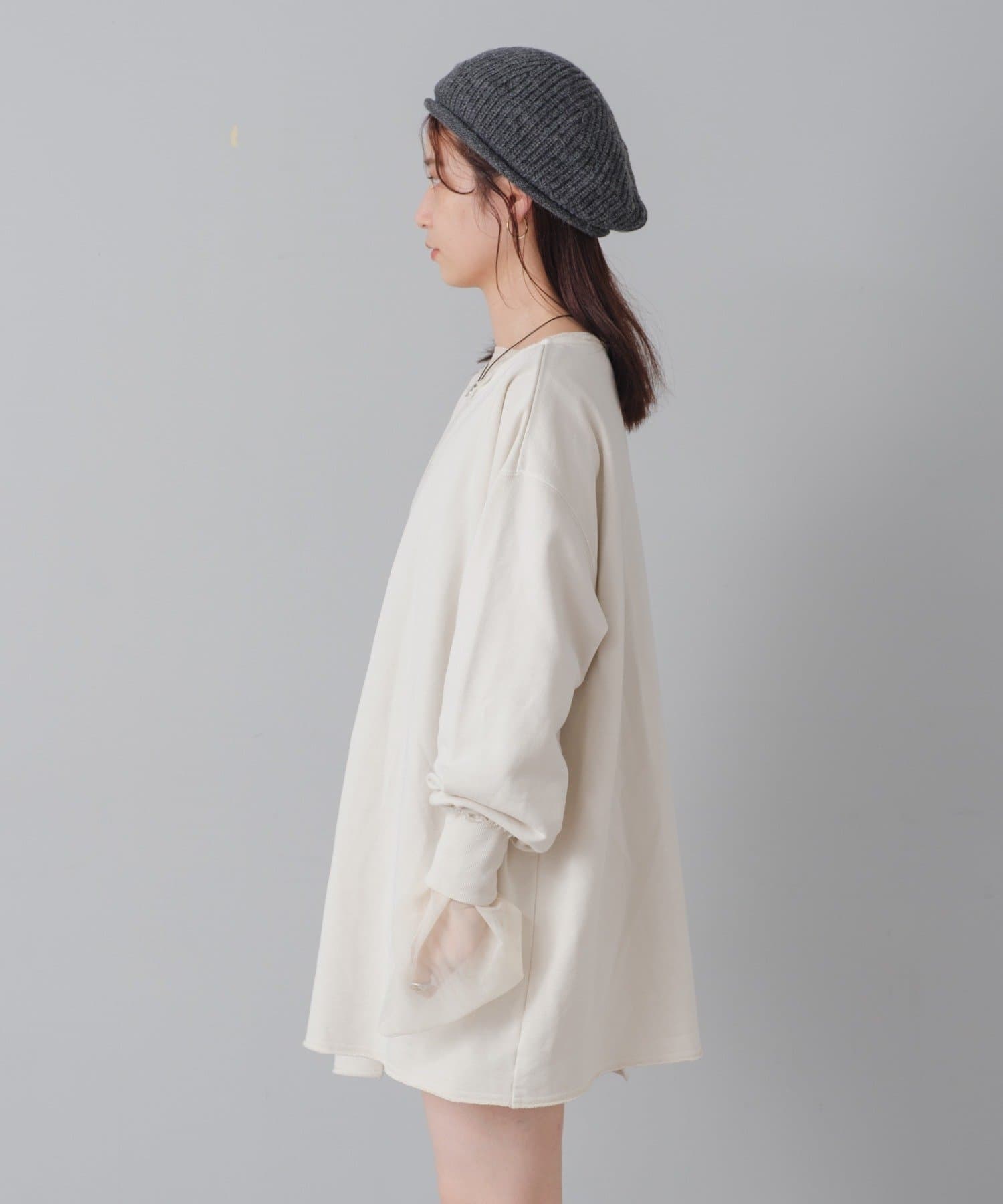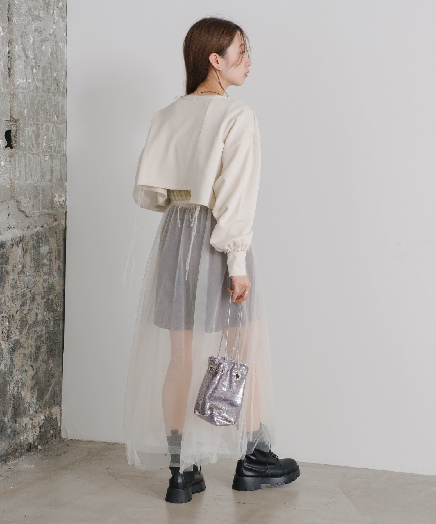 Sサイズはワイドパンツやロングスカートの他、キャミワンピースの上から被るなどのレイヤードスタイルもバランスよく着ていただけます。