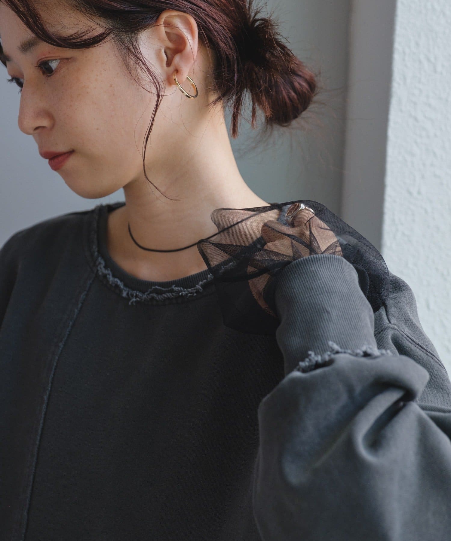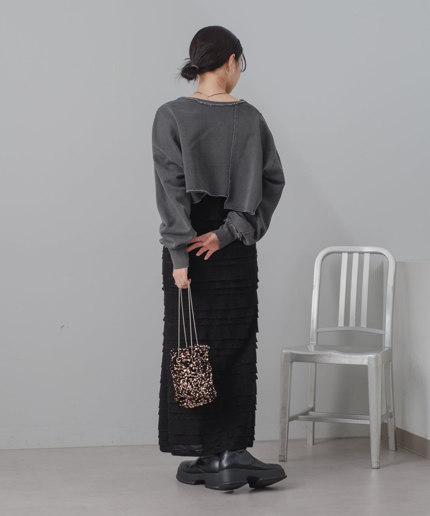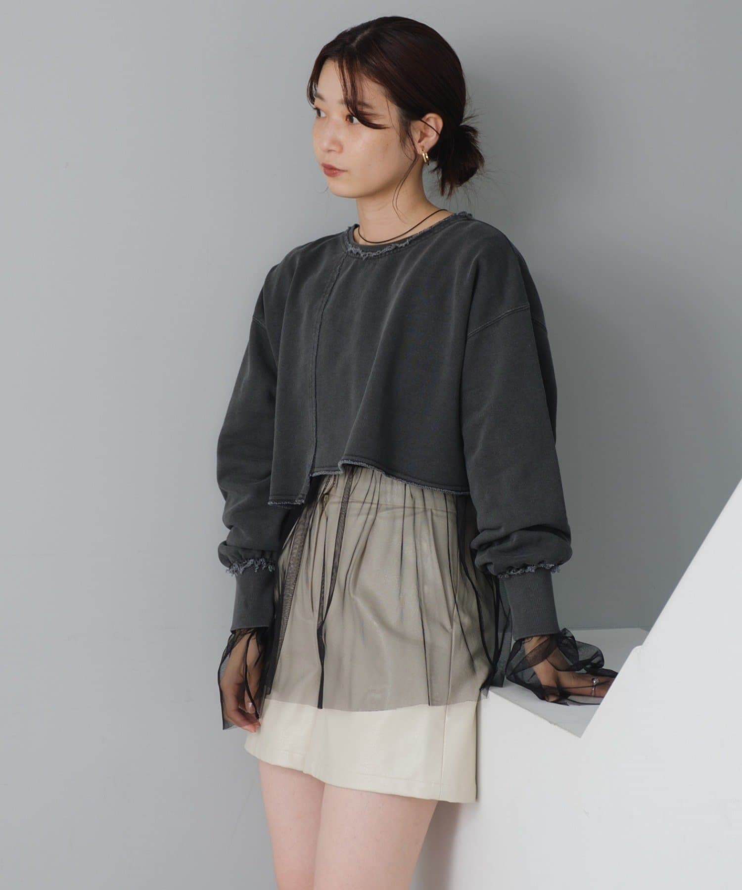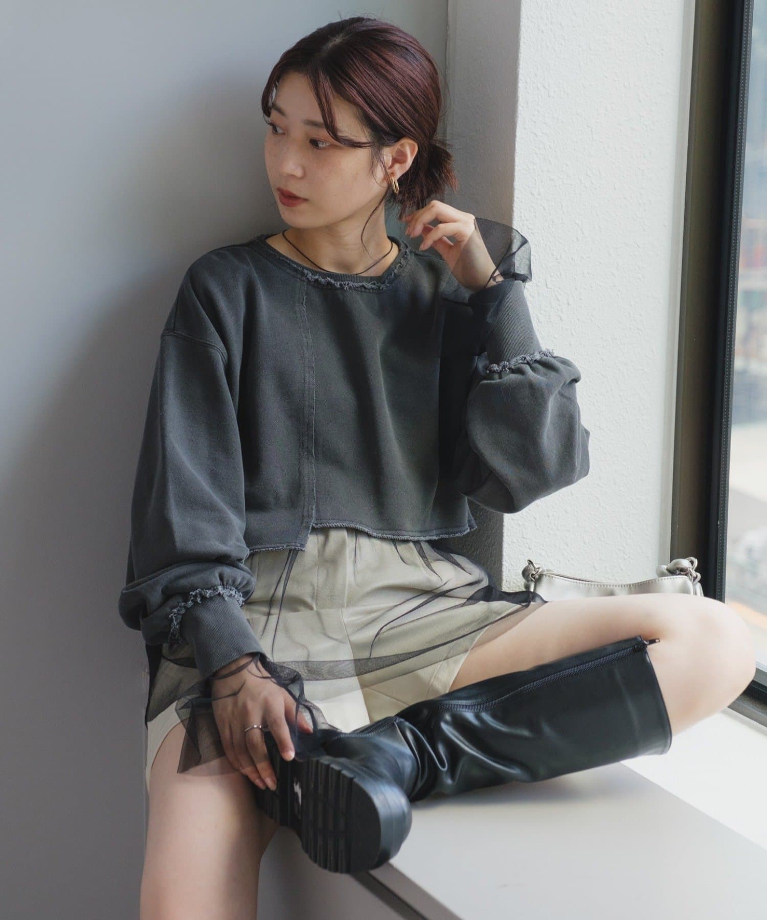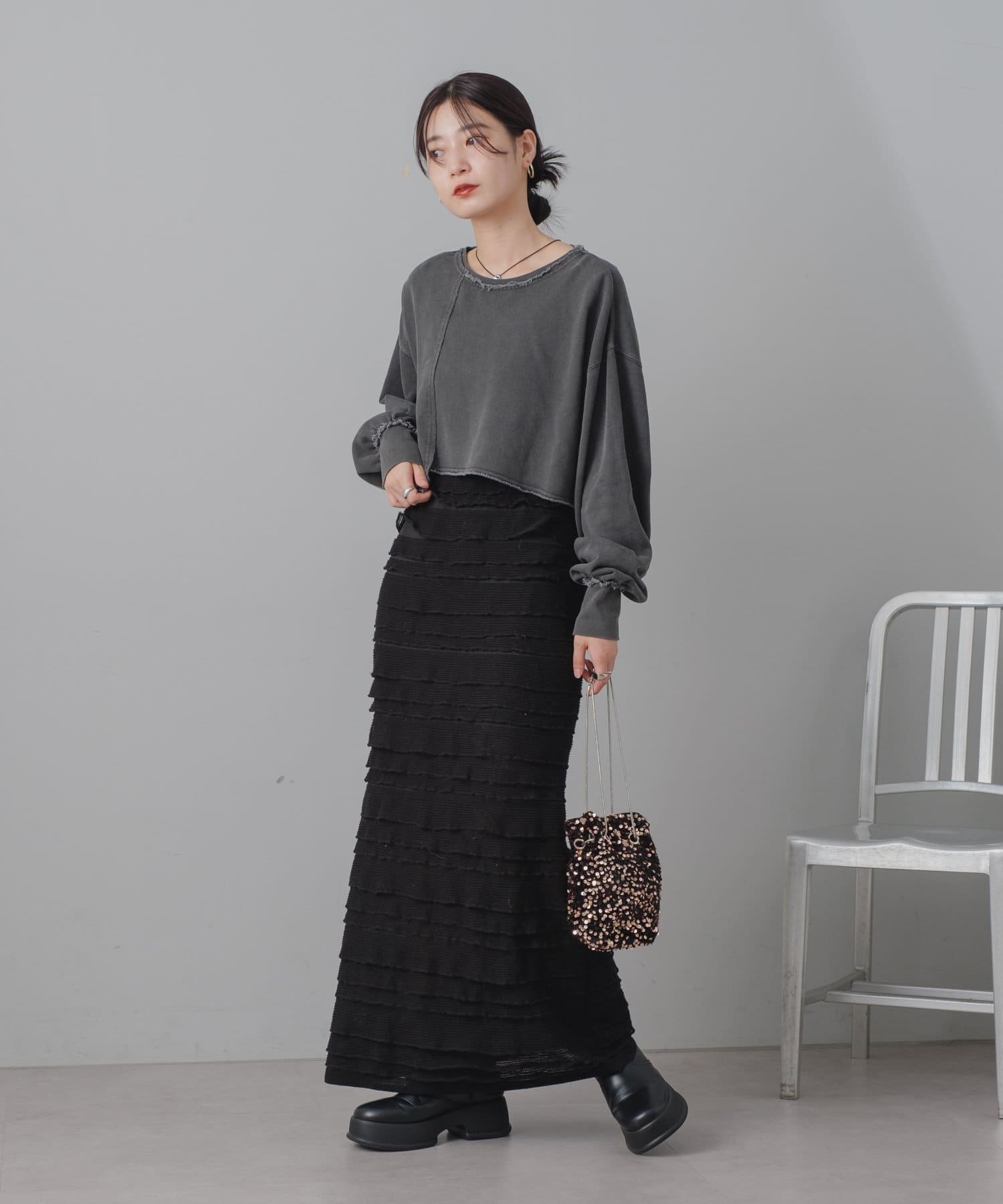 Sサイズはワイドパンツやロングスカートの他、キャミワンピースの上から被るなどのレイヤードスタイルもバランスよく着ていただけます。