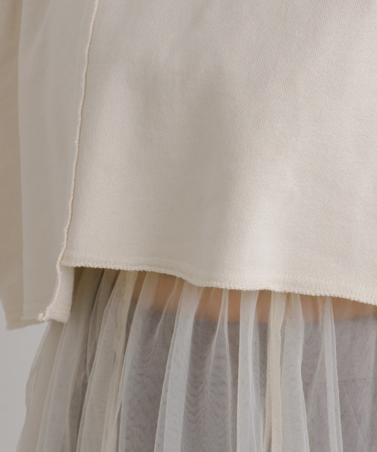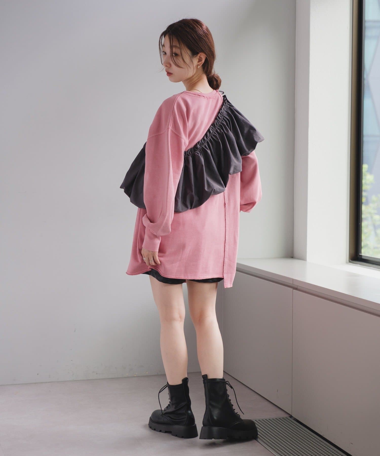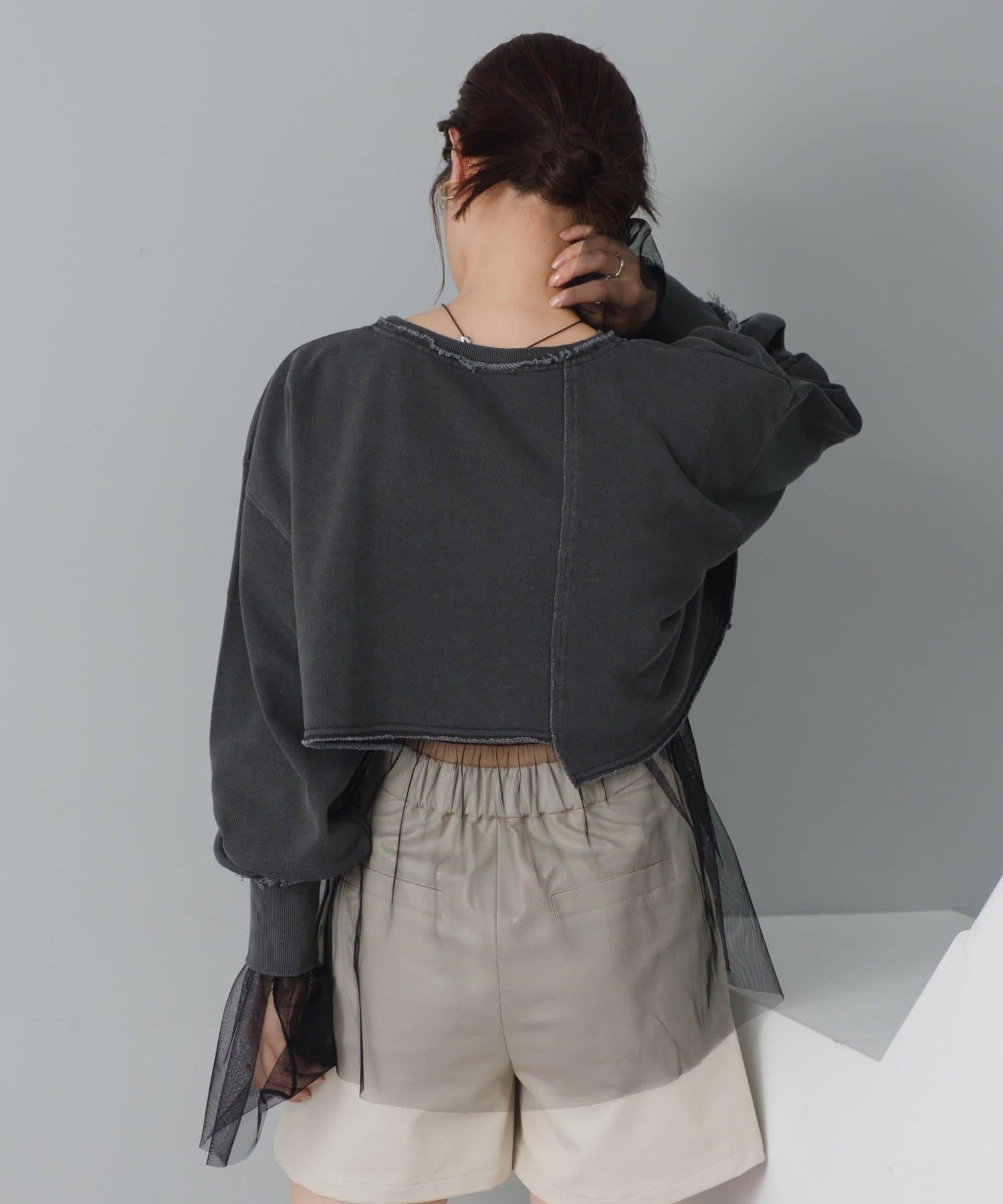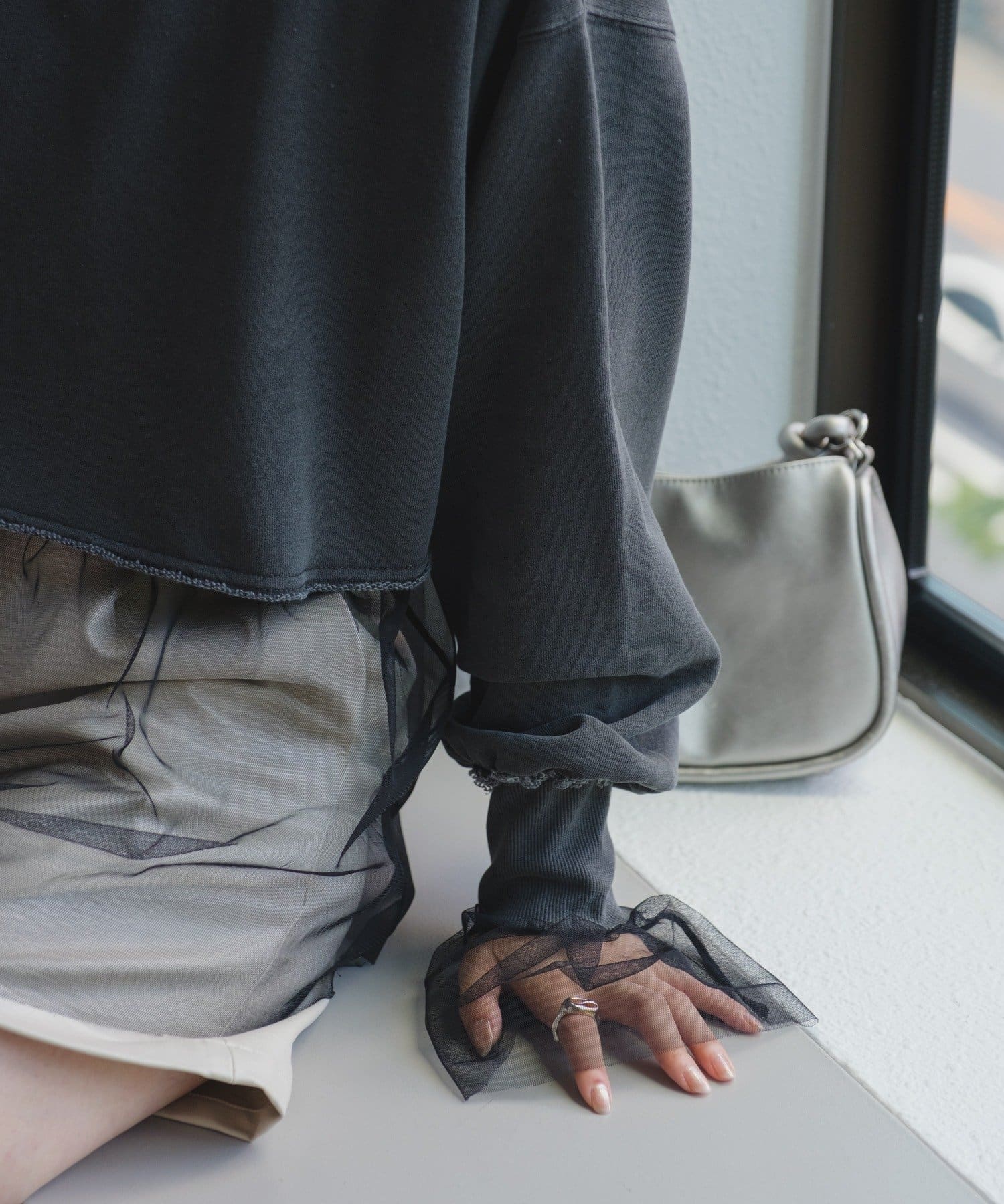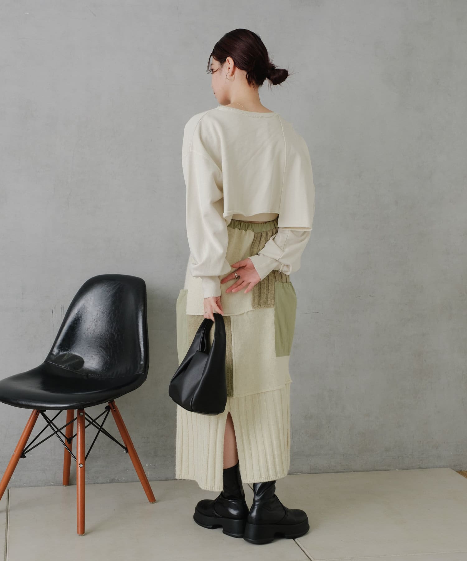 Sサイズはワイドパンツやロングスカートの他、キャミワンピースの上から被るなどのレイヤードスタイルもバランスよく着ていただけます。