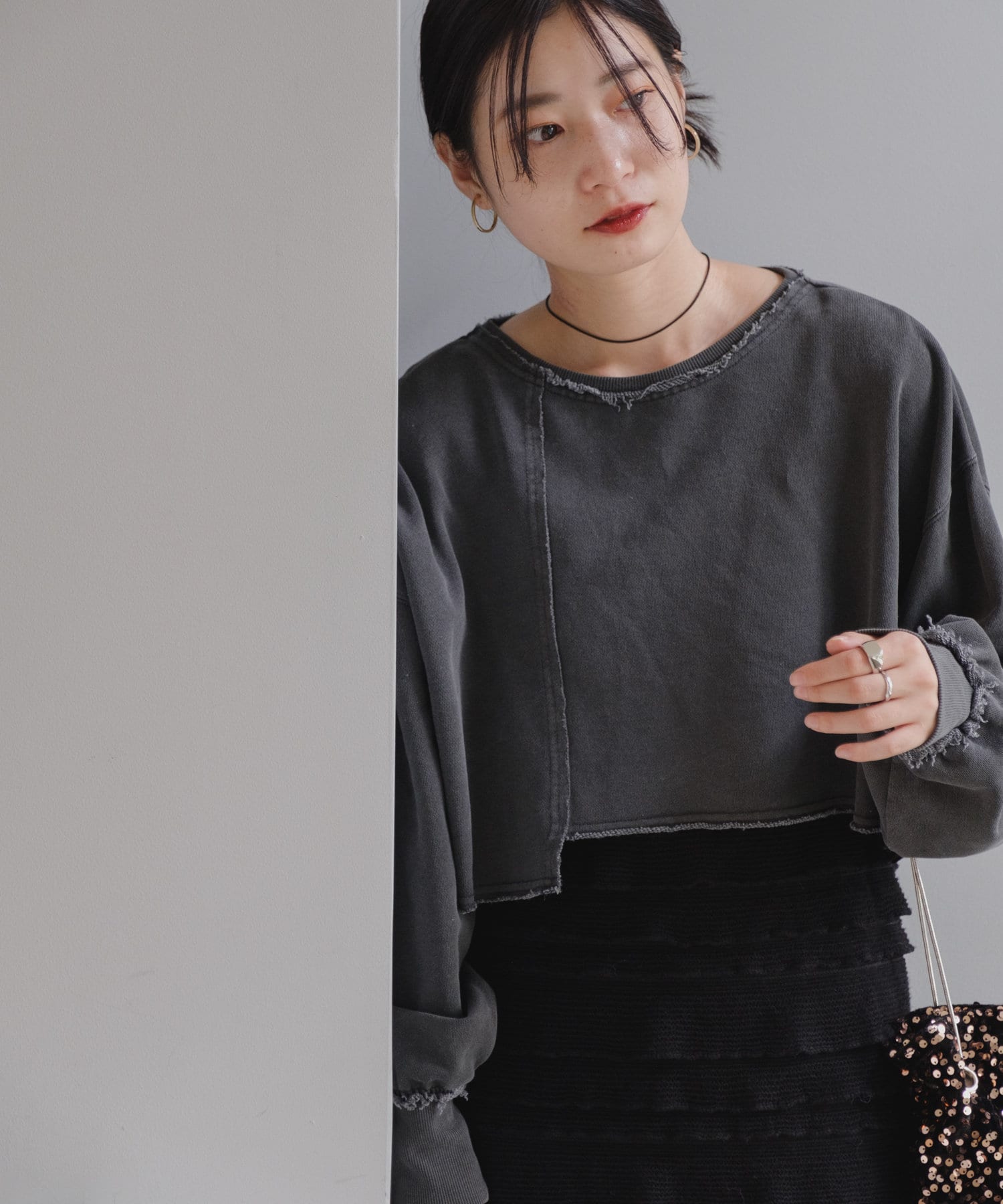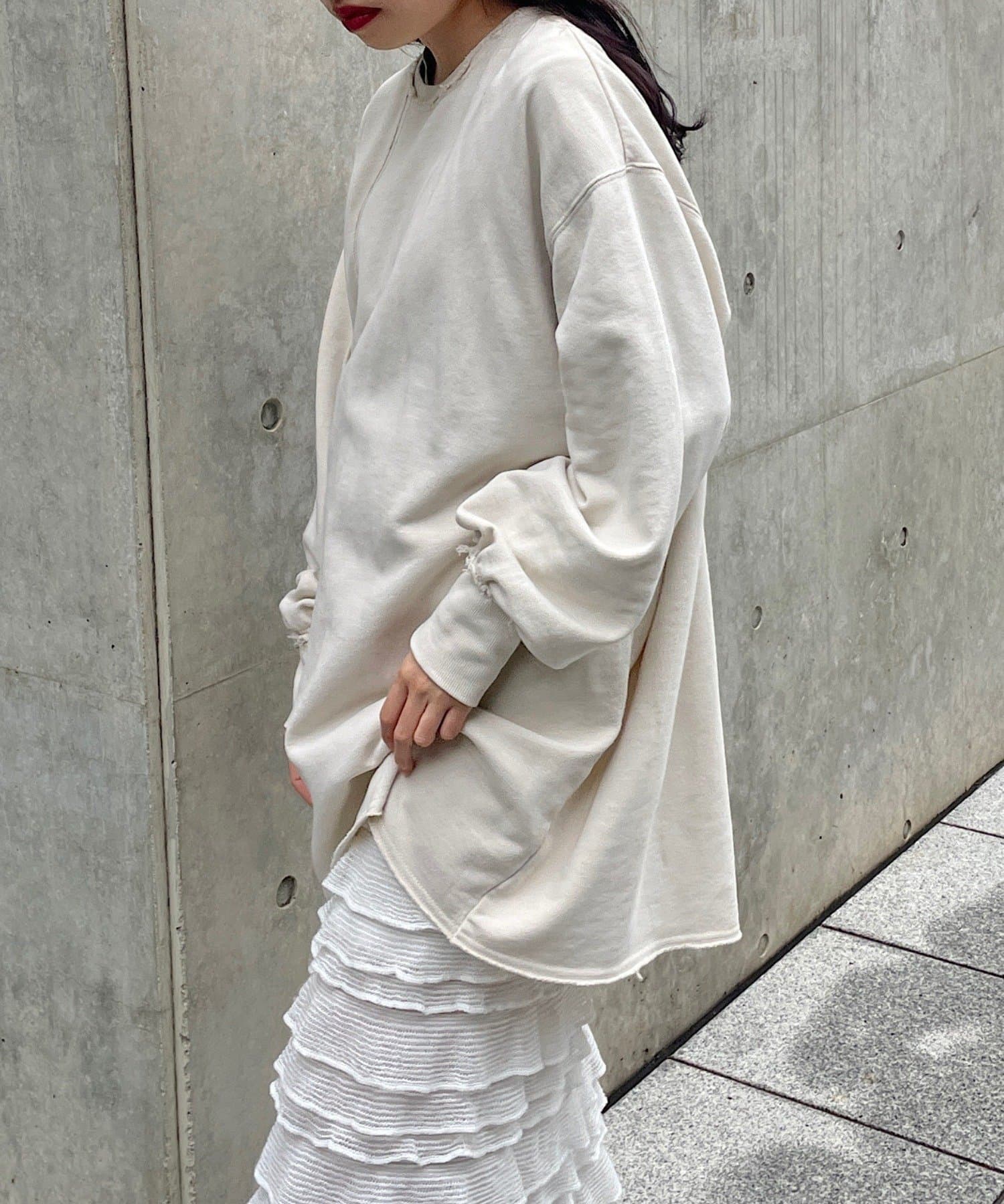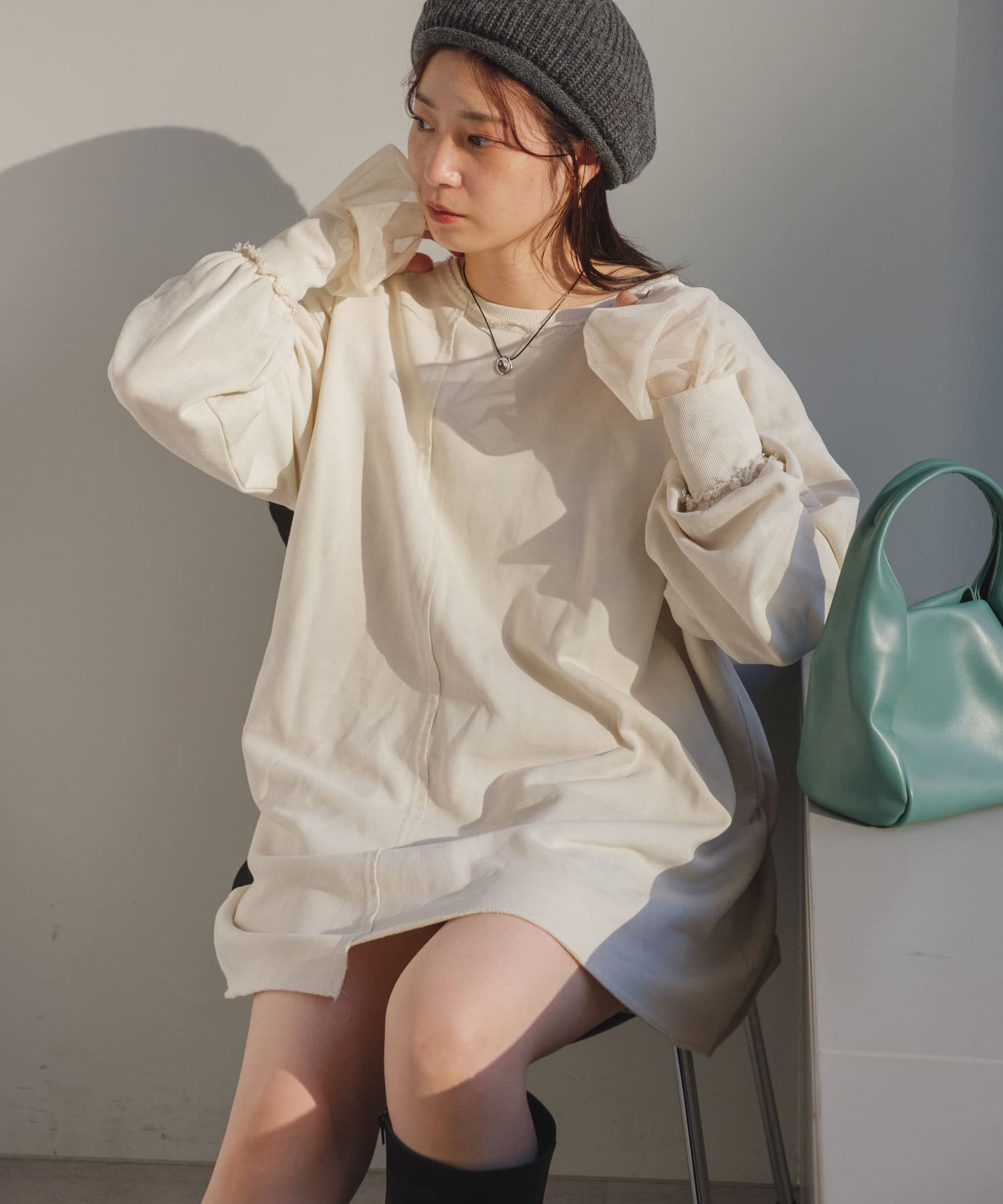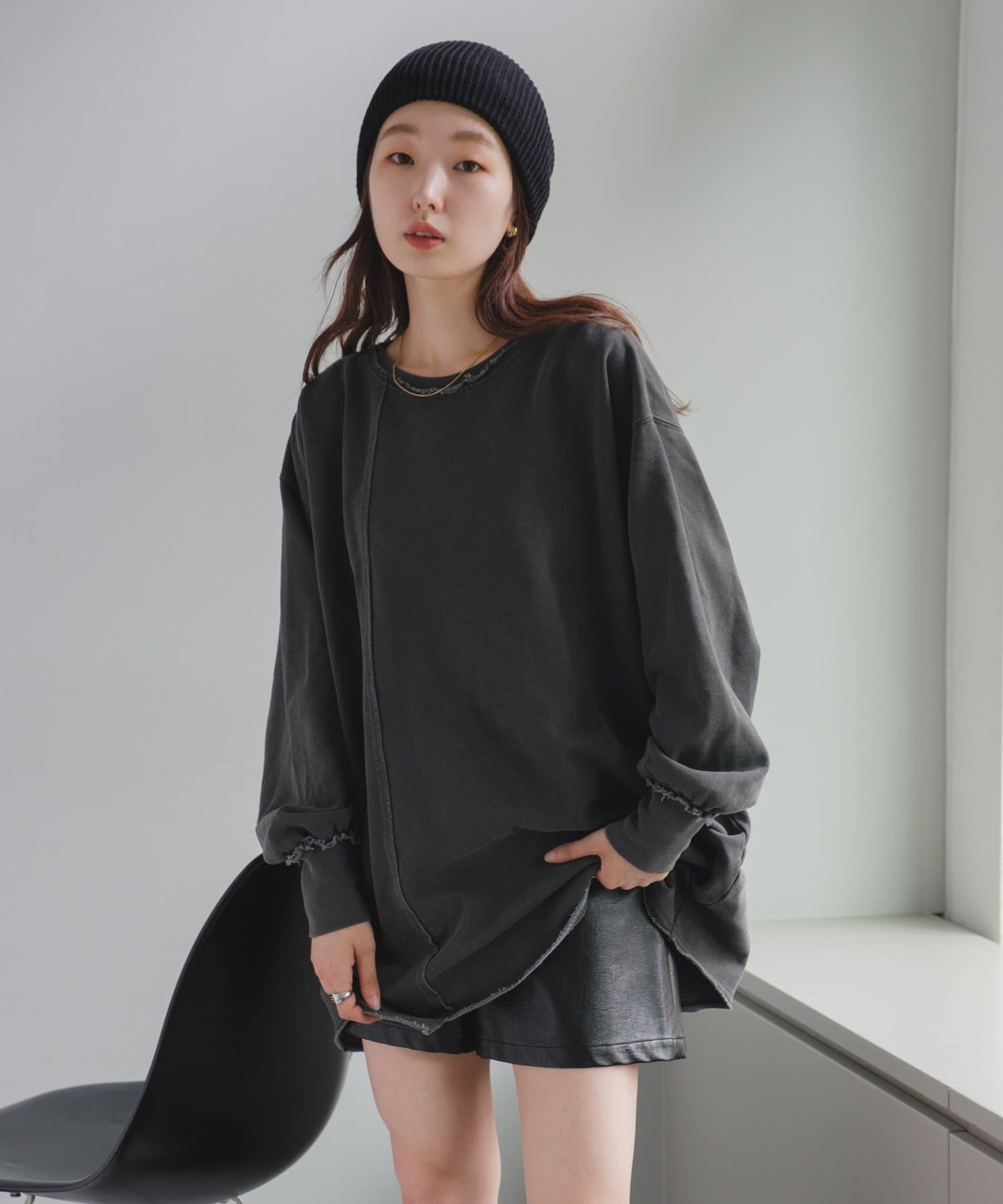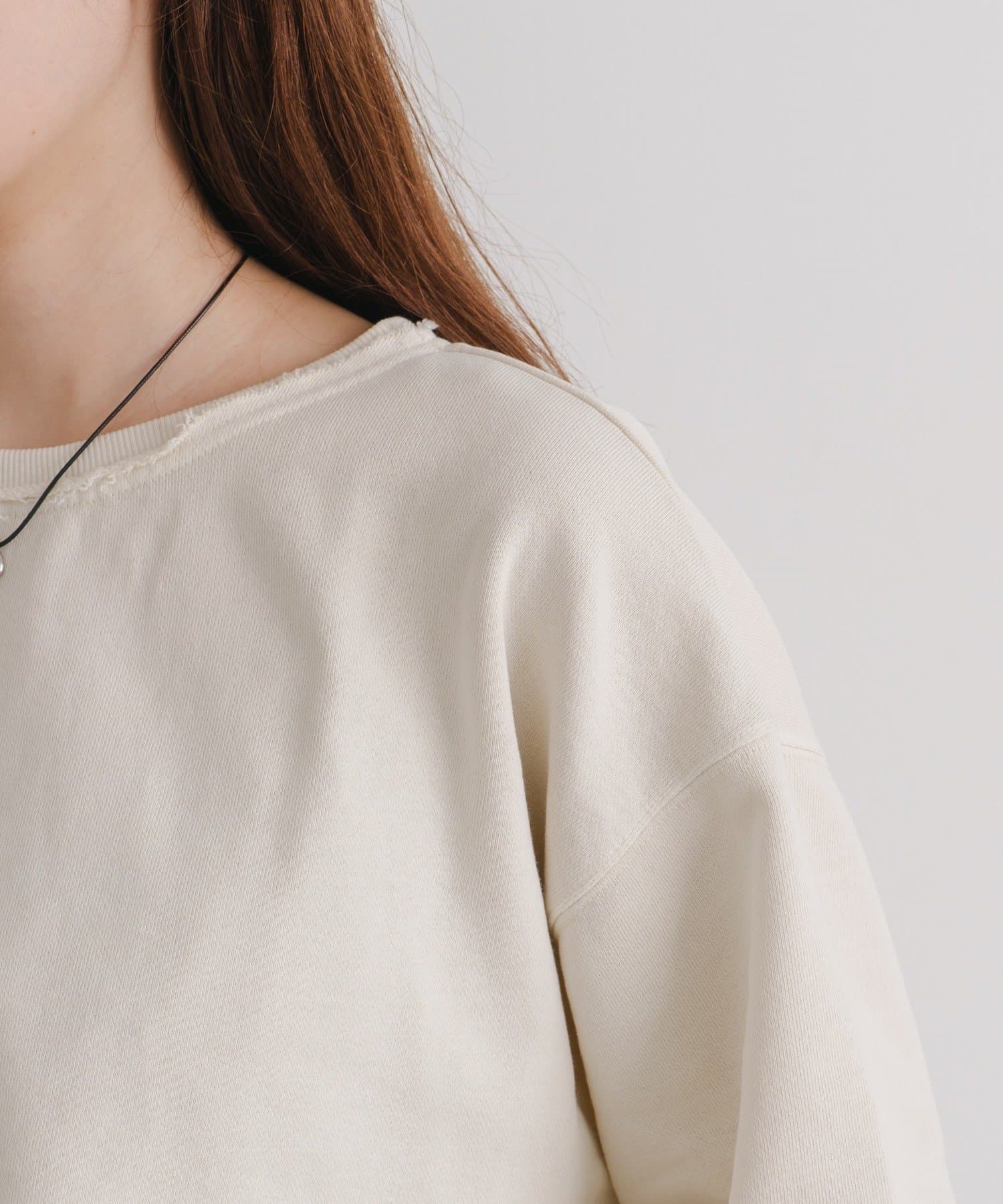 首周りと裾がカットオフになった古着のようなデザインが特徴です。