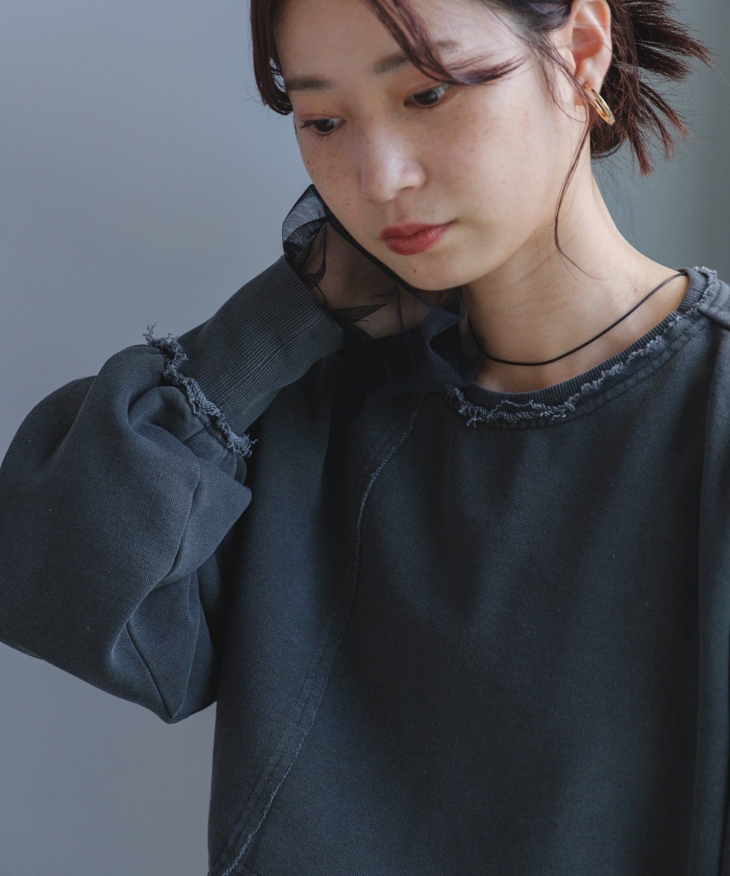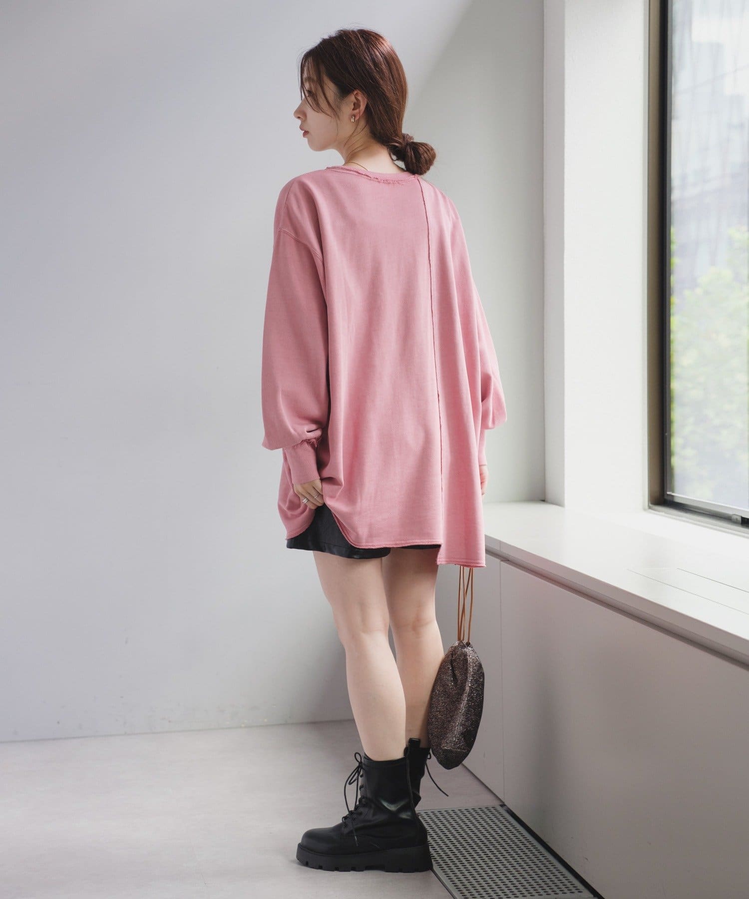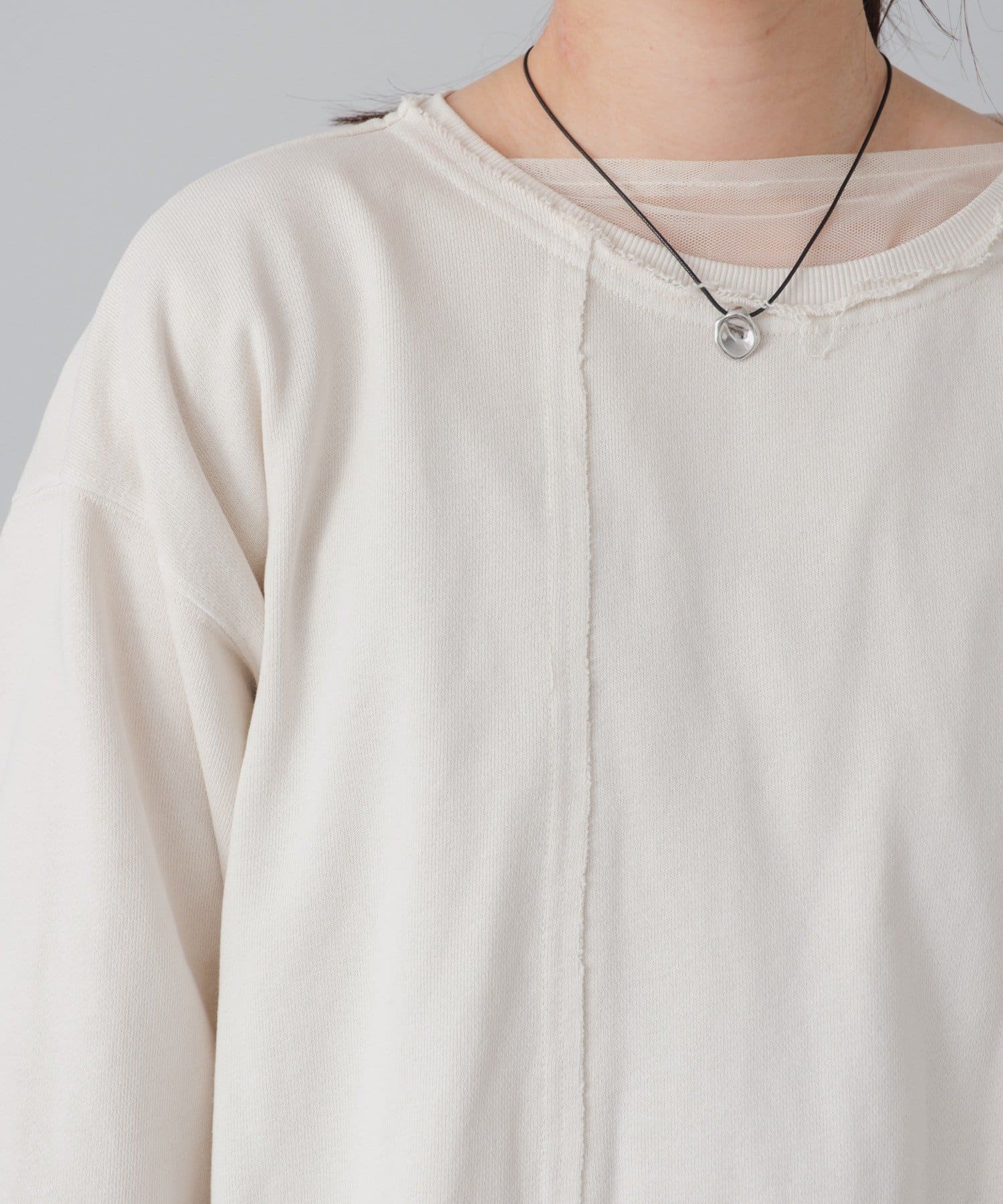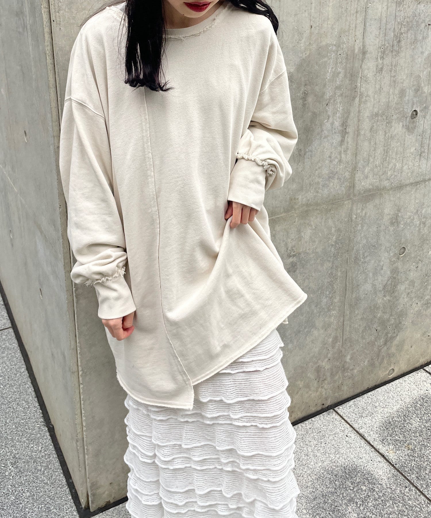 首周りと裾がカットオフになった古着のようなデザインが特徴です。