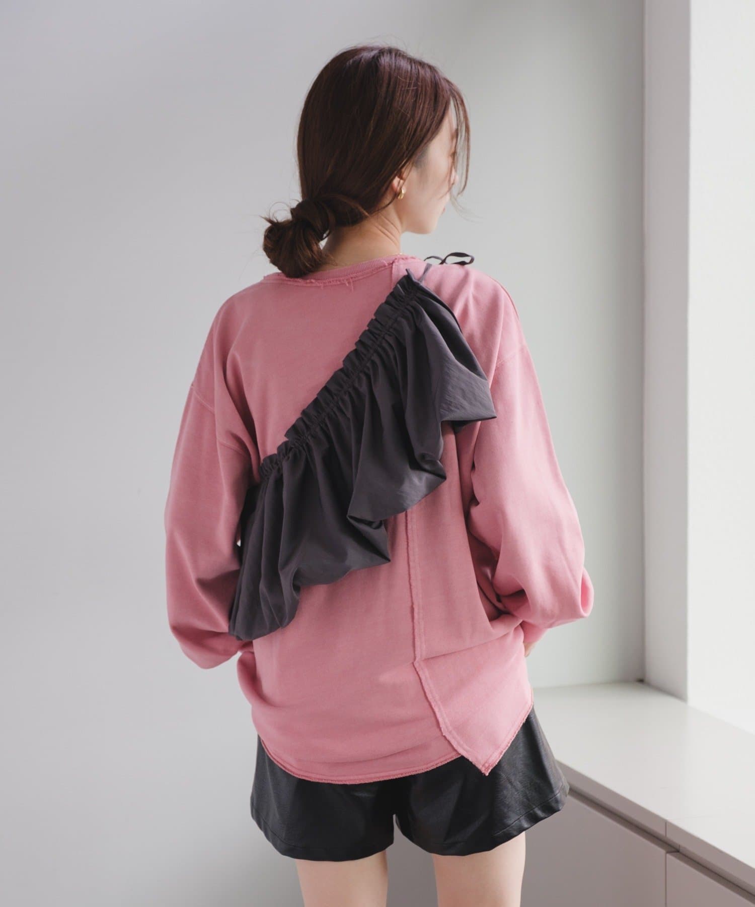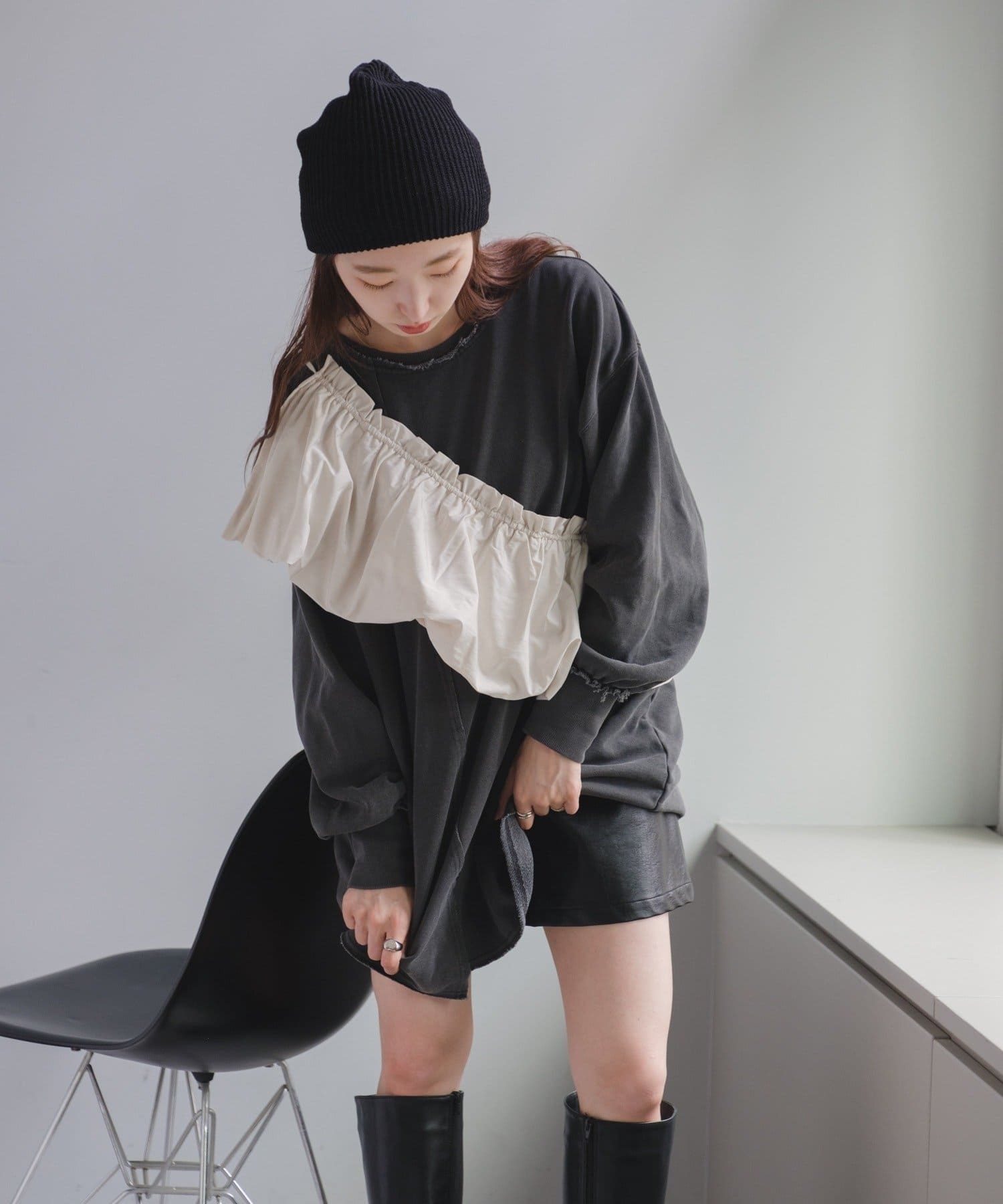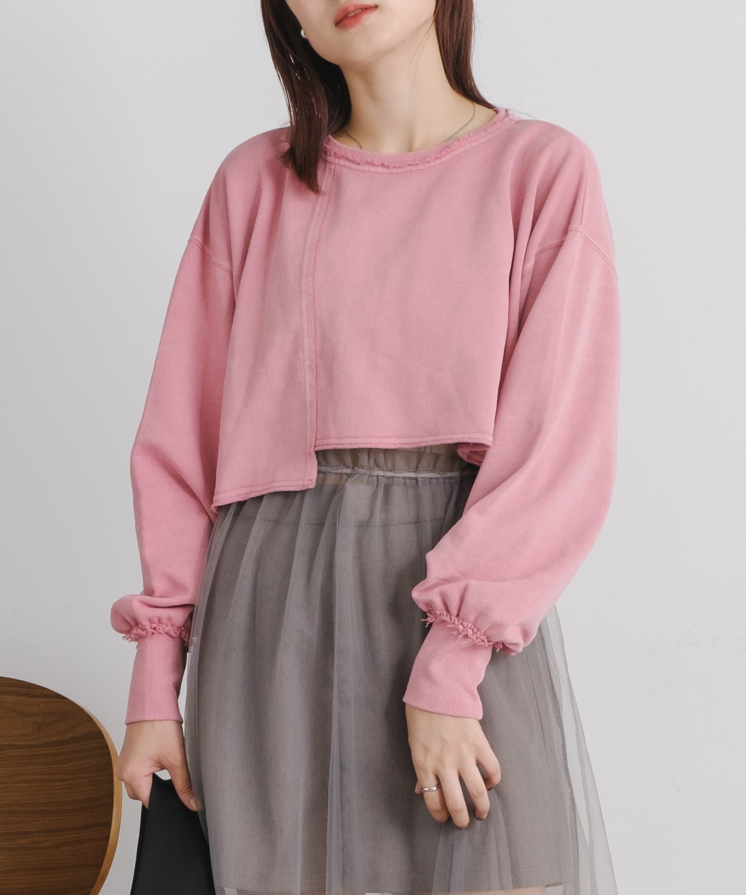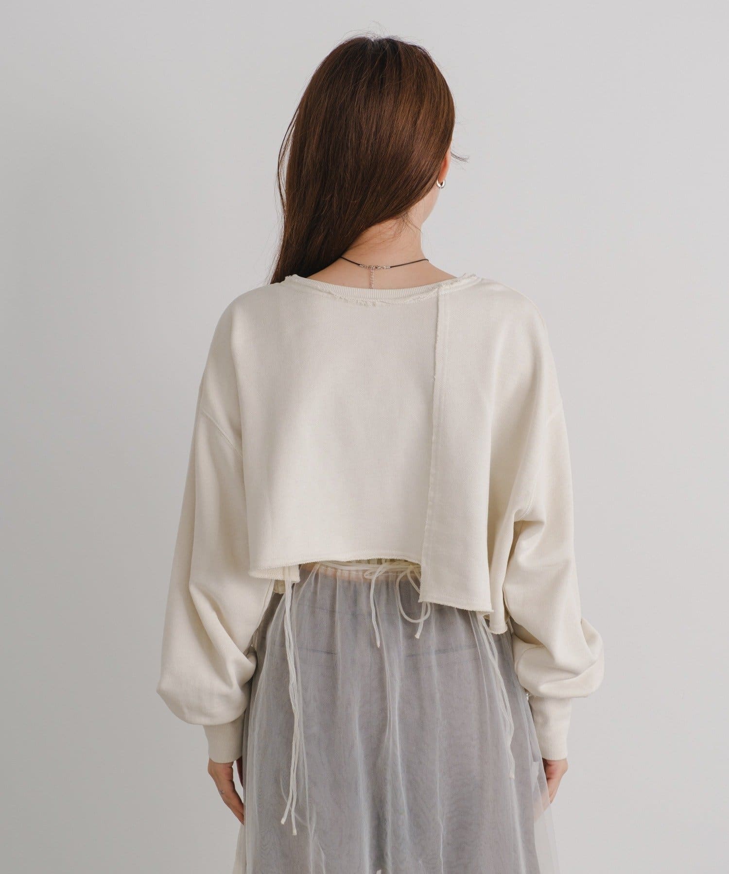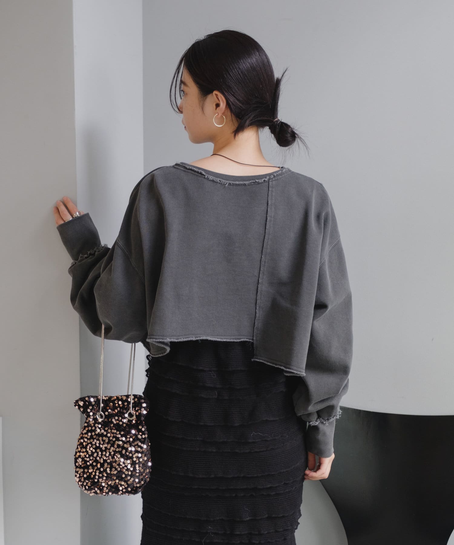首周りと裾がカットオフになった古着のようなデザインが特徴です。