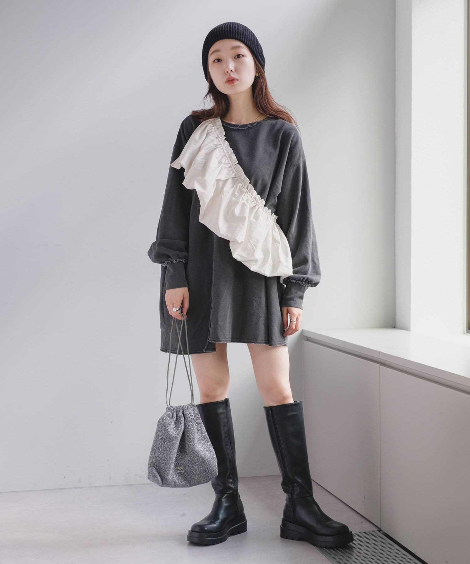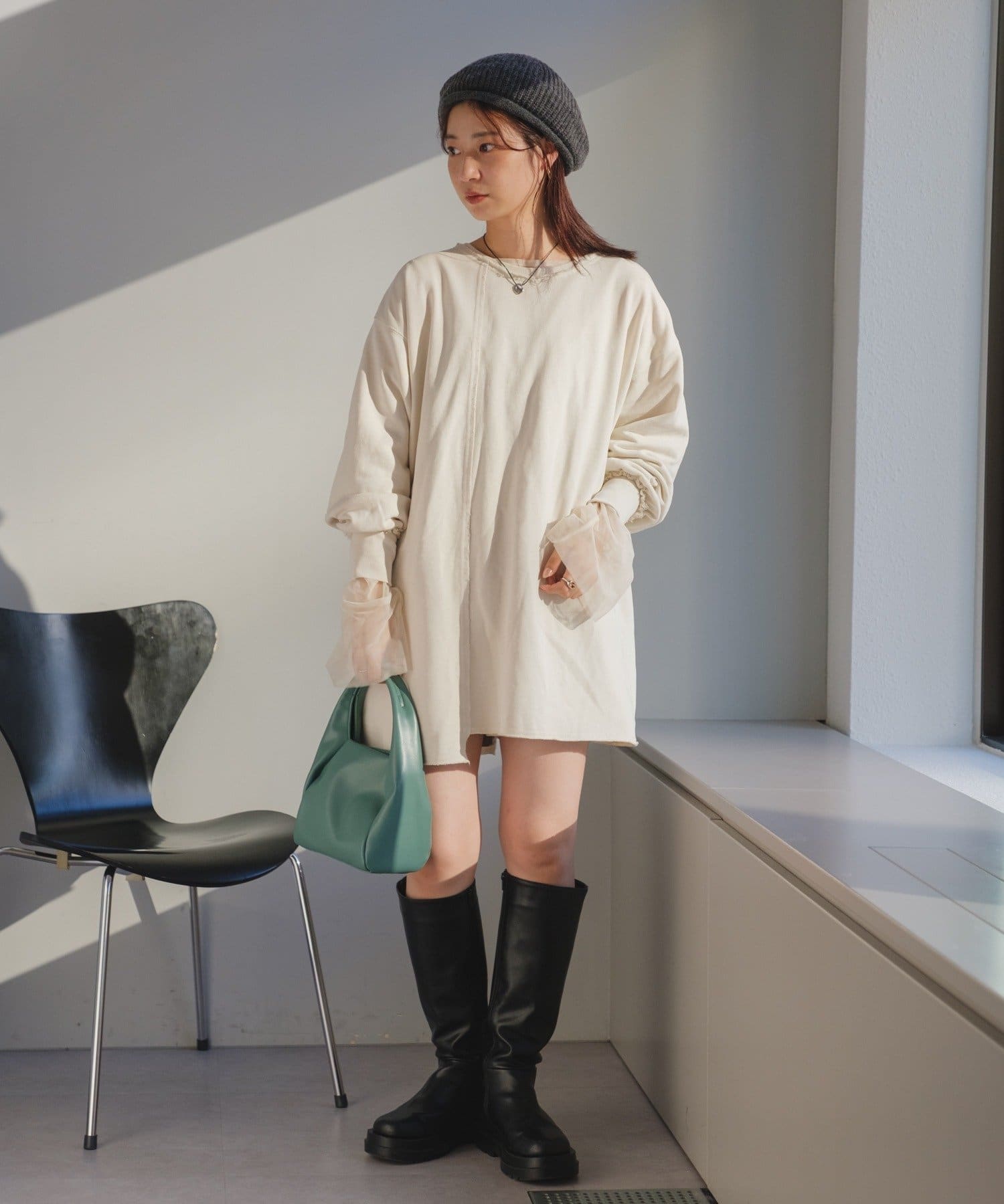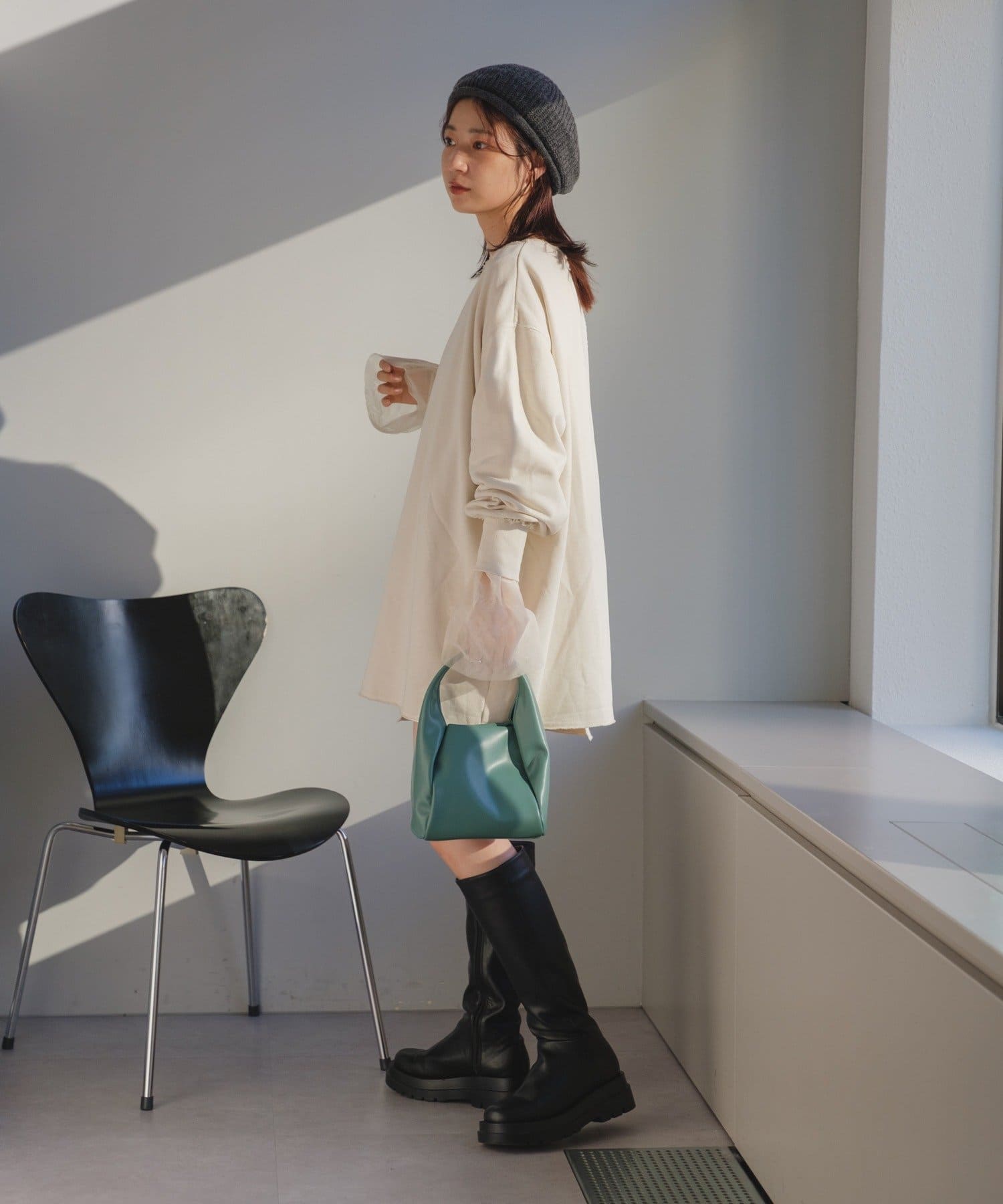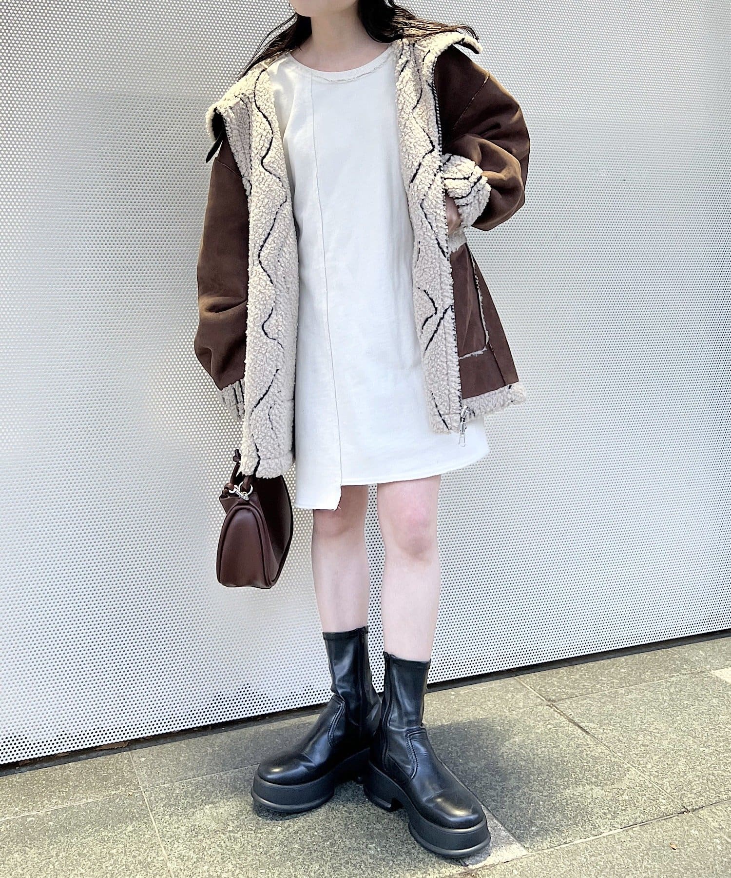 Mサイズはミニボトムにボリュームあるミドルブーツやロングブーツ合わせがおすすめ。