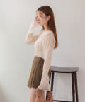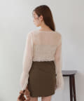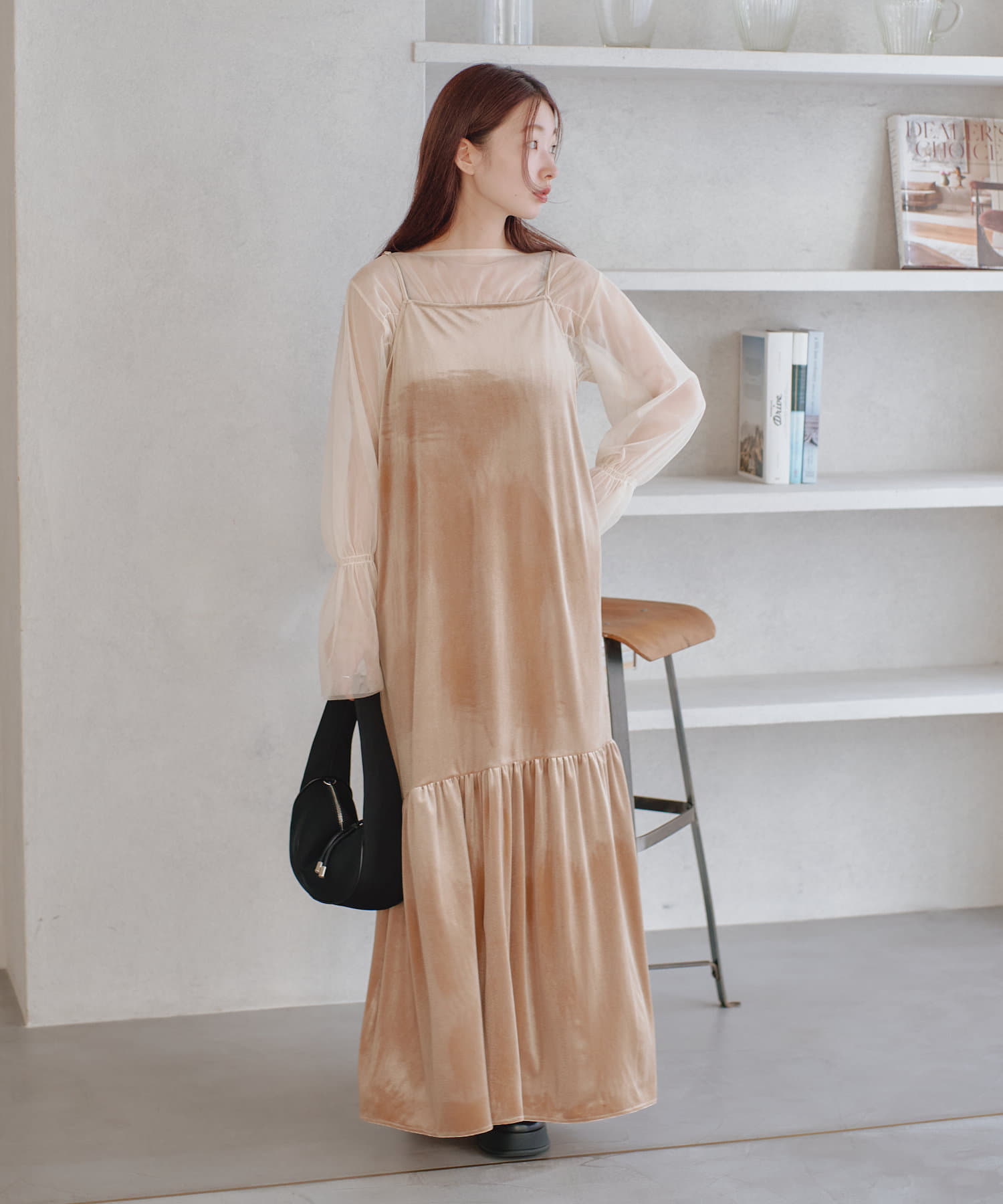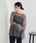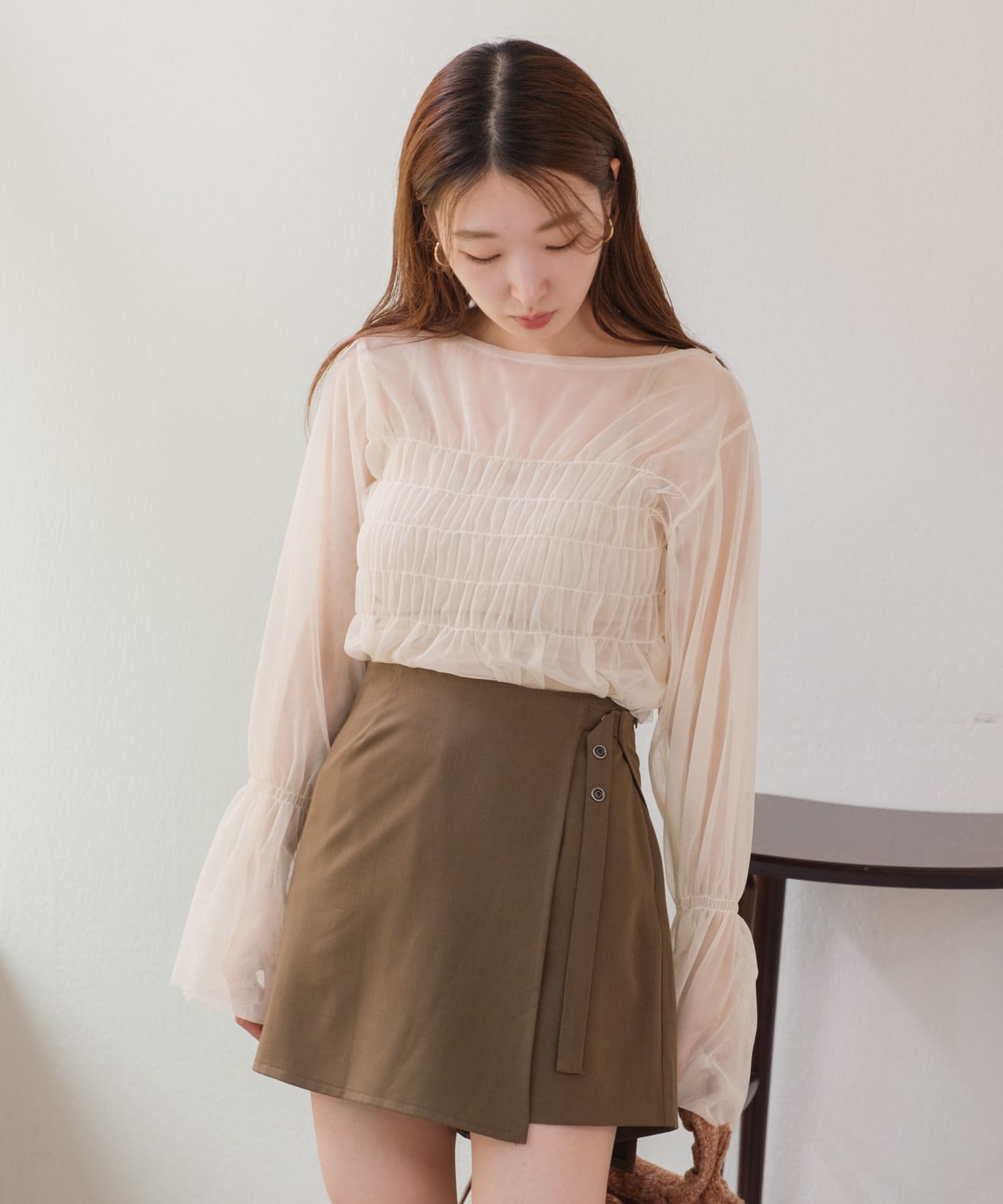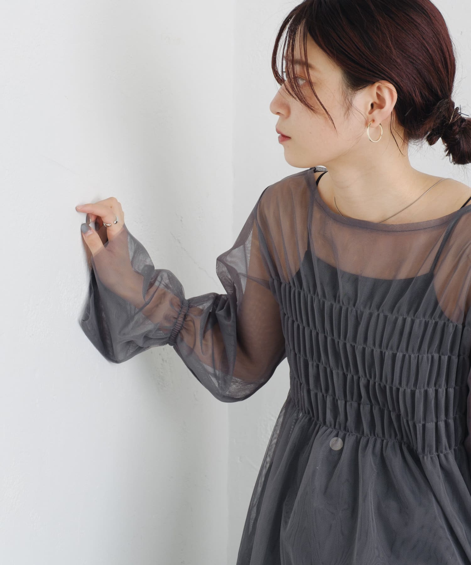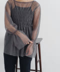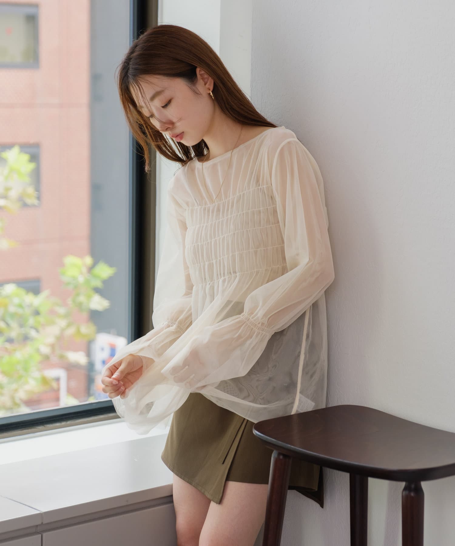 シャーリングの部分が女性らしさ満点で可愛すぎる。2枚重ねのタイプなので、少し肌寒い季節でも活躍してくれそう。ベストとかニットに重ね着したい〜!!!