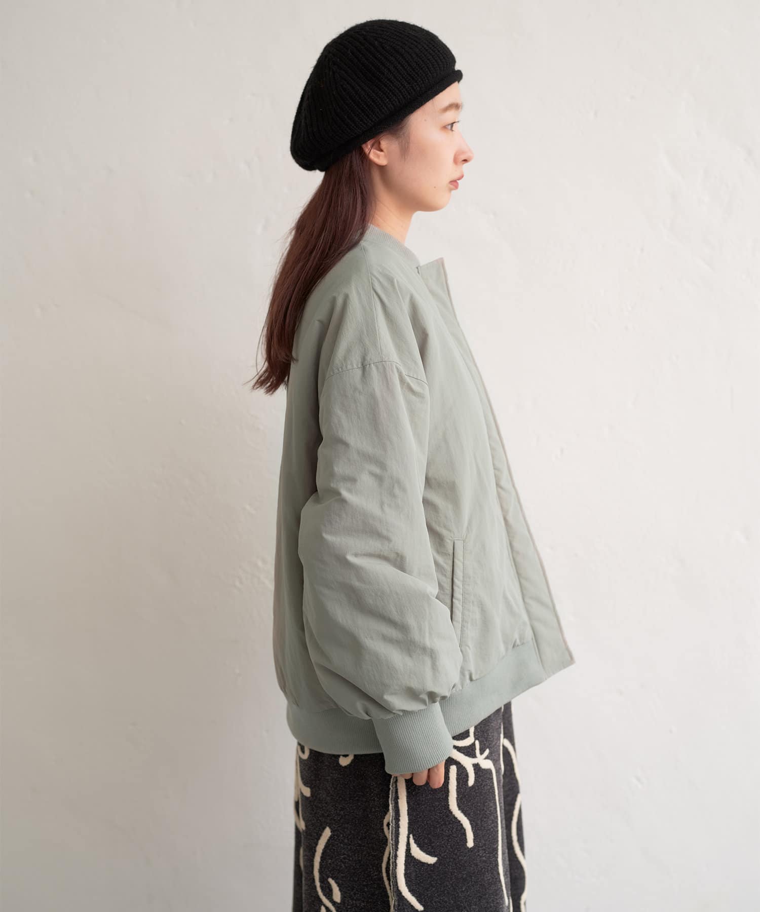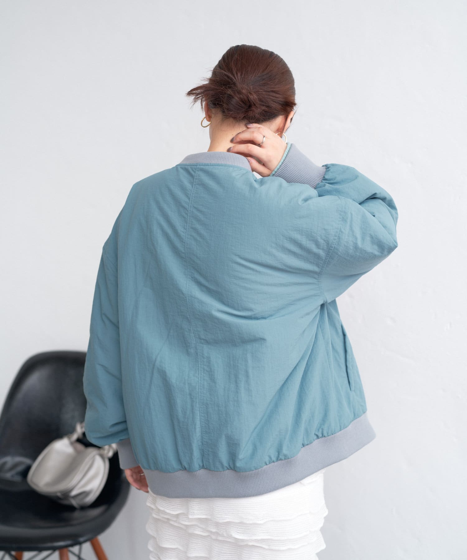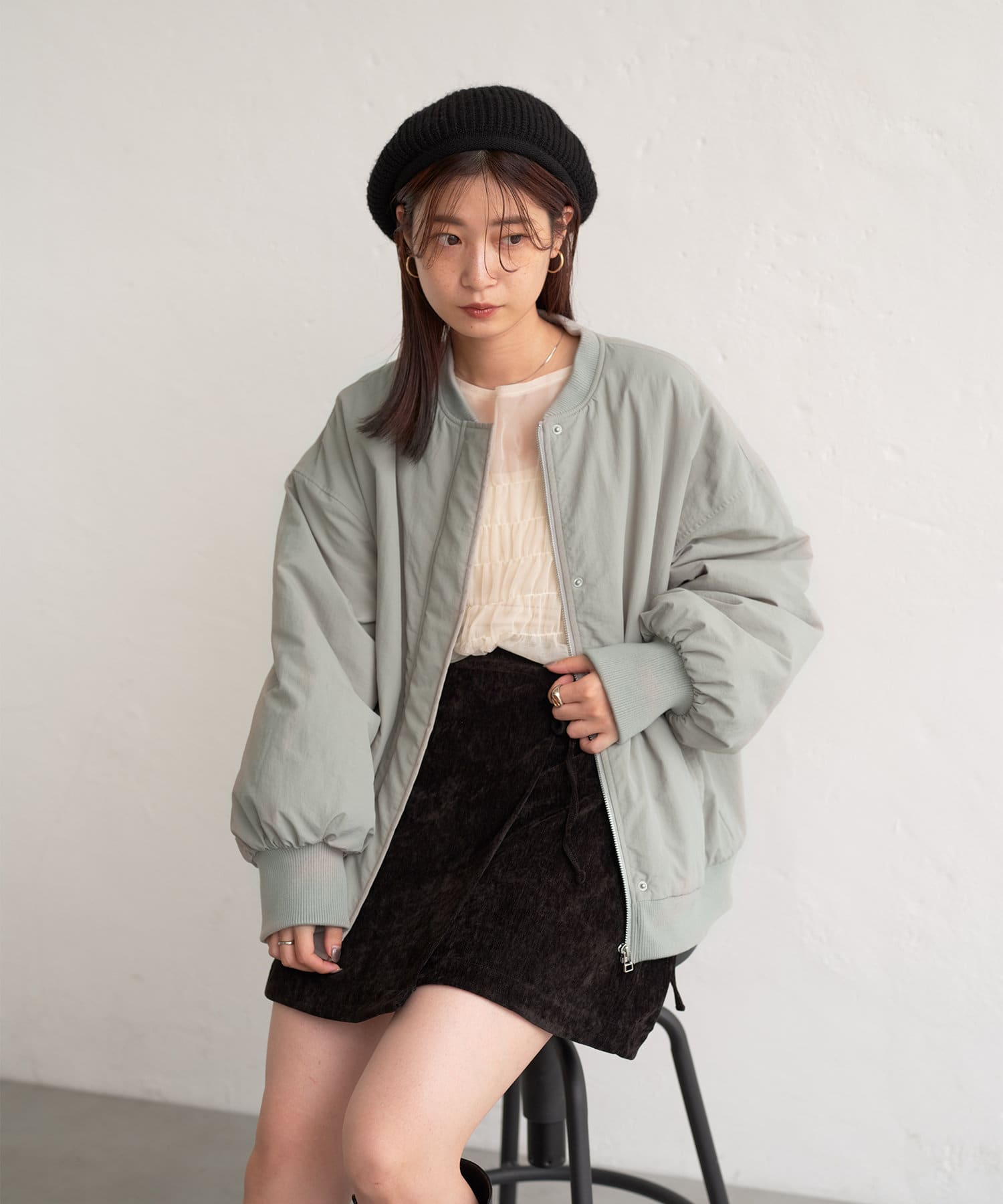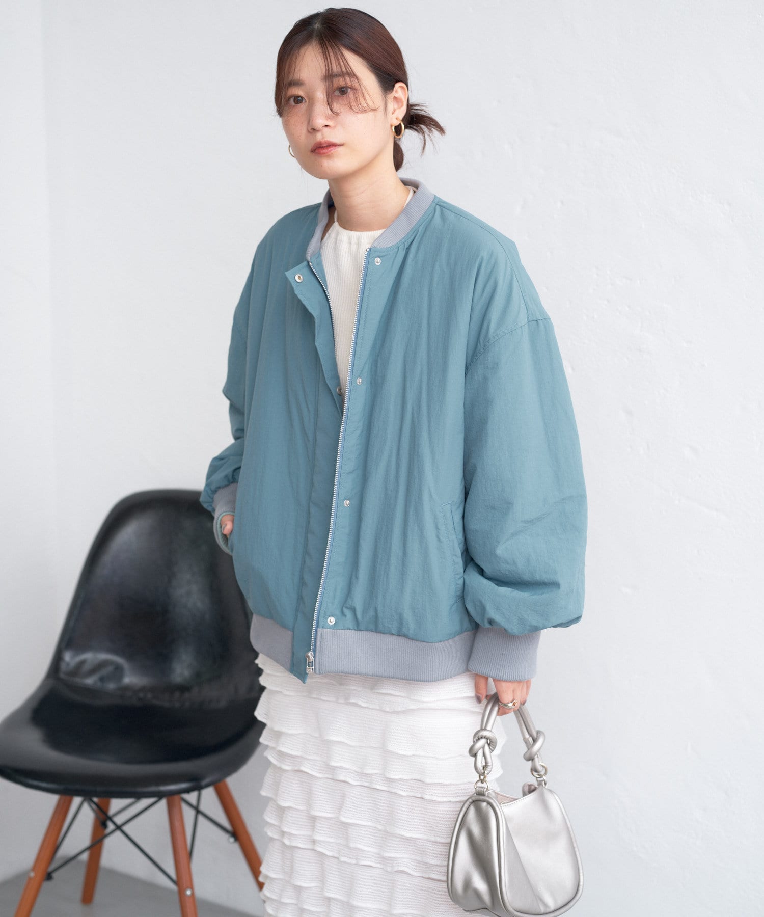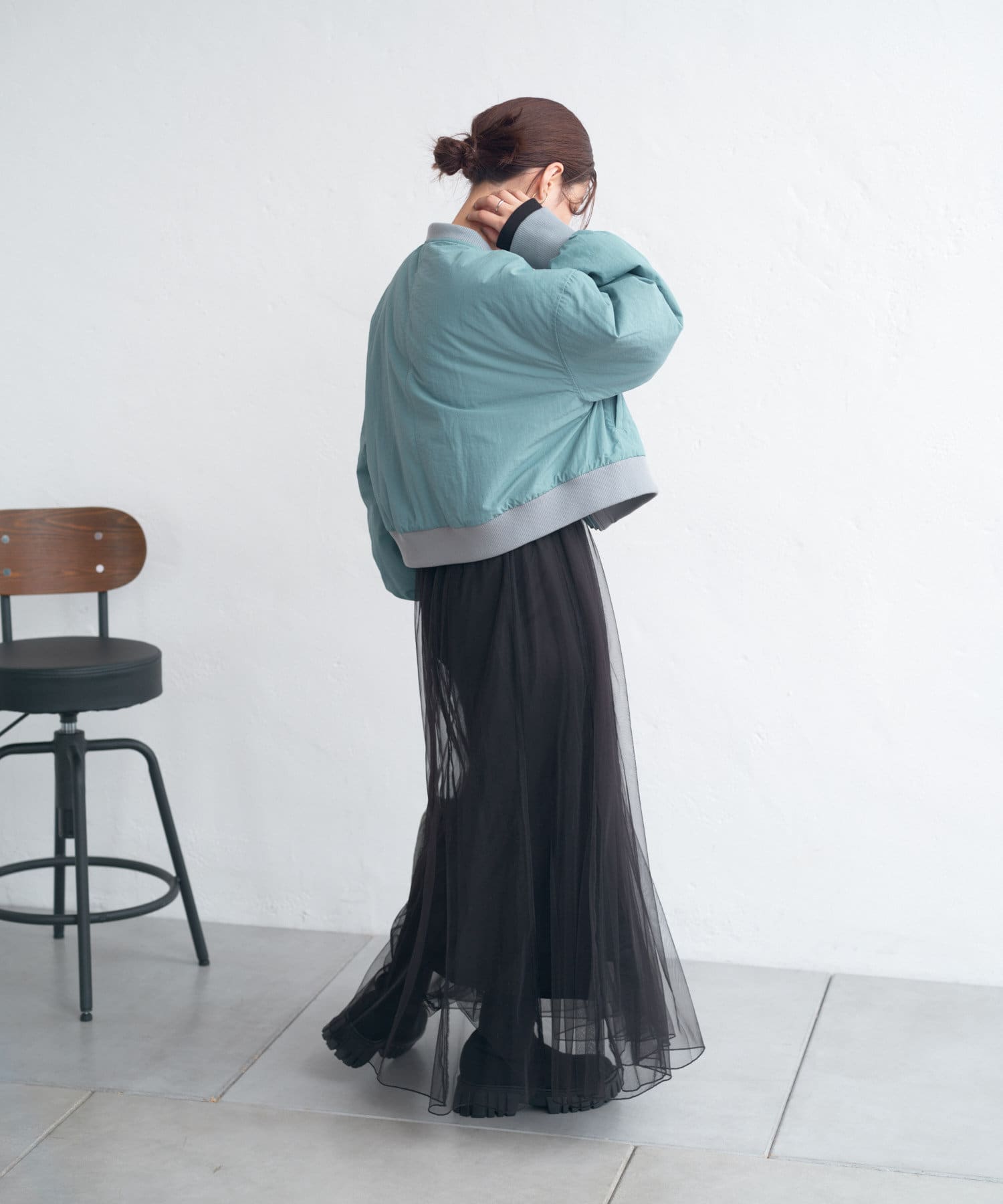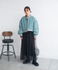 カジュアル見えするアイテムですが、チュール素材などと合わせて女性らしいスタイリングなど合わせによって幅広い見せ方ができるブルゾンです。