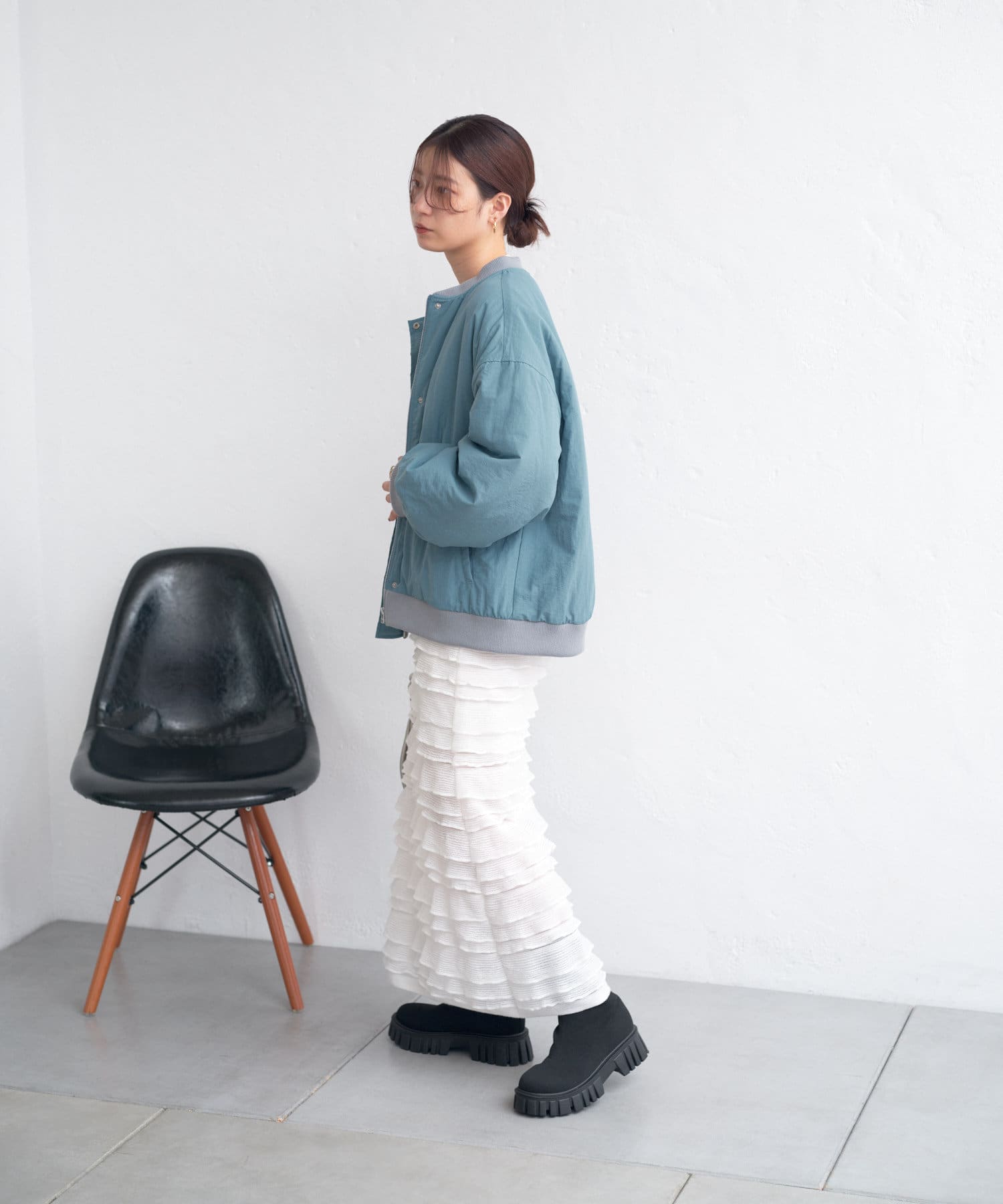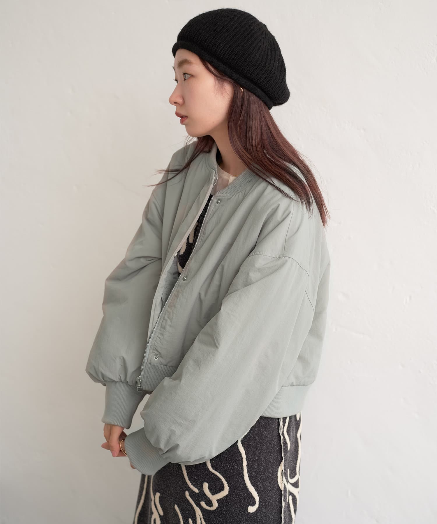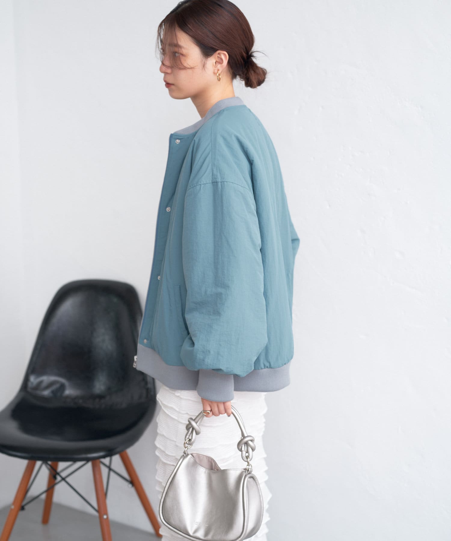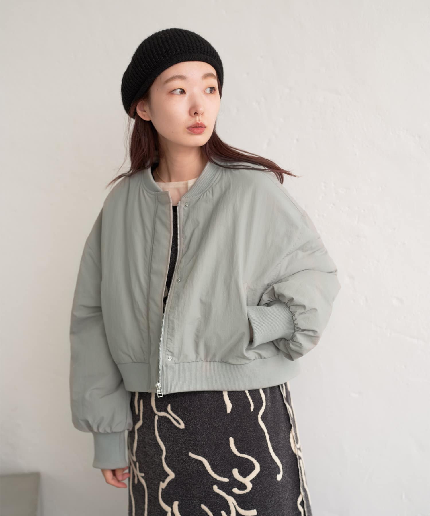 カジュアル見えするアイテムですが、チュール素材などと合わせて女性らしいスタイリングなど合わせによって幅広い見せ方ができるブルゾンです。