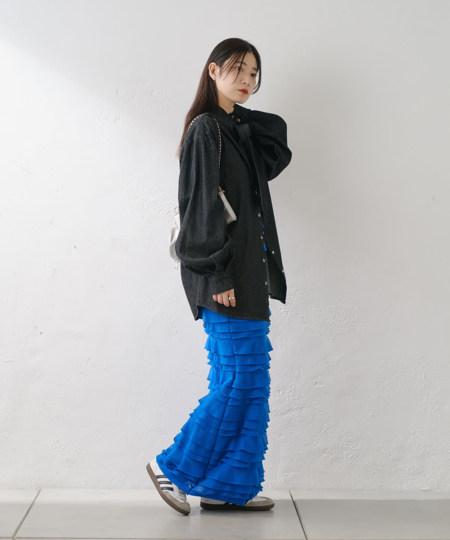 オーバーサイズのニットと合わせてゆるっとしたスタイリングなど様々な合わせをお楽しみいただけます。