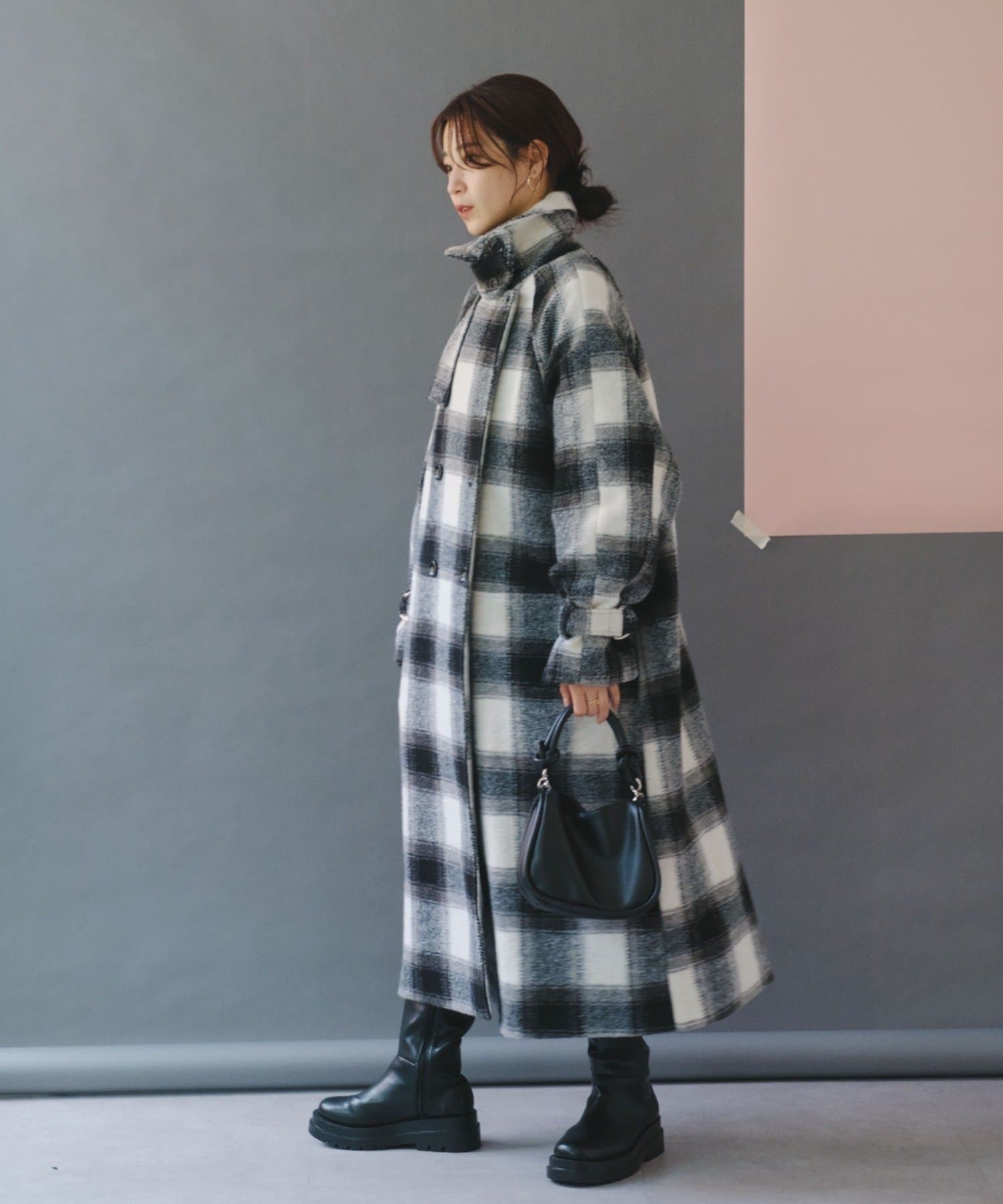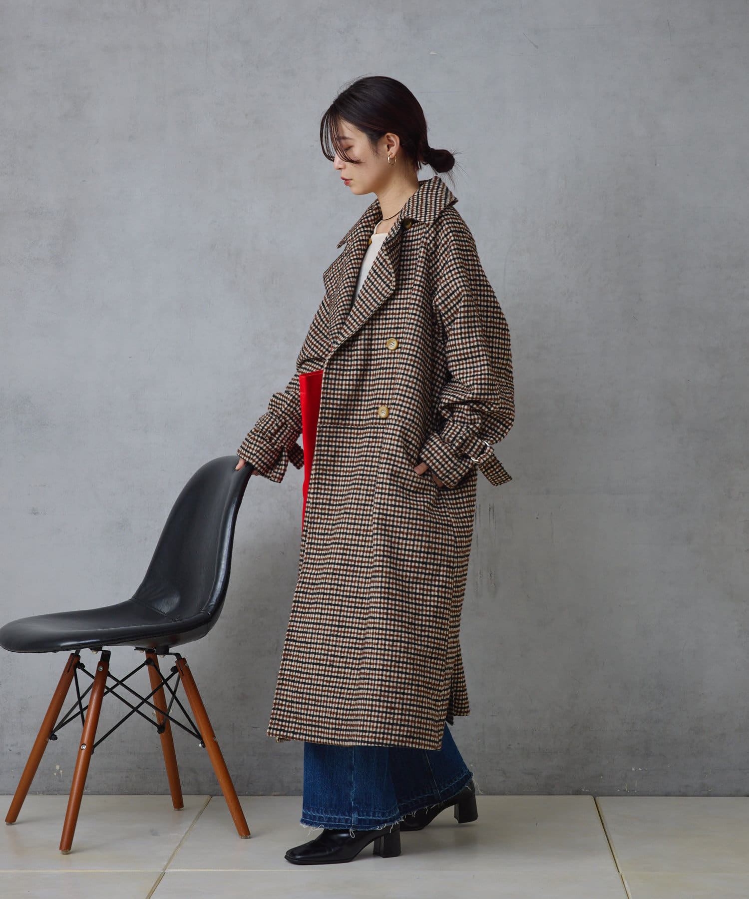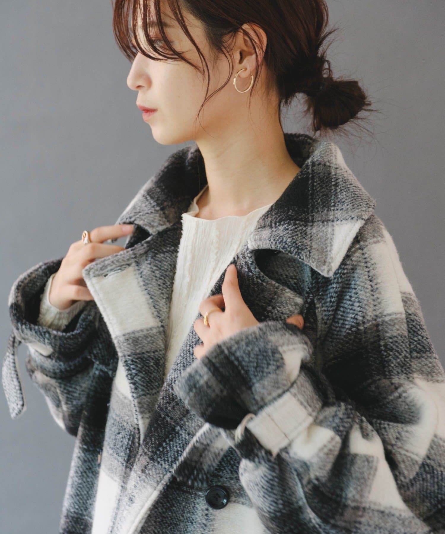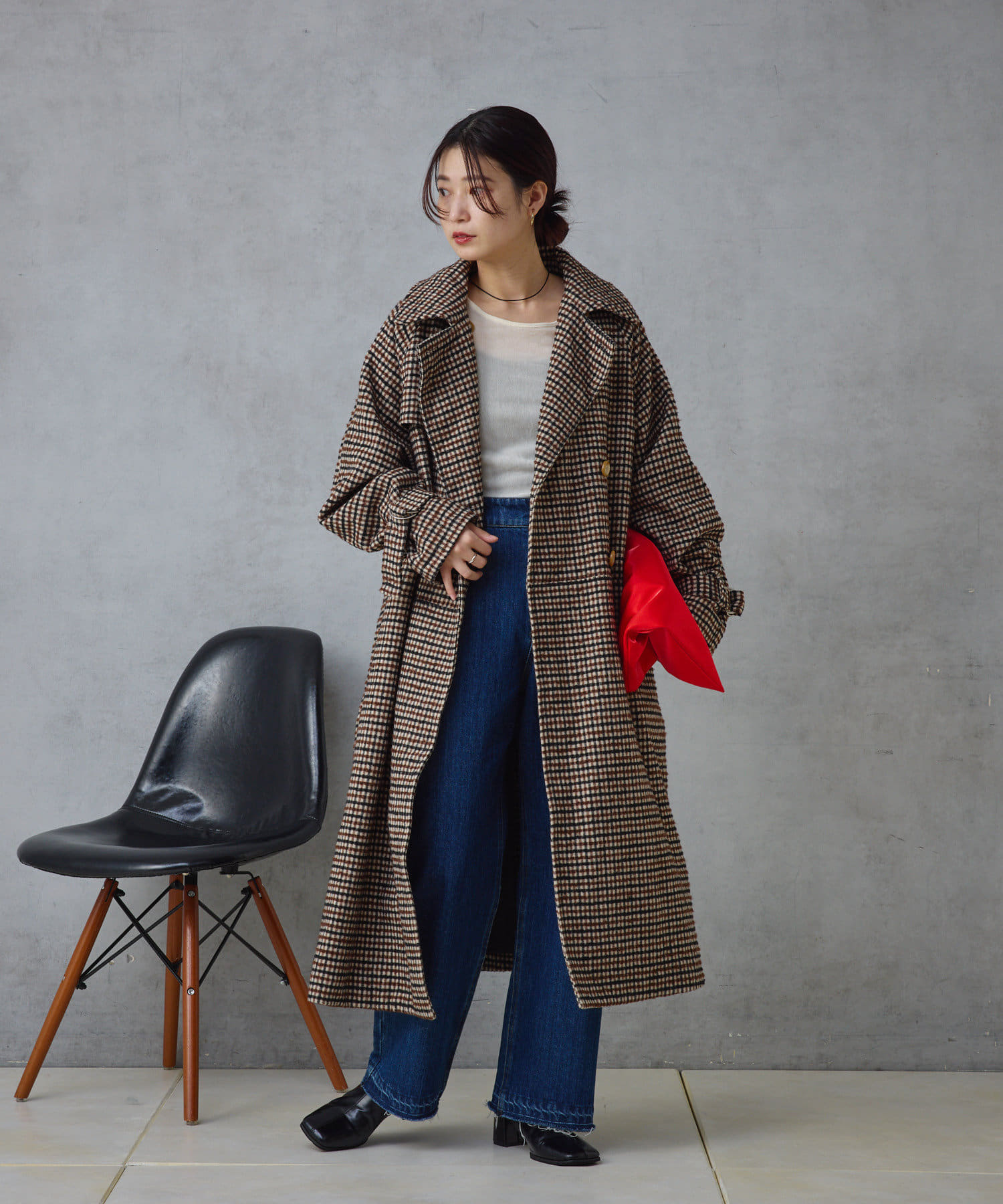 大き目のボタンやベルトがアクセントになっているの閉めて着るのもおすすめです。