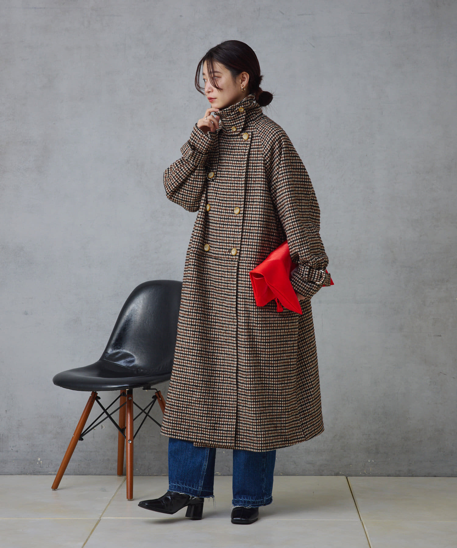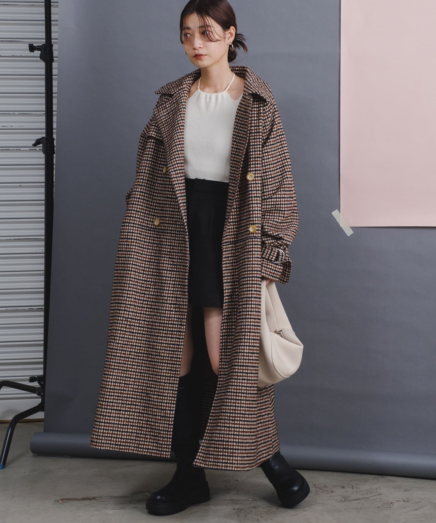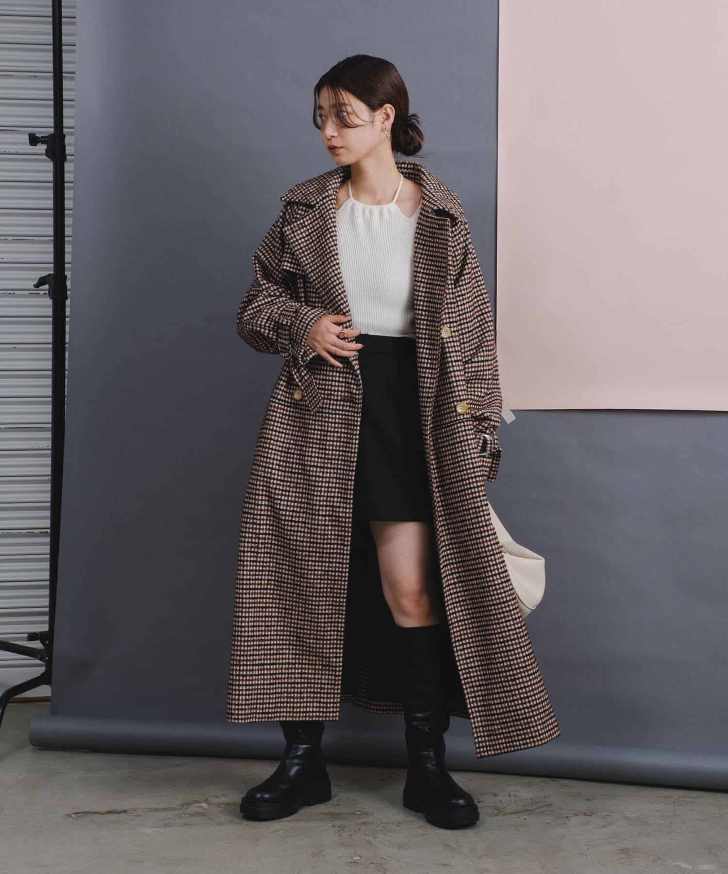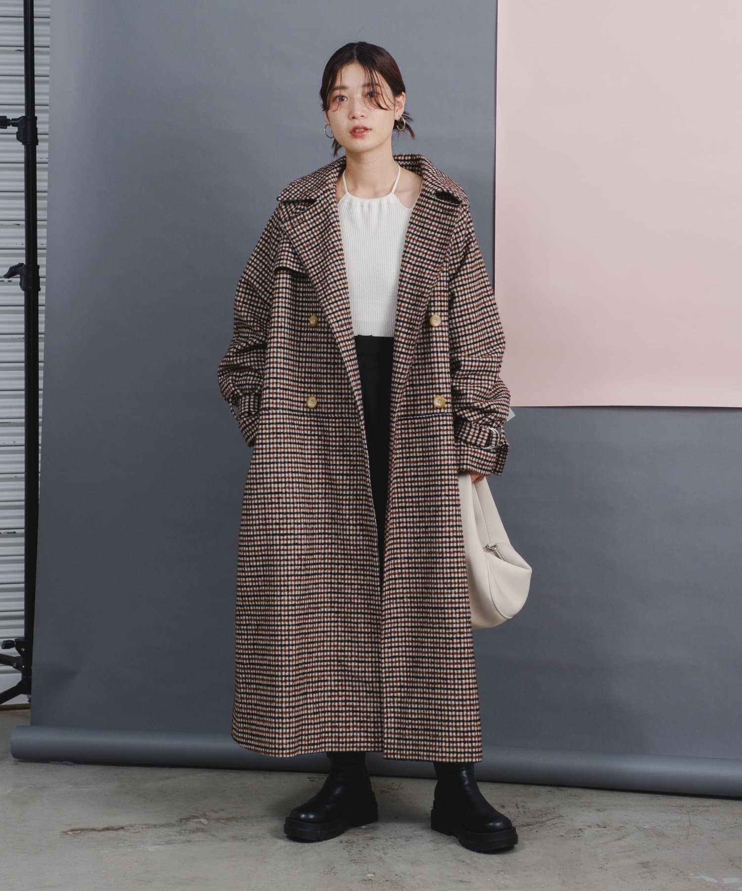 大き目のボタンやベルトがアクセントになっているの閉めて着るのもおすすめです。