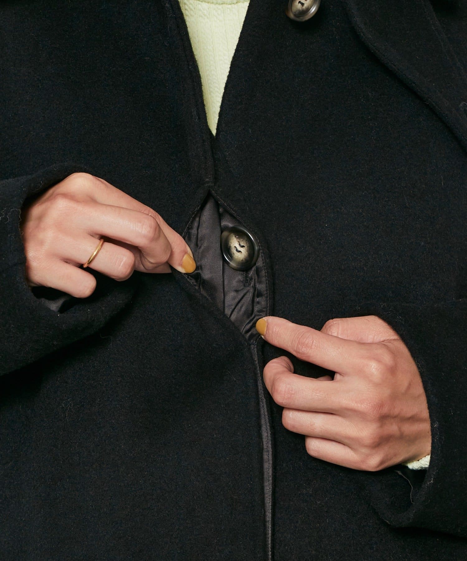 フロントボタンが隠れる比翼仕立てで、フォーマルな雰囲気を演出。