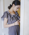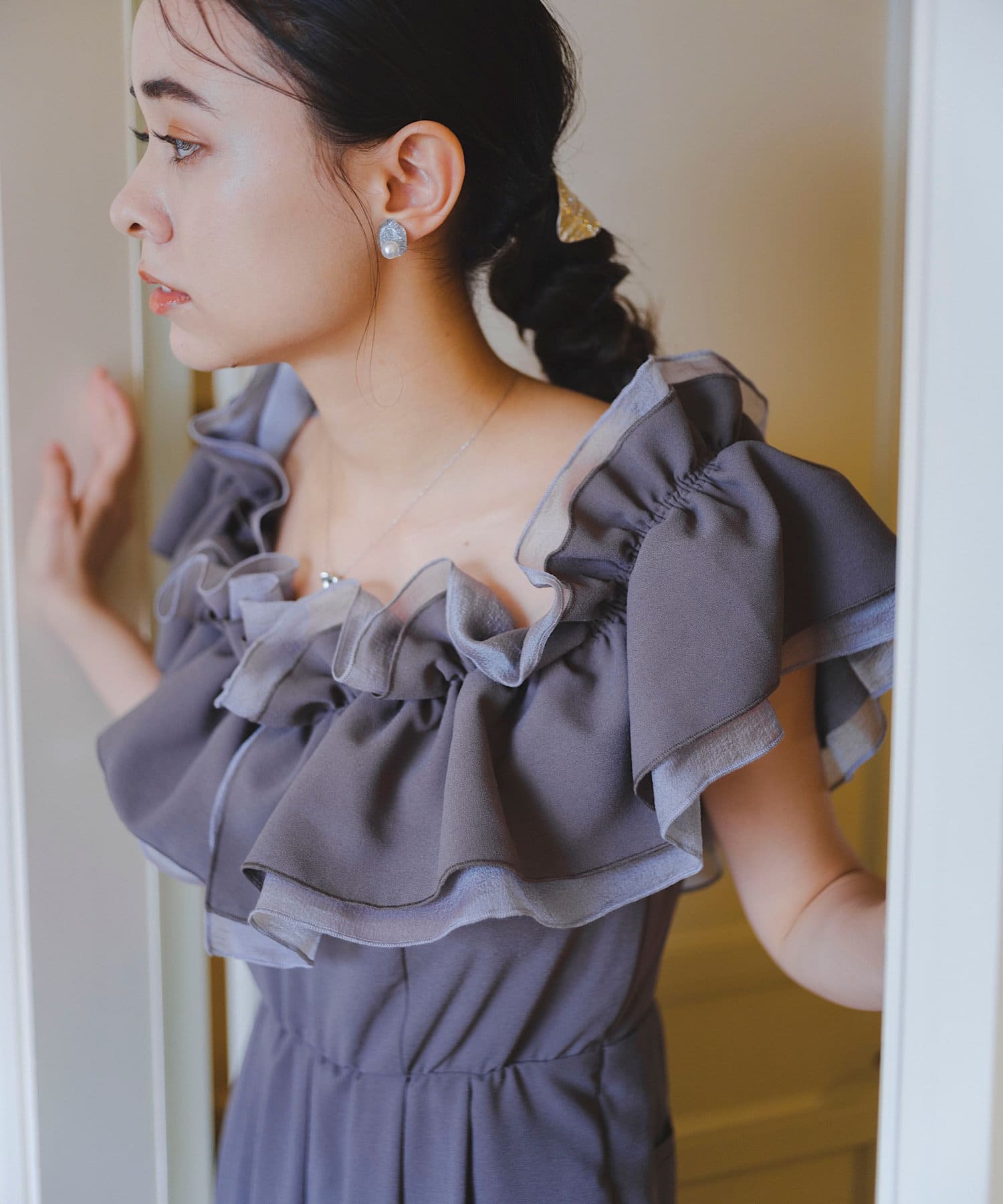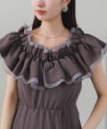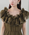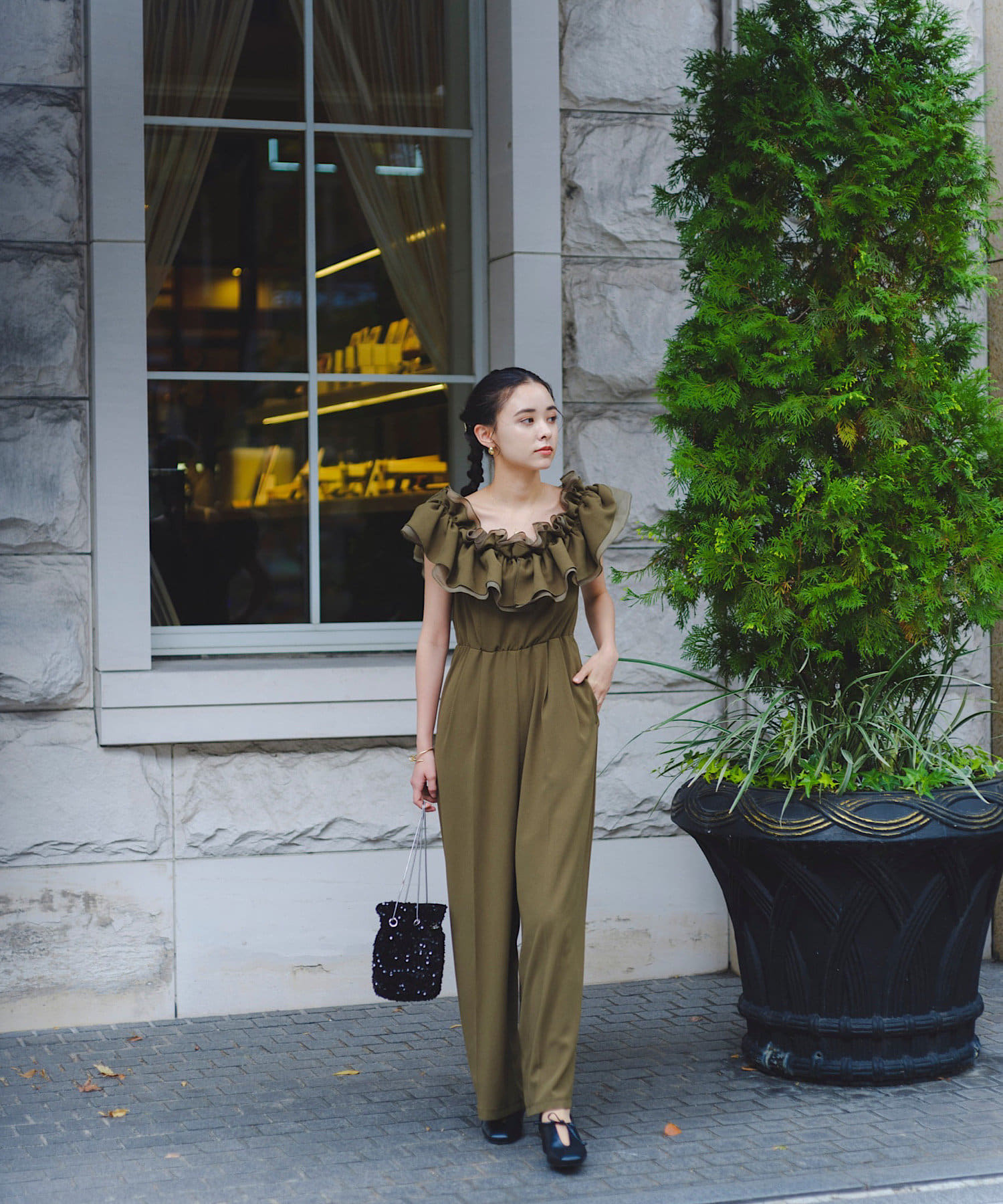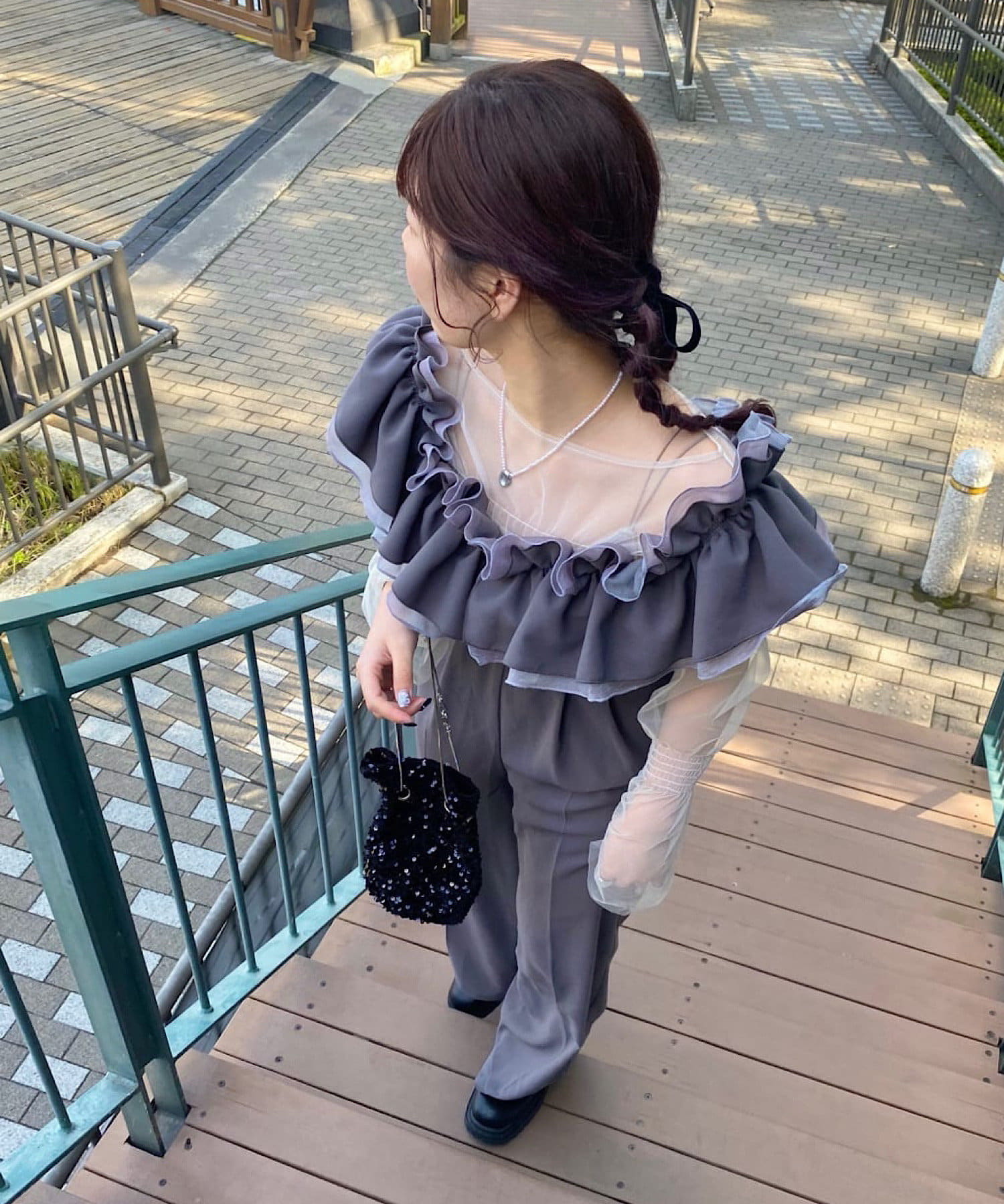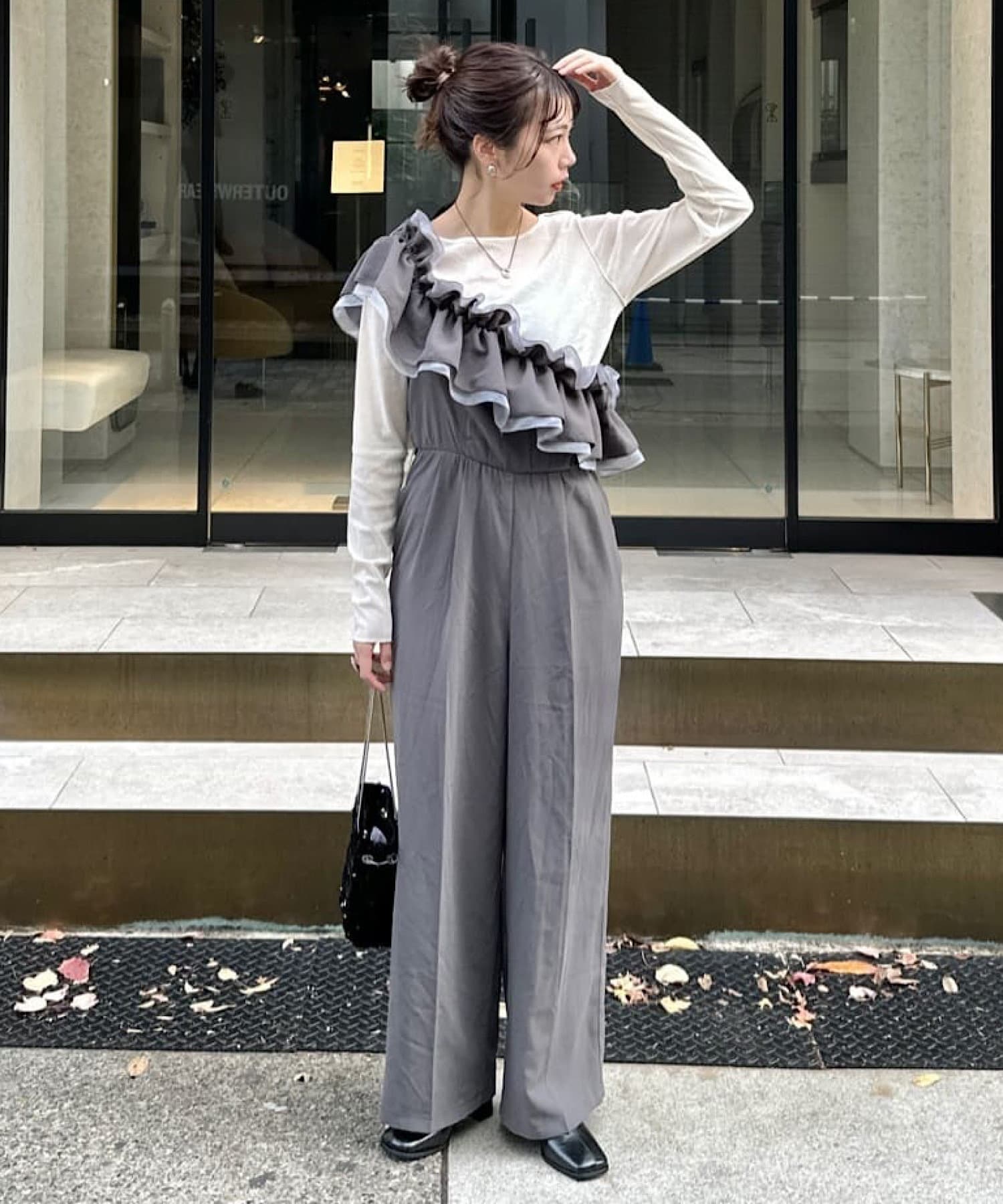 アウターやジャケットを羽織っても、胸元のフリルの存在感で華やかに。