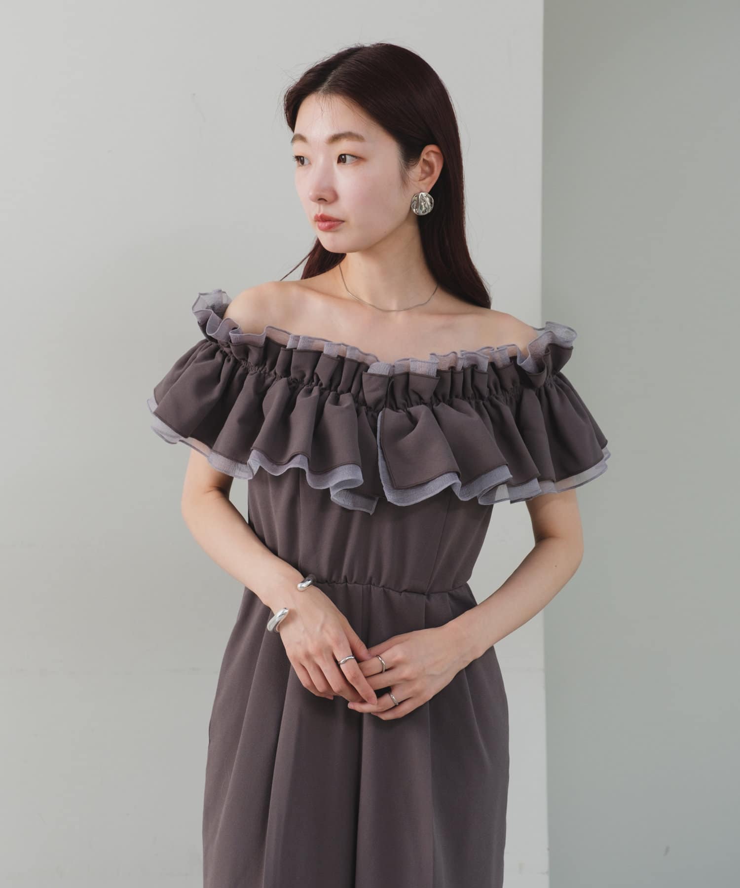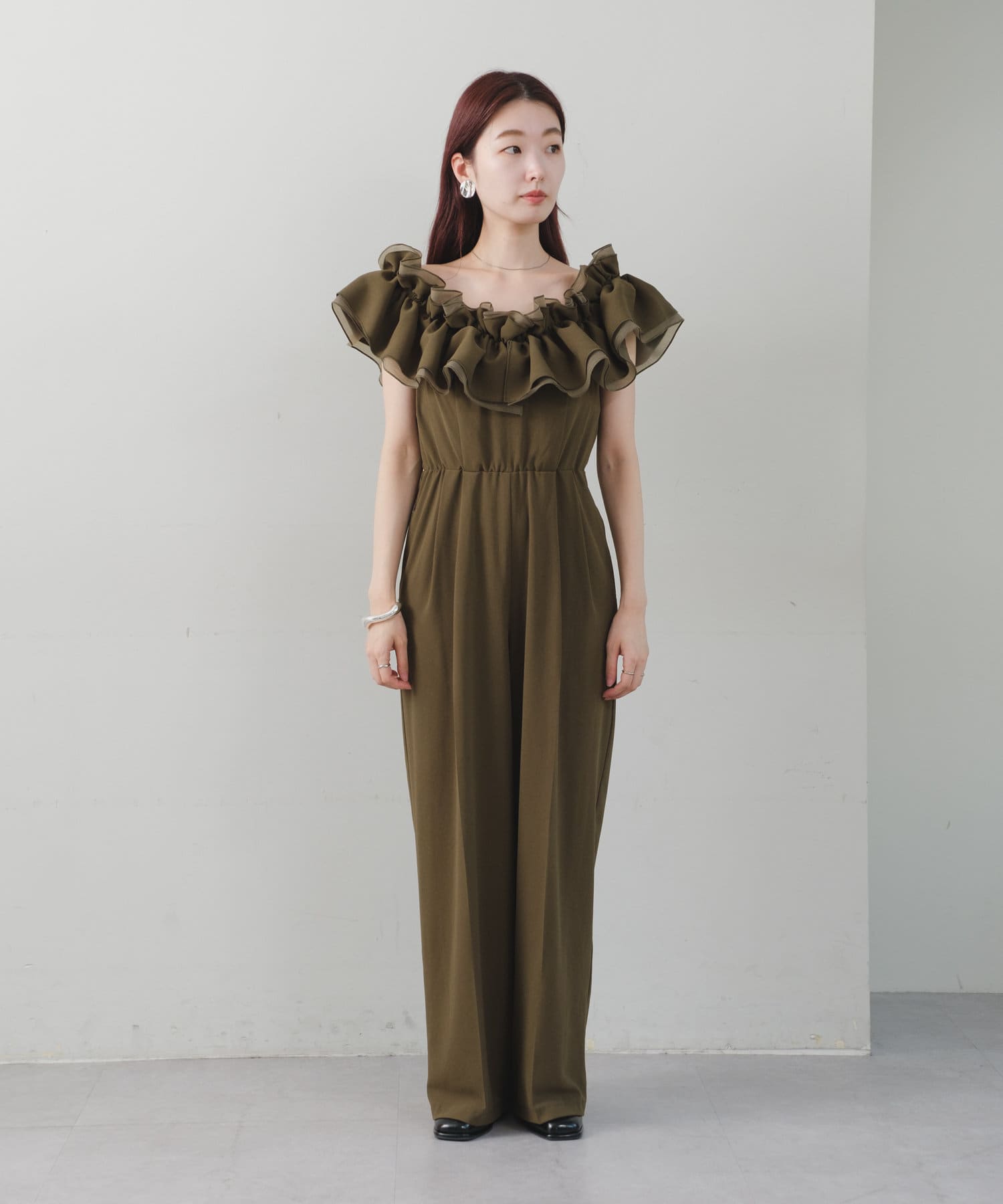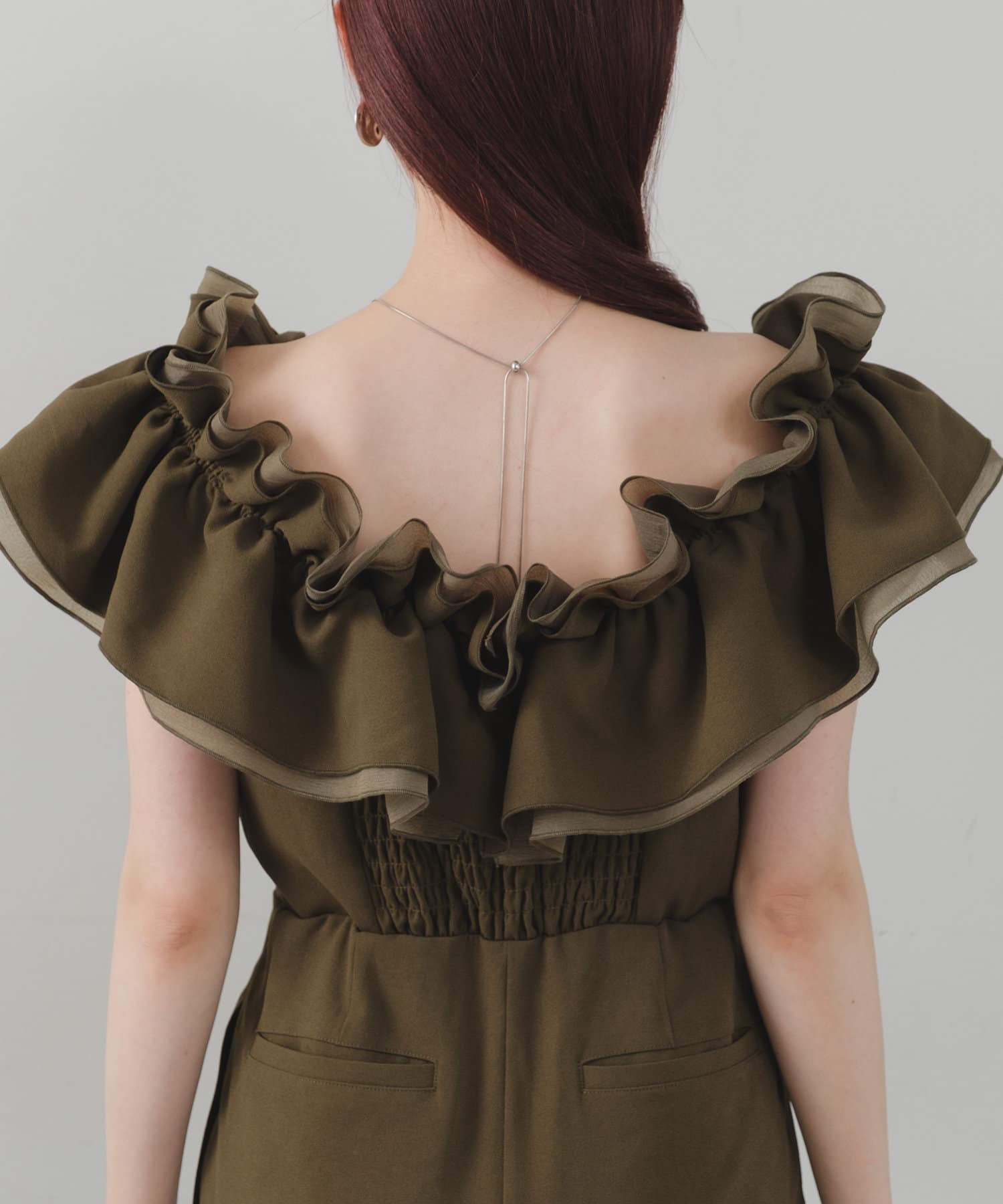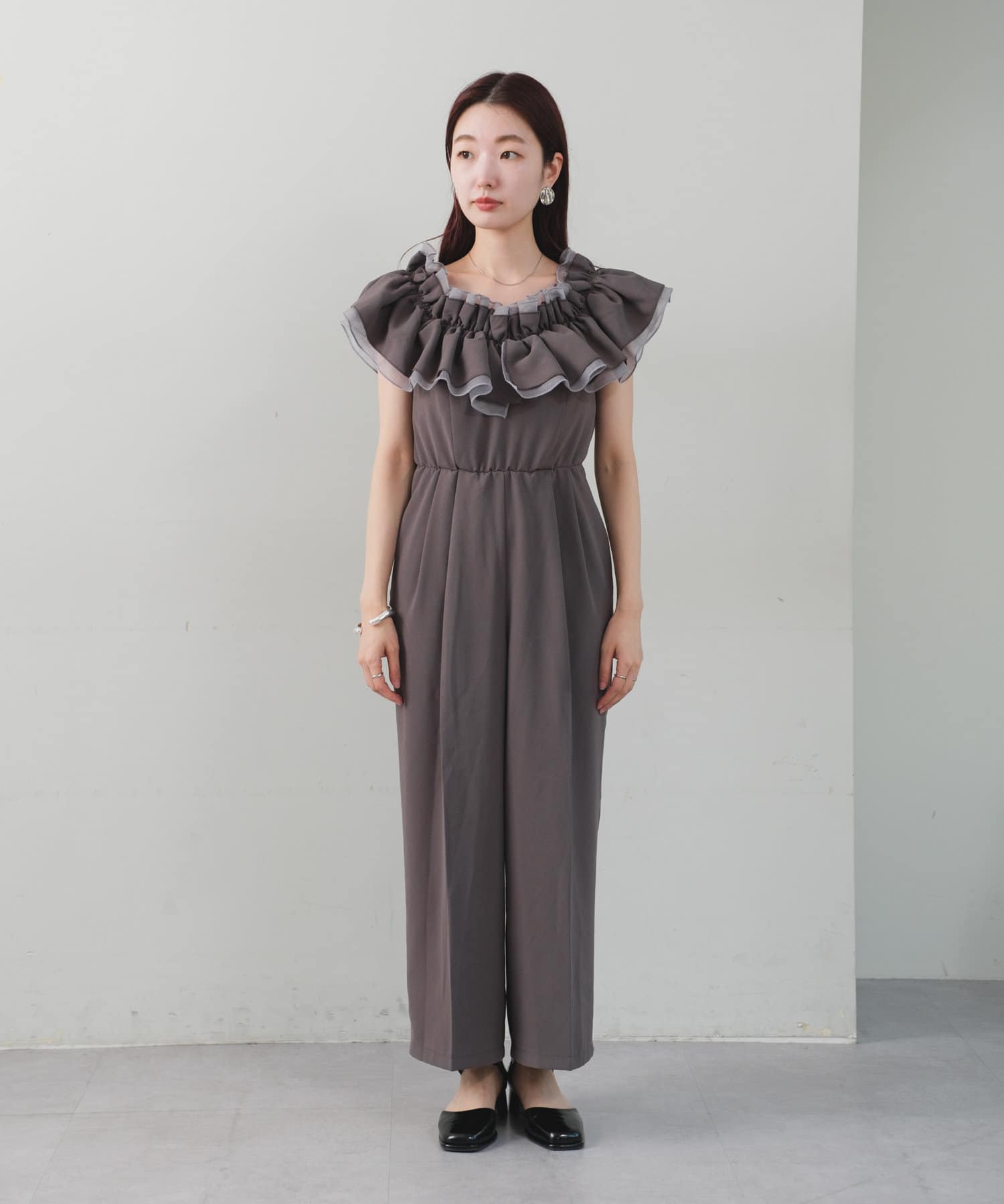 アウターやジャケットを羽織っても、胸元のフリルの存在感で華やかに。