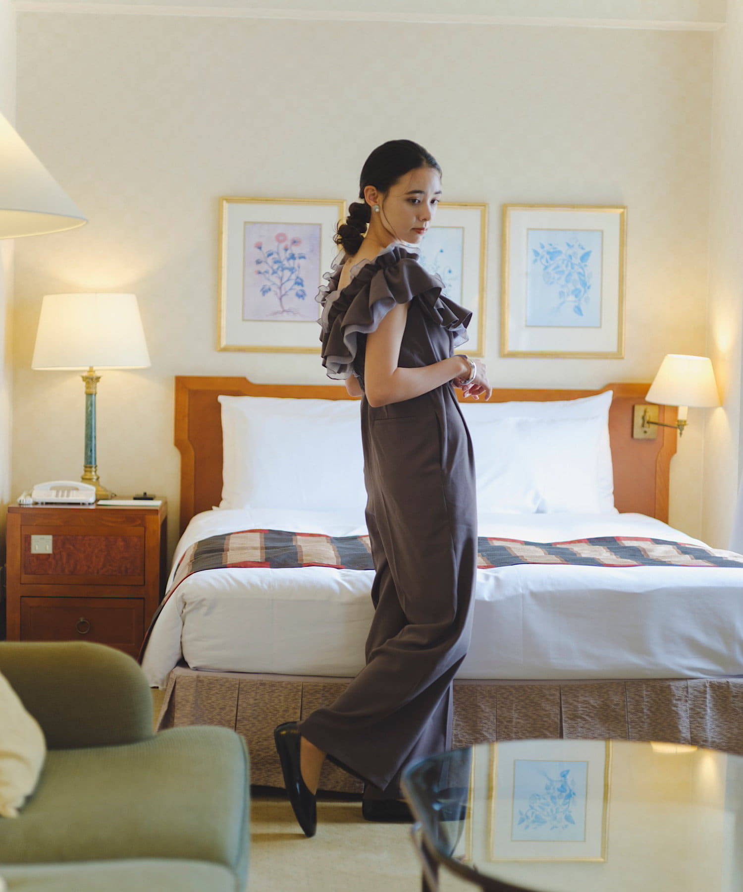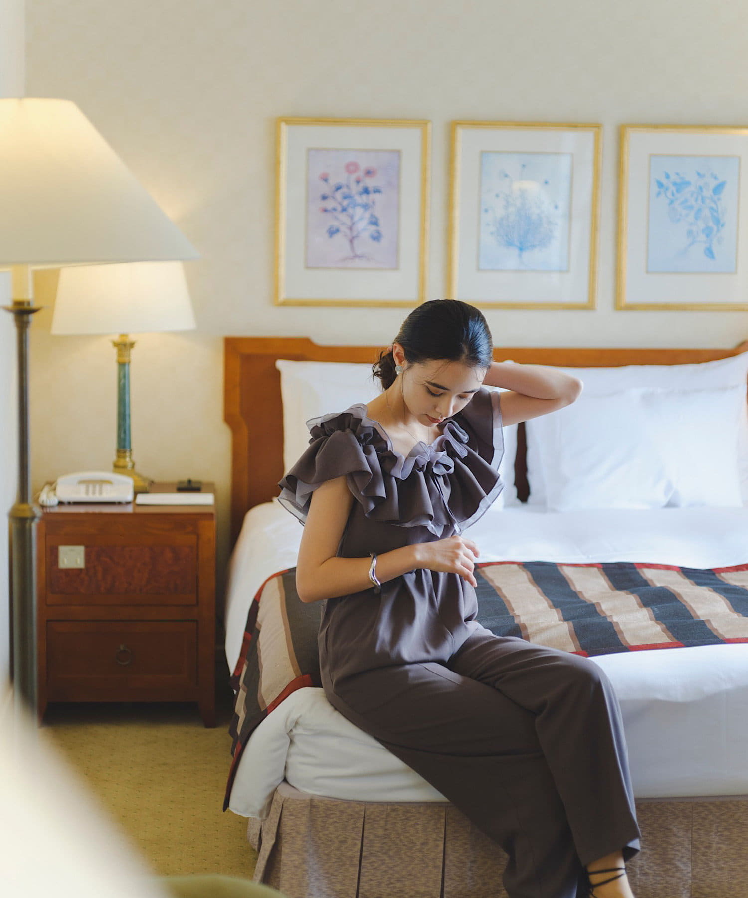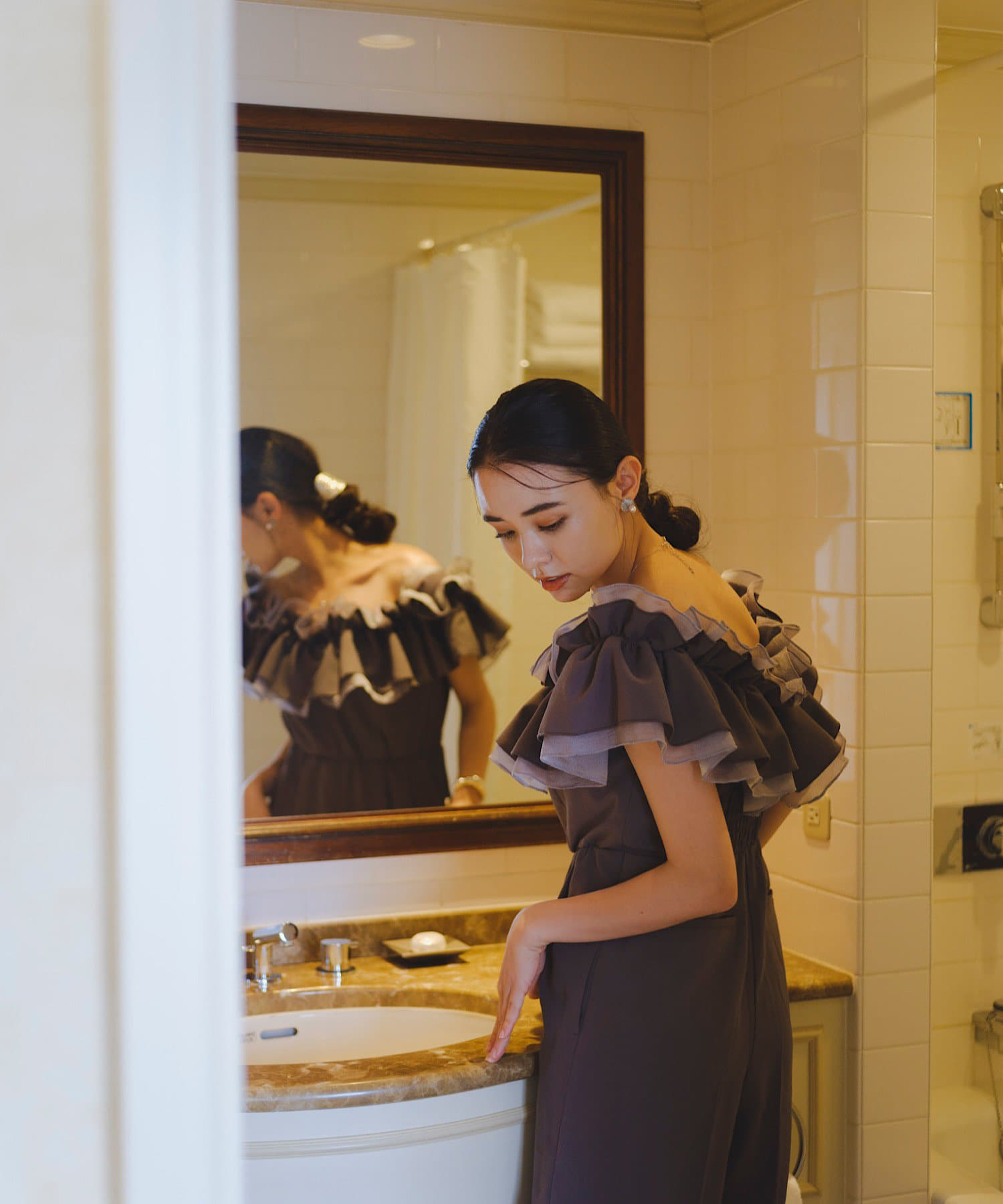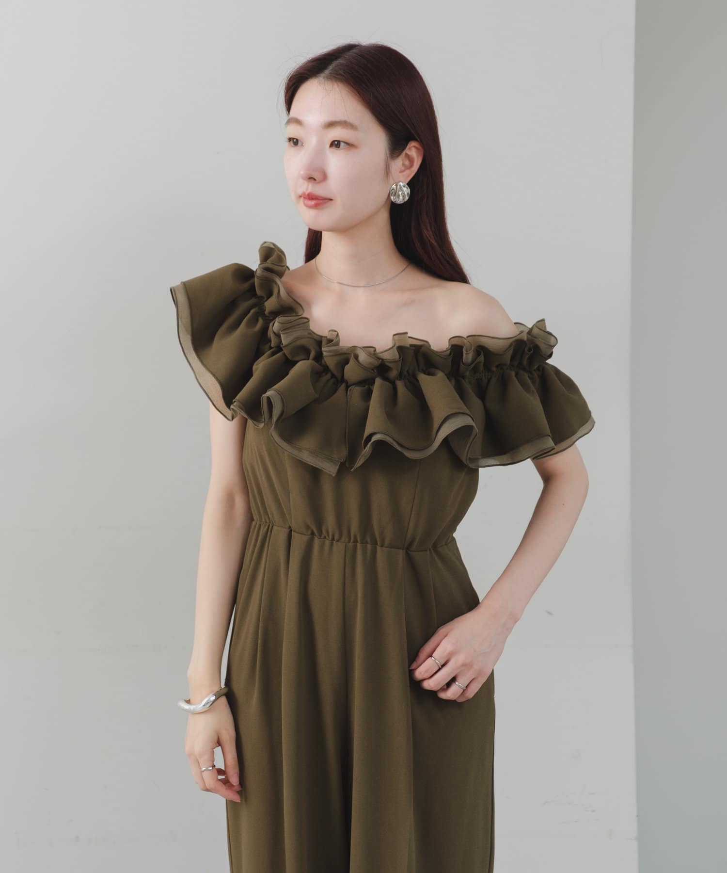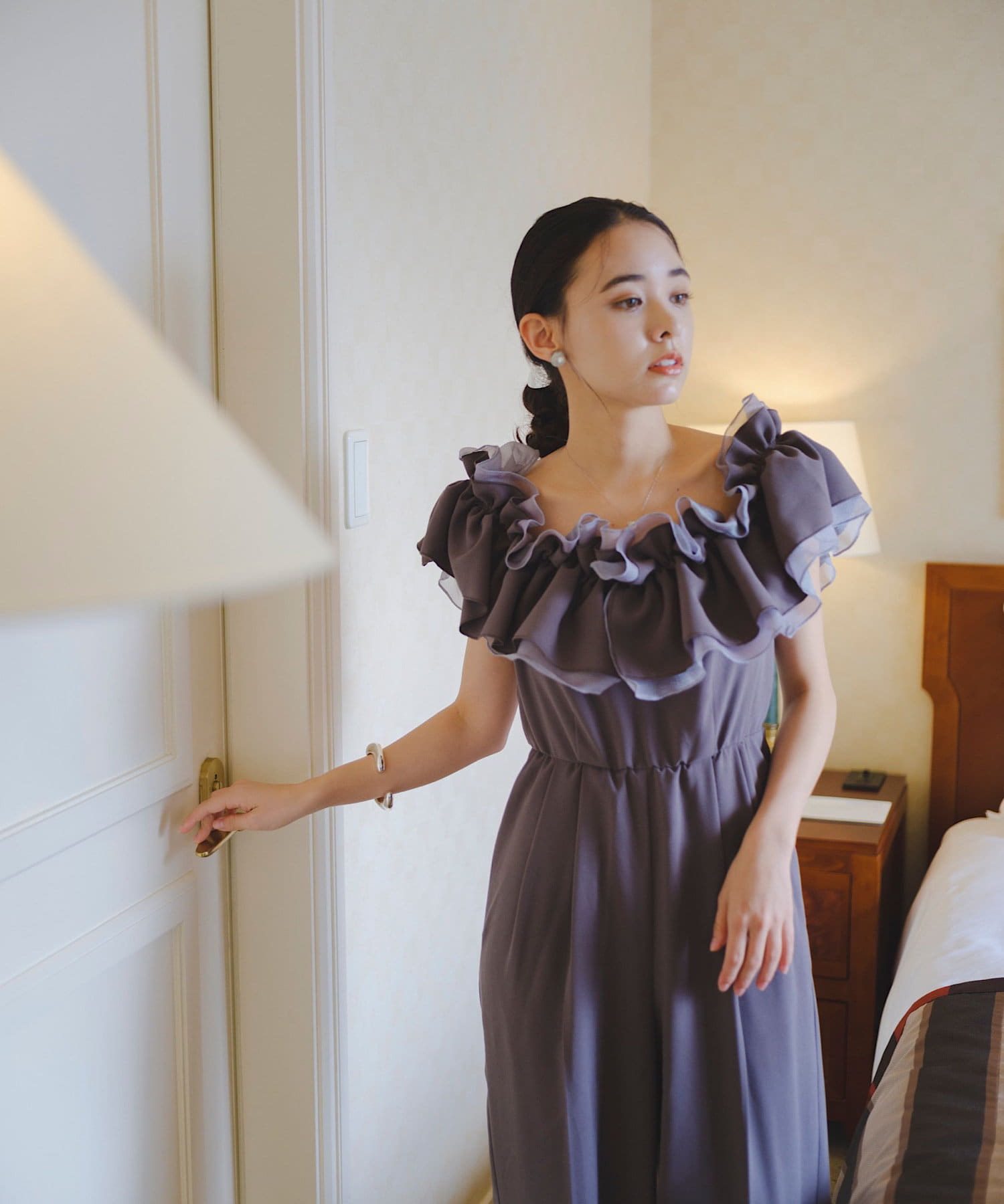 アウターやジャケットを羽織っても、胸元のフリルの存在感で華やかに。