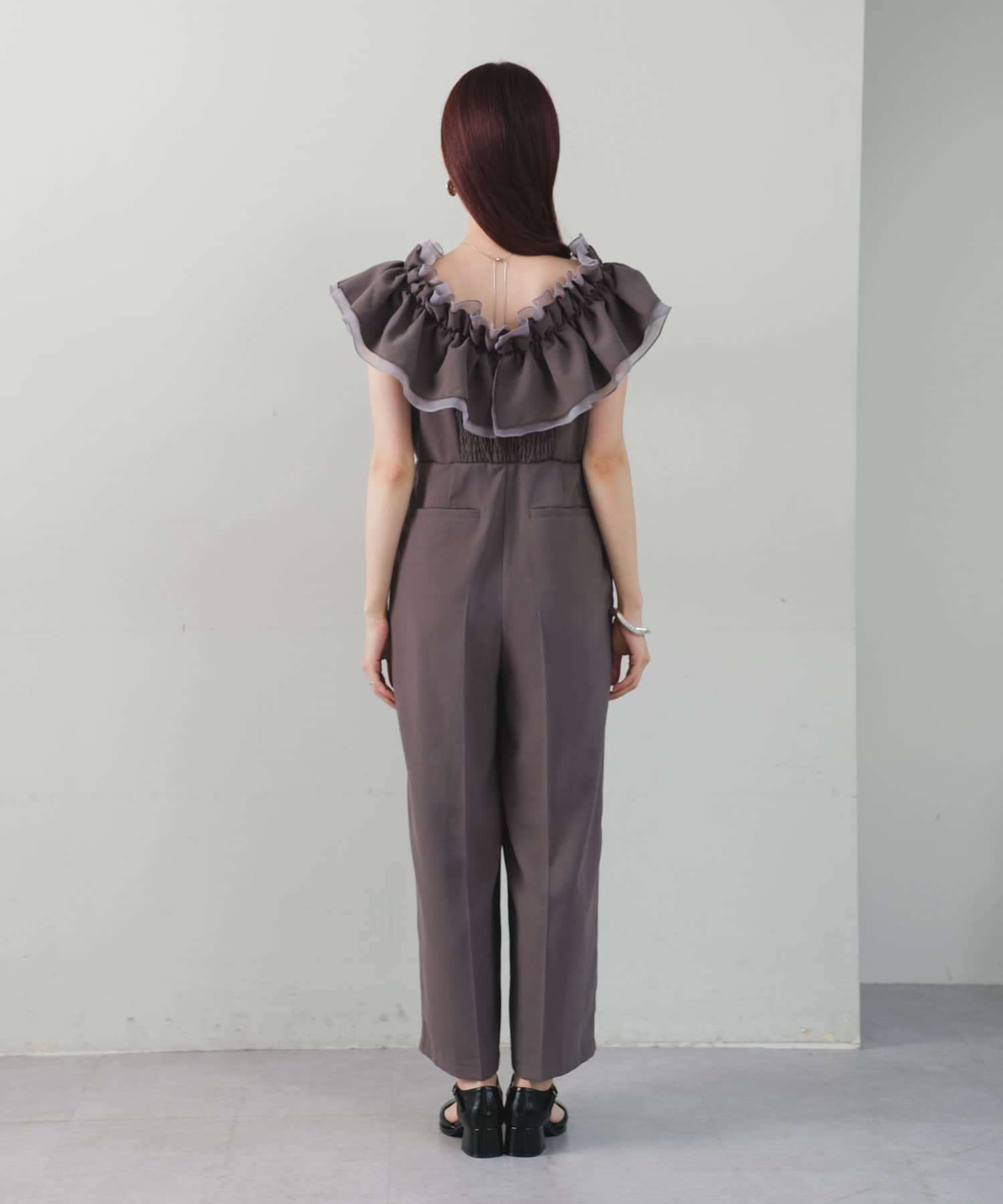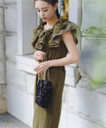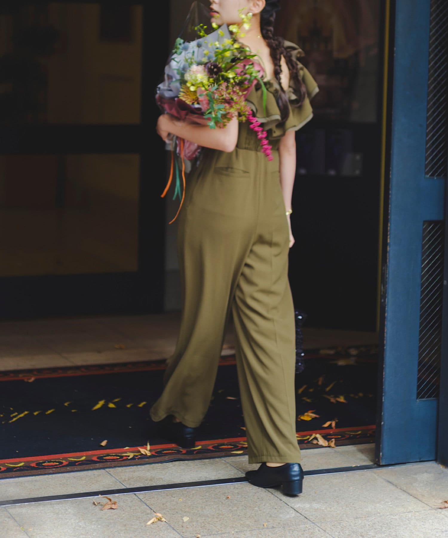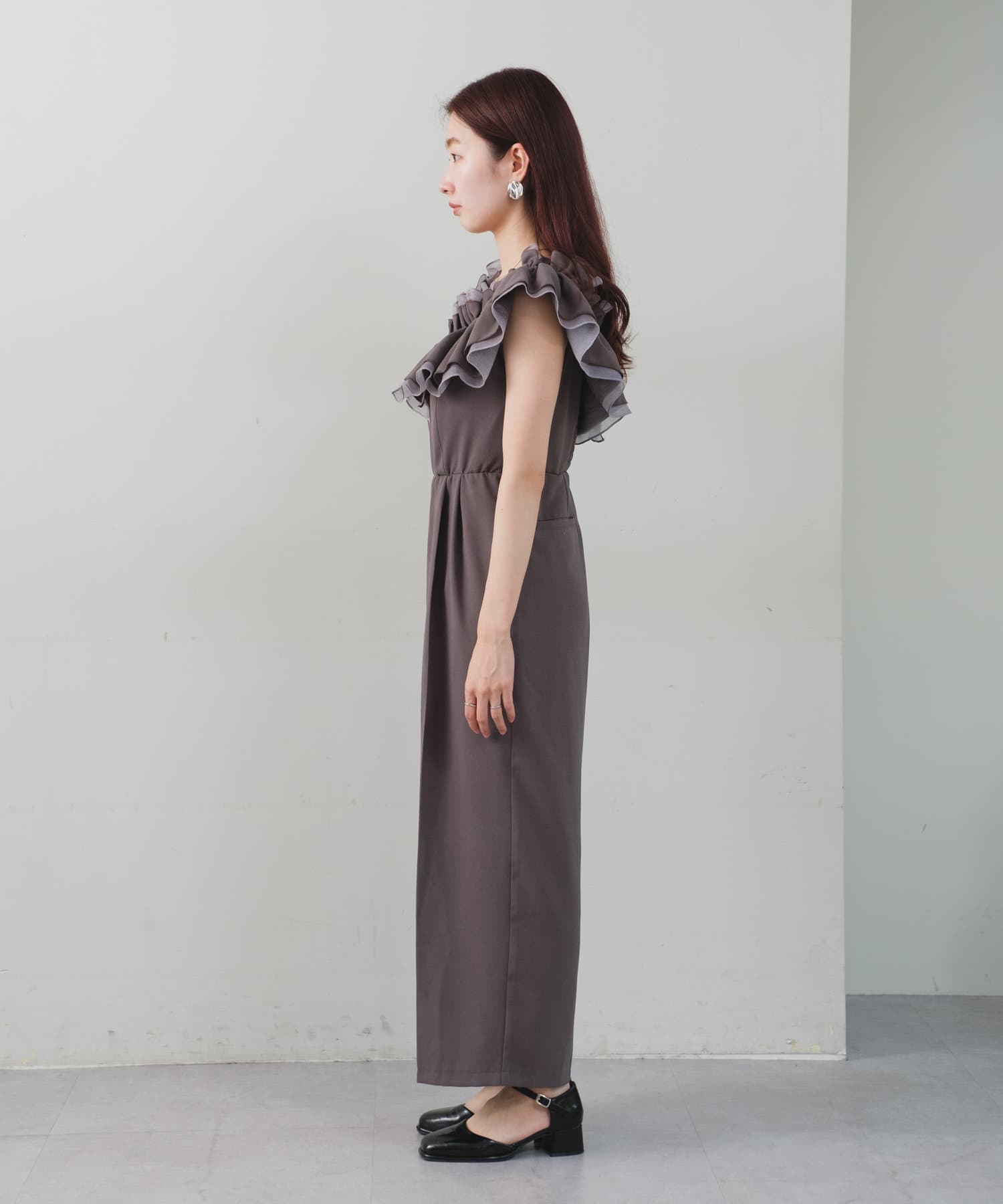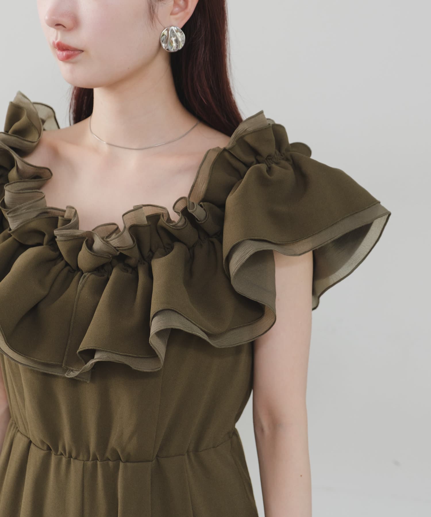 アウターやジャケットを羽織っても、胸元のフリルの存在感で華やかに。