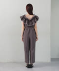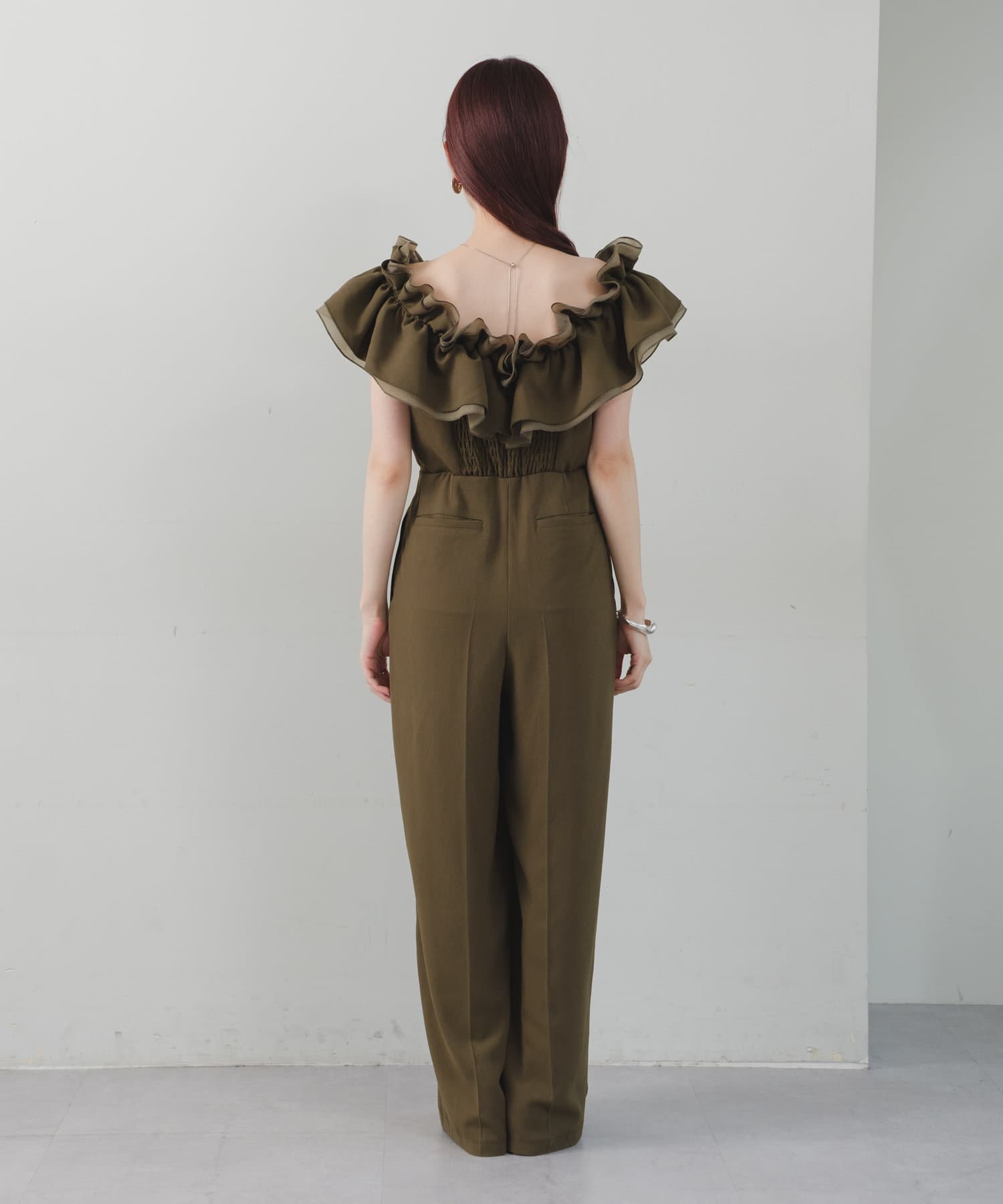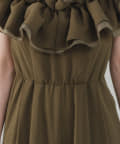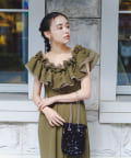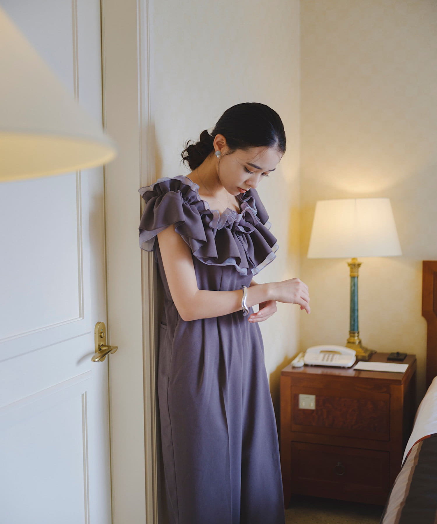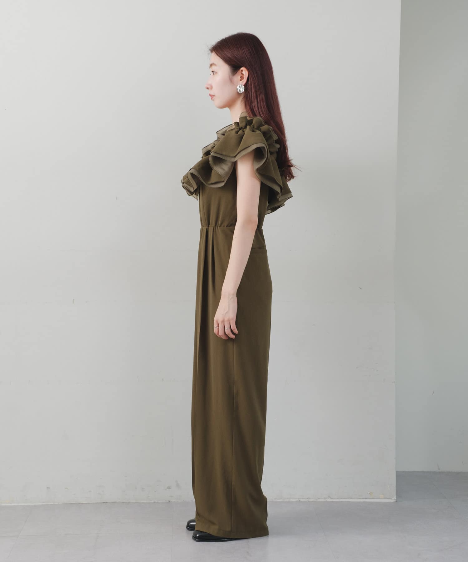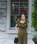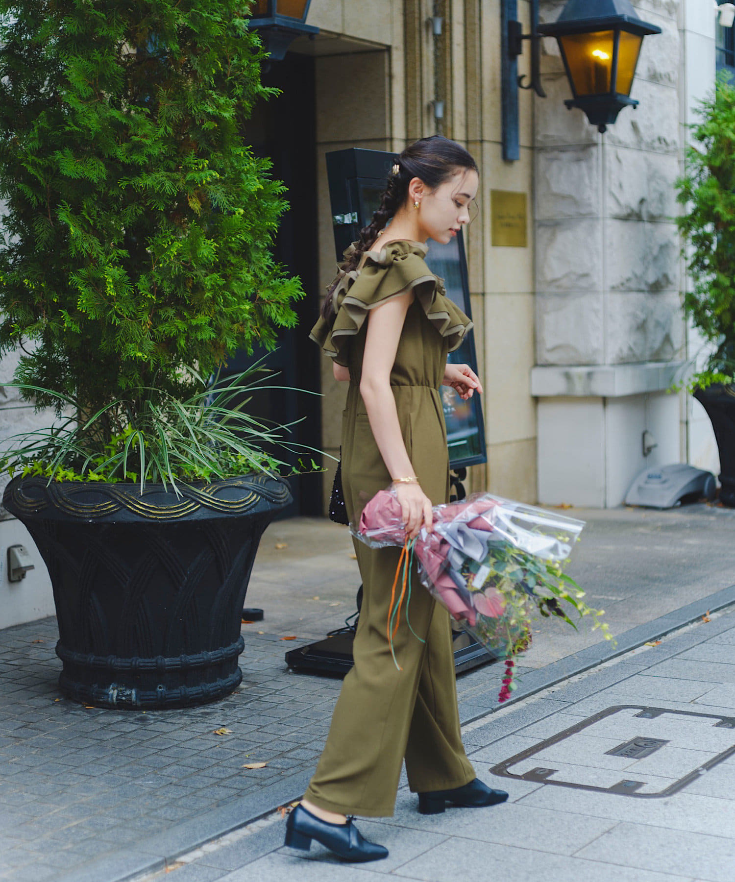 アウターやジャケットを羽織っても、胸元のフリルの存在感で華やかに。