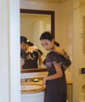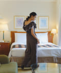 肩を落としてオフショルダーや腕を片方抜いて襷掛けのような着方もできるので、一枚で様々な雰囲気を楽しめます。