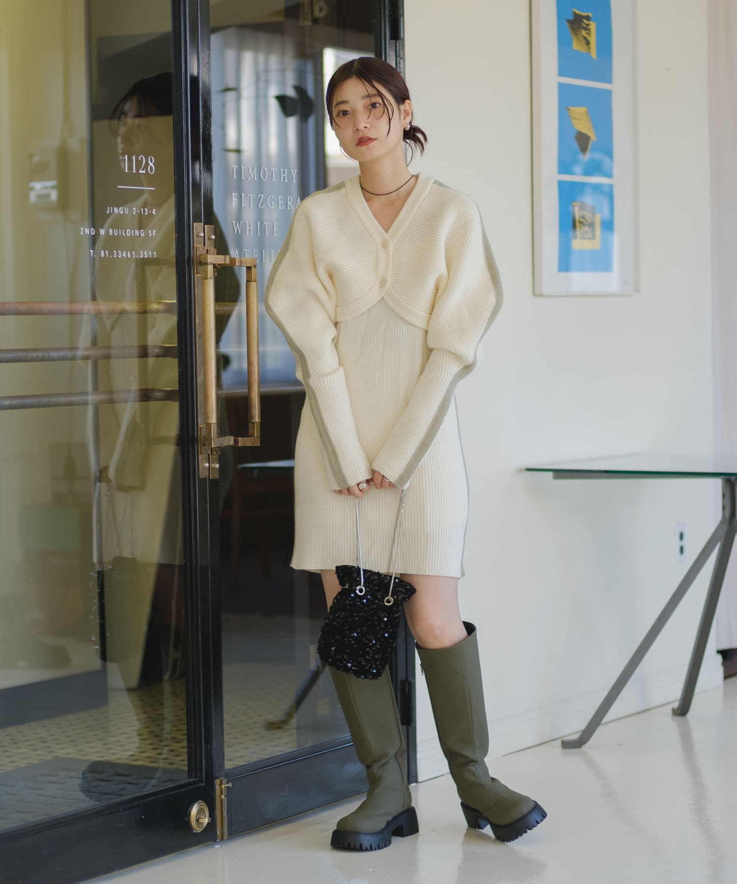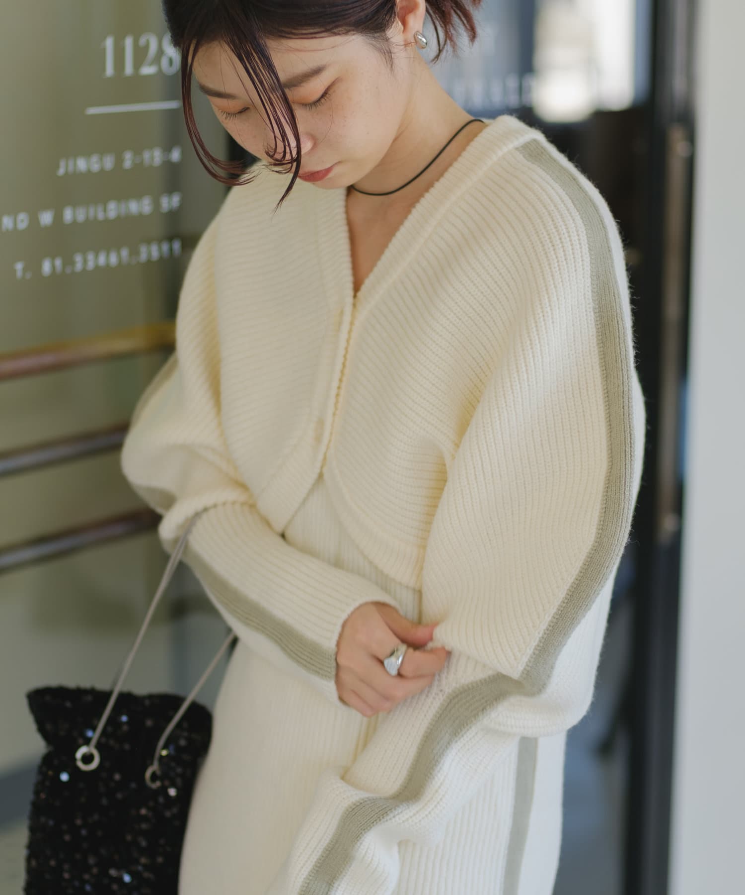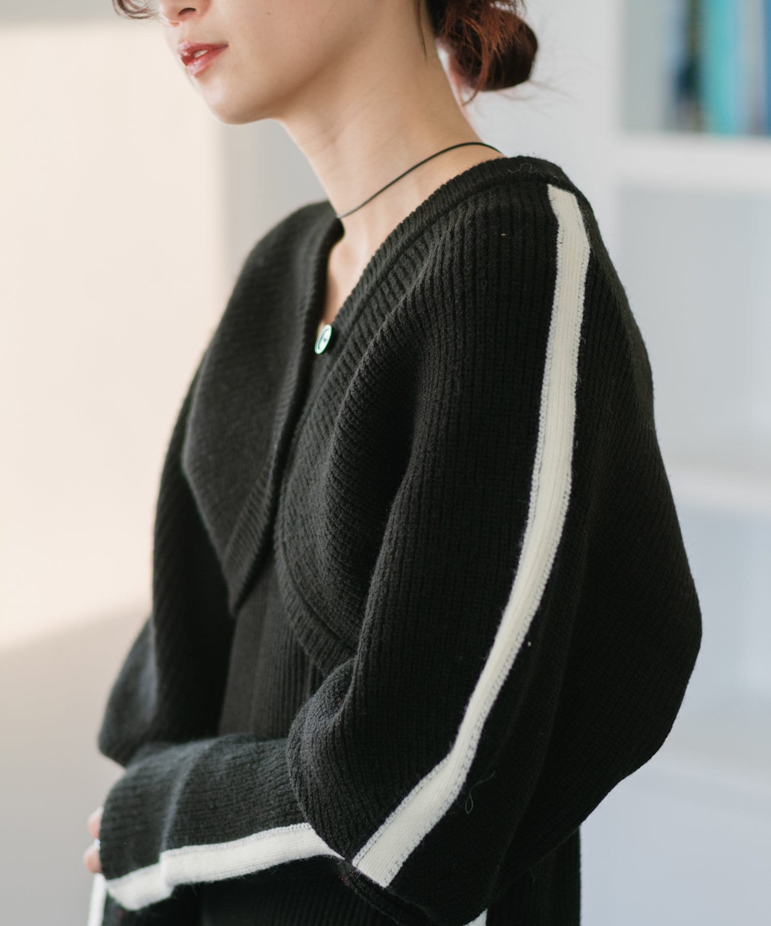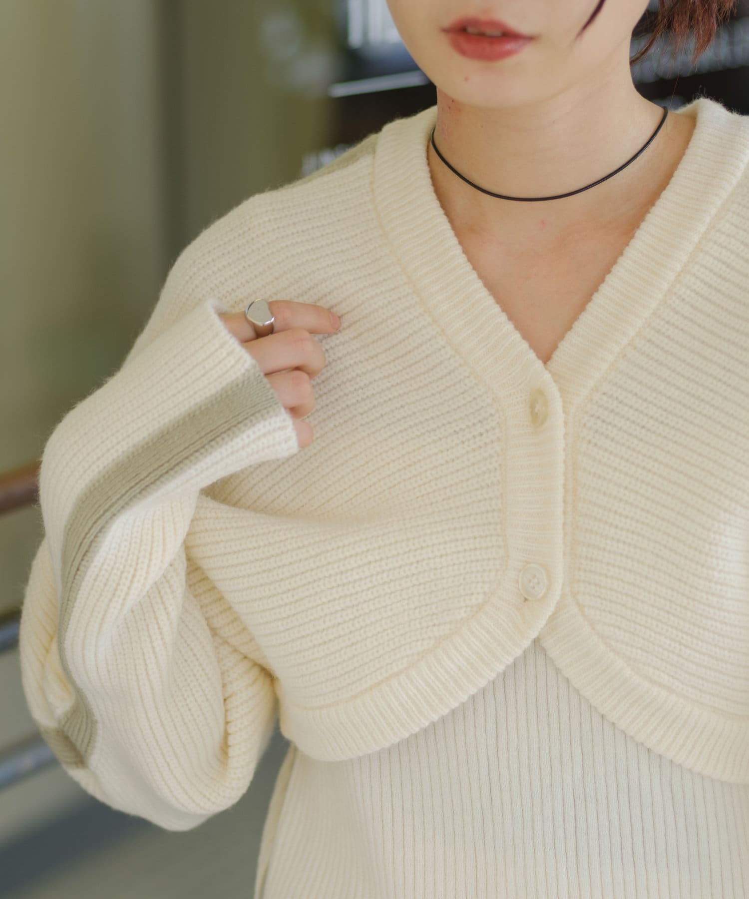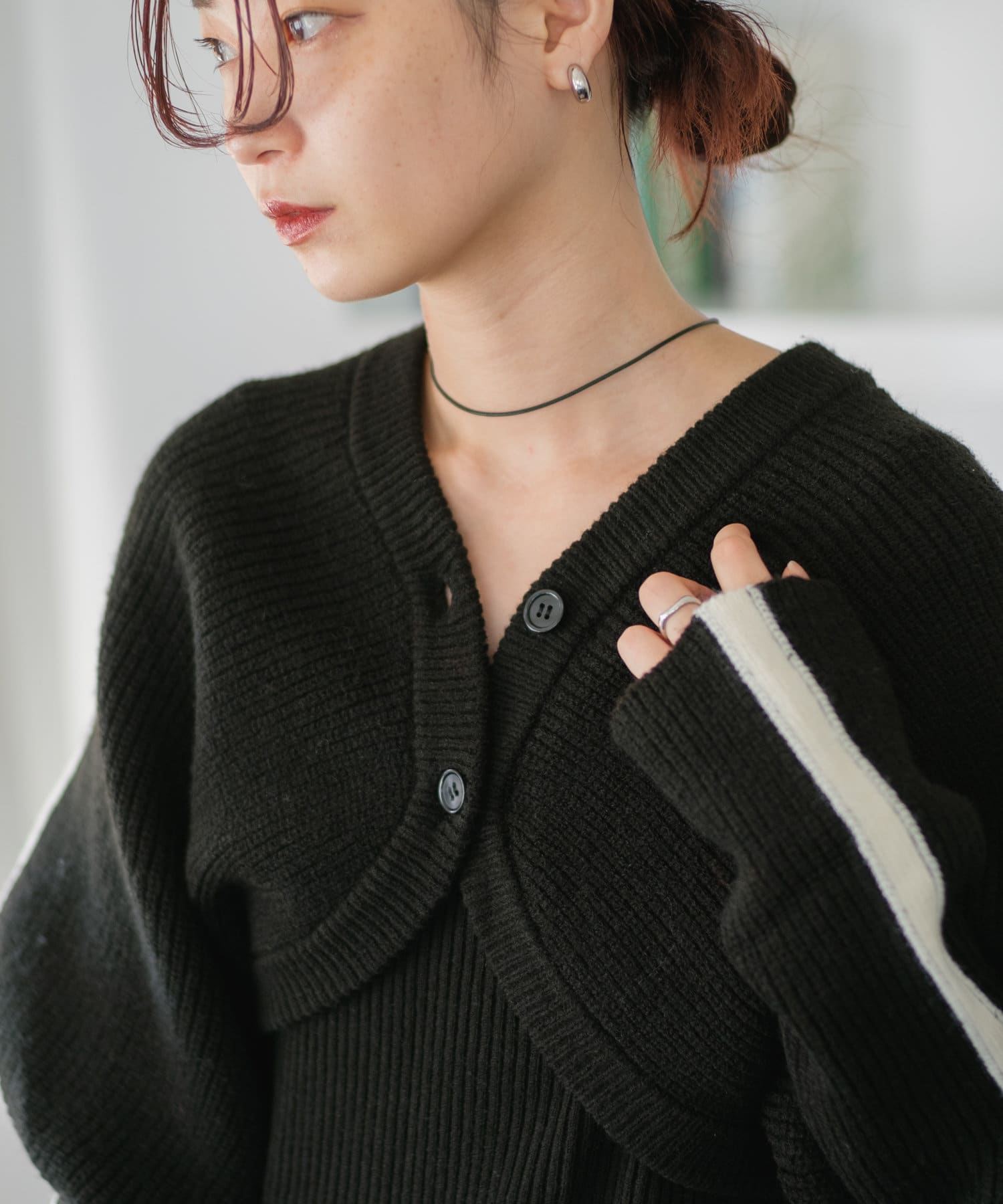 カーディガンは腕にフィットするぴたっとめの袖で長めなのでアームカバー風にも。