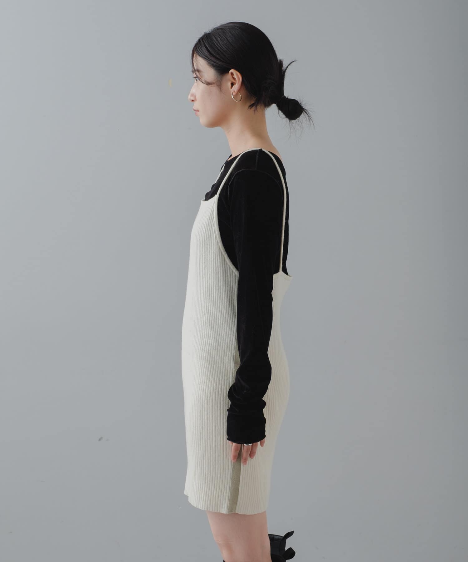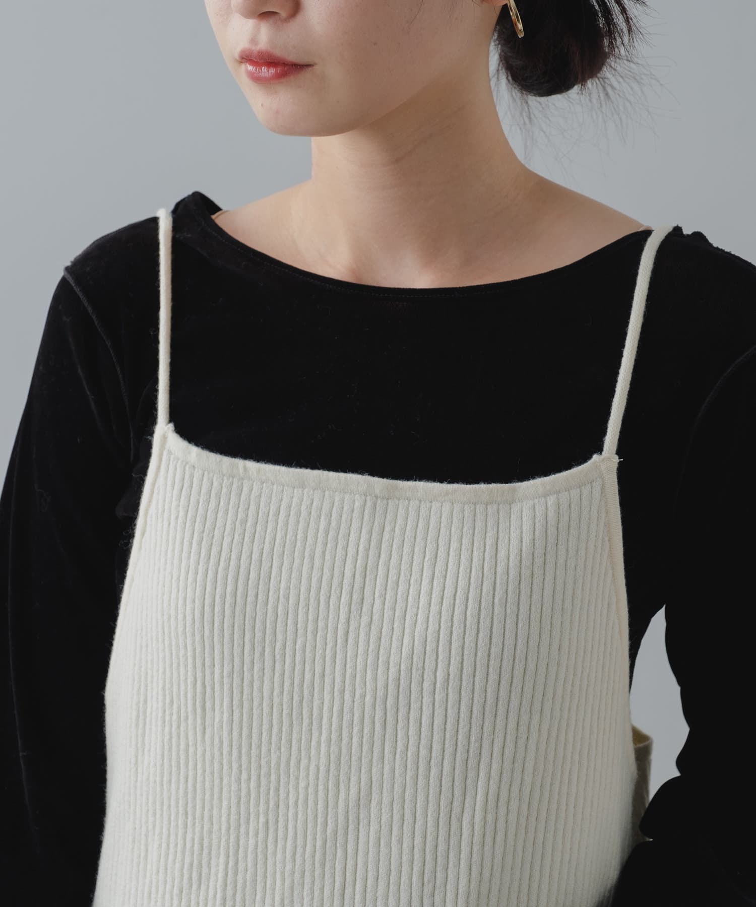 キャミワンピースはゆるめのニットと合わせてスカート風として着たり、デニムと合わせても。