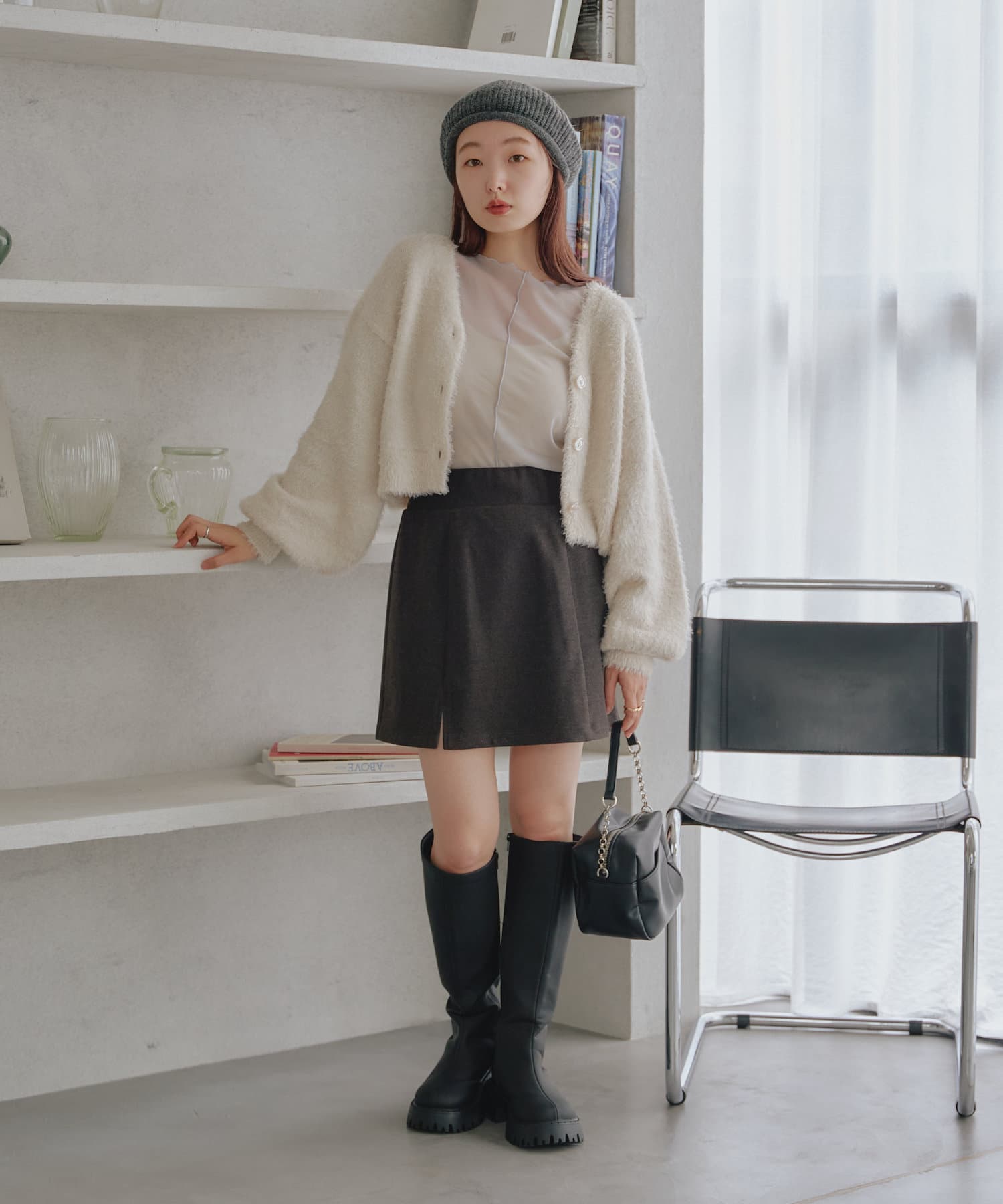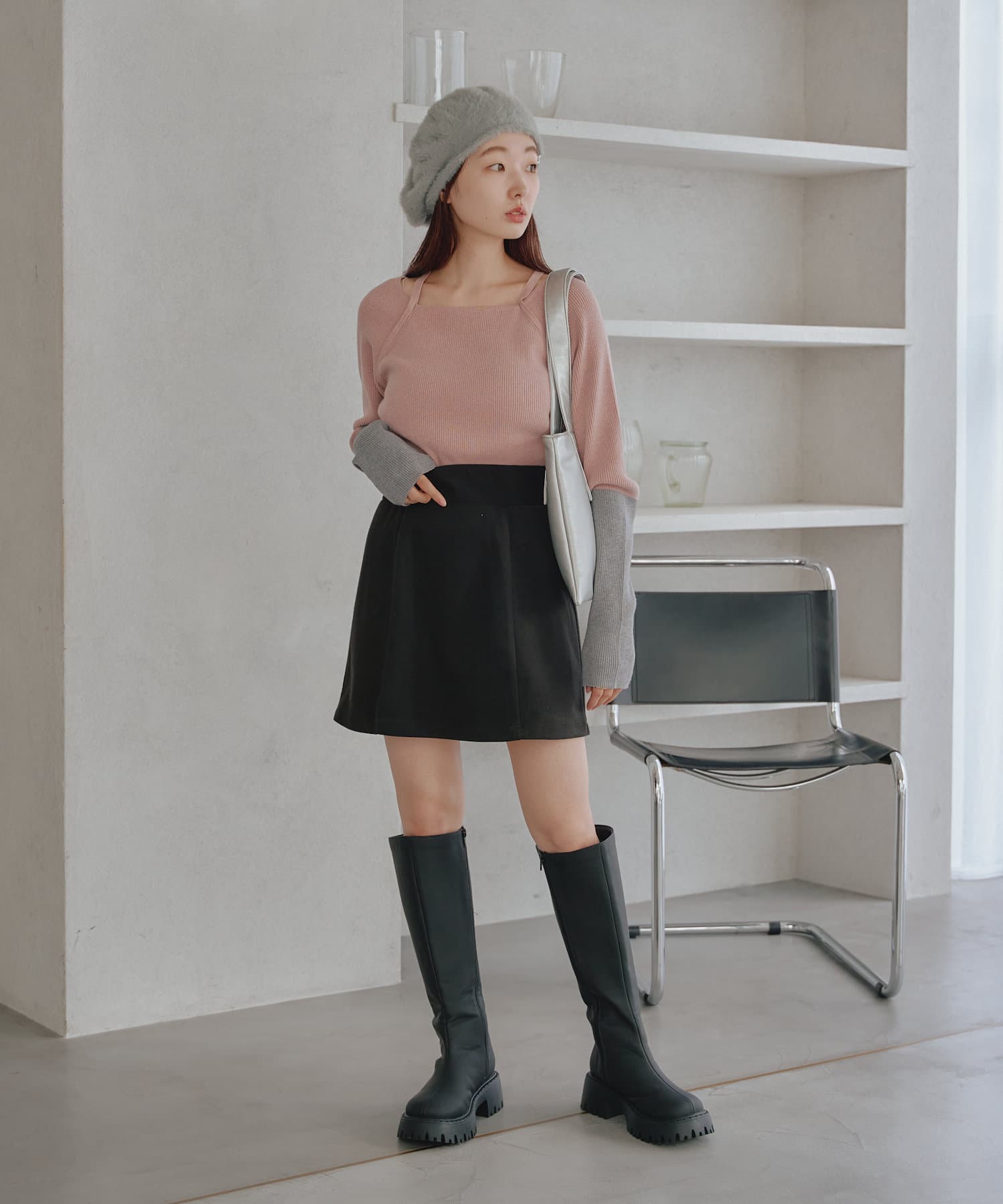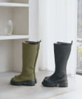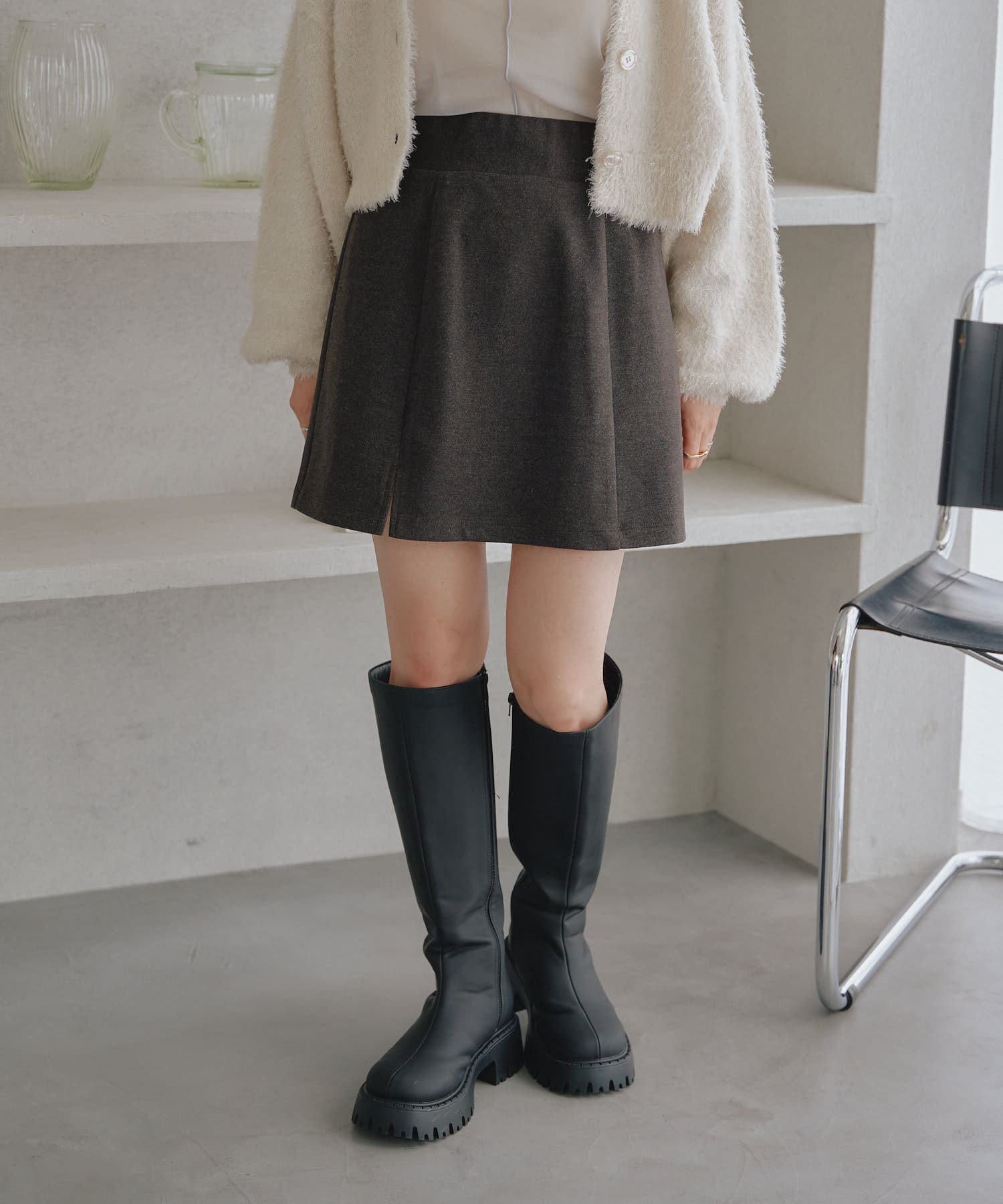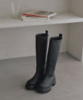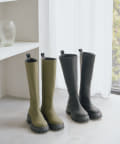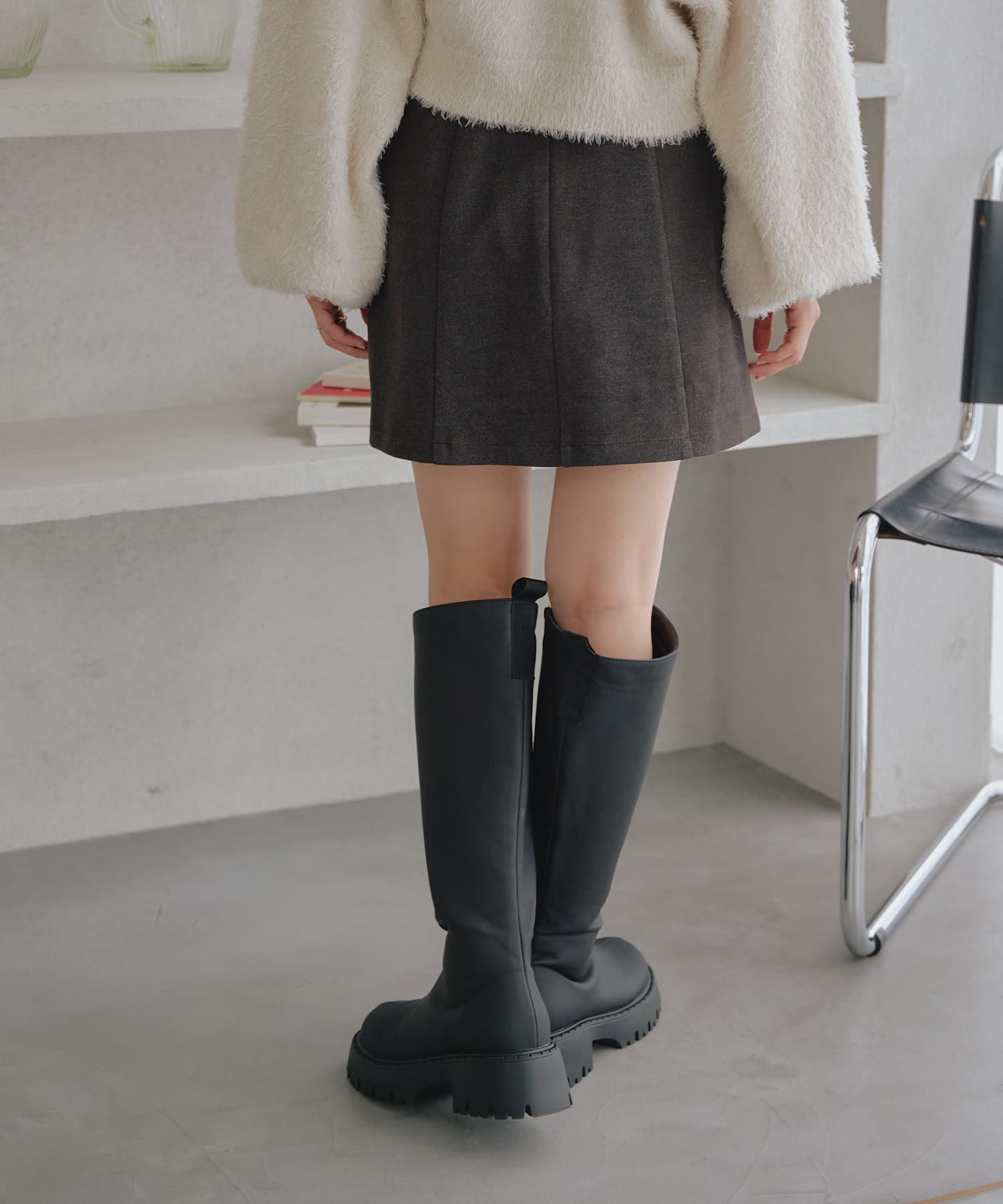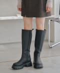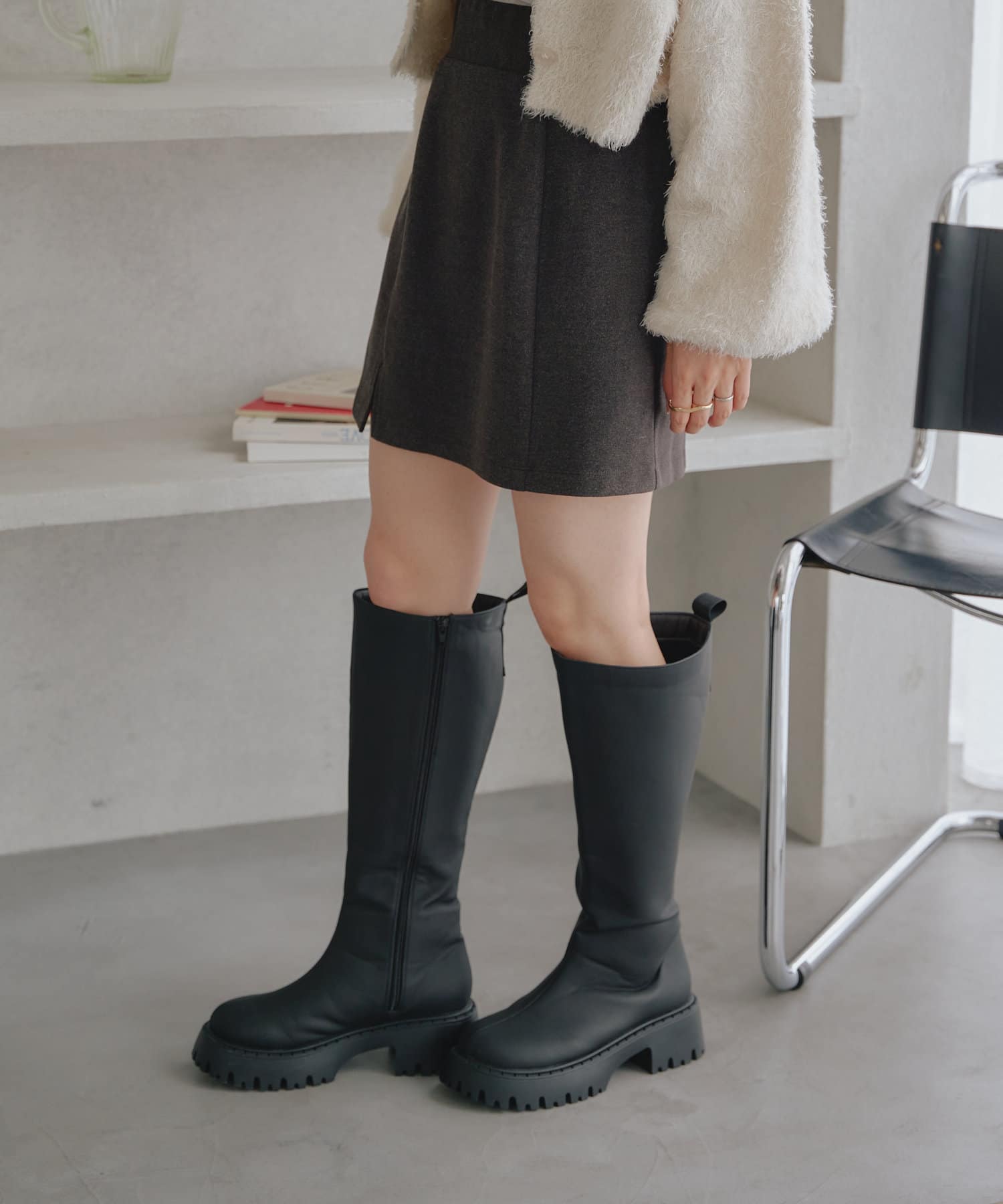 マットな合成素材を使ったロングブーツなので大人な印象に。