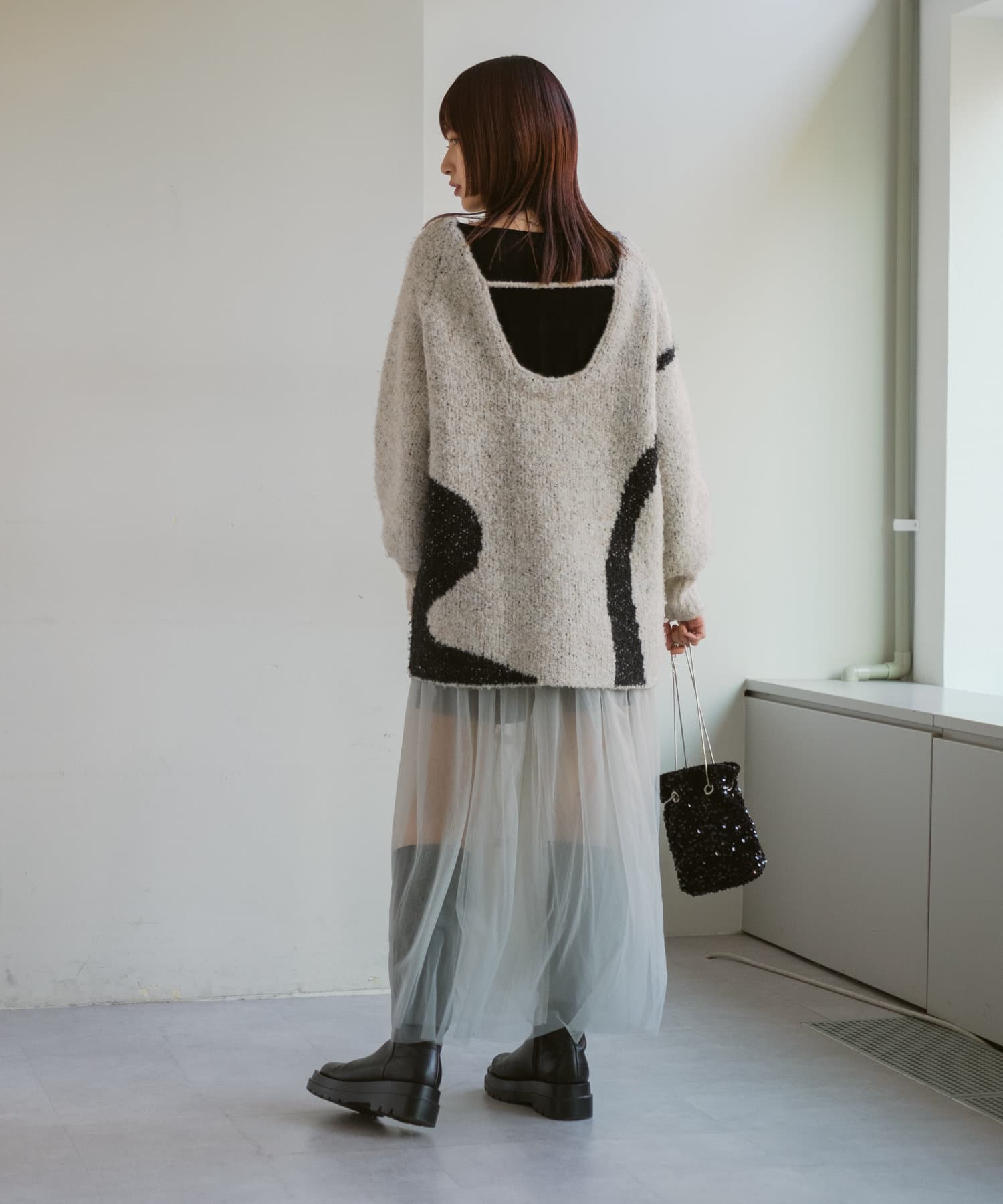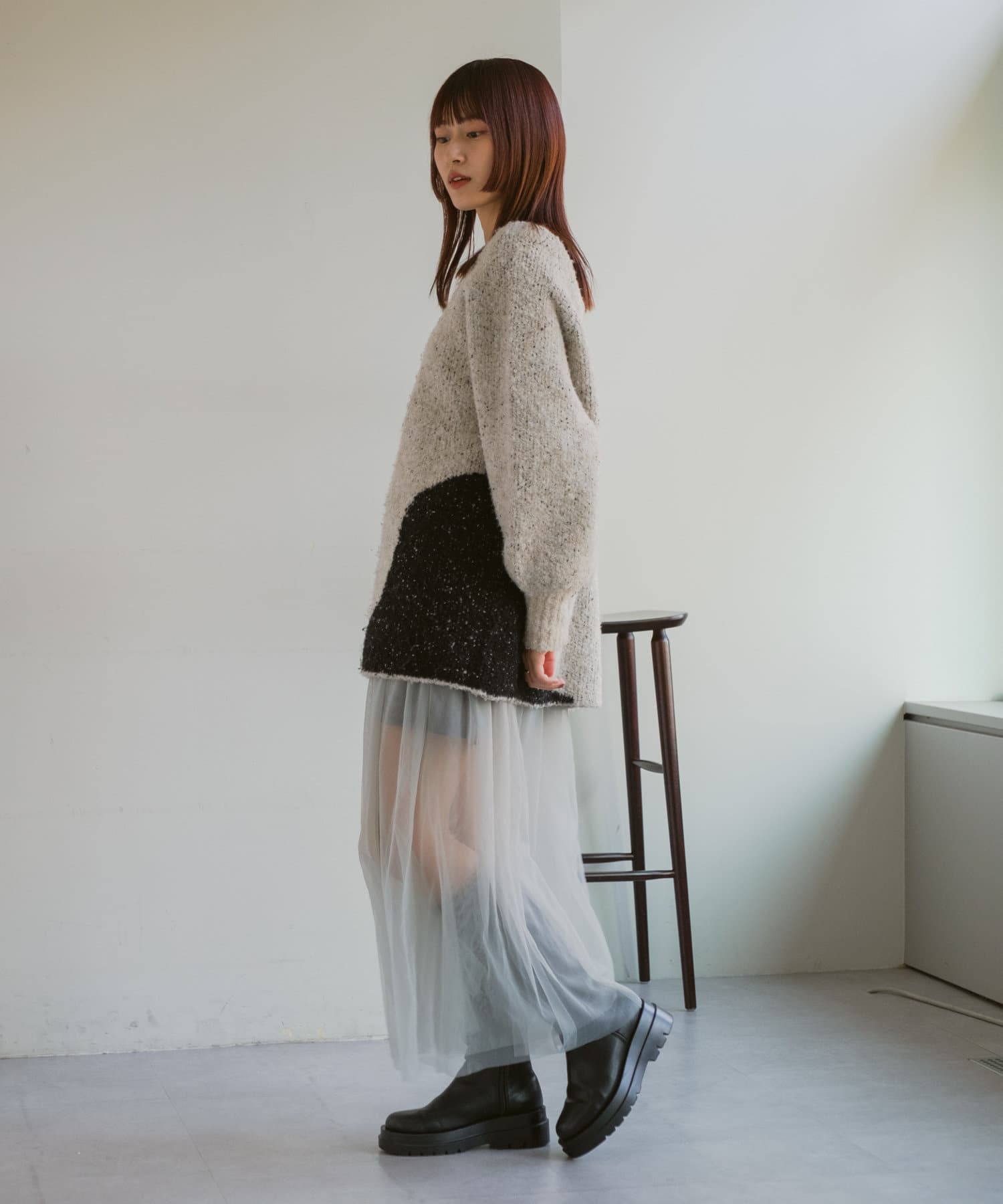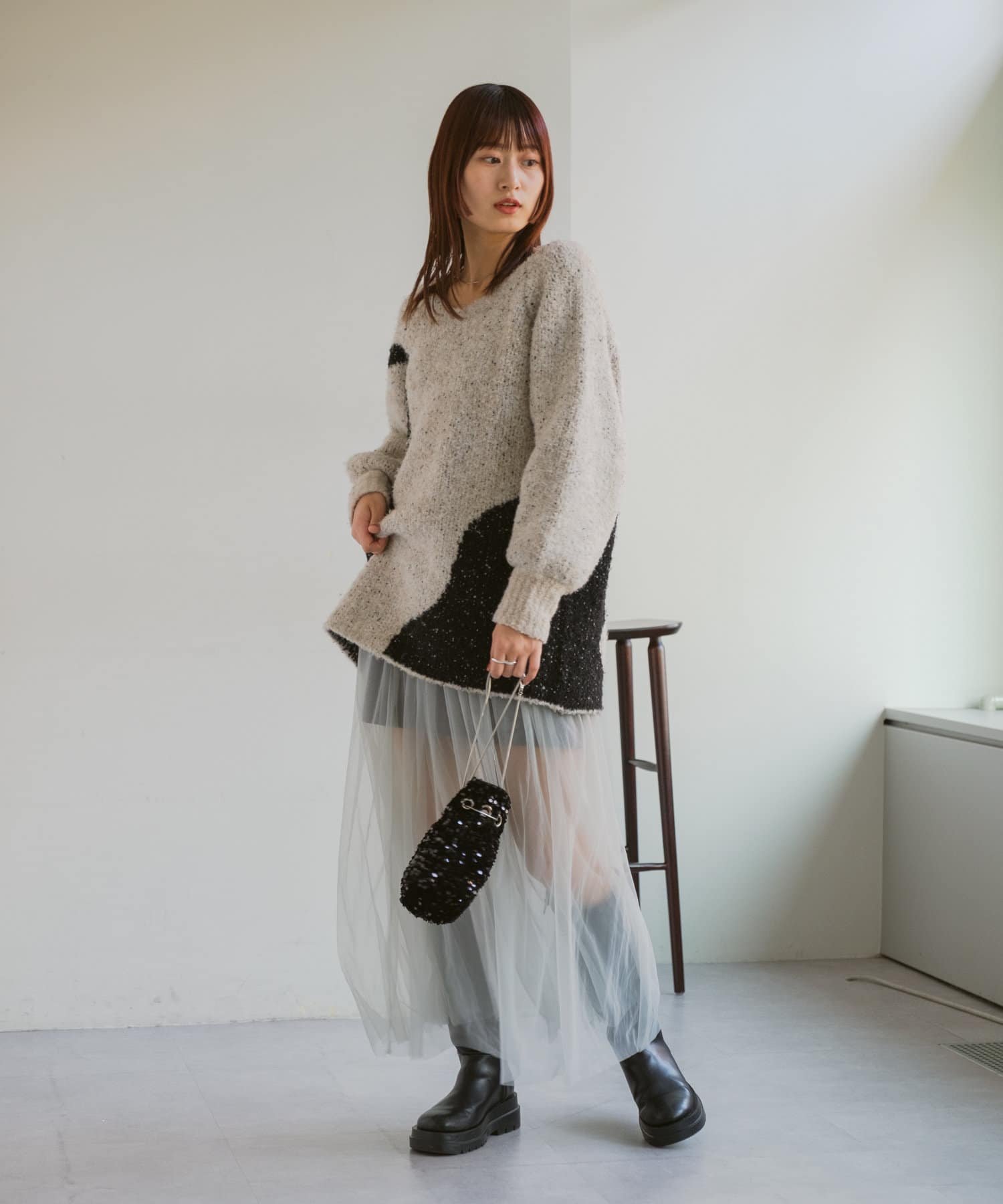 チュニック丈のニットや、あえてスウェットを合わせてカジュアルダウンなスタイリングもおススメ。