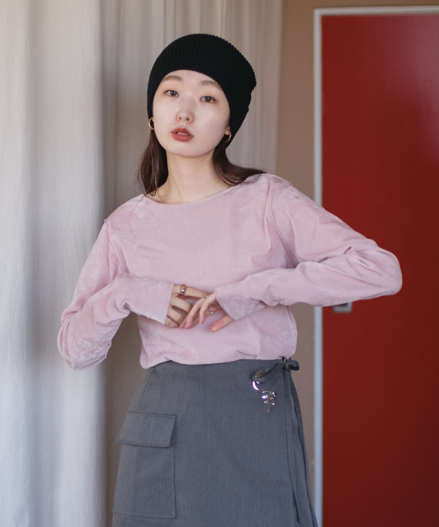 上品なベロア生地なのでデニムパンツにインしてカジュアルダウンしていただくのもおすすめです。