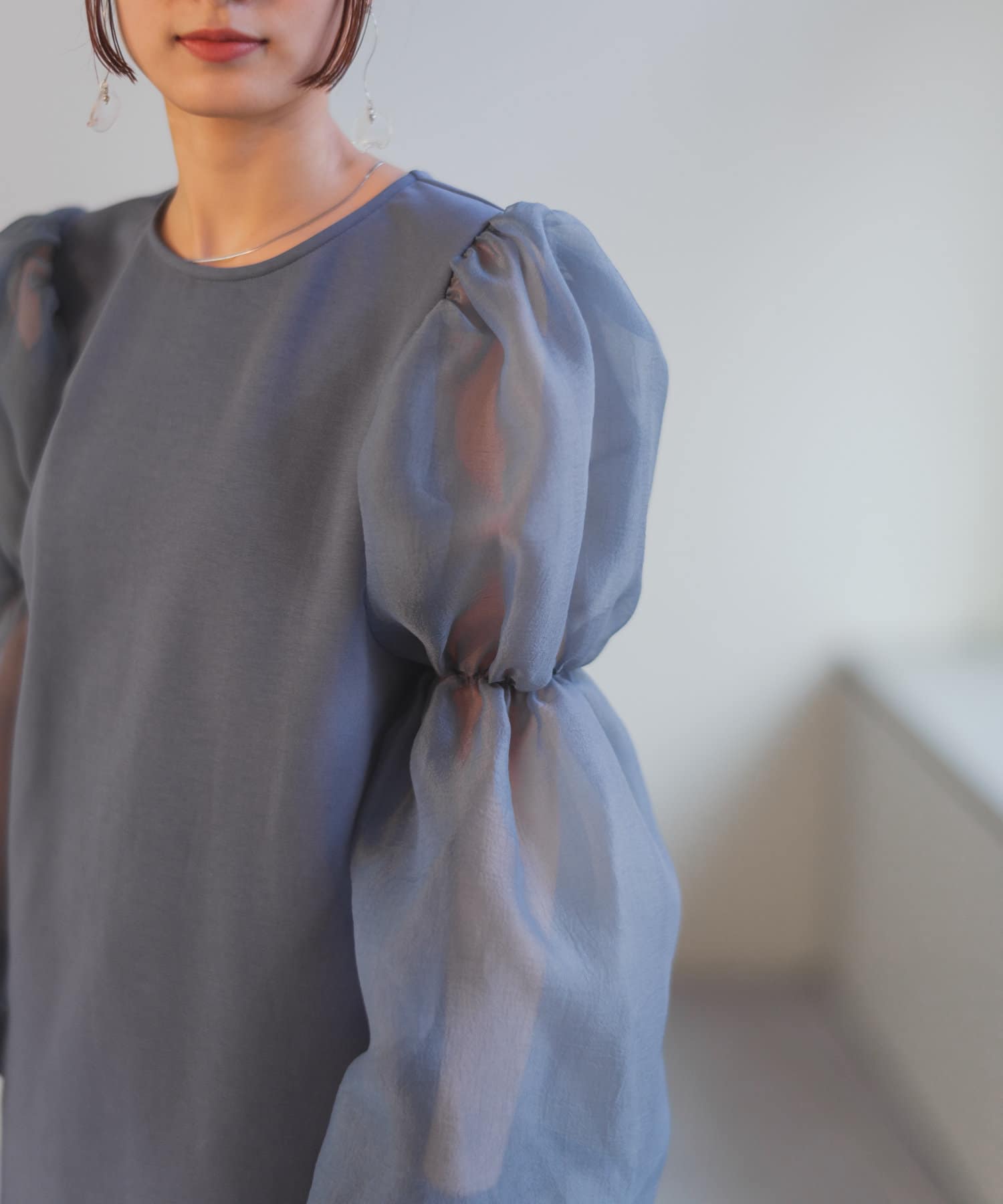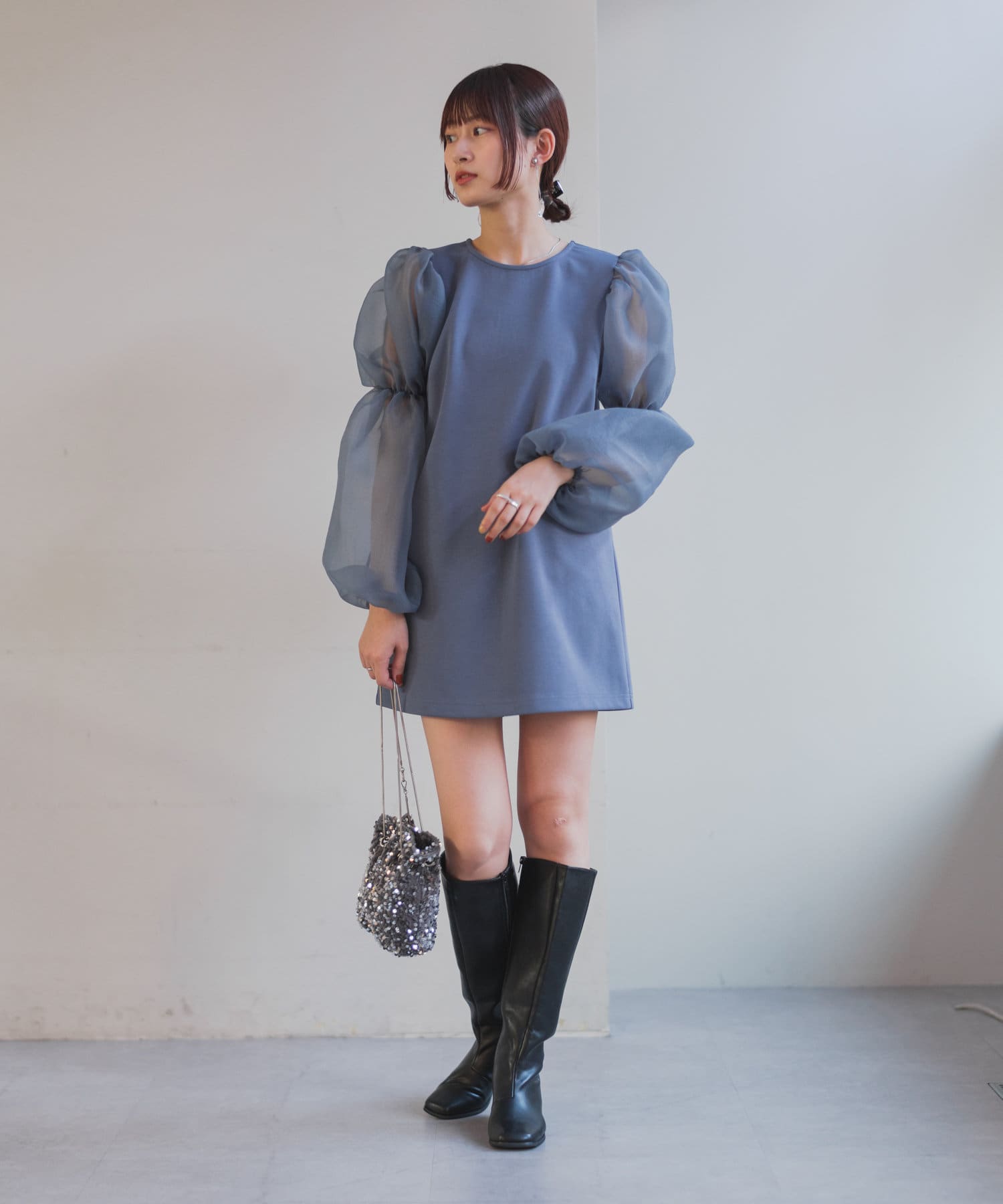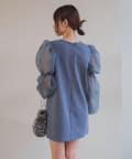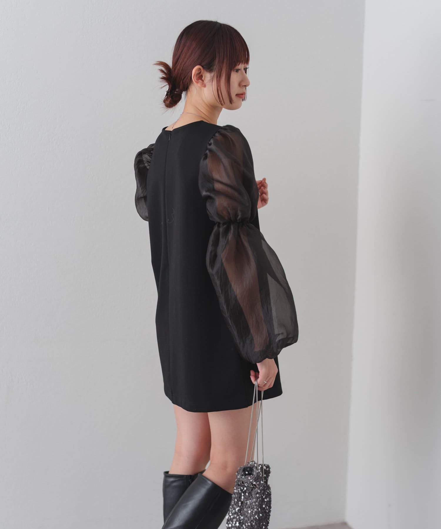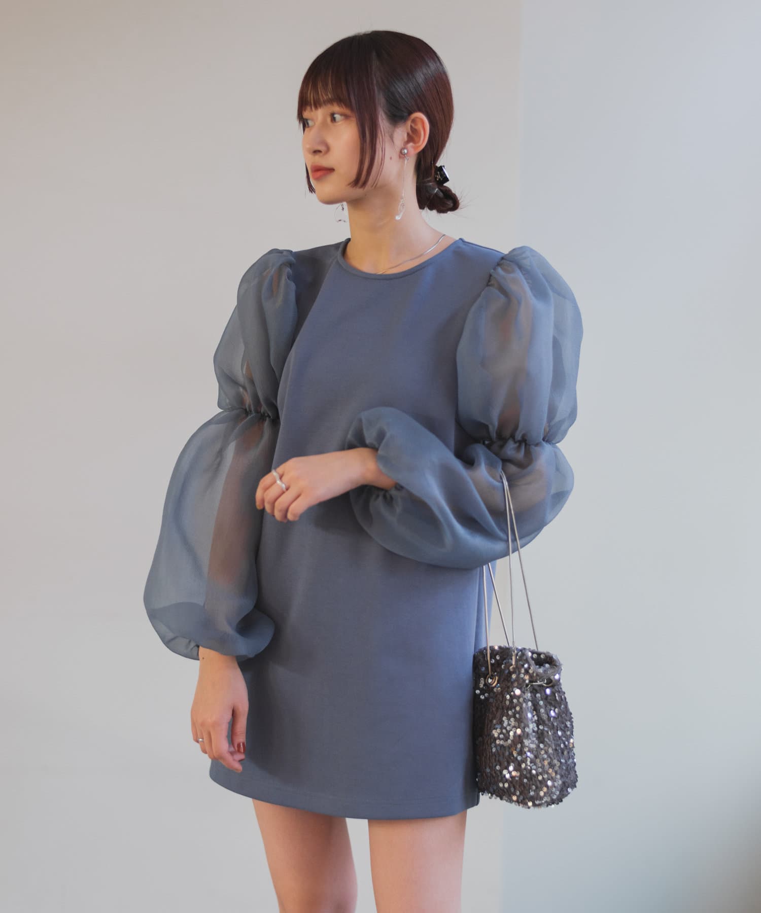 シアーボリューム袖が目を惹くミニワンピース