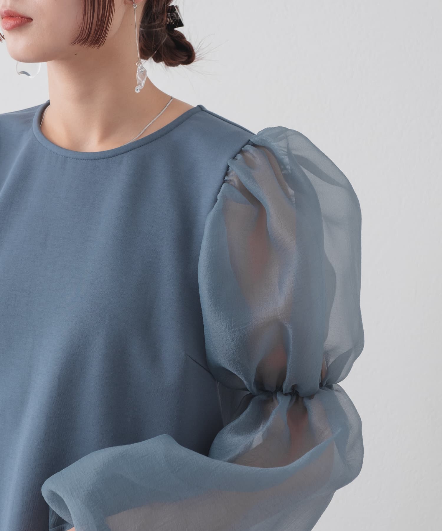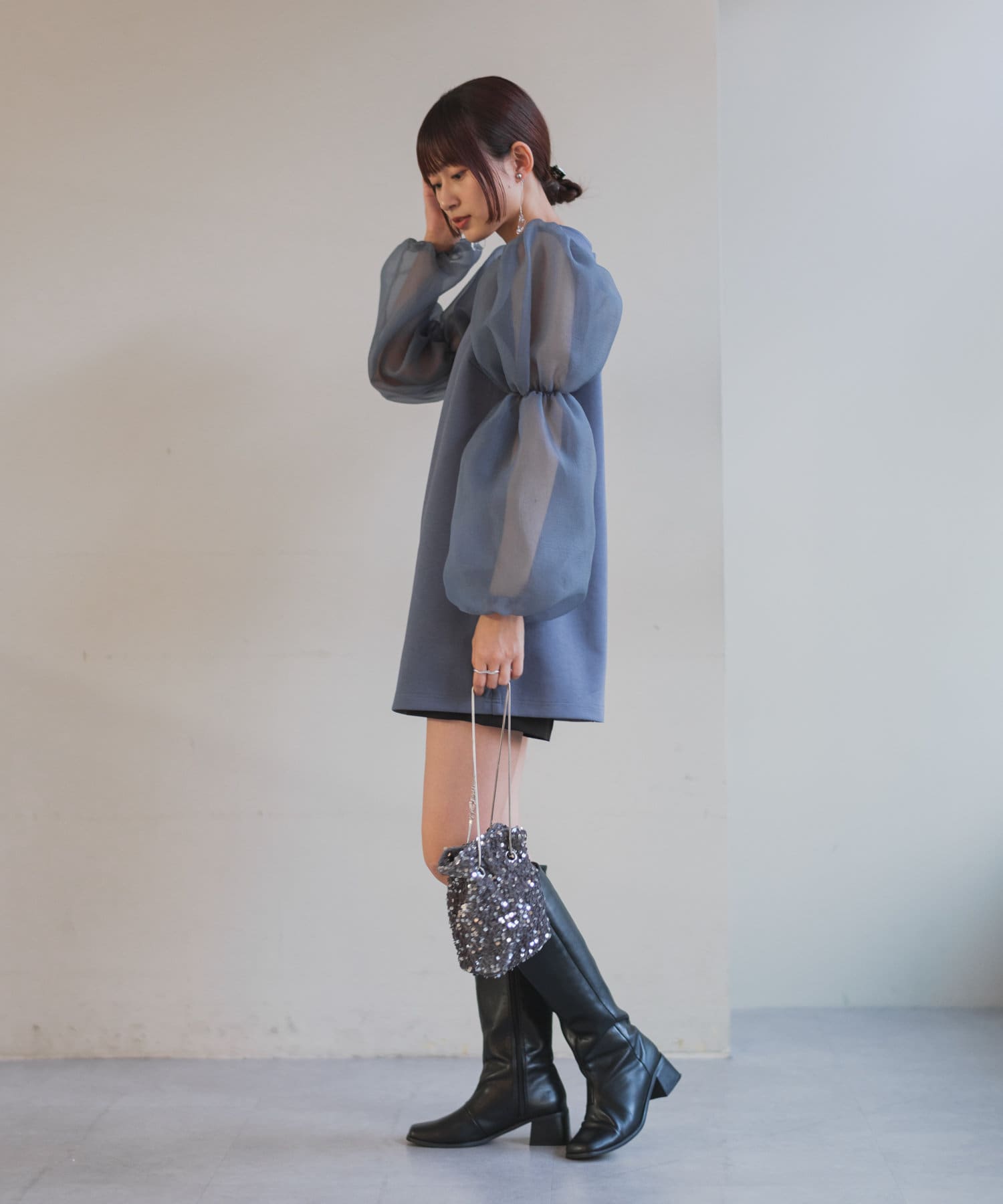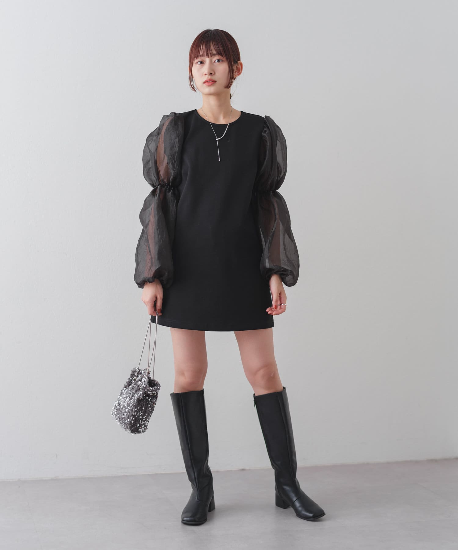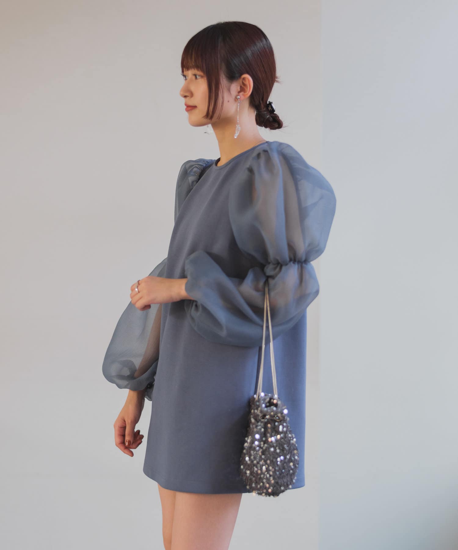 シアーボリューム袖が目を惹くミニワンピース