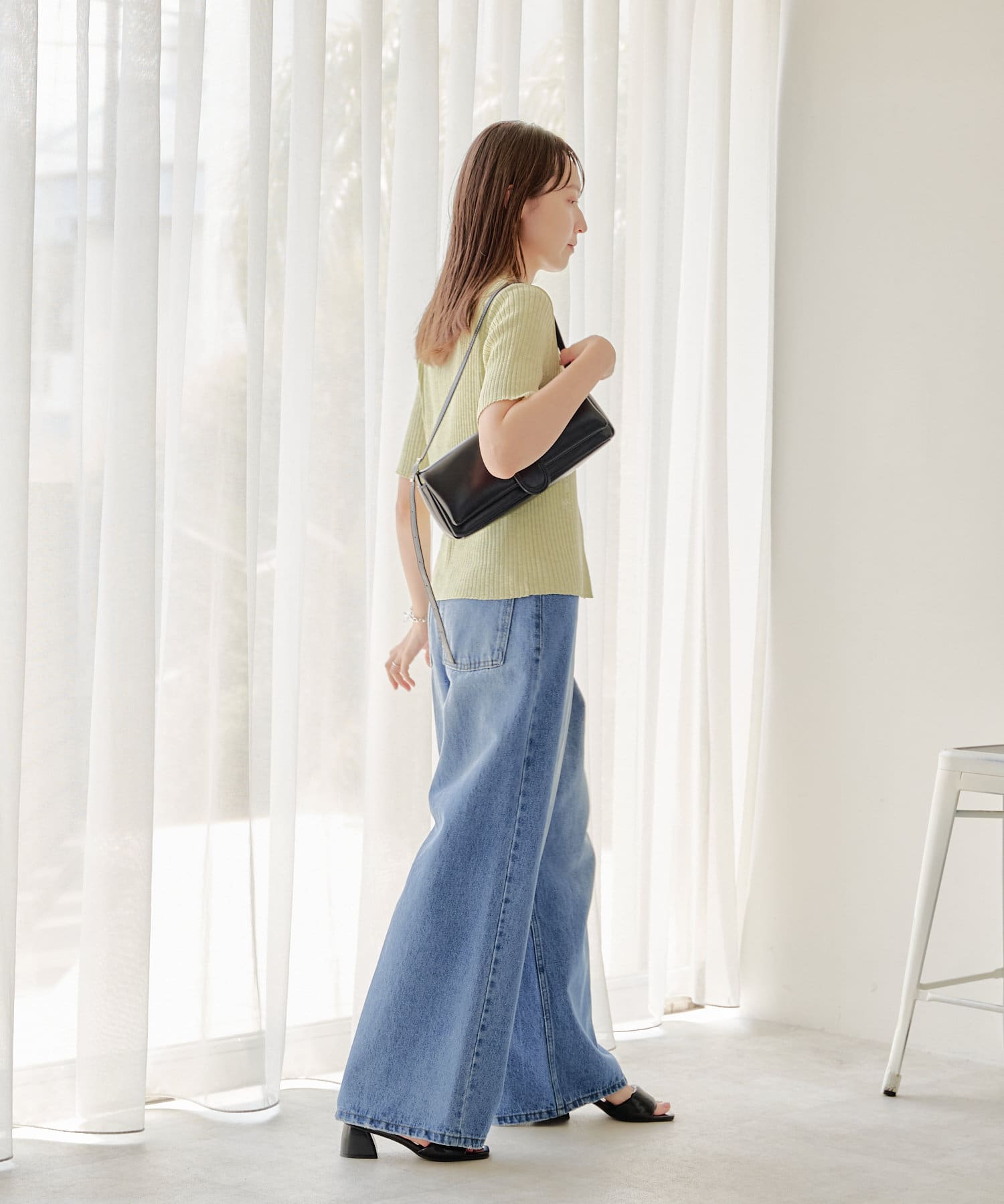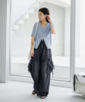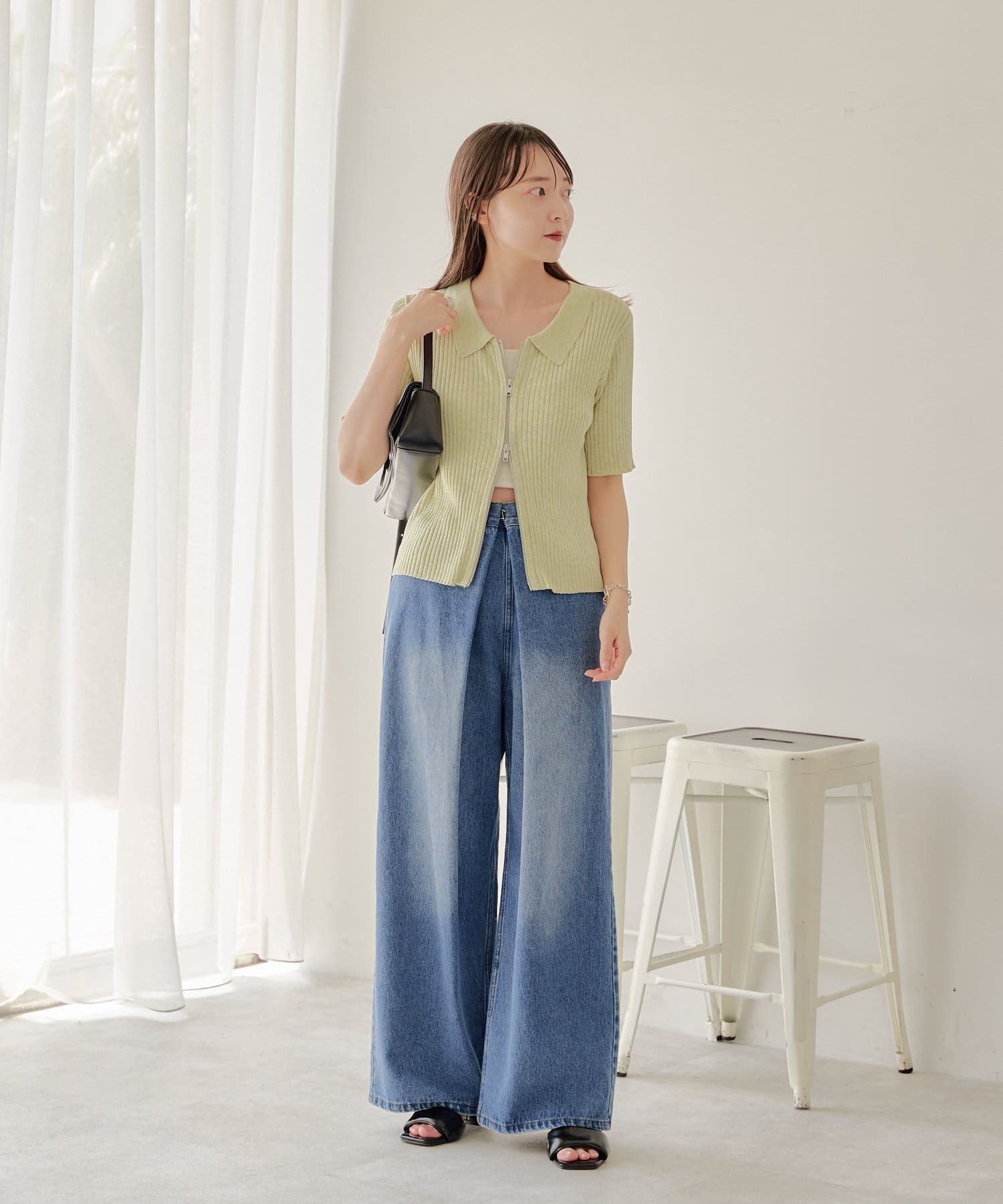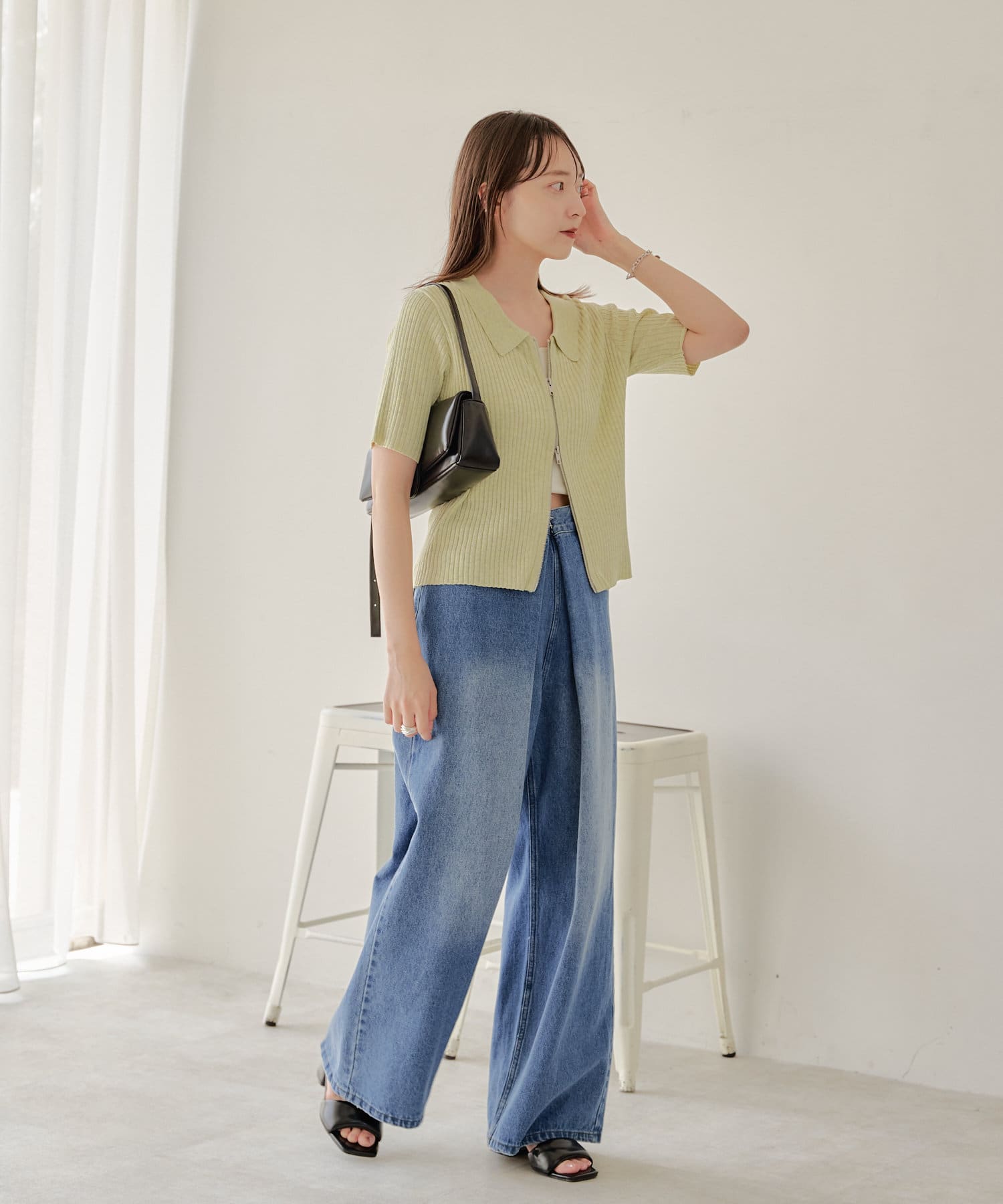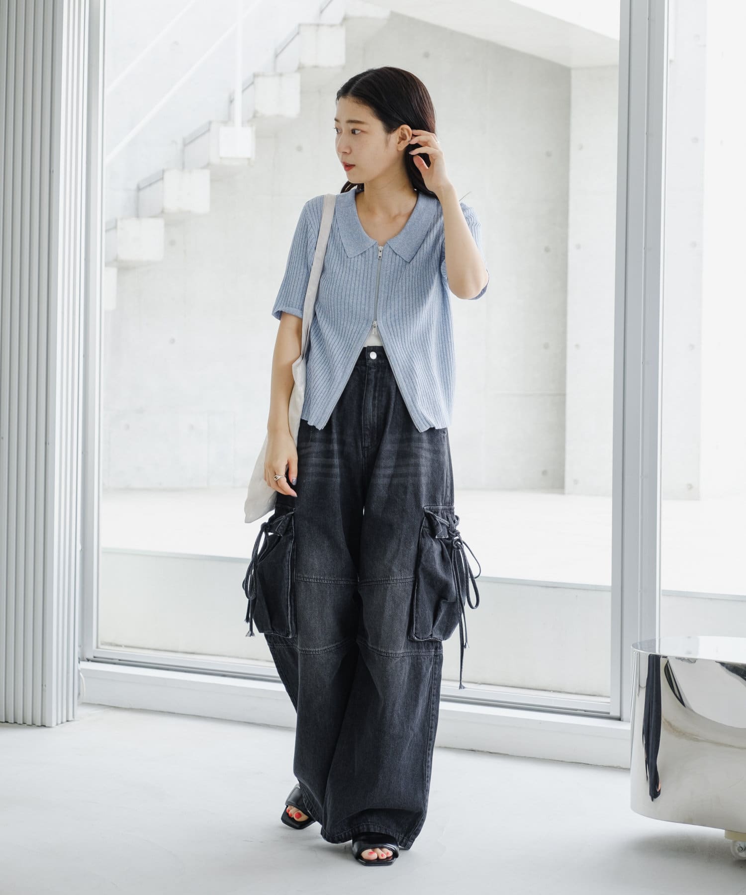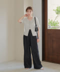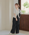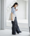 コンパクトなアイテムなのでデニムやスラックスなどワイドなシルエットとのボトム合わせがオススメ。