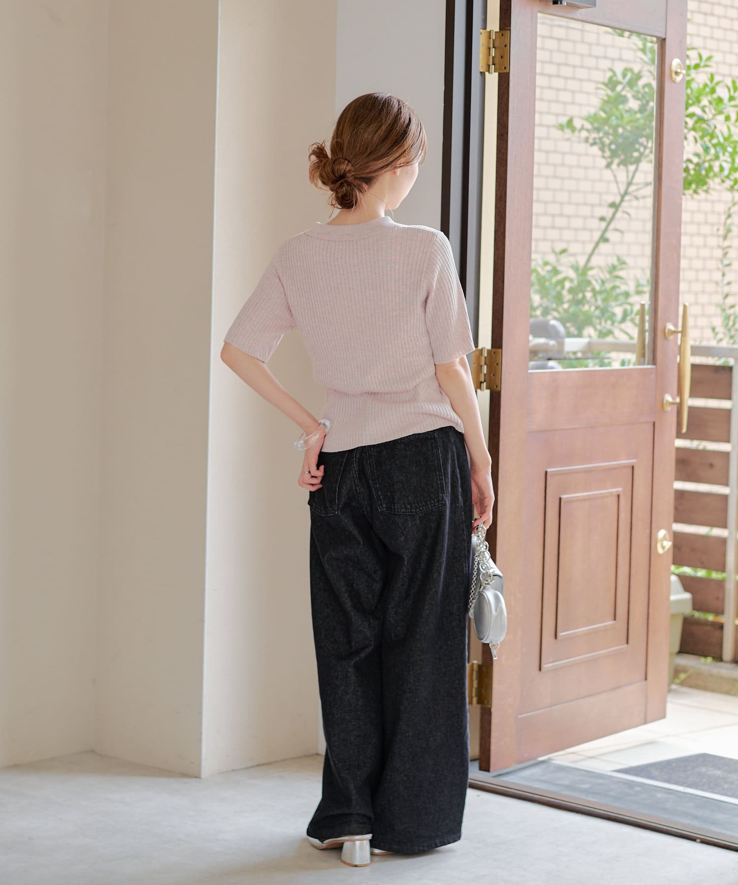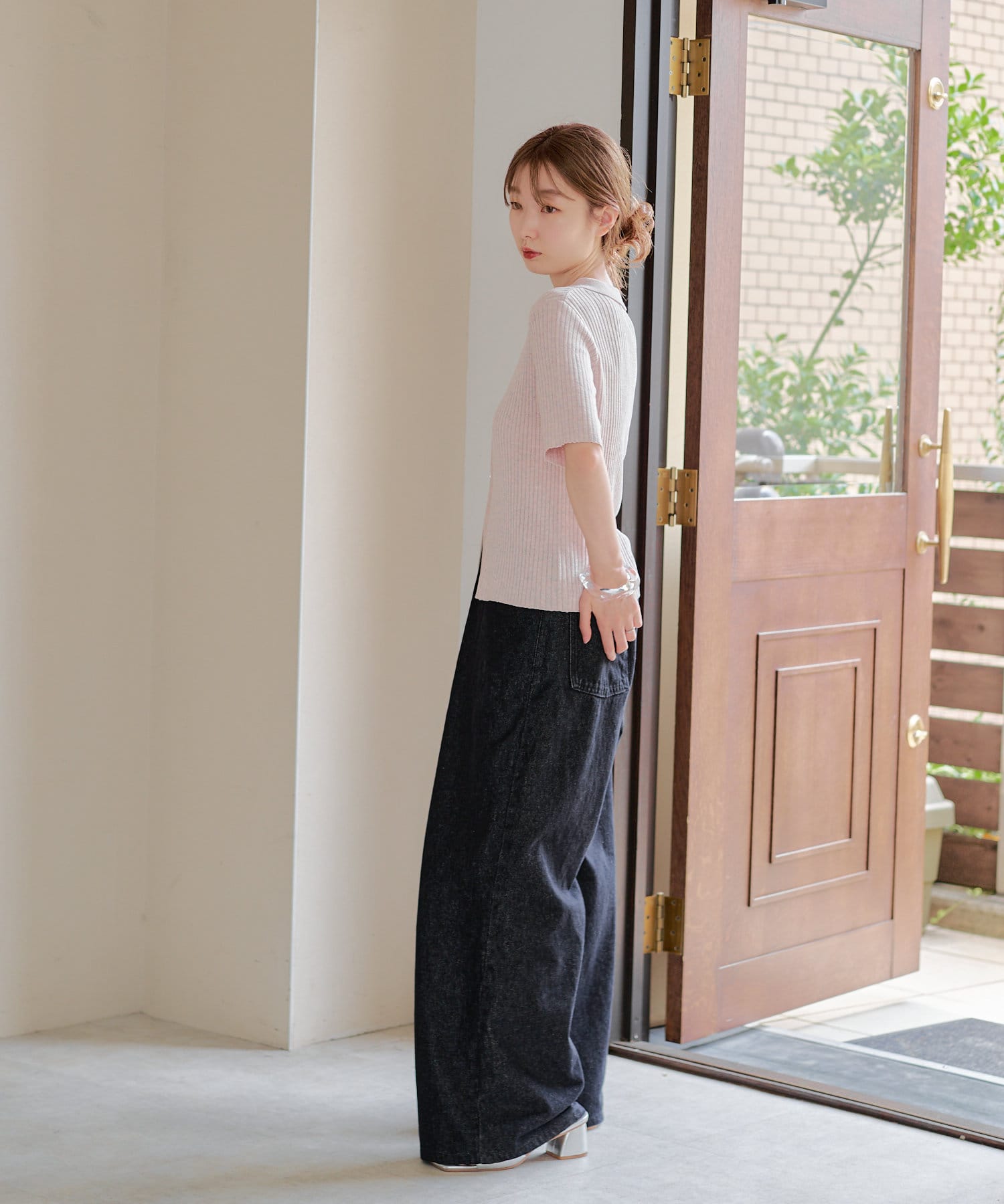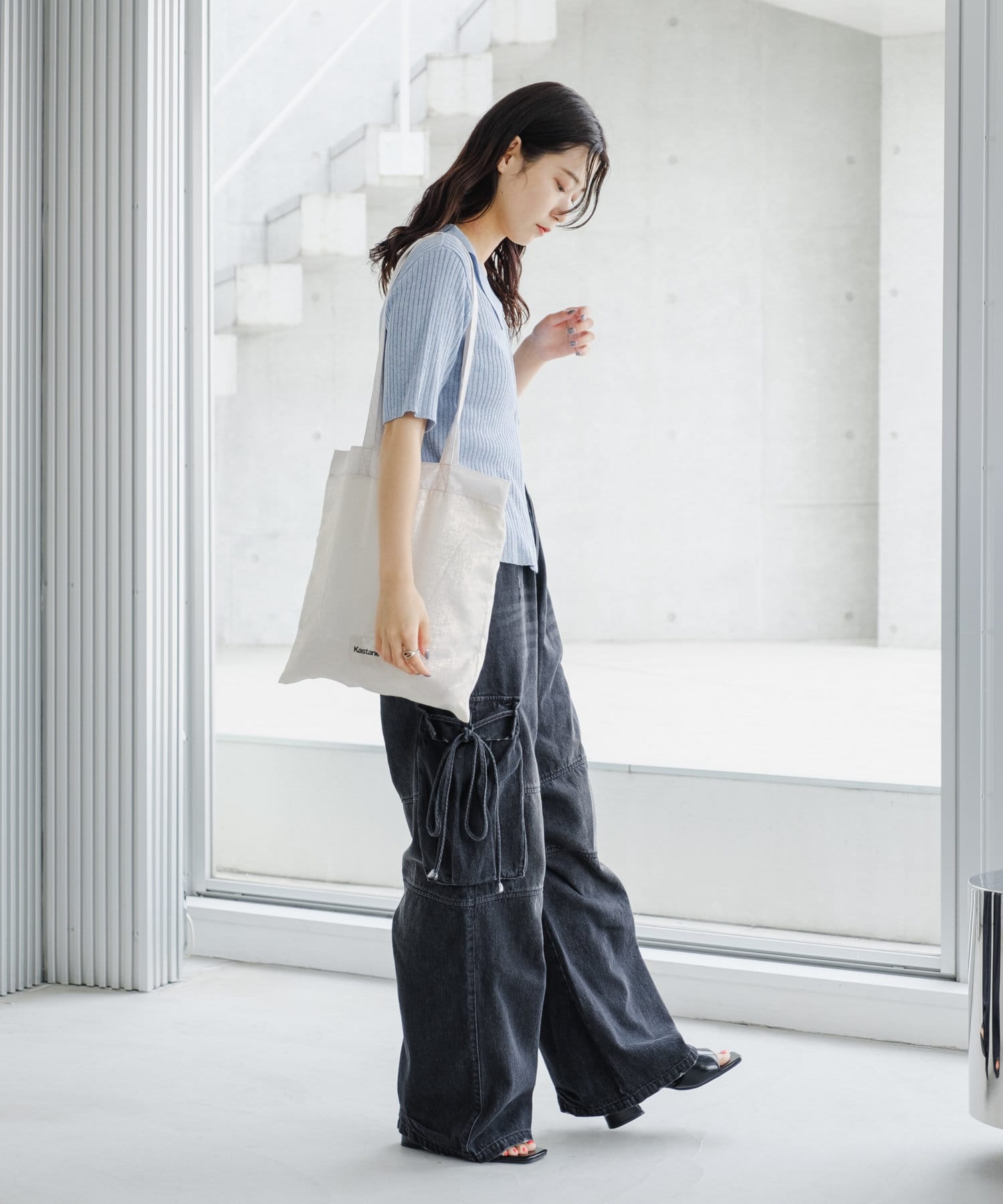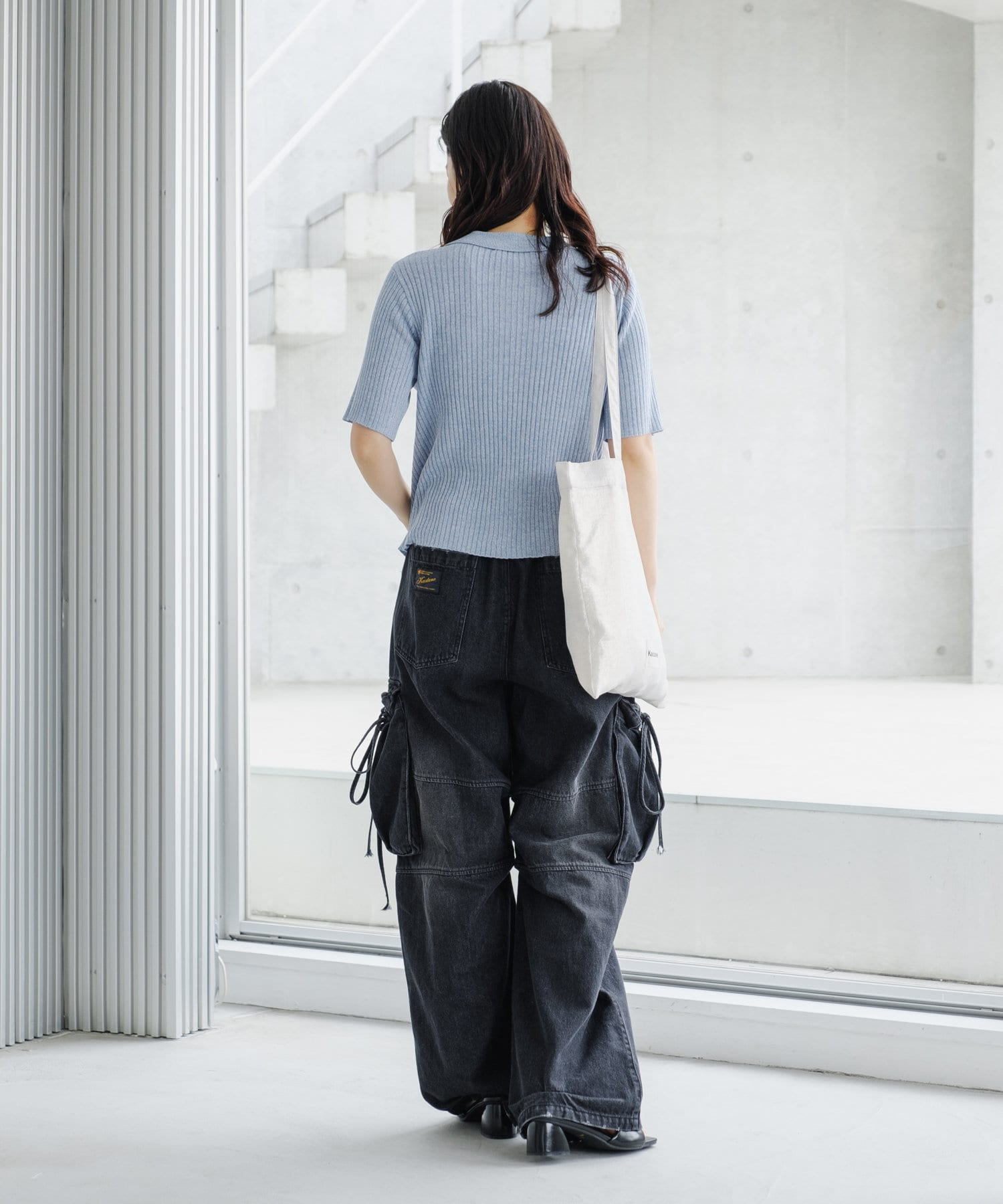 コンパクトなアイテムなのでデニムやスラックスなどワイドなシルエットとのボトム合わせがオススメ。
