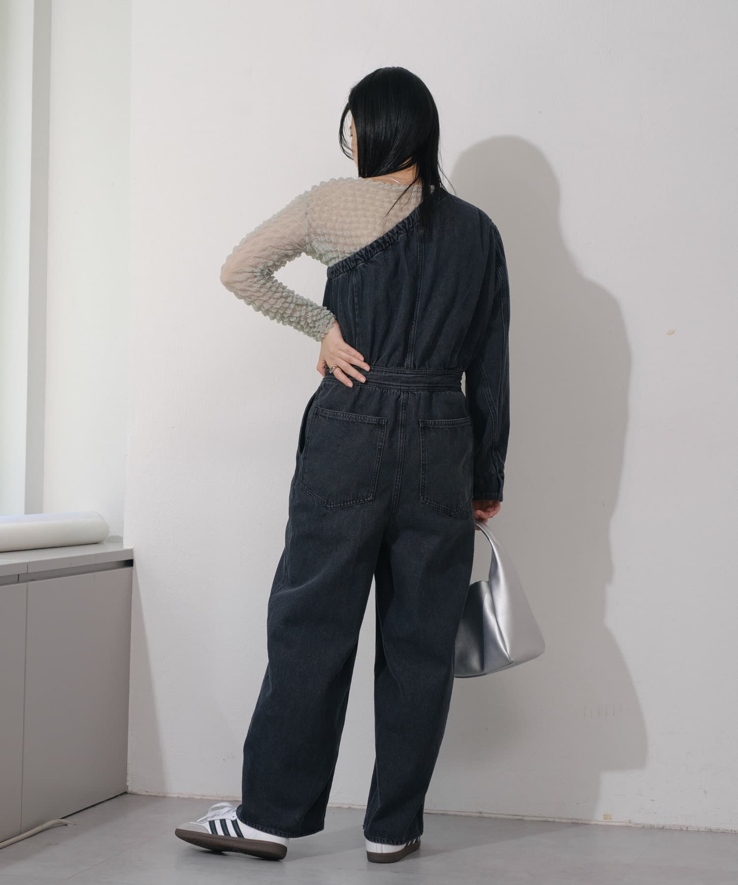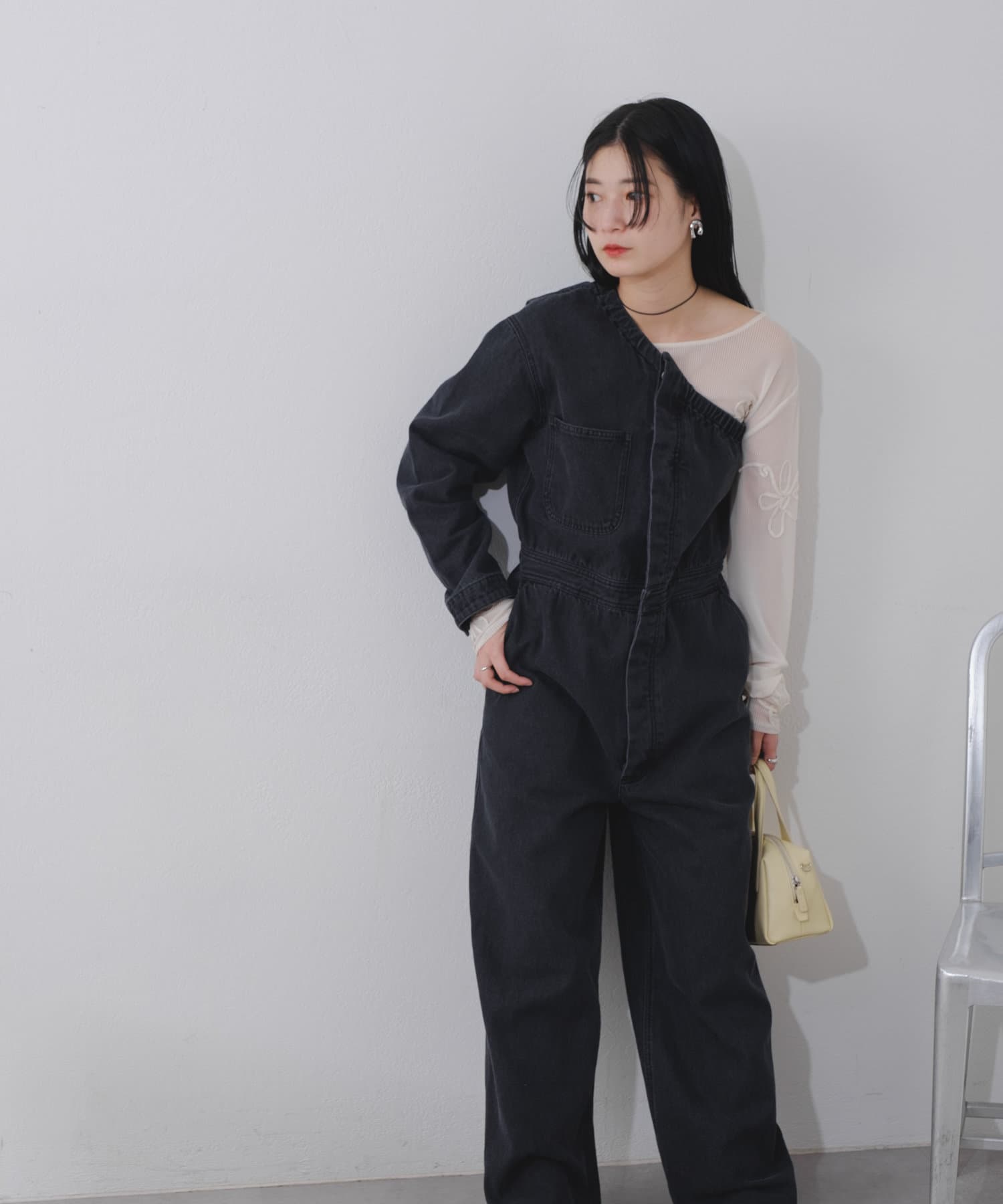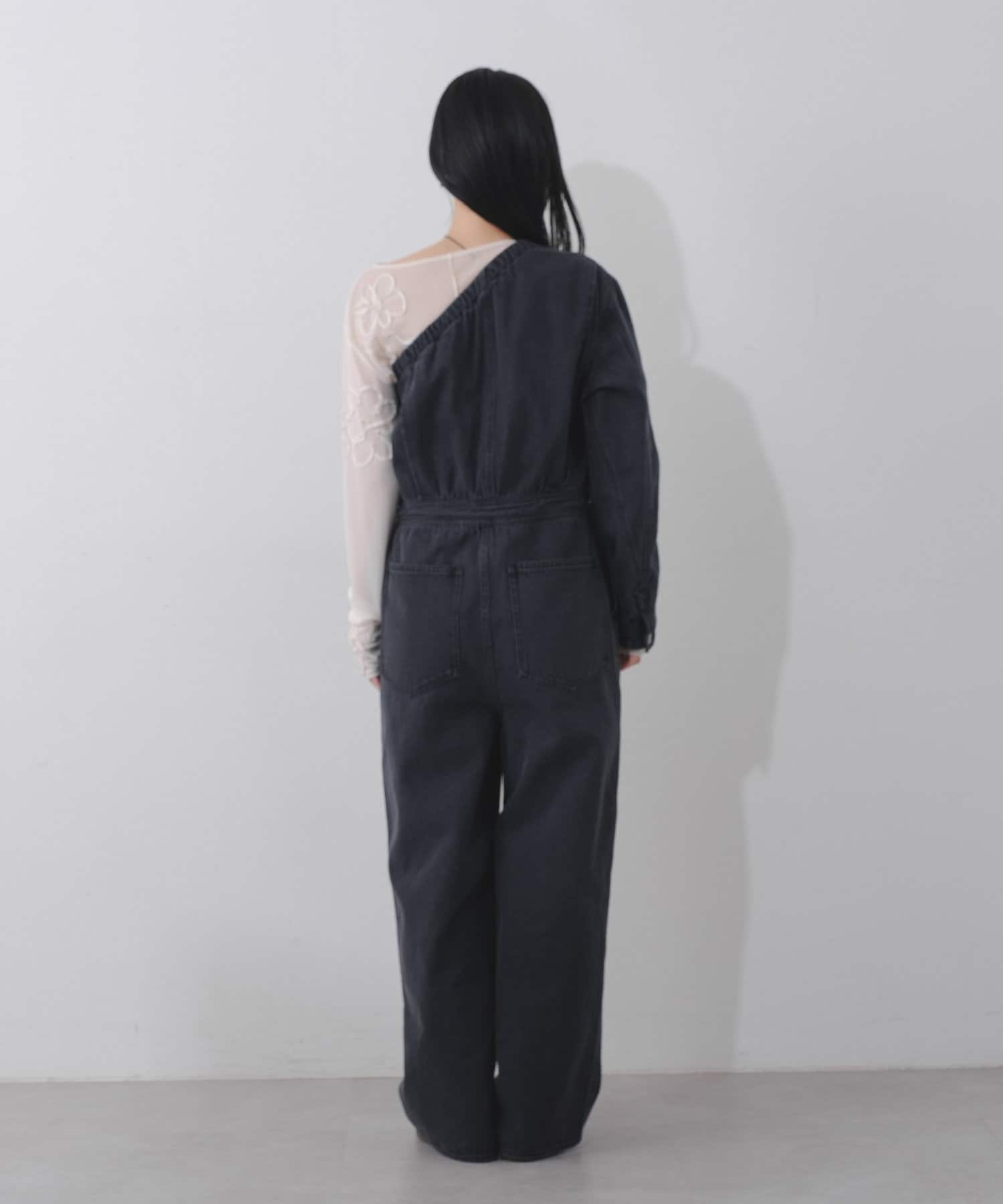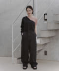 ワンショルデザインが他と差のつくジャンプスーツ。