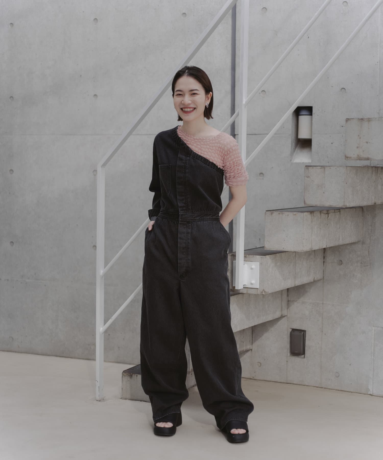 カップ付きキャミを合わせることでヘルシーな肌見せのスタイリングもお楽しみいただけます。
