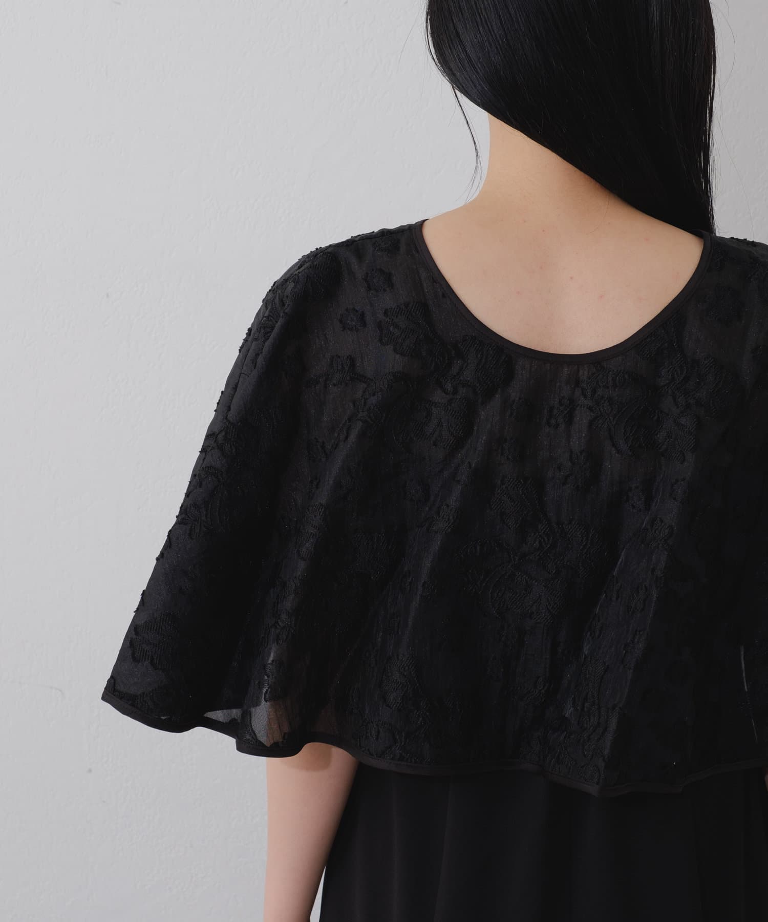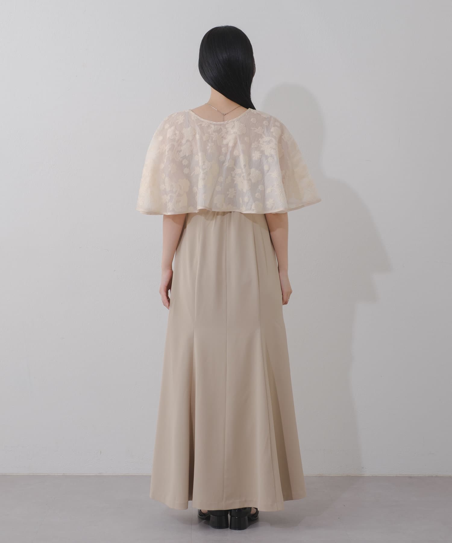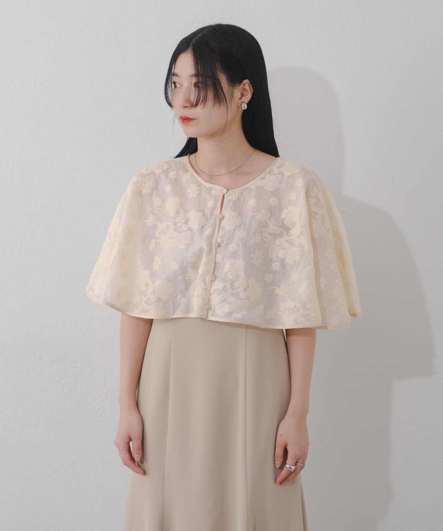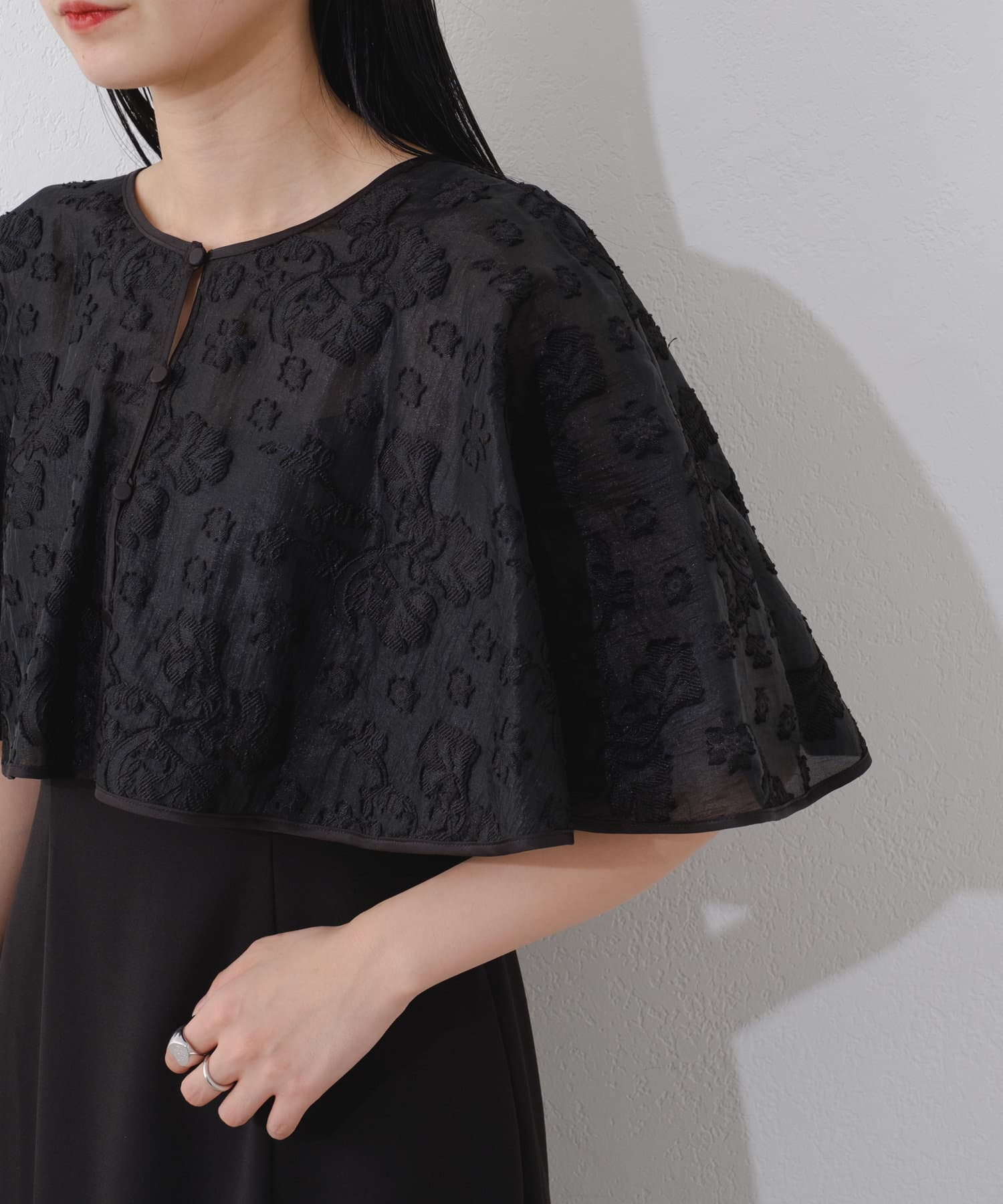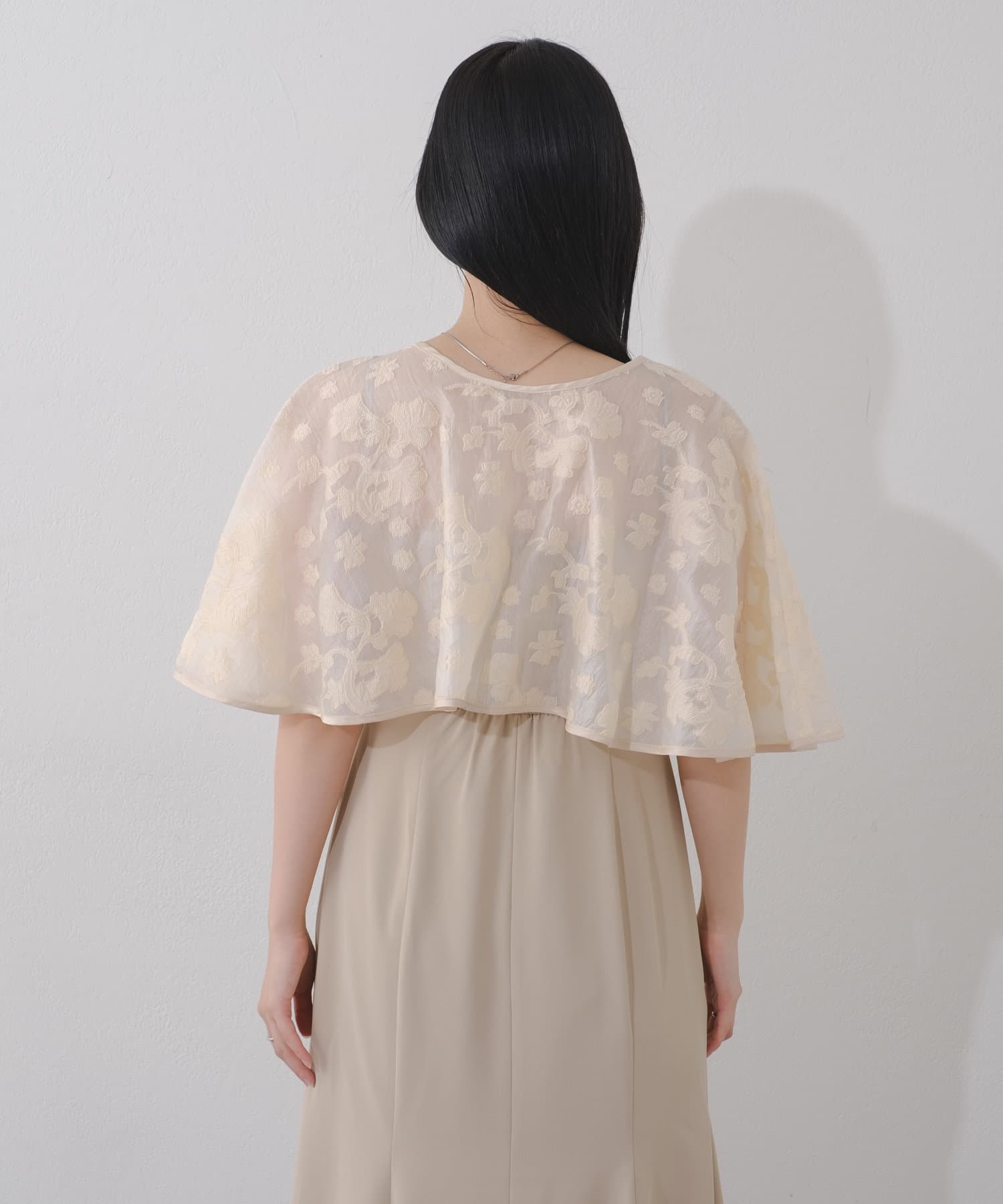 ケープは上品な透け感で羽織るだけで目を惹きます。