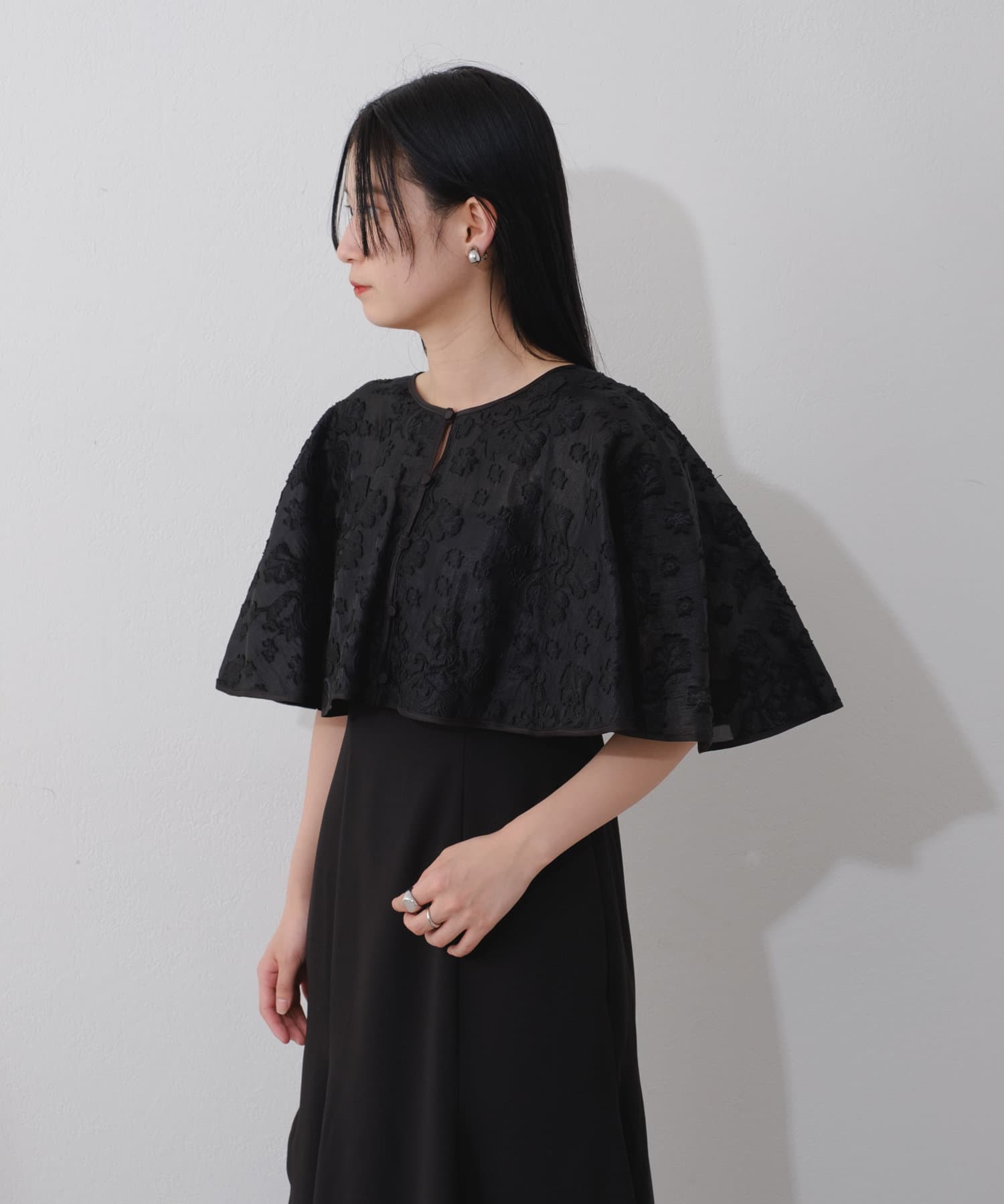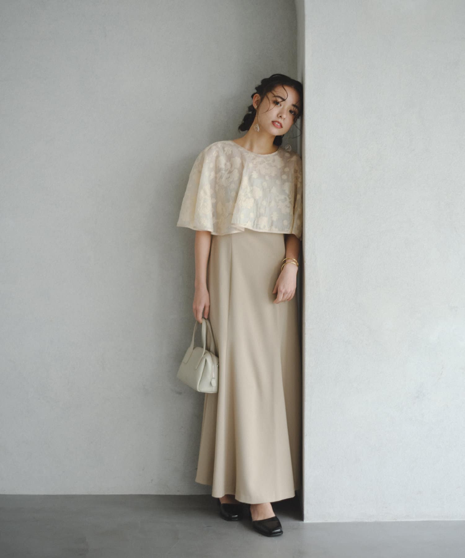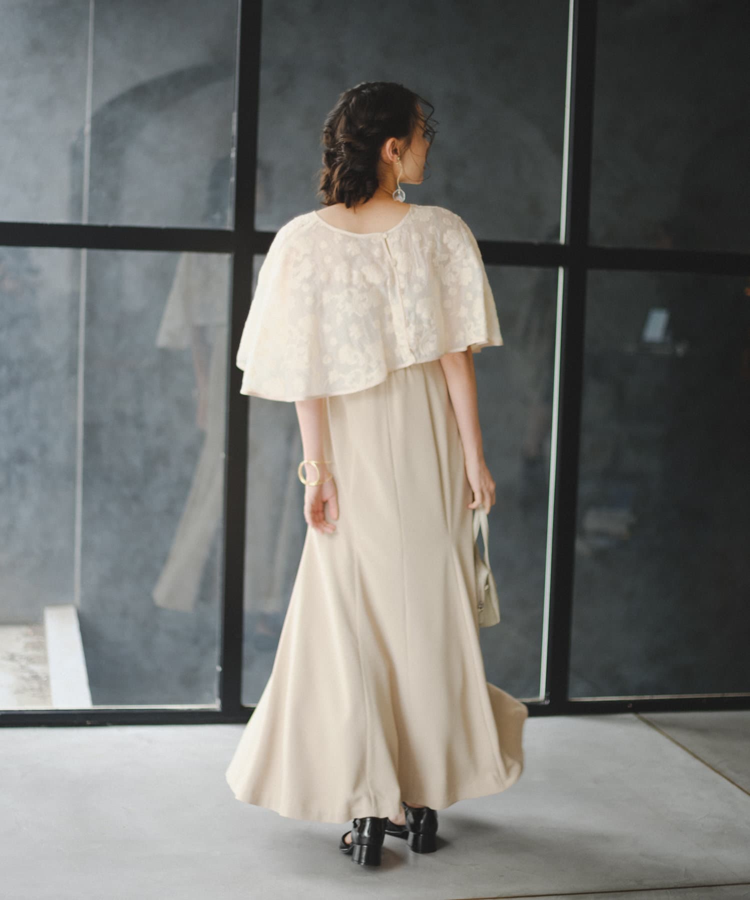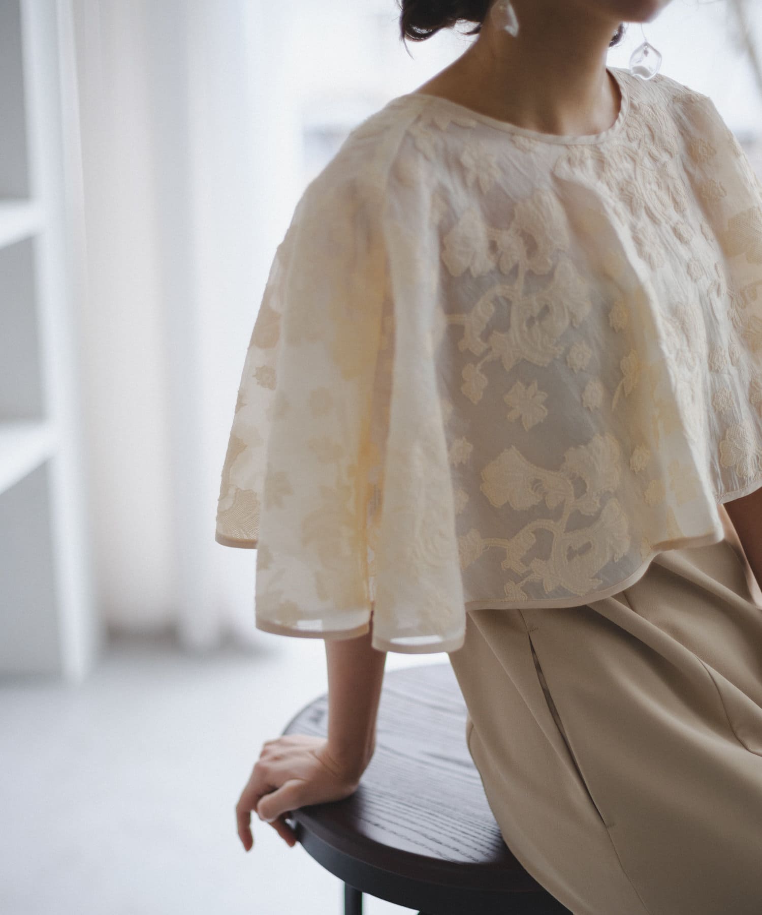 ケープは上品な透け感で羽織るだけで目を惹きます。