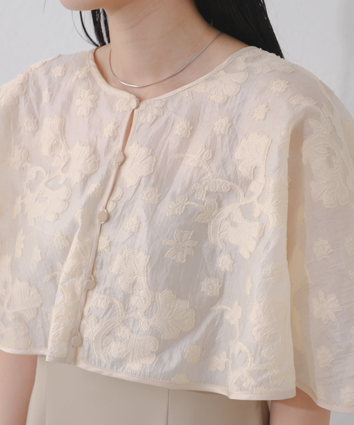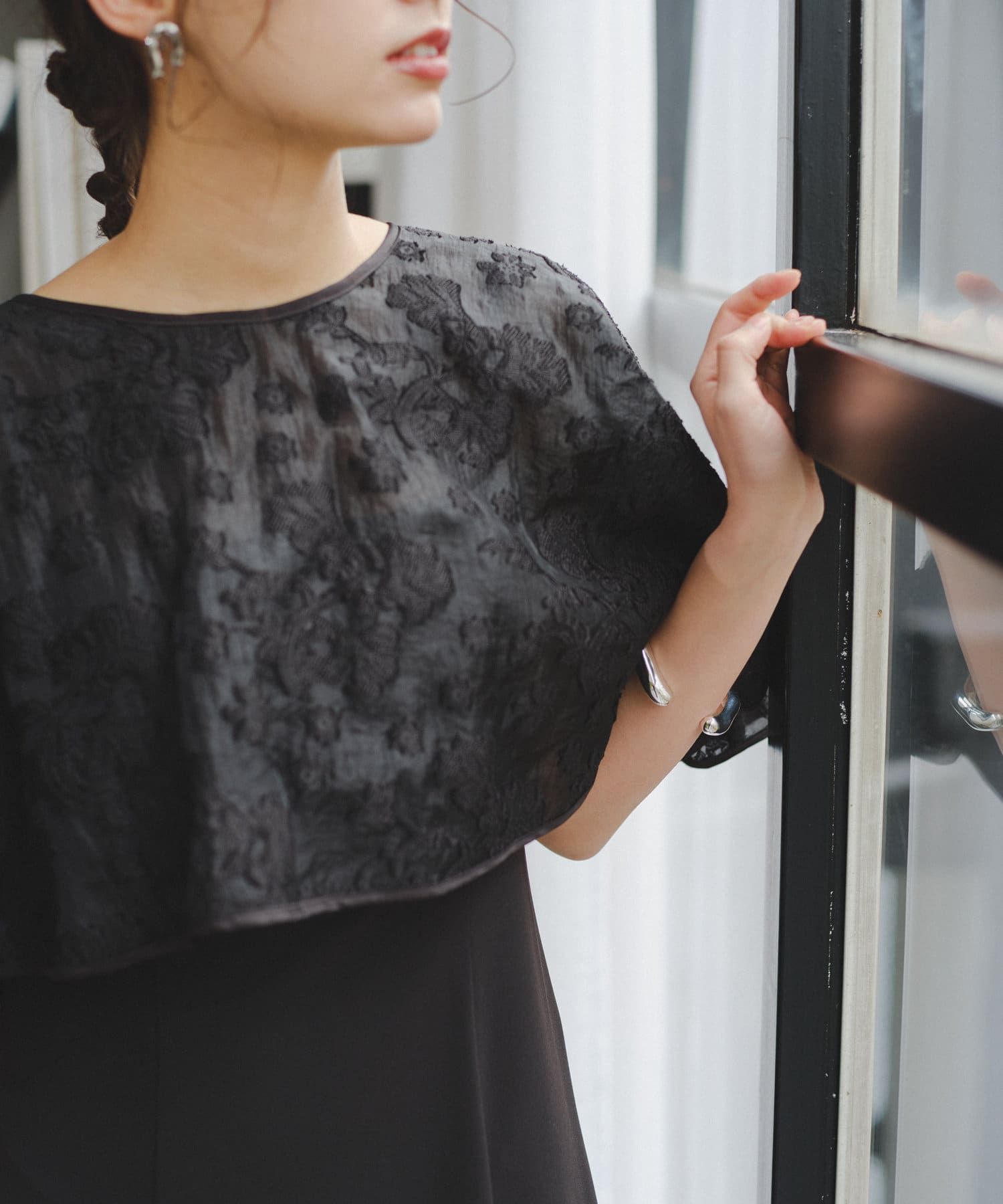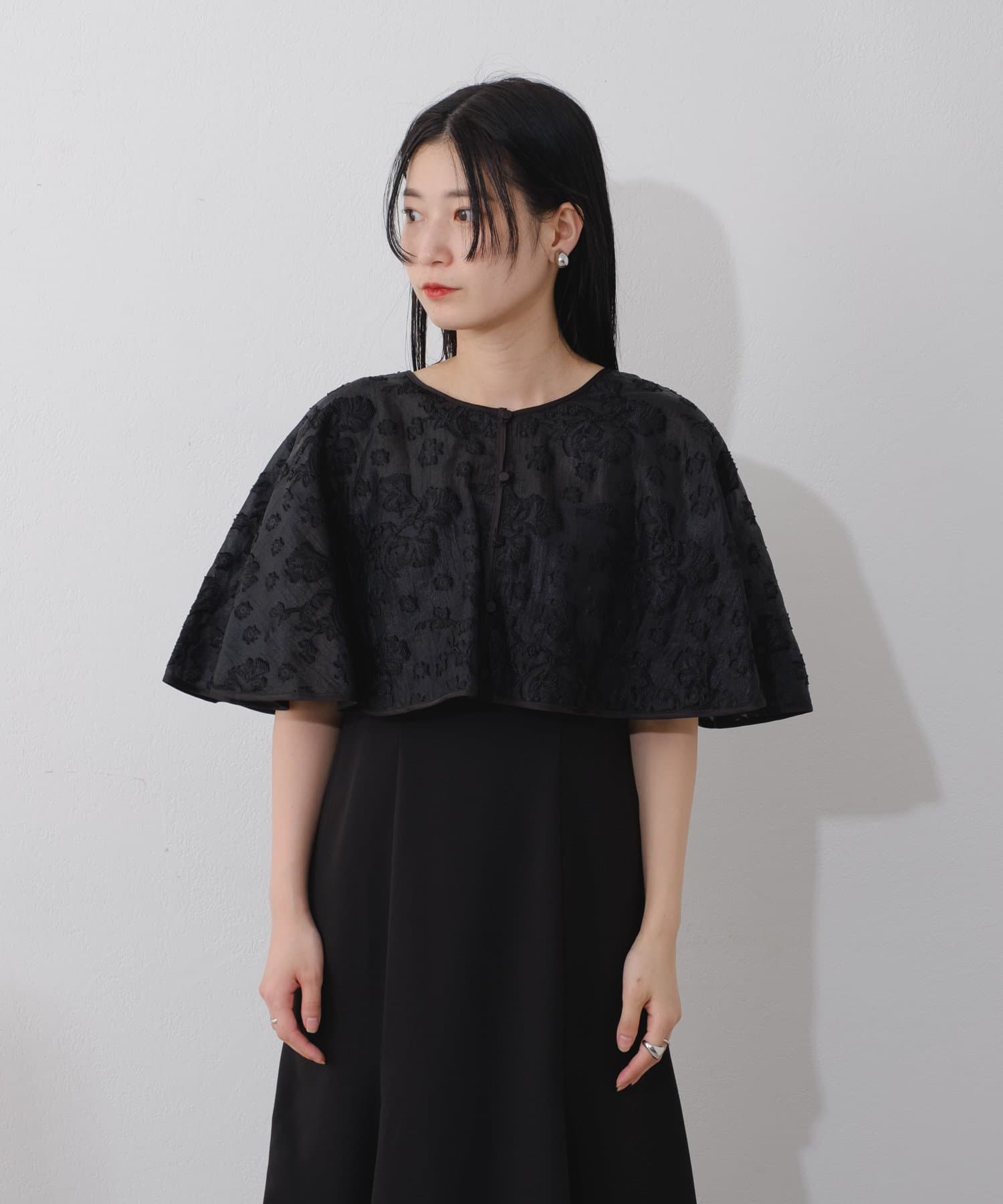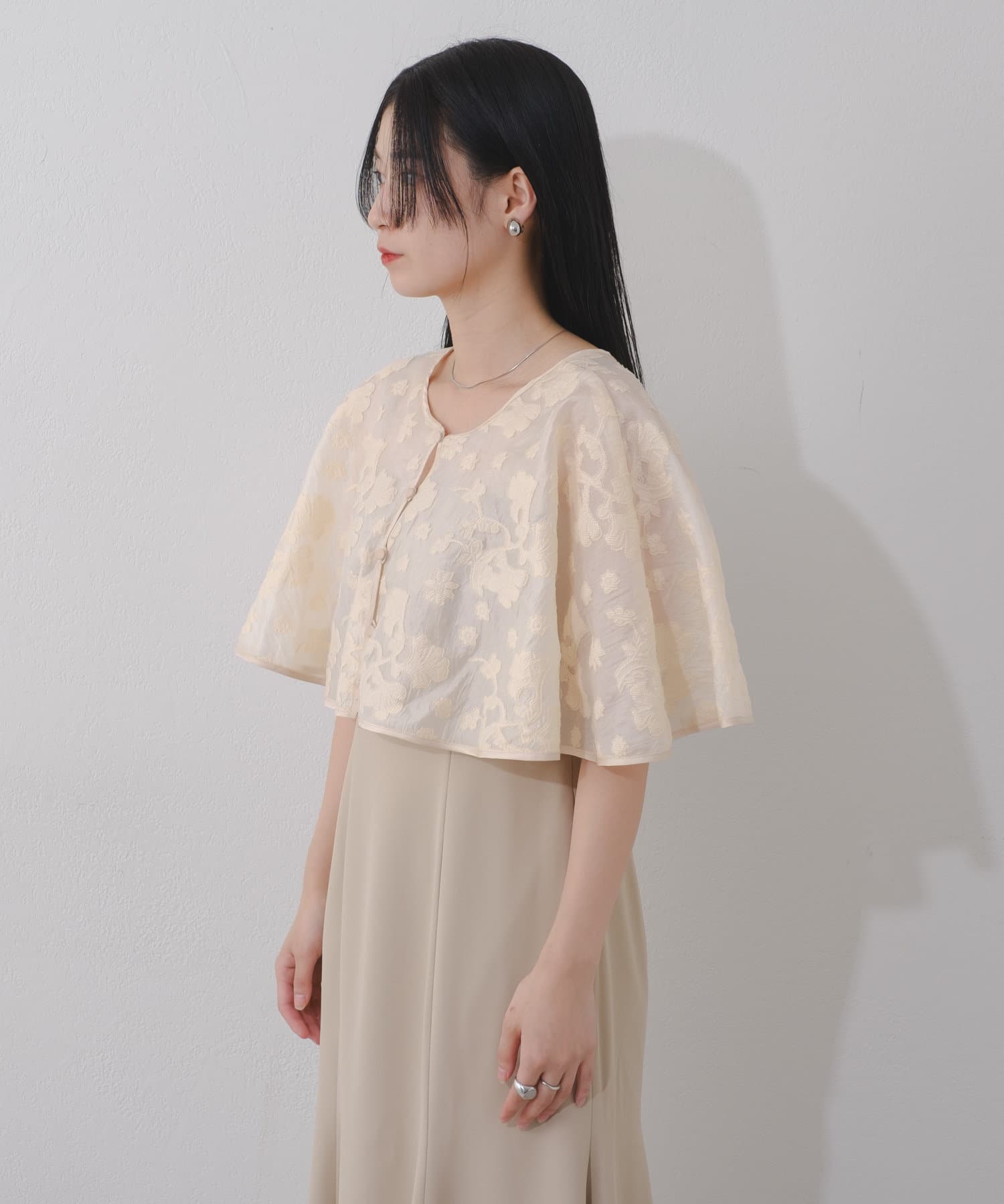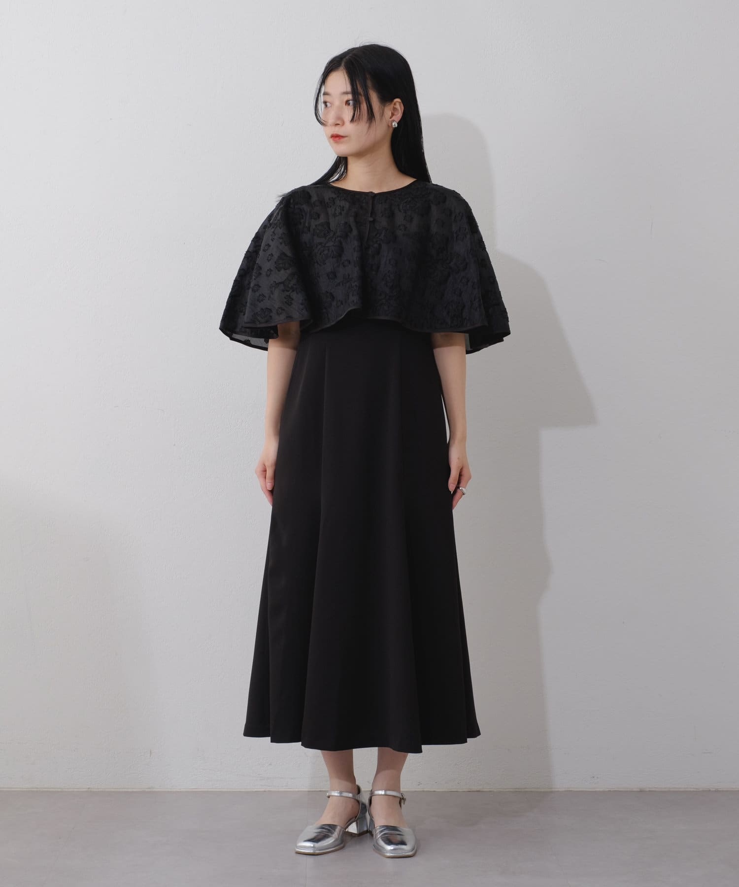 ケープは上品な透け感で羽織るだけで目を惹きます。