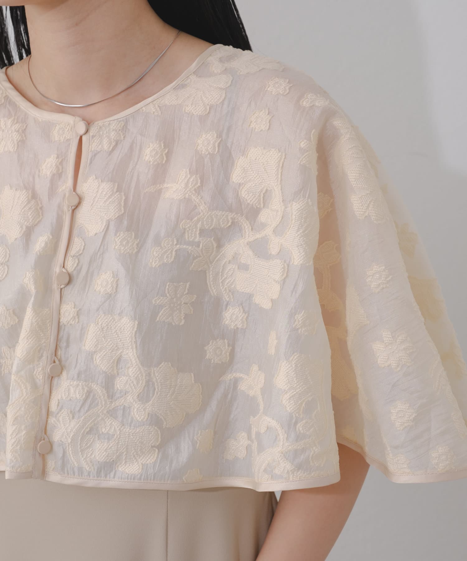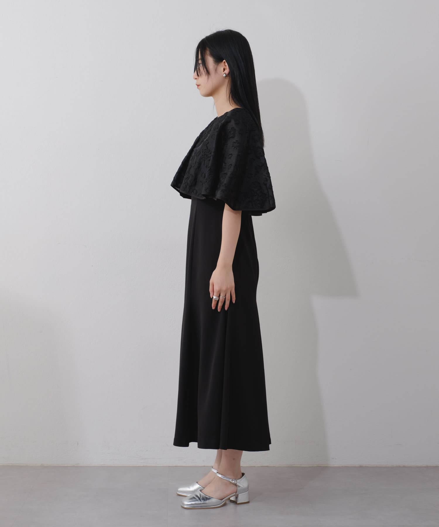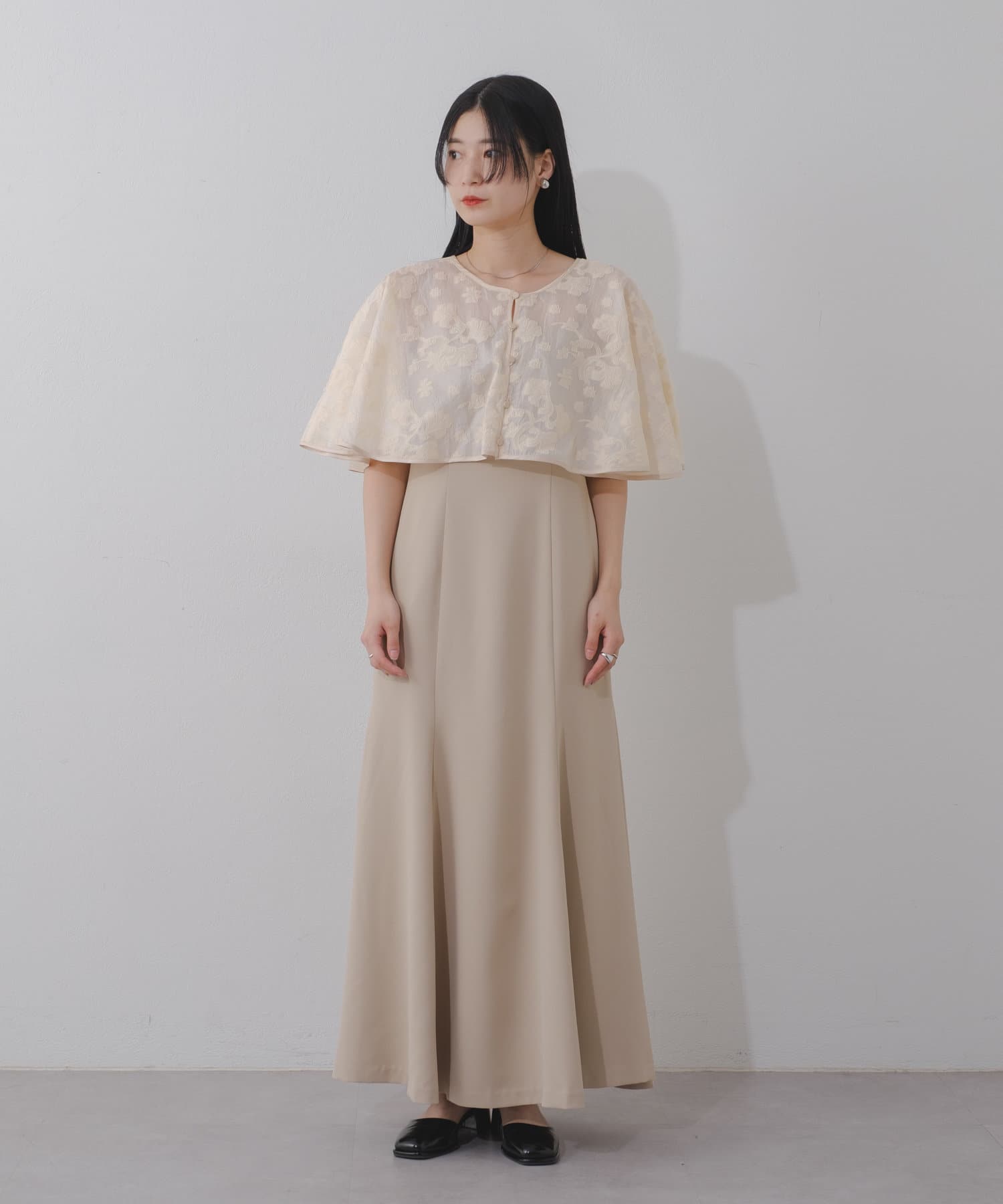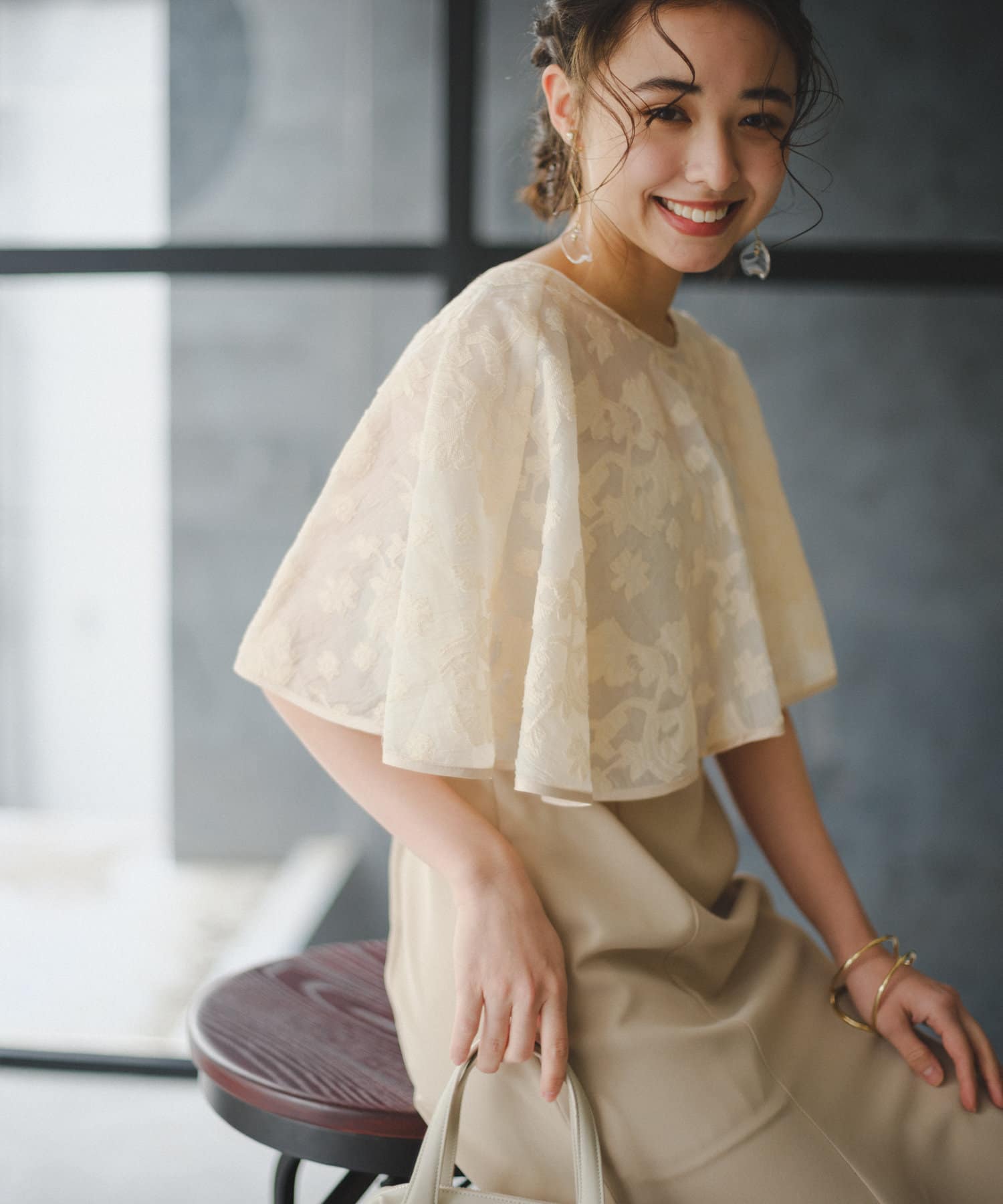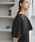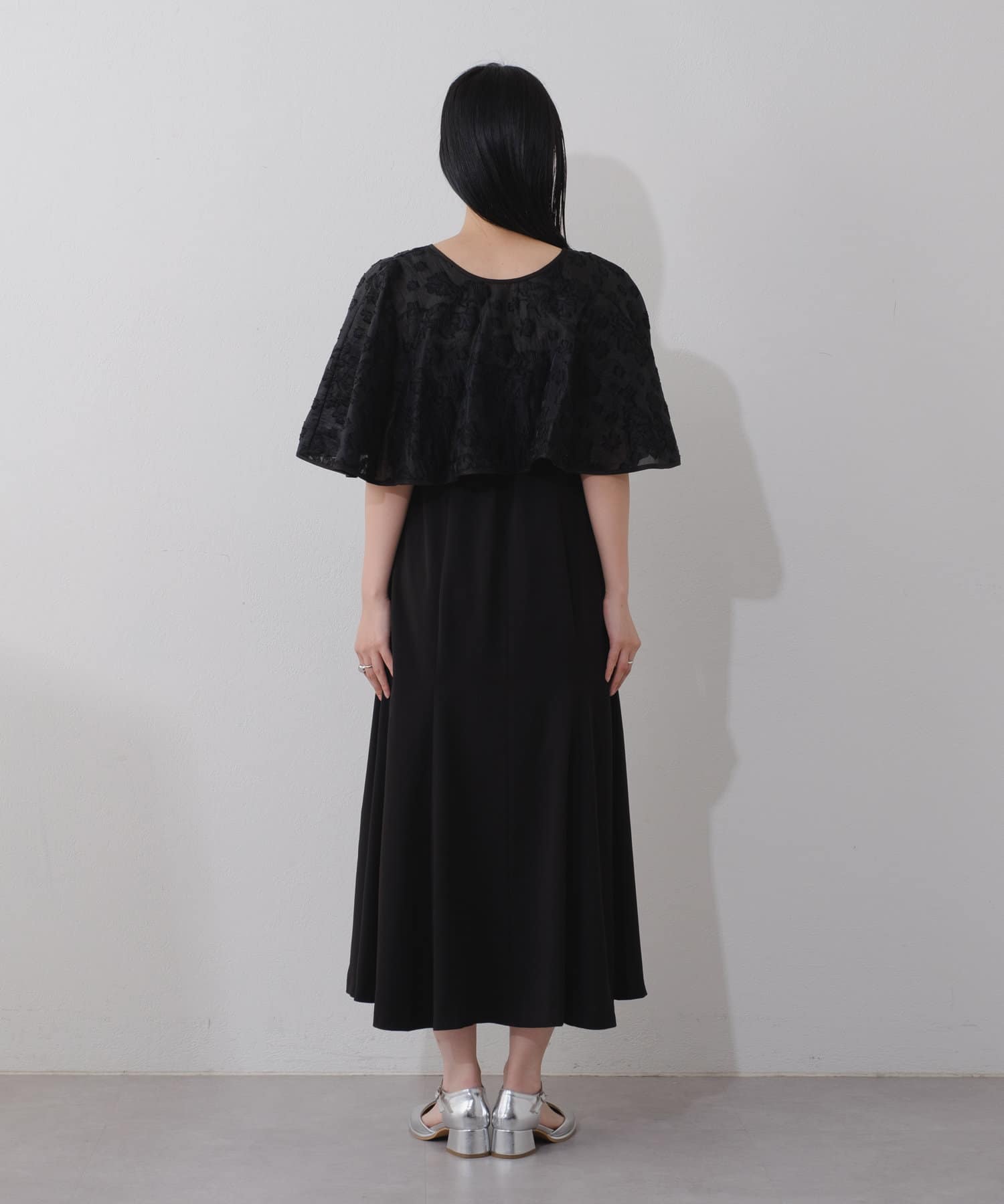 ケープは上品な透け感で羽織るだけで目を惹きます。