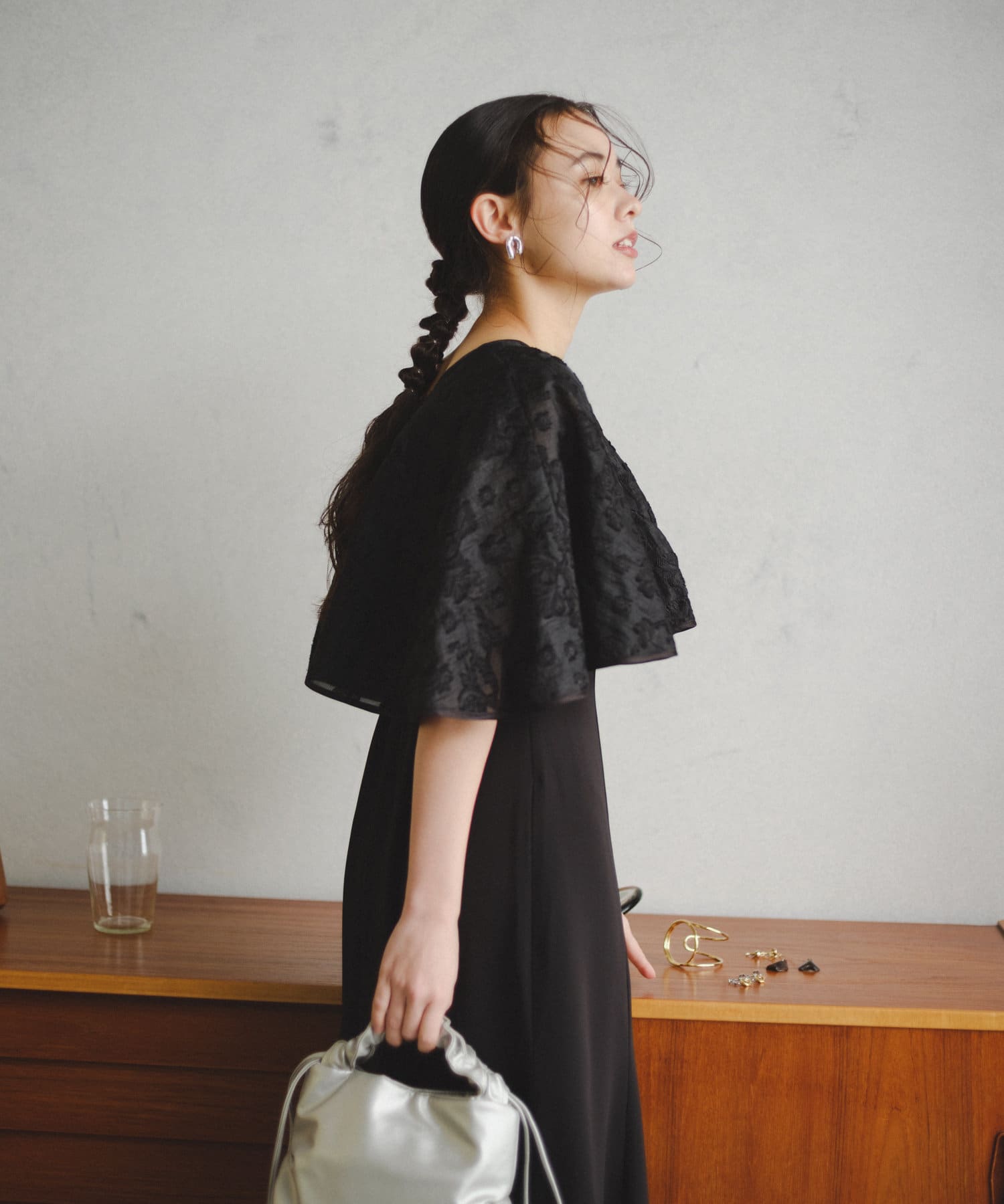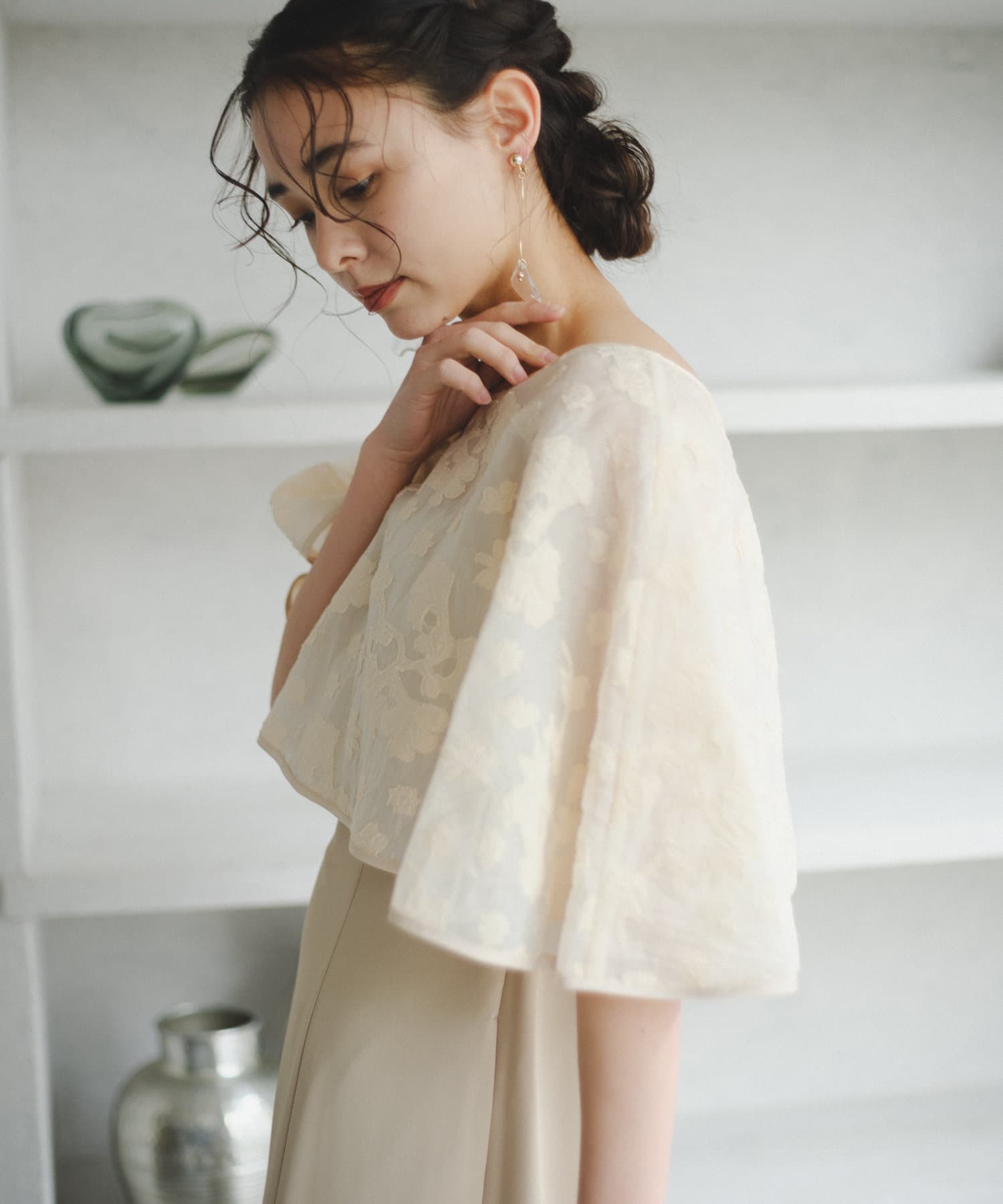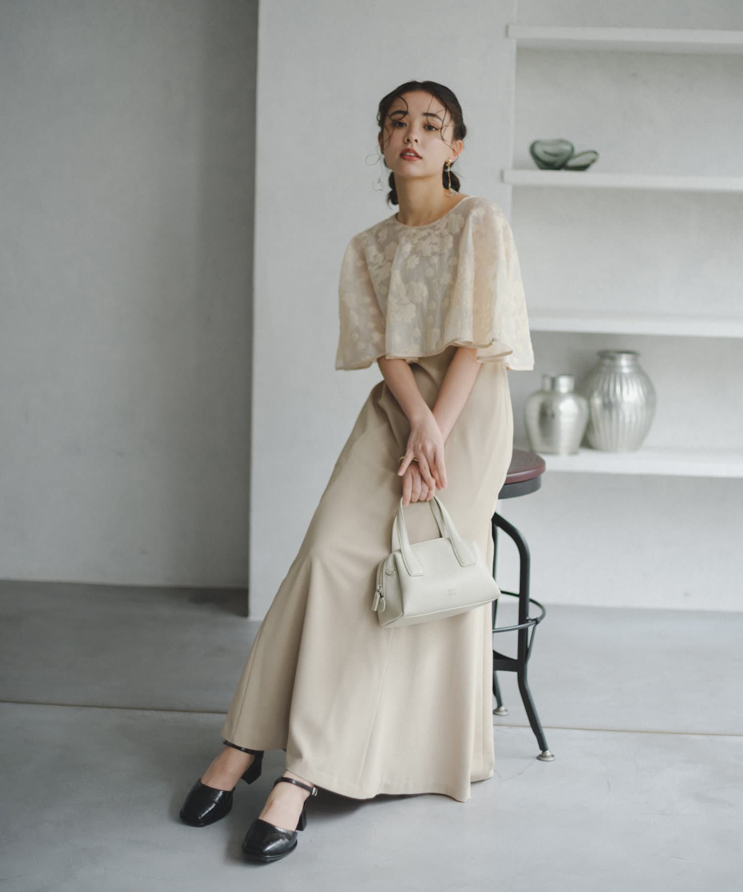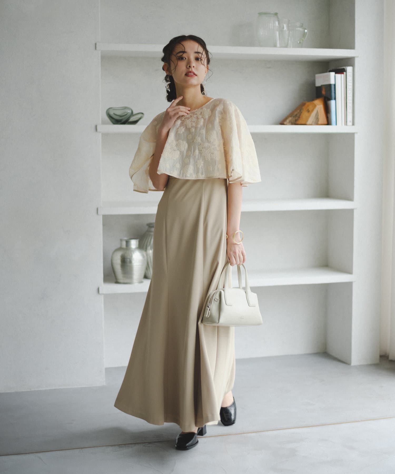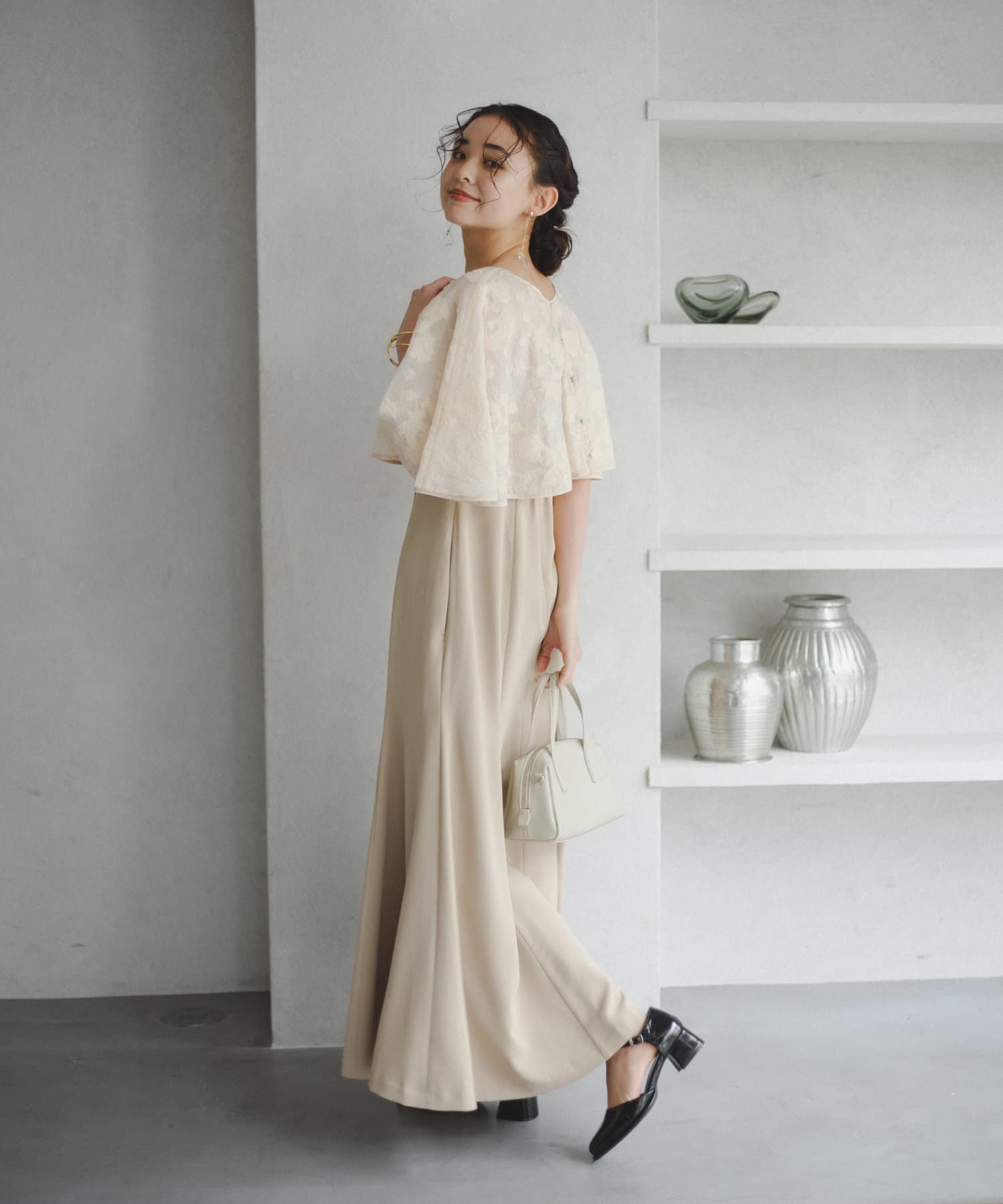 ケープは上品な透け感で羽織るだけで目を惹きます。