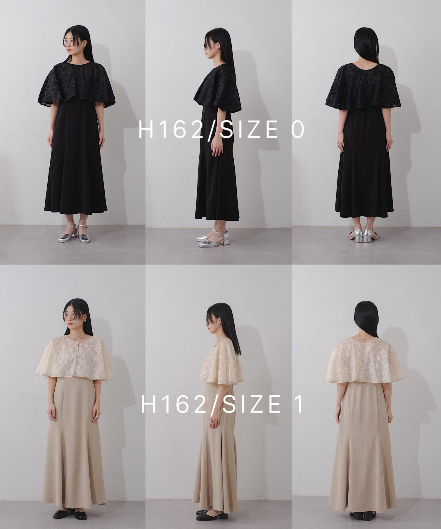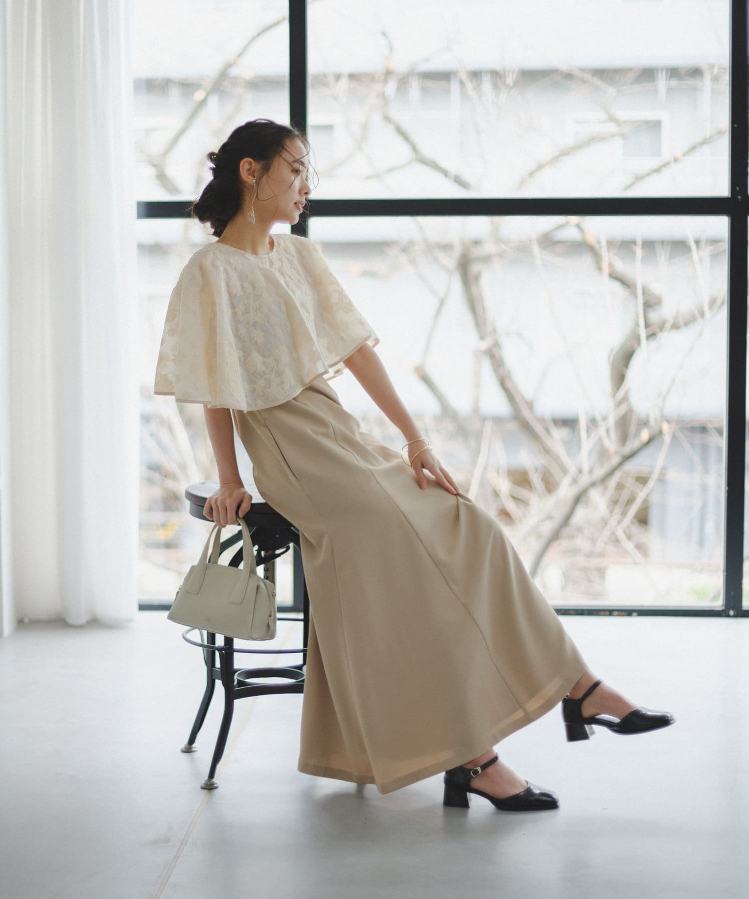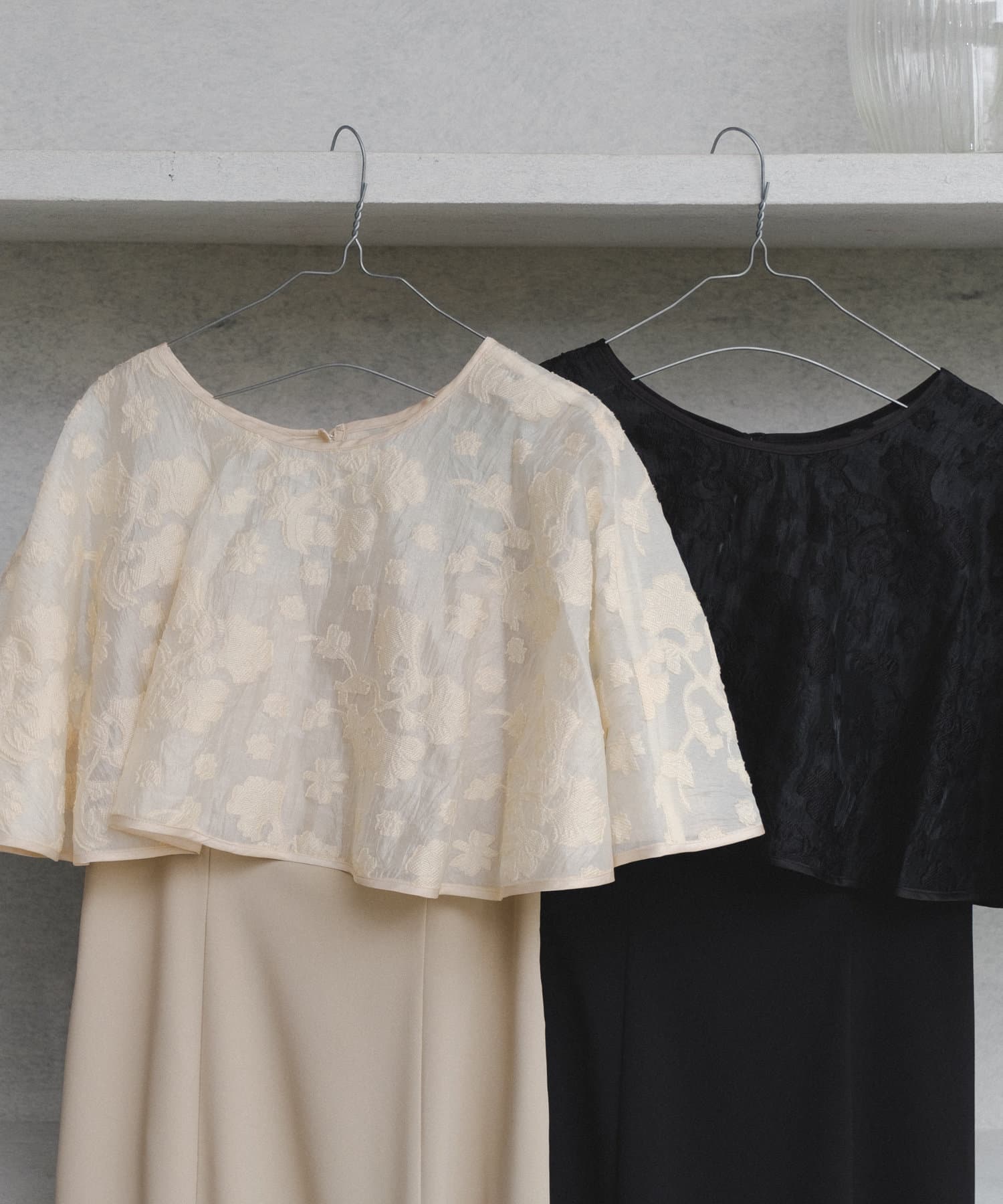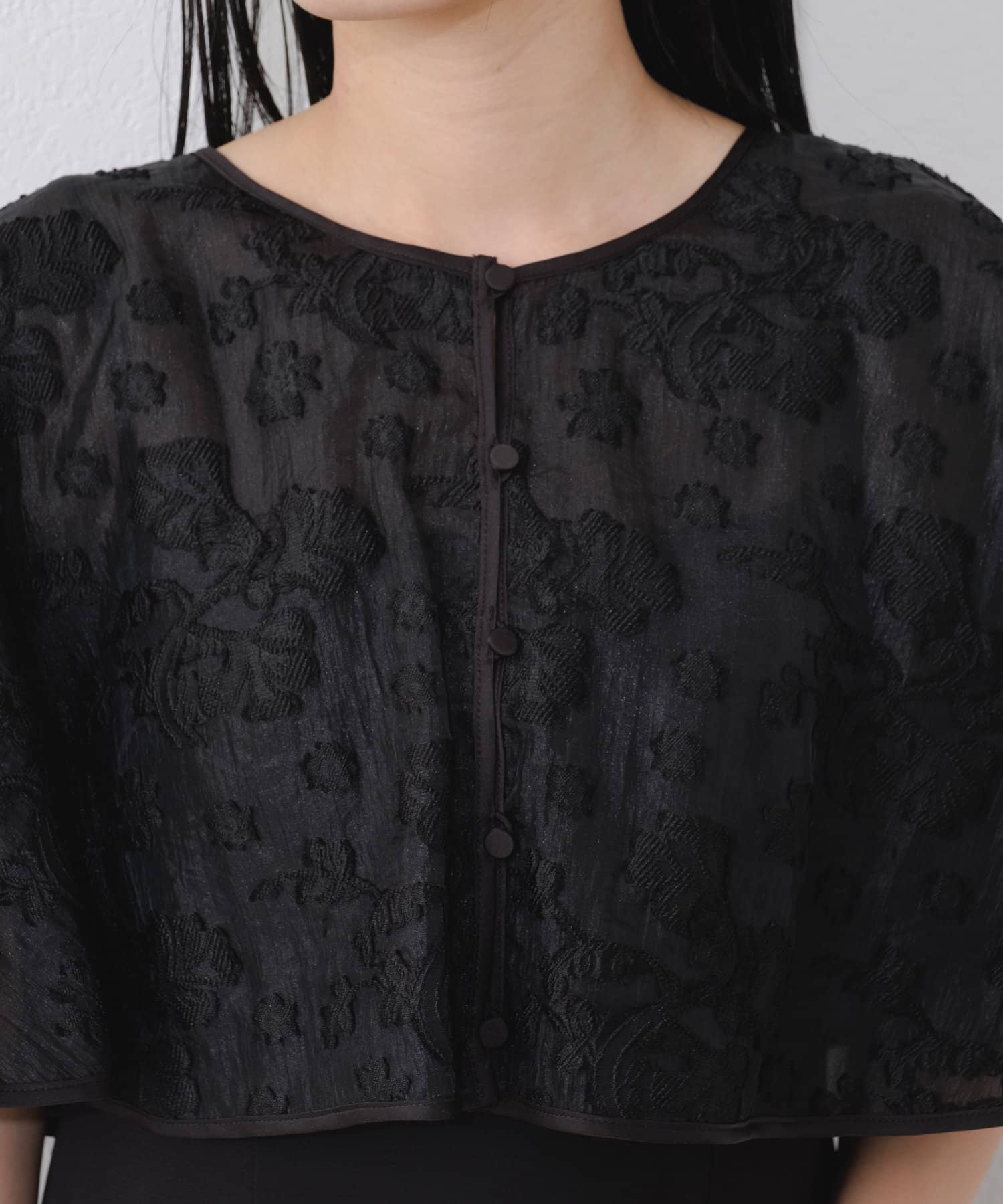 ケープは上品な透け感で羽織るだけで目を惹きます。