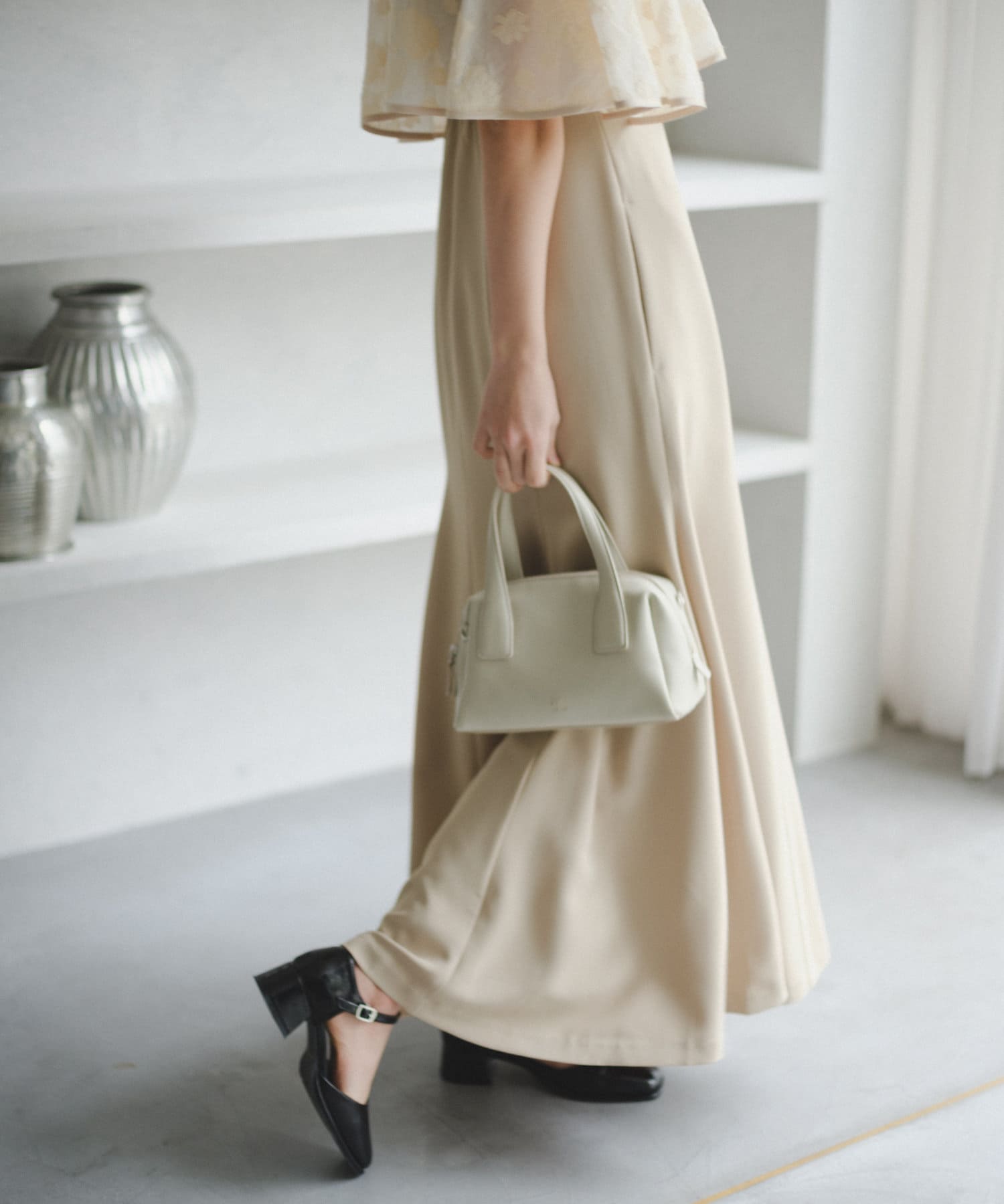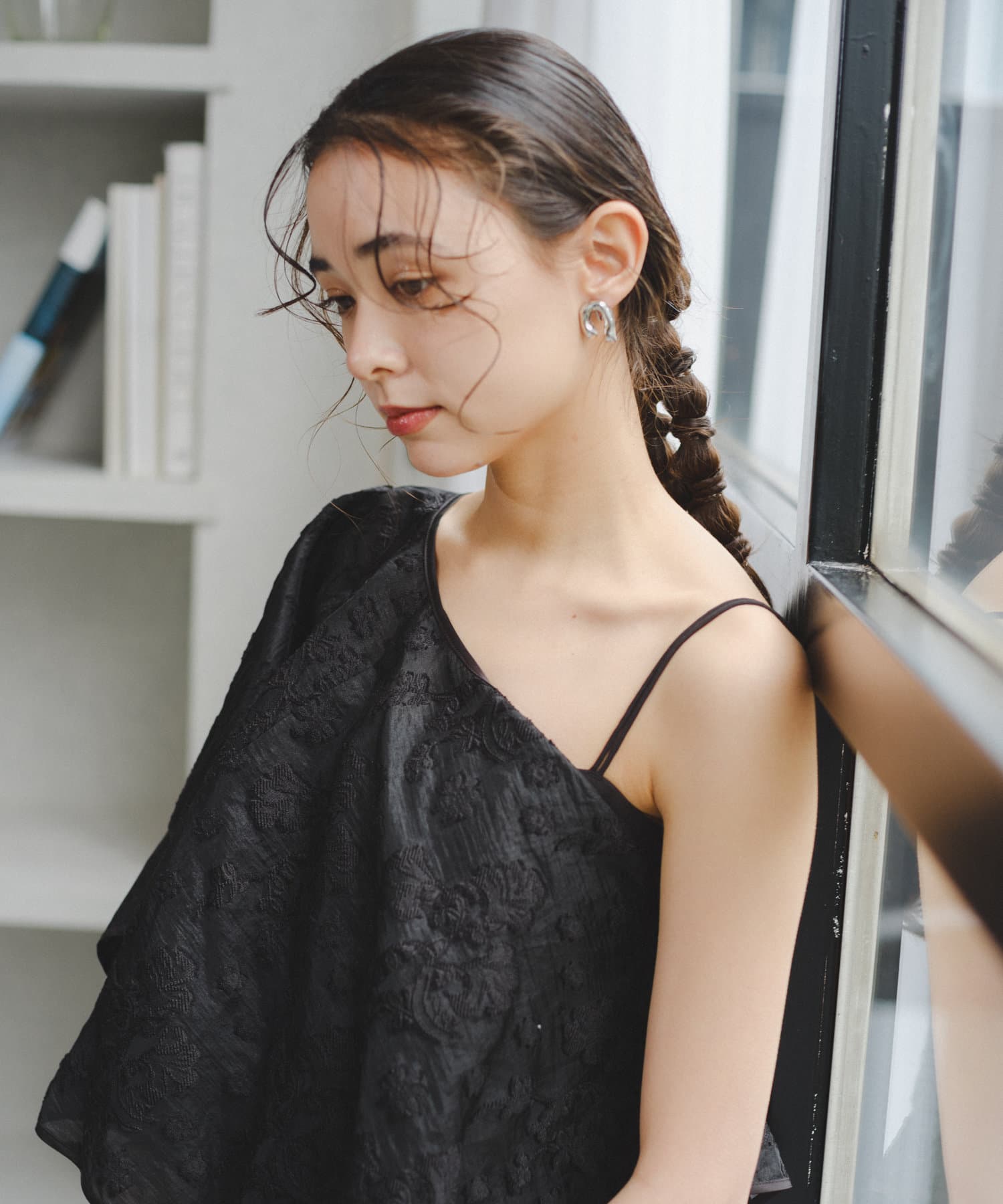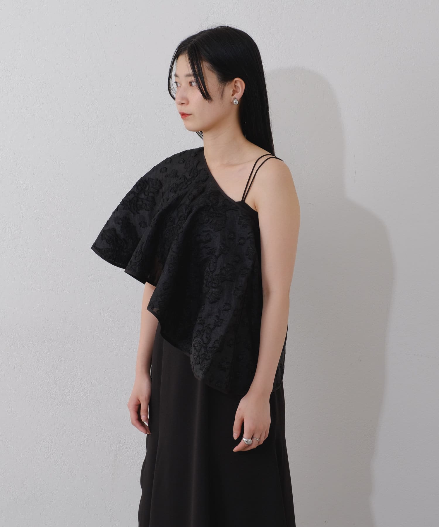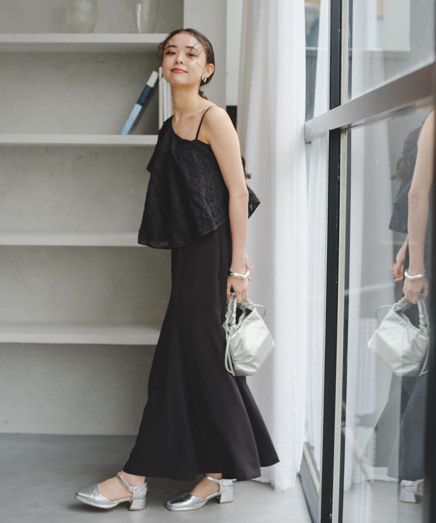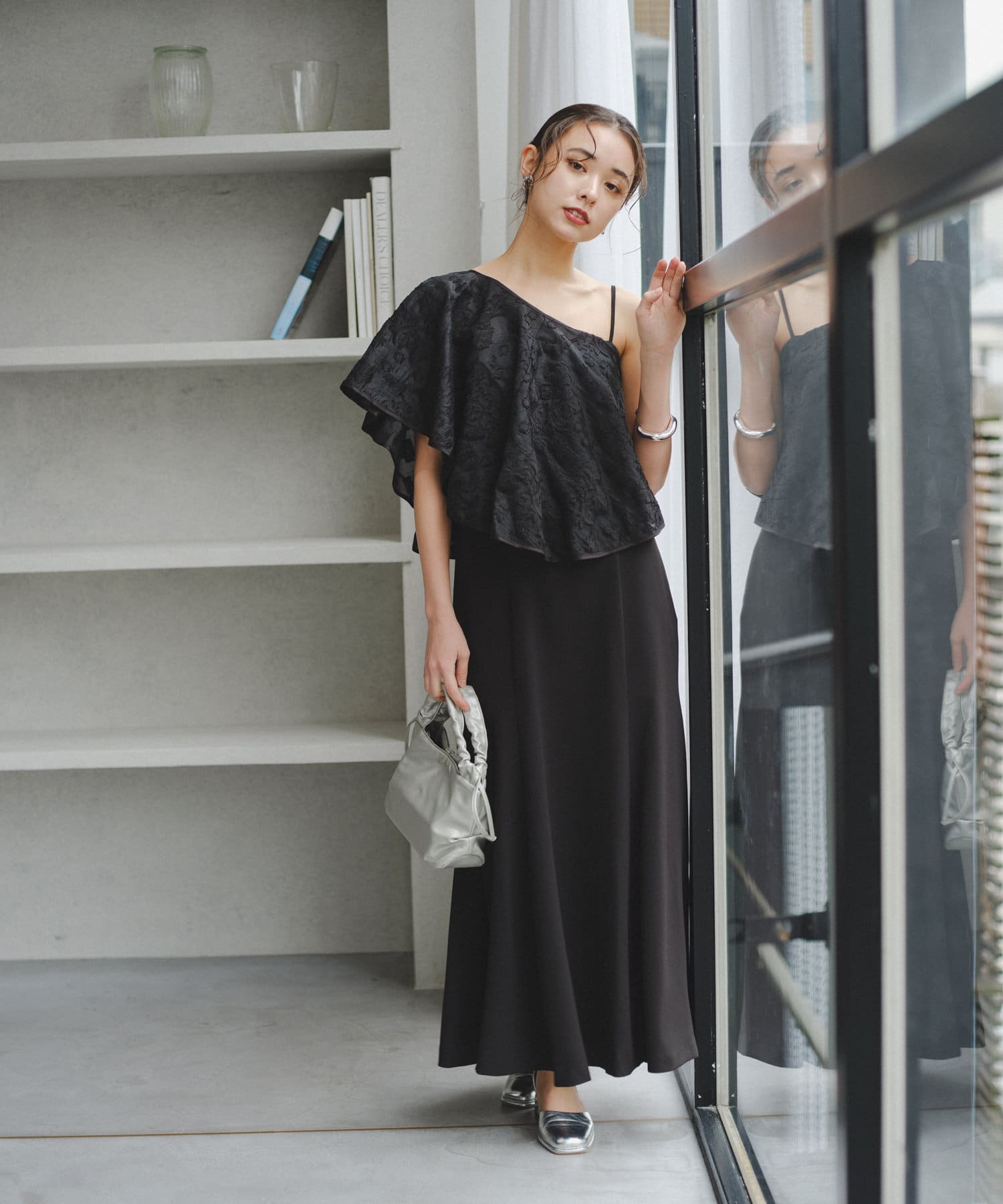 ケープは上品な透け感で羽織るだけで目を惹きます。