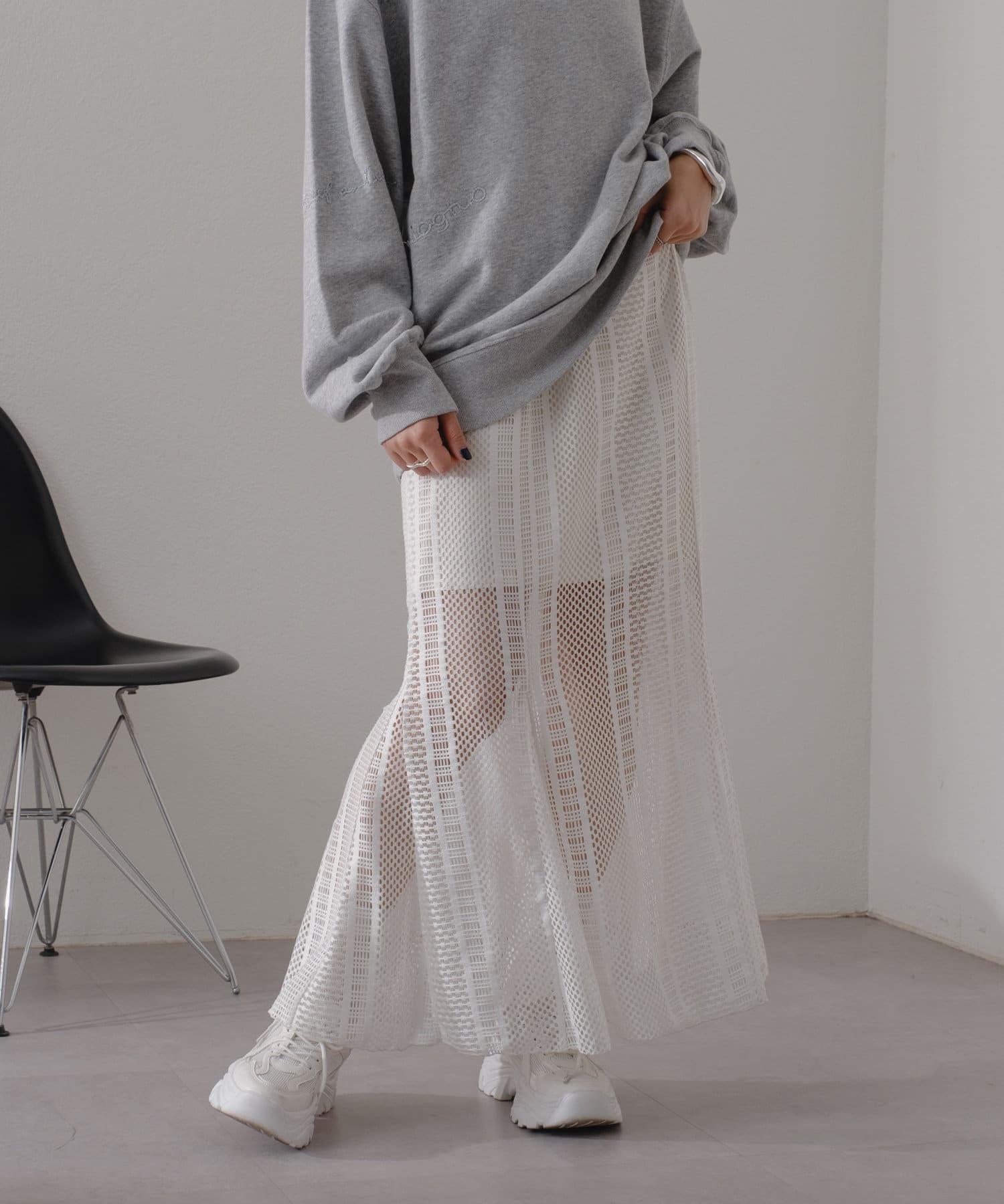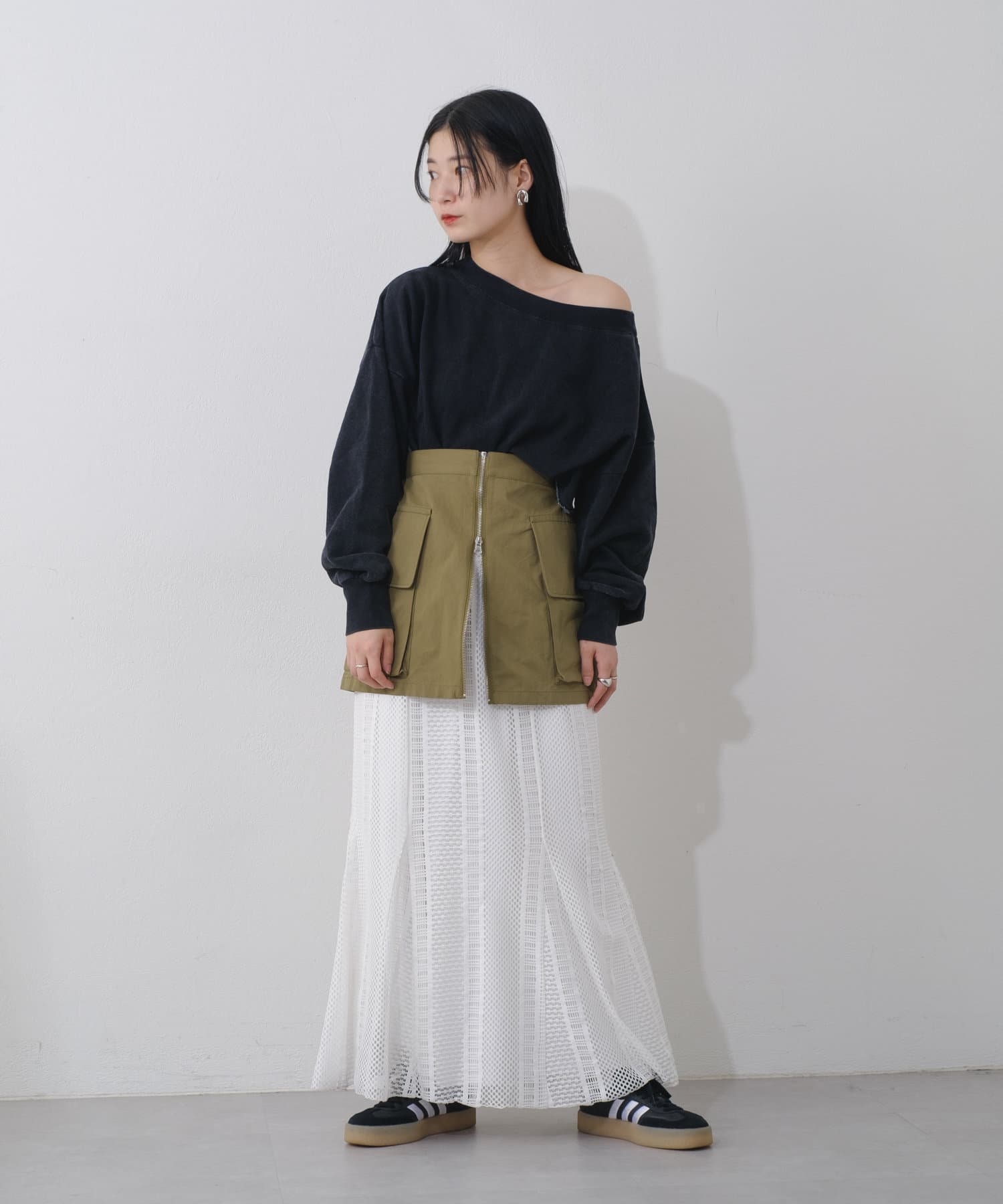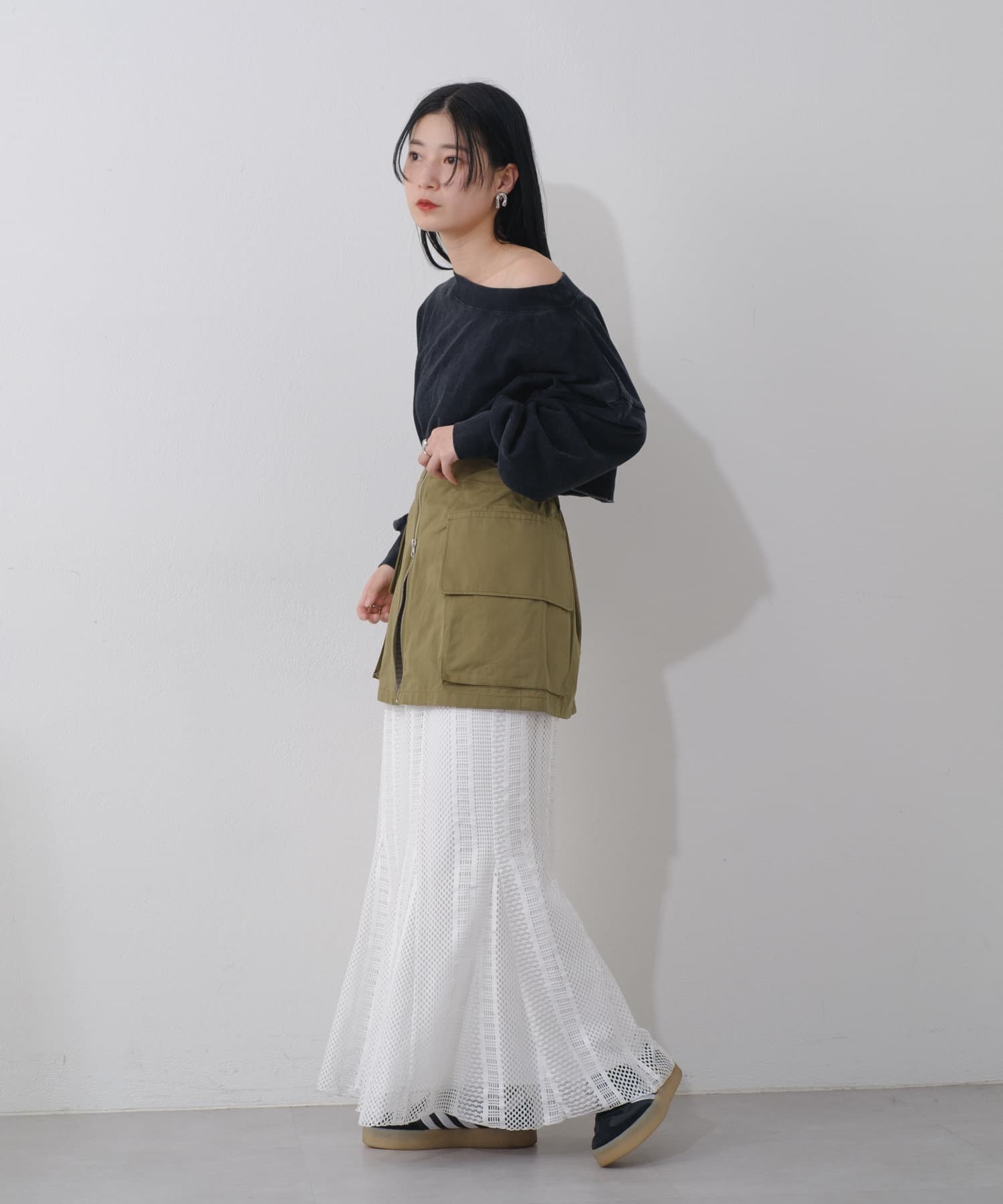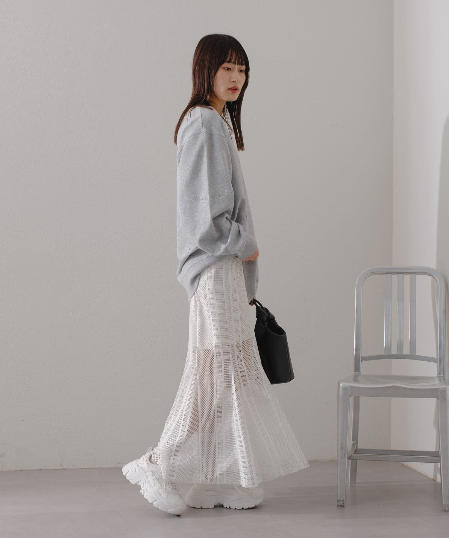裾に向かって広がるマーメイドラインなので、オーバーサイズのトップスとの相性◎