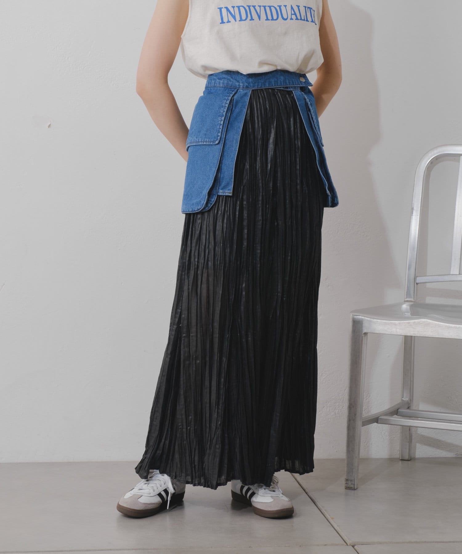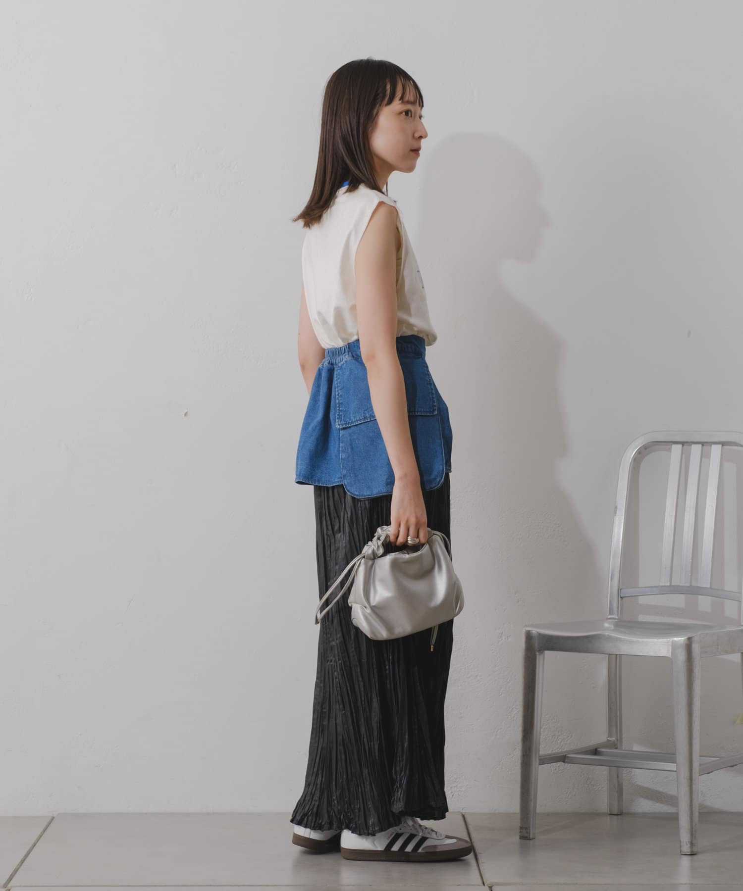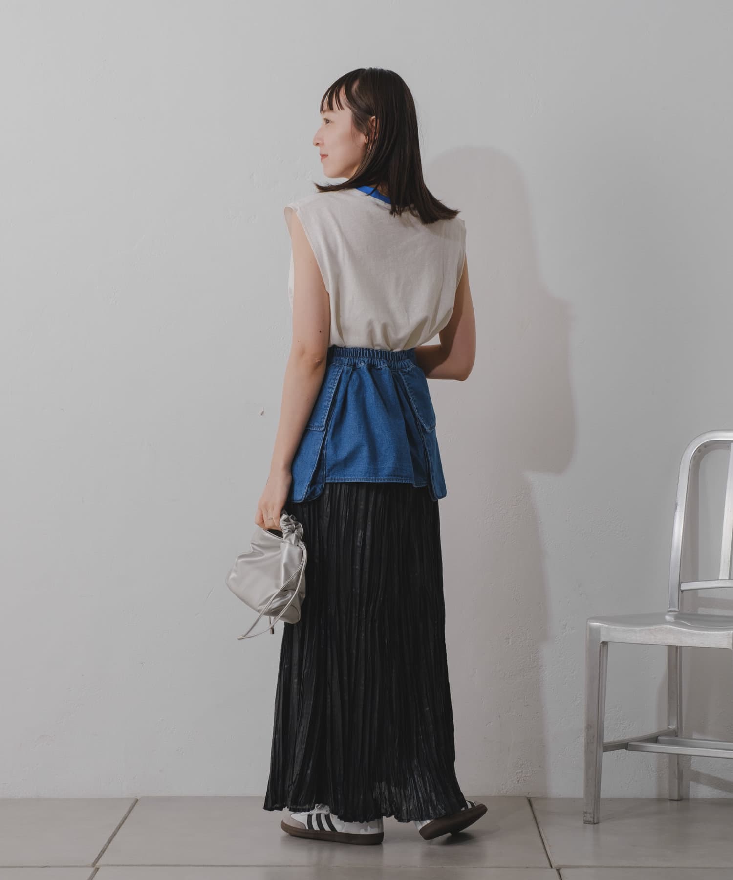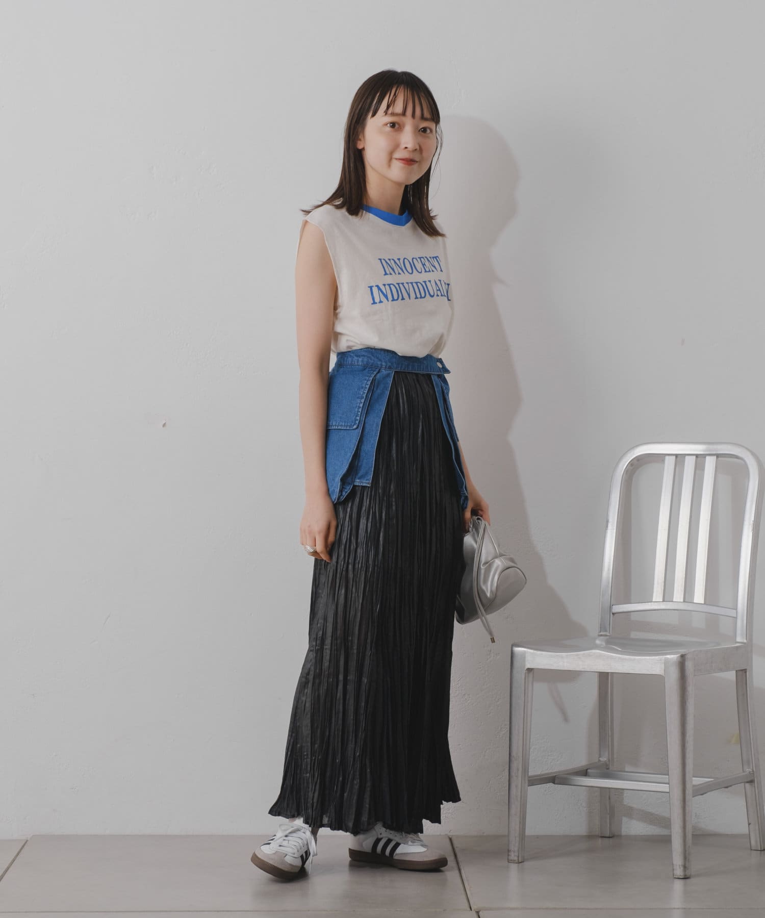 Tシャツやノースリーブをインしてベーシックな合わせはもちろん、