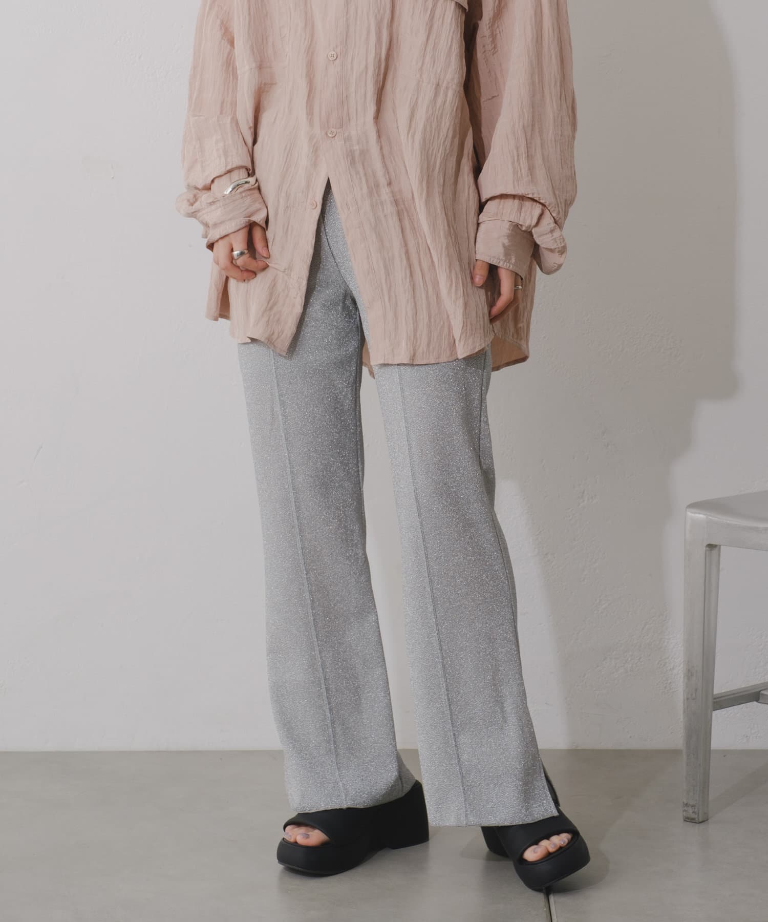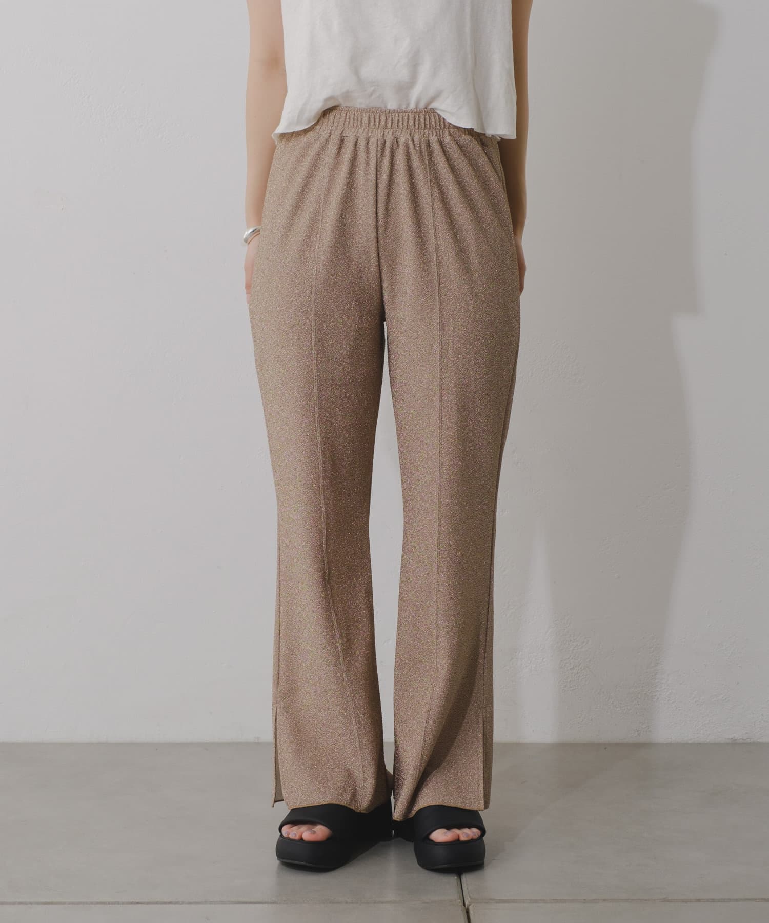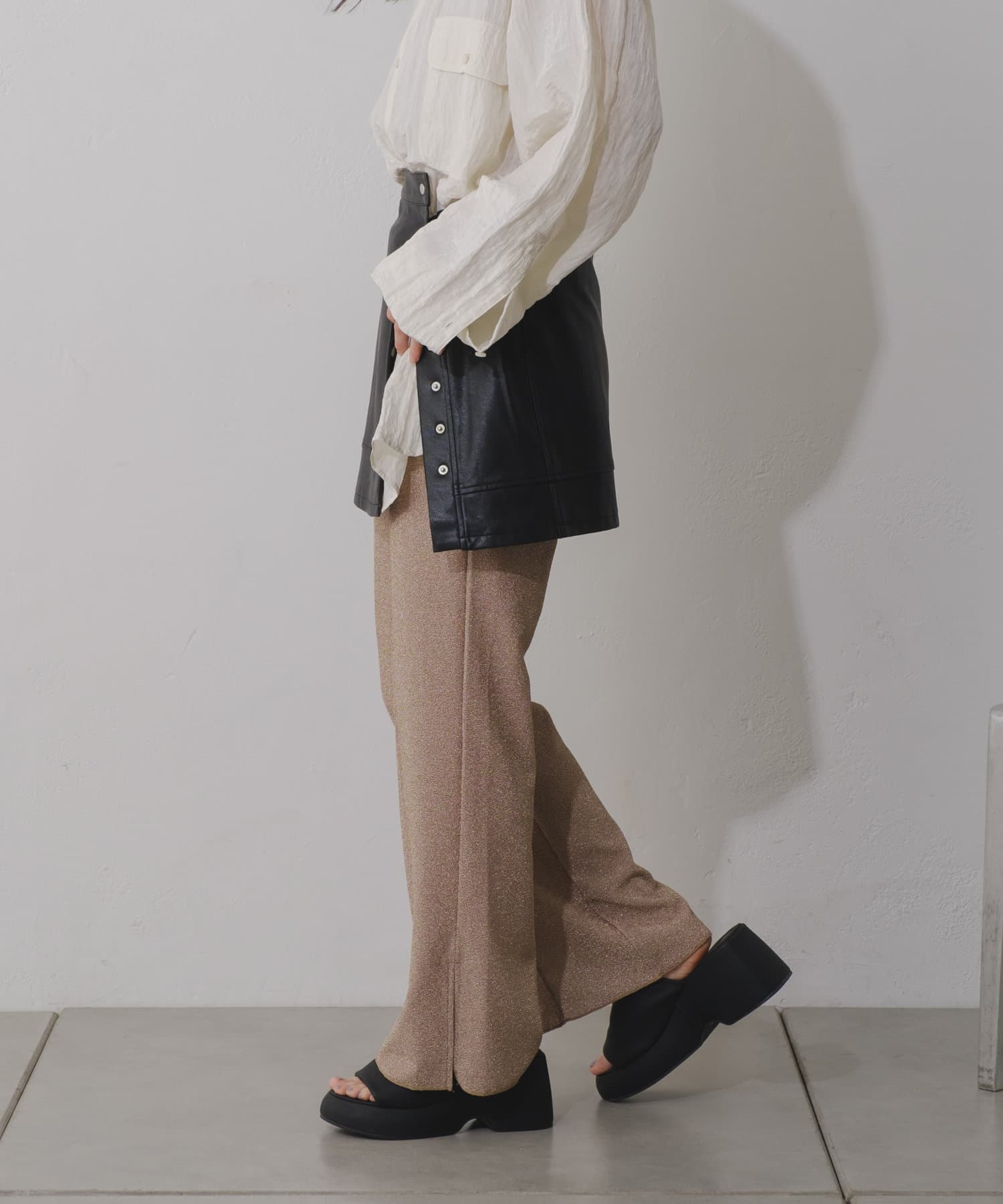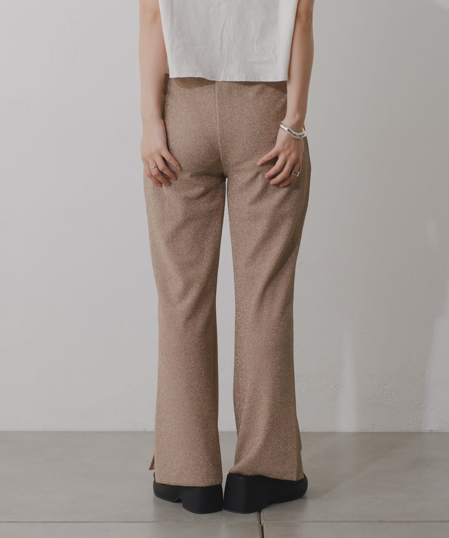 ラメ感のある、履くだけで上級者に仕上がるフレアパンツ。