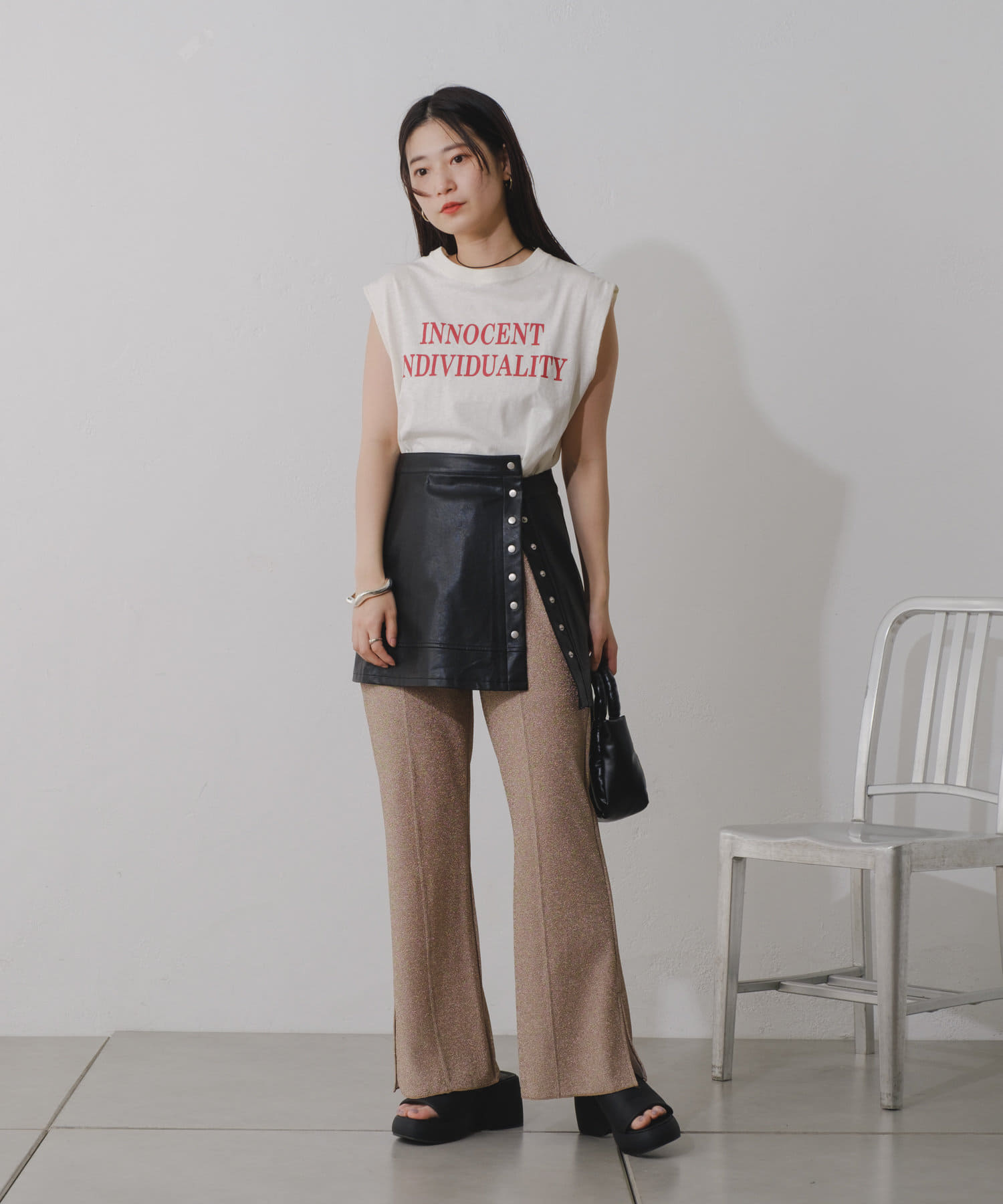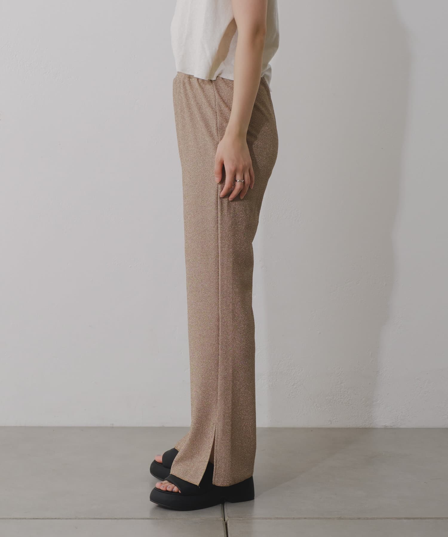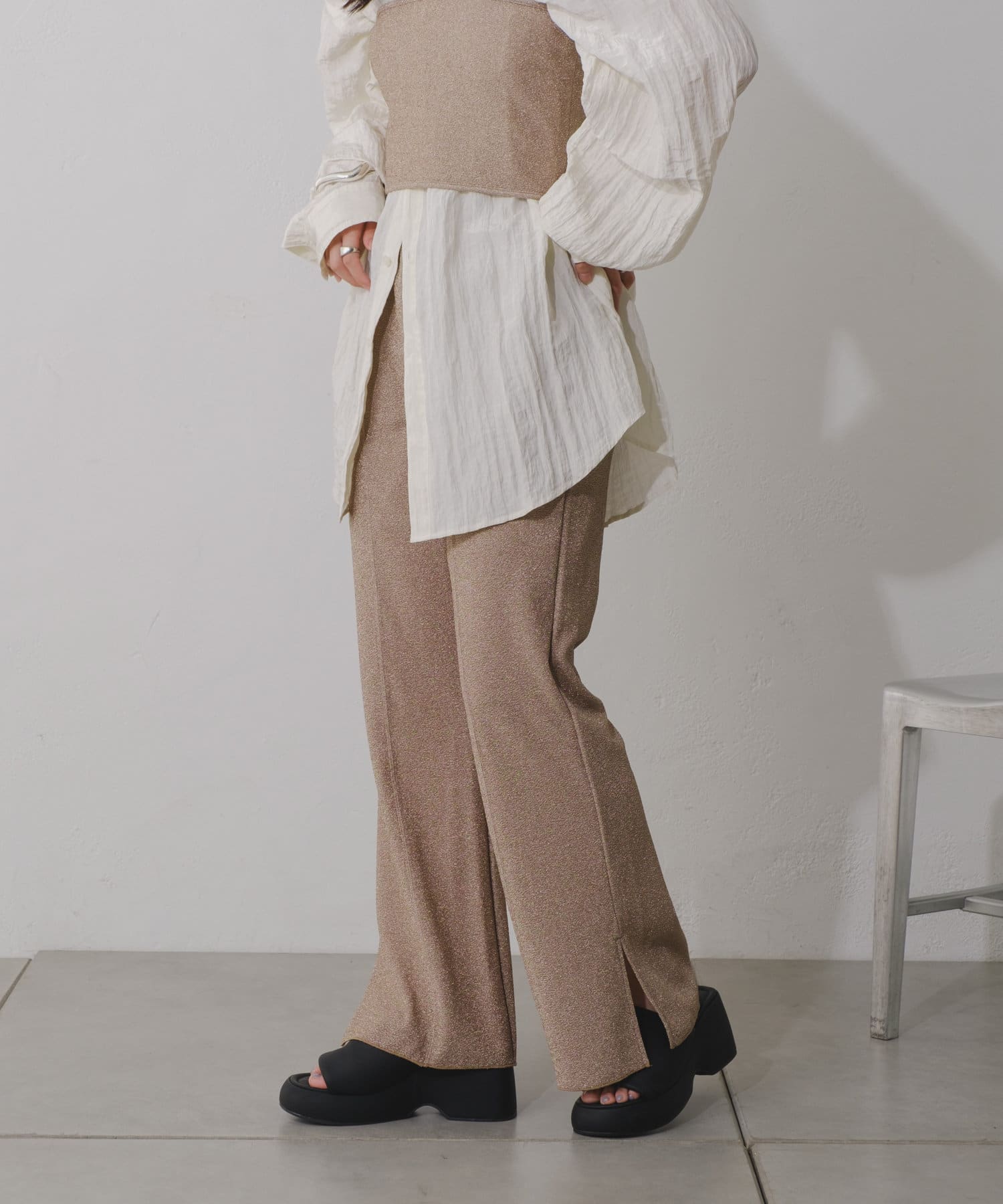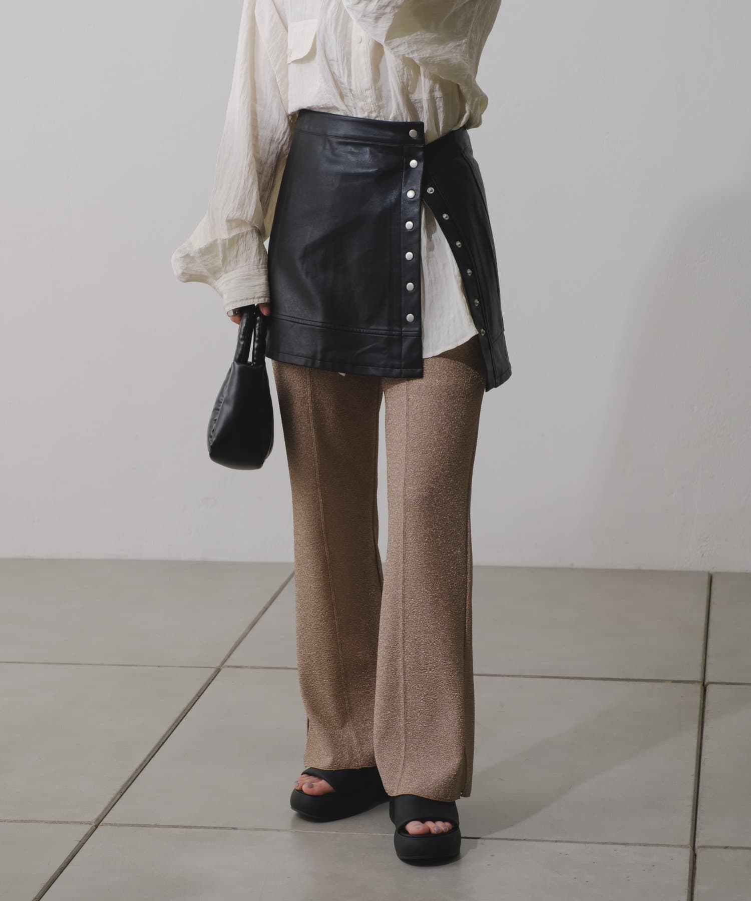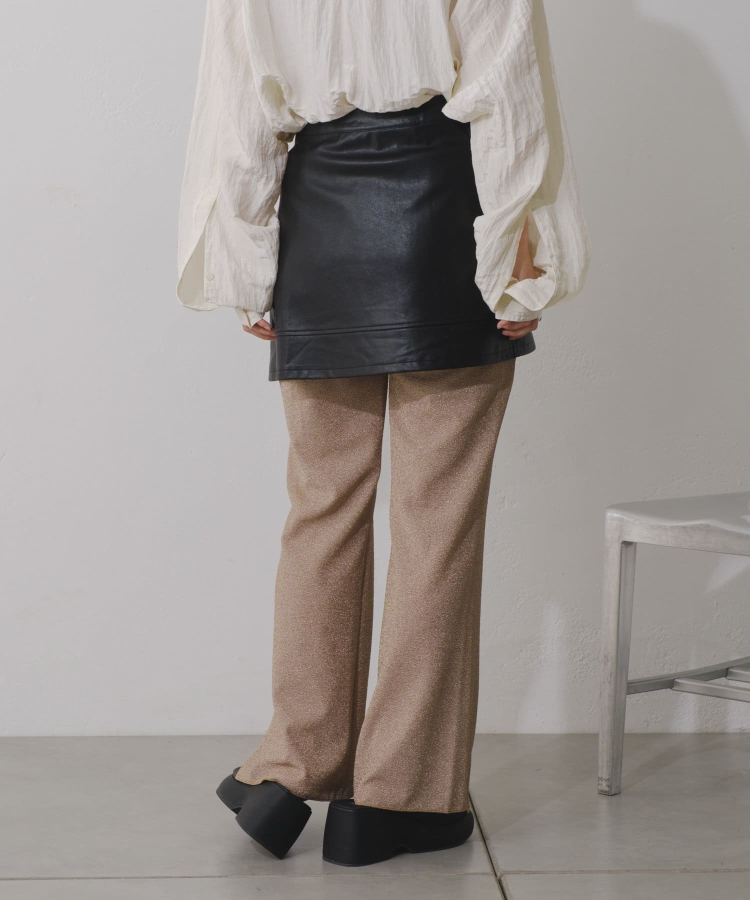 ラメ感のある、履くだけで上級者に仕上がるフレアパンツ。