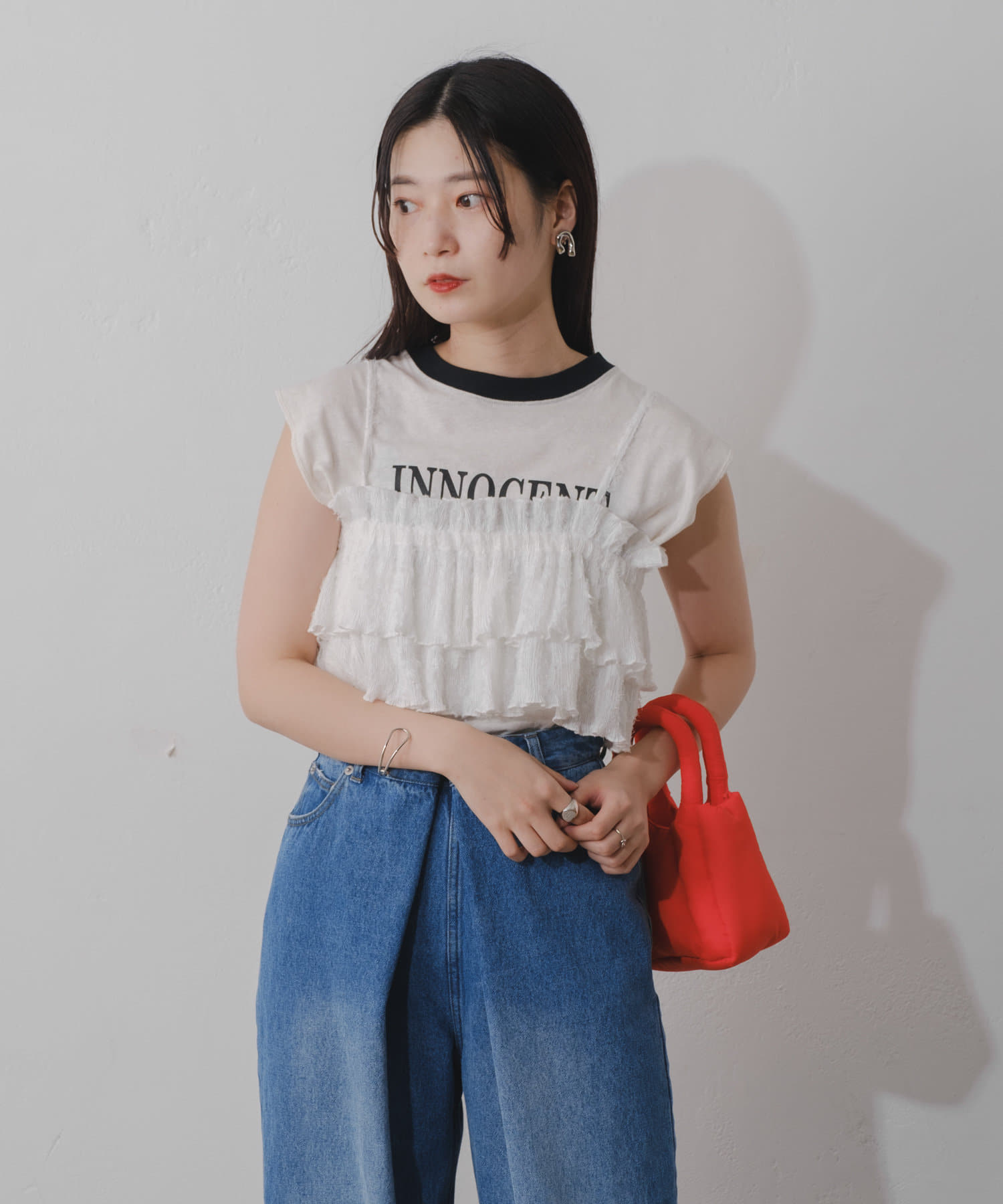 フリルですが素材感があり、甘くなり過ぎないビスチェ。