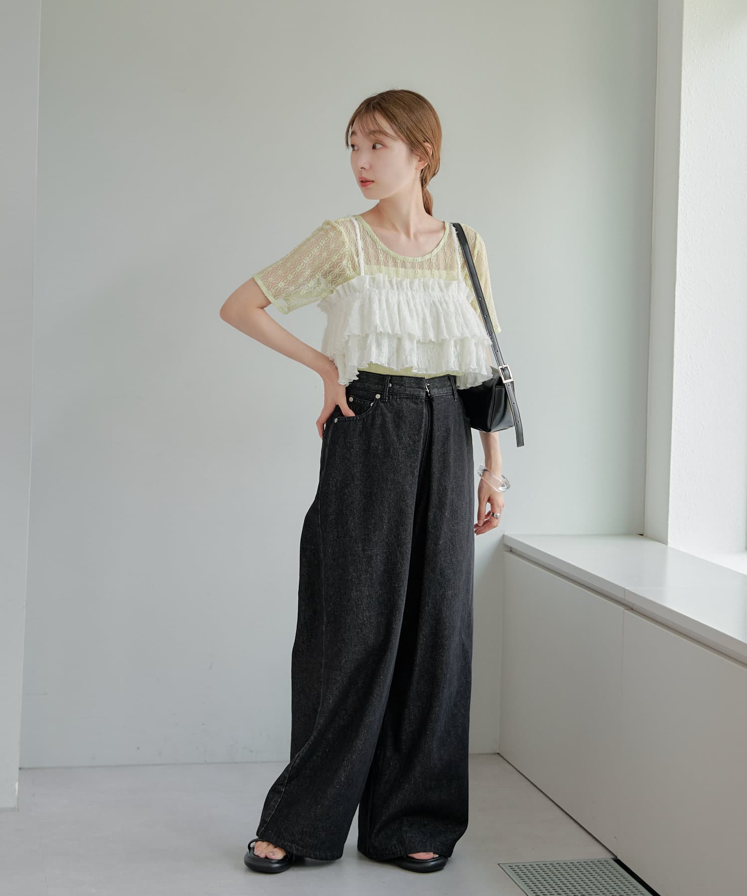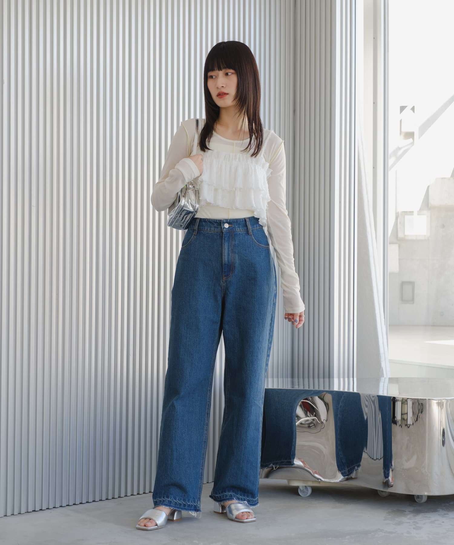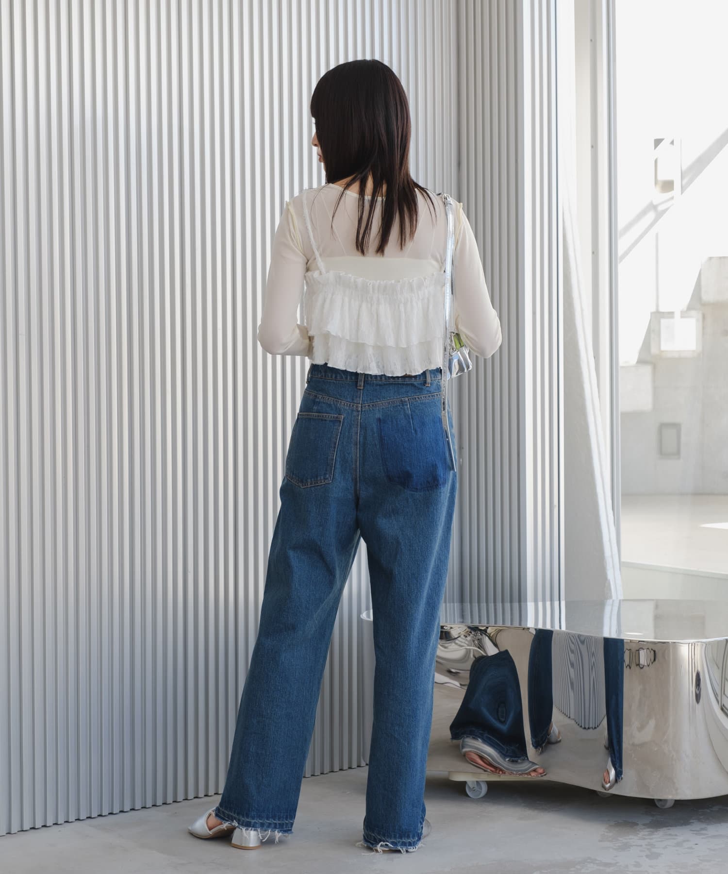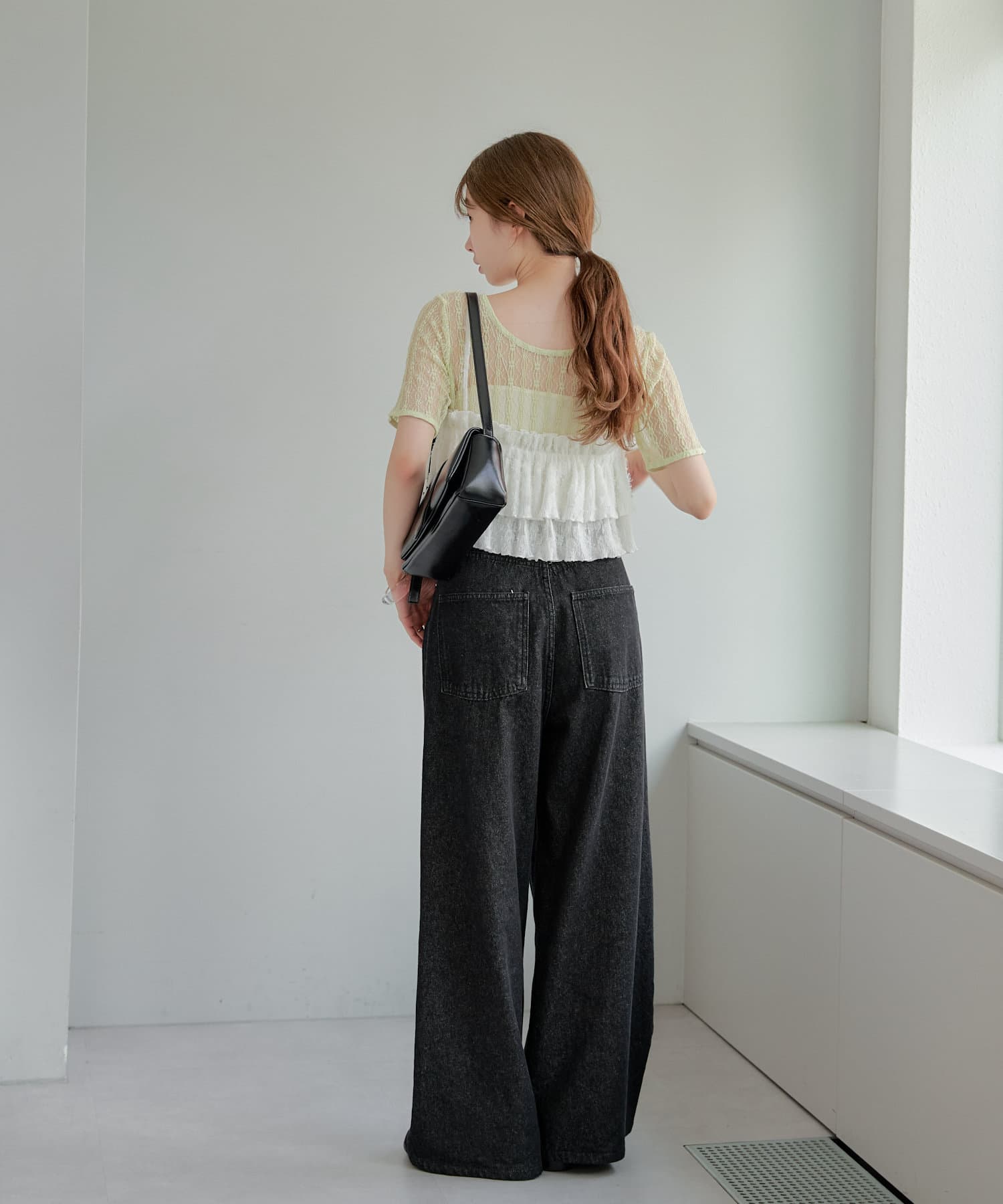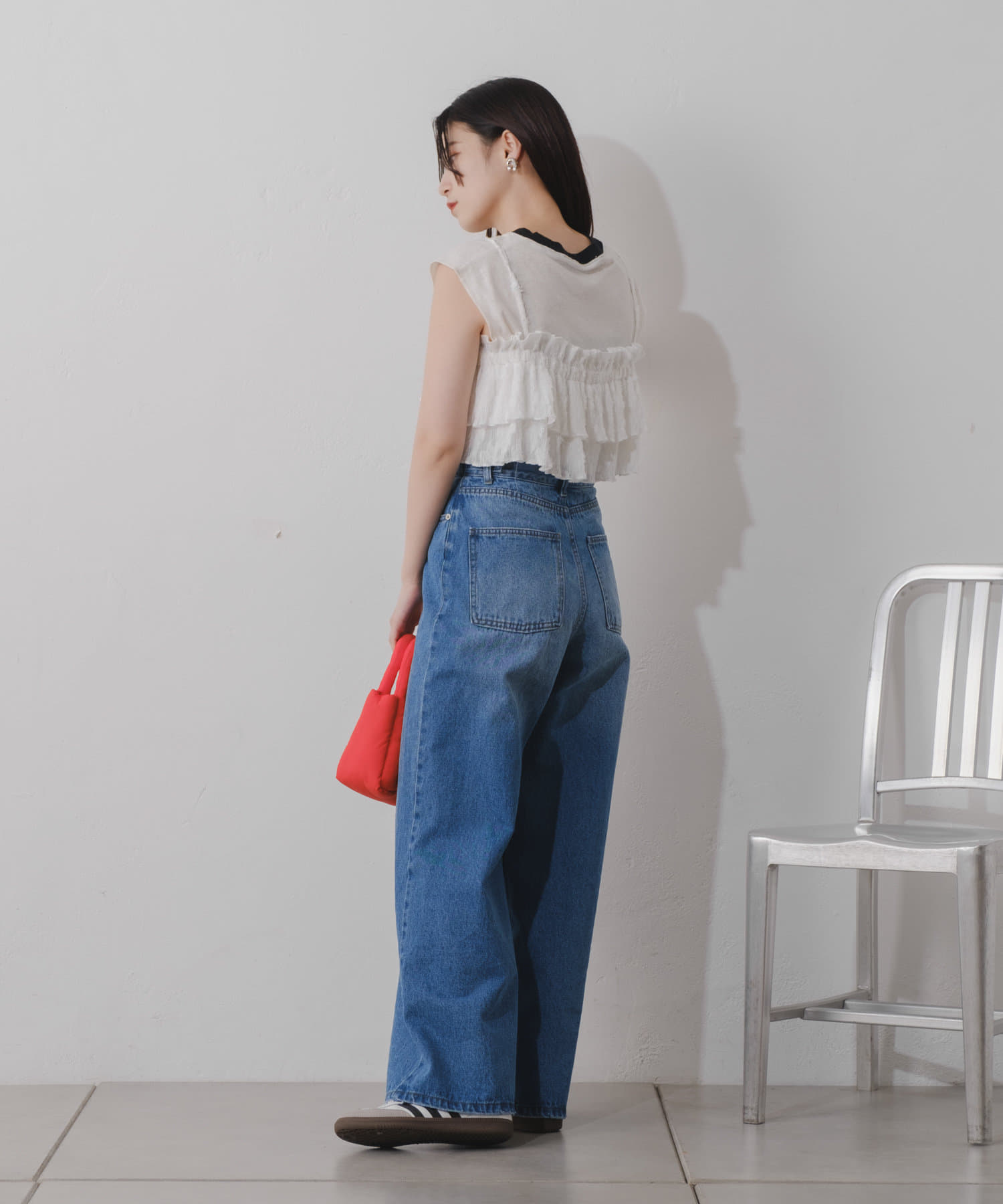 短めなのでワイドパンツなど、ボリュームあるロングボトムが相性良くおすすめです。