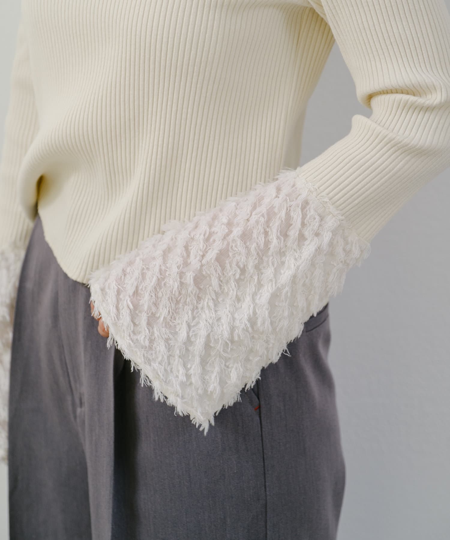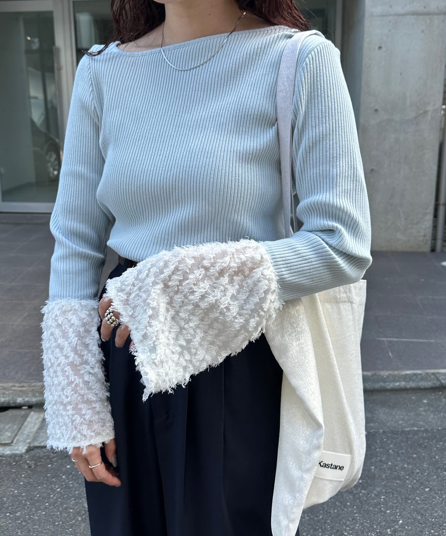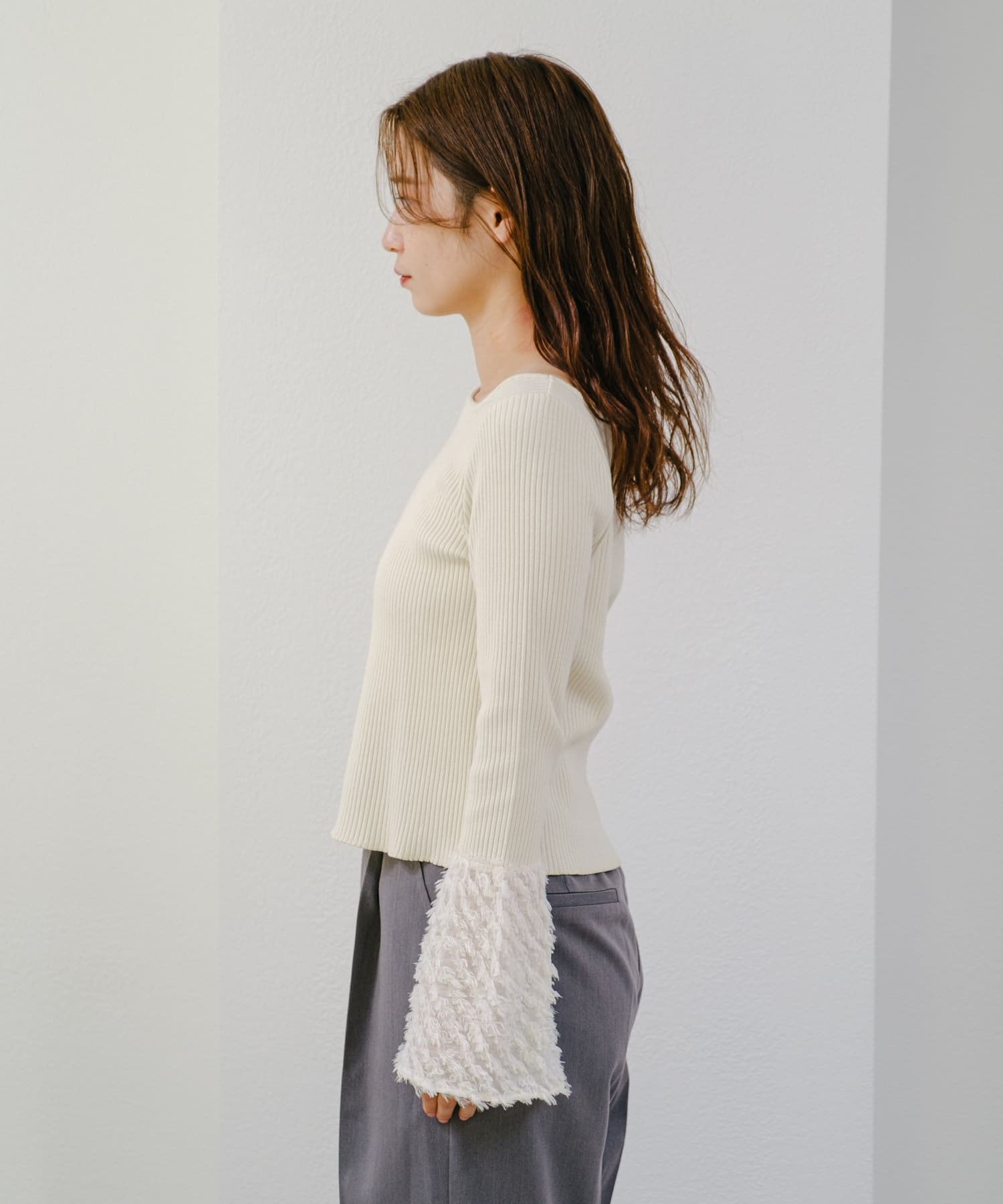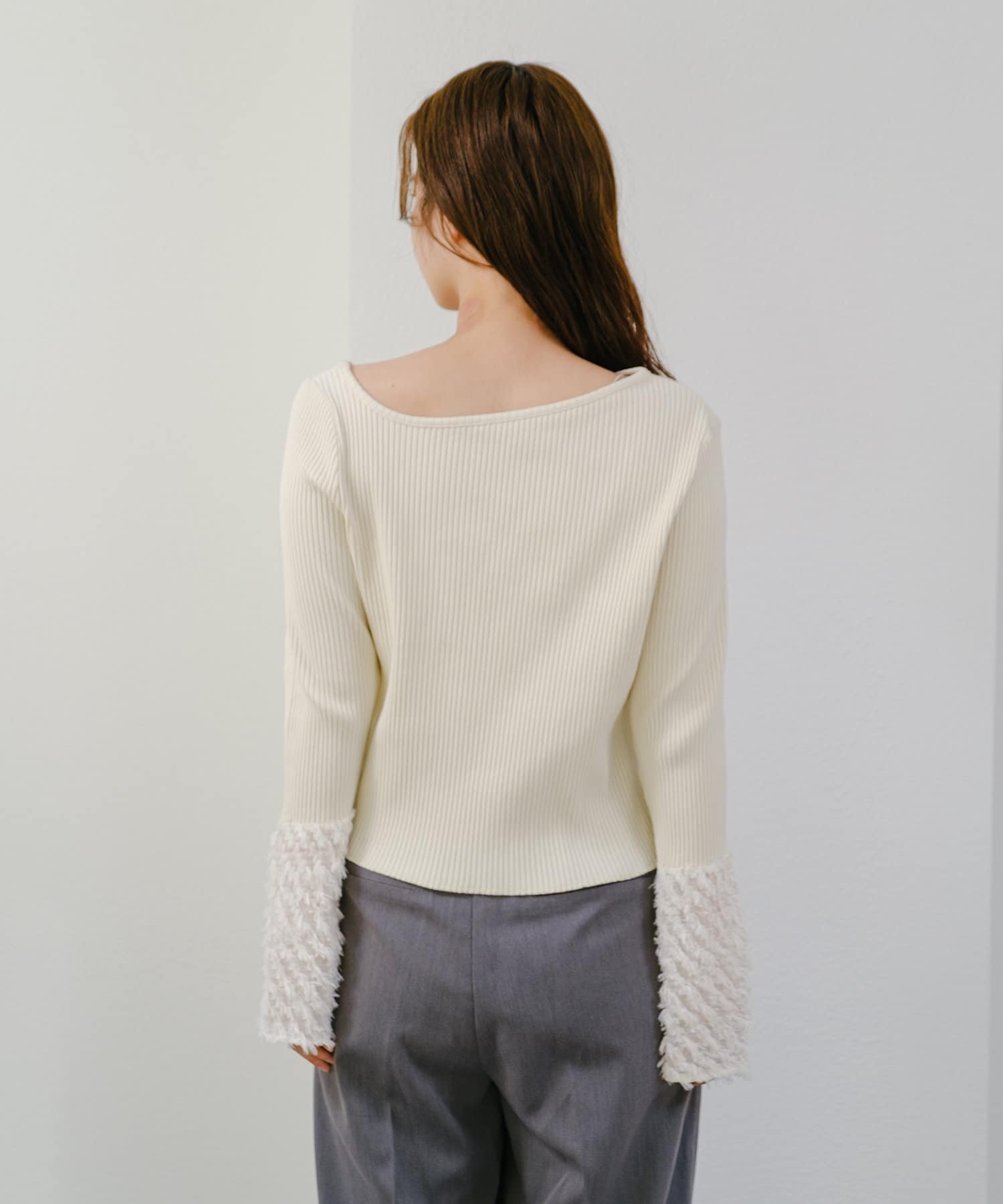 リブ素材とフェザーの異素材を組み合わせたカットソー。