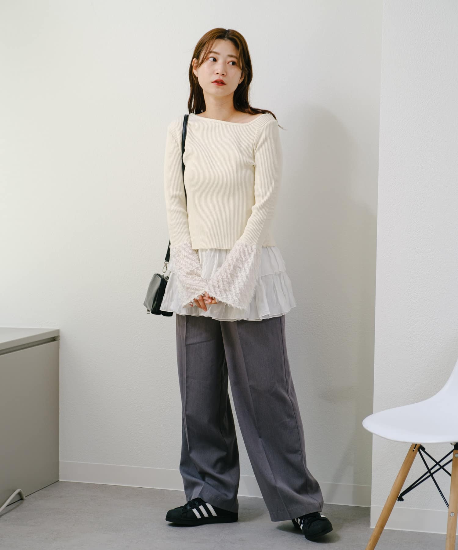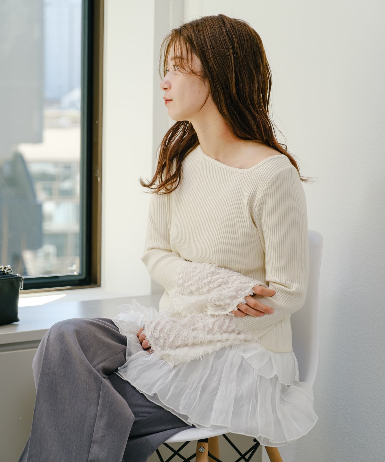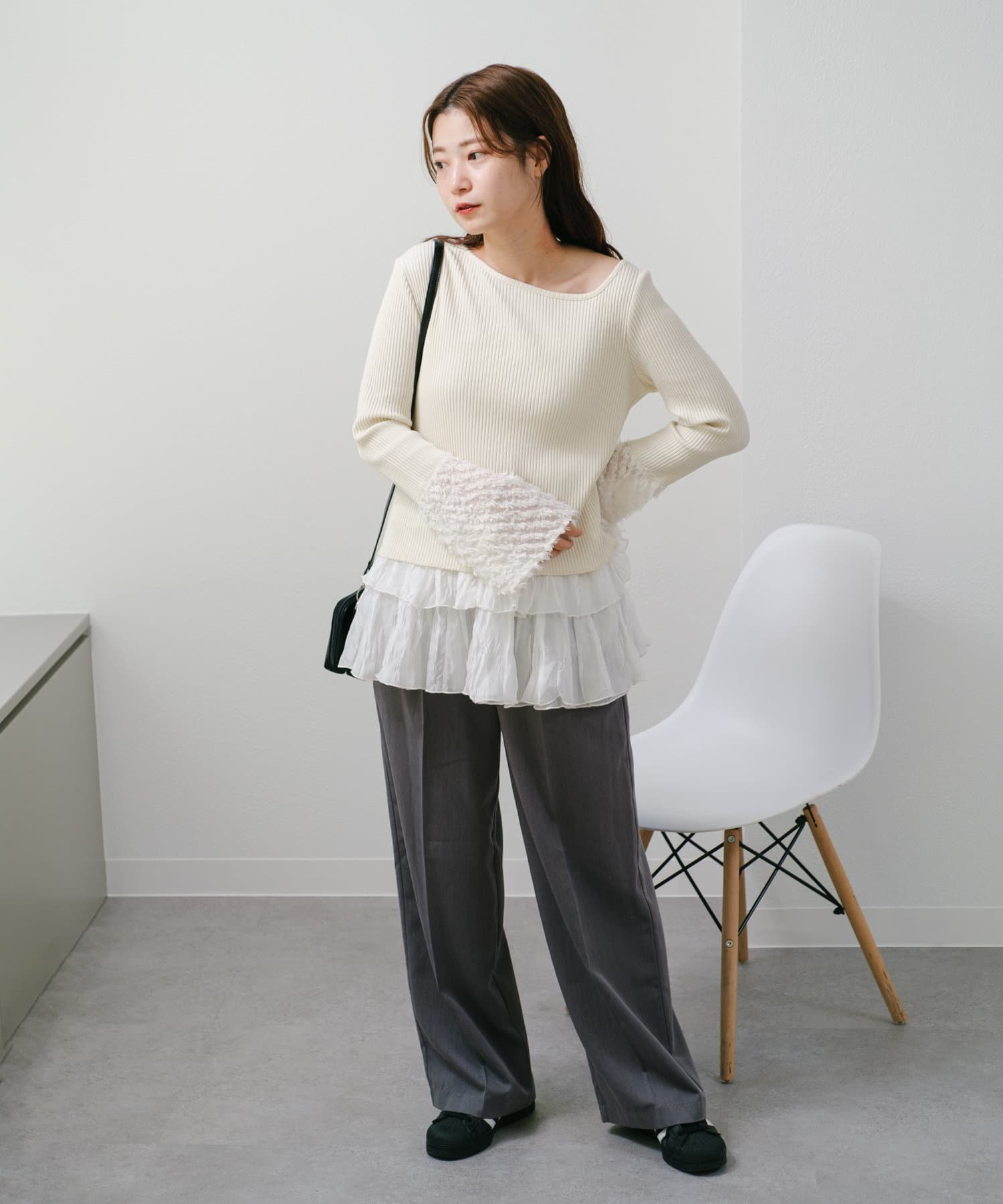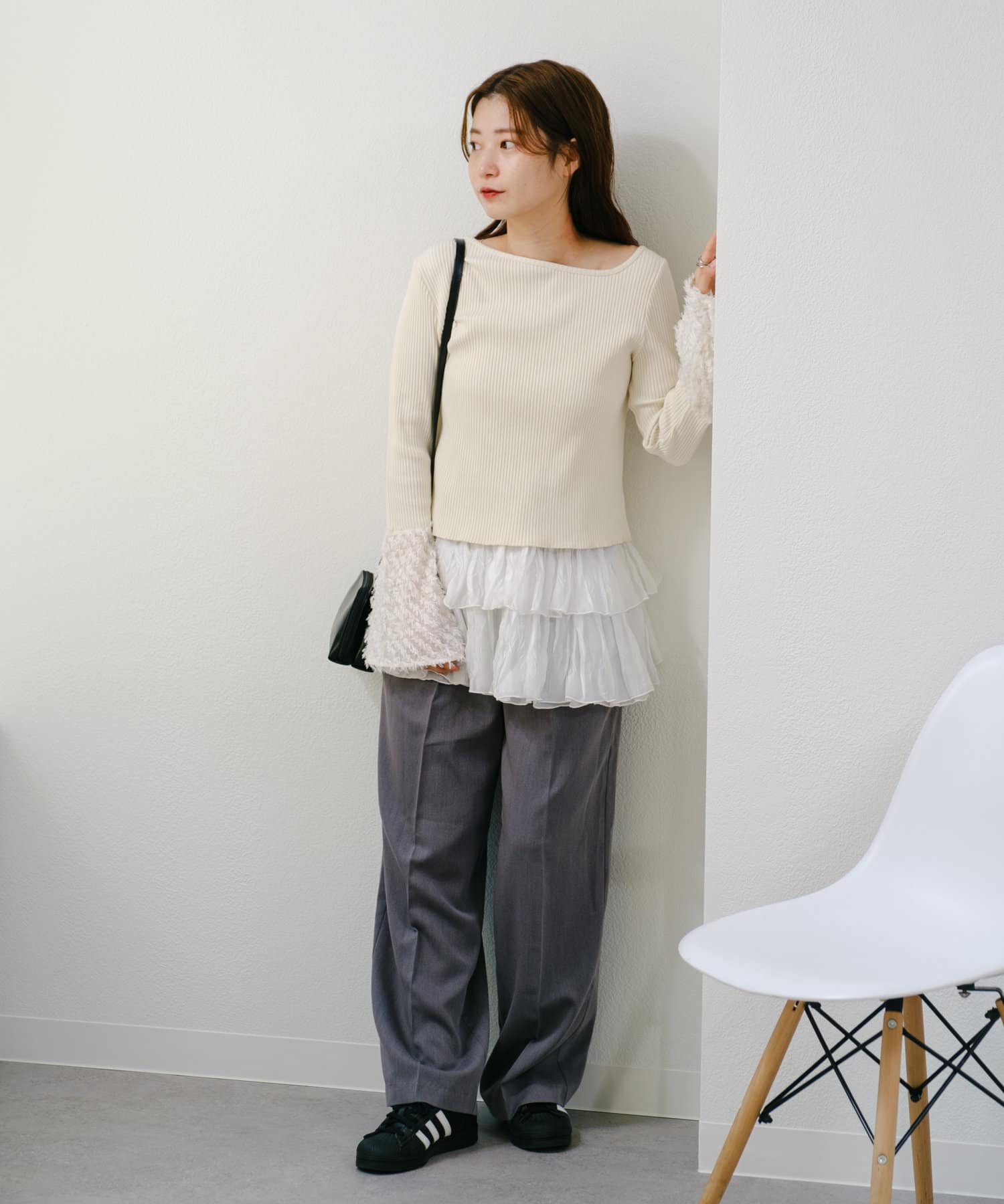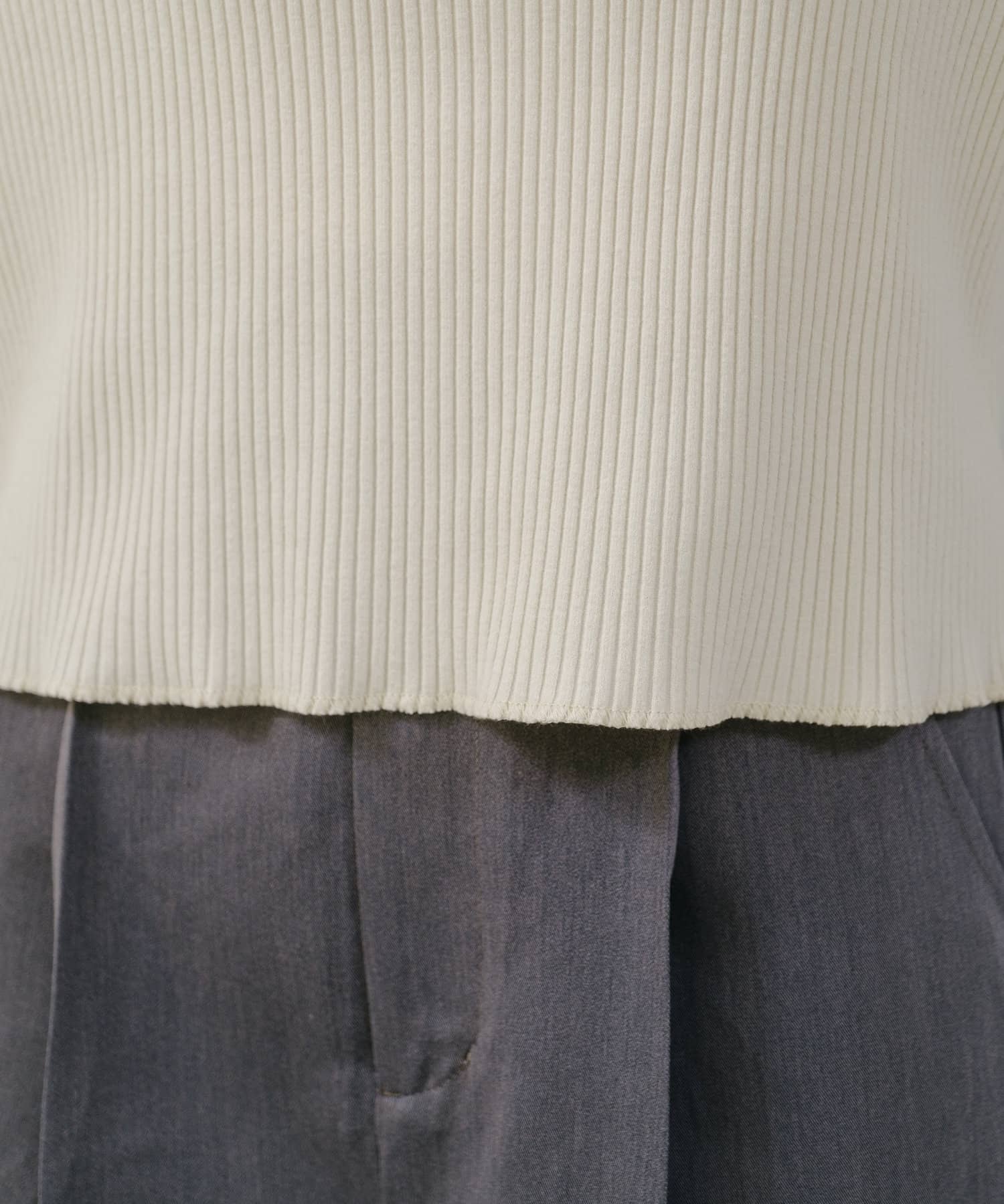 リブ素材とフェザーの異素材を組み合わせたカットソー。