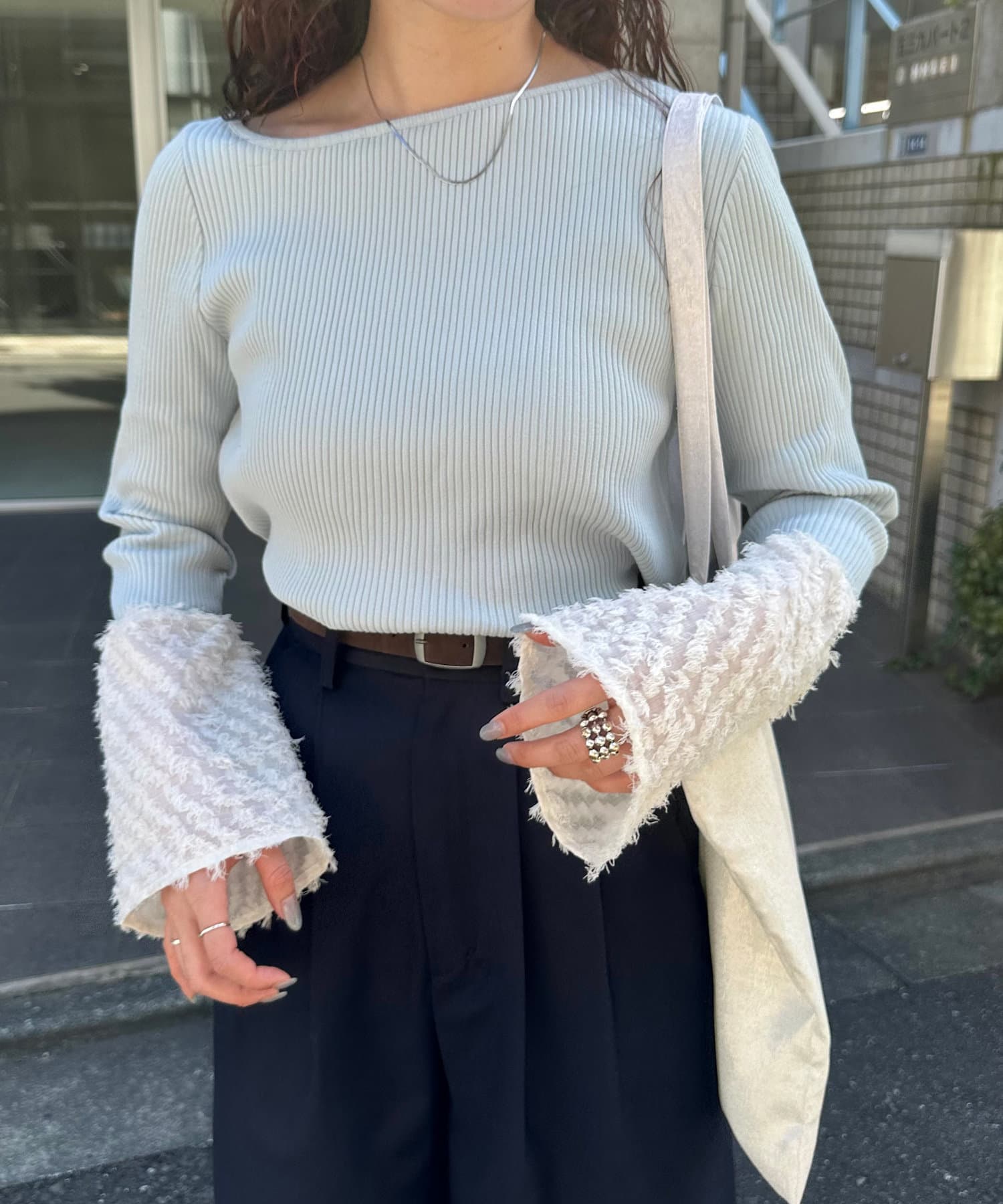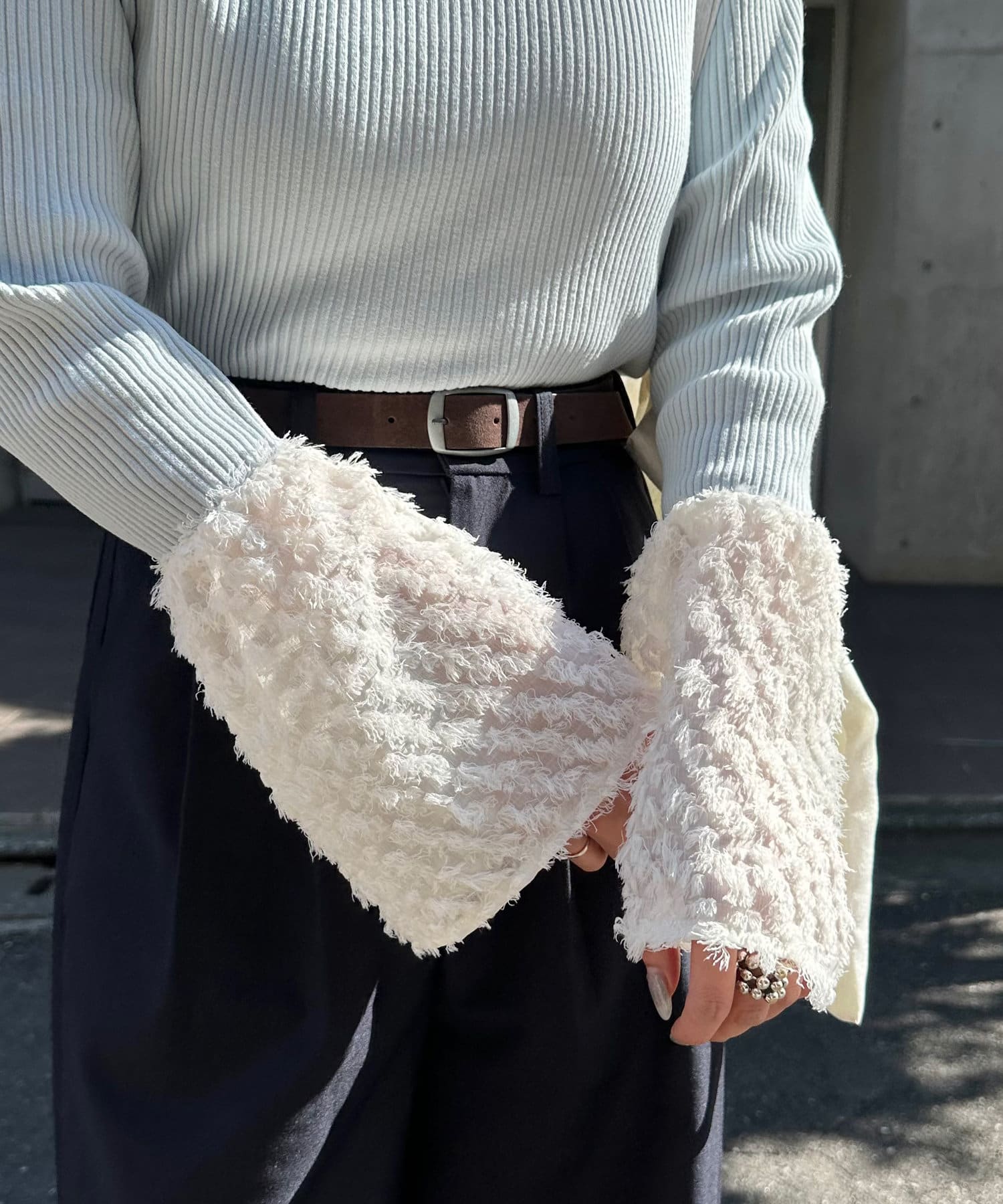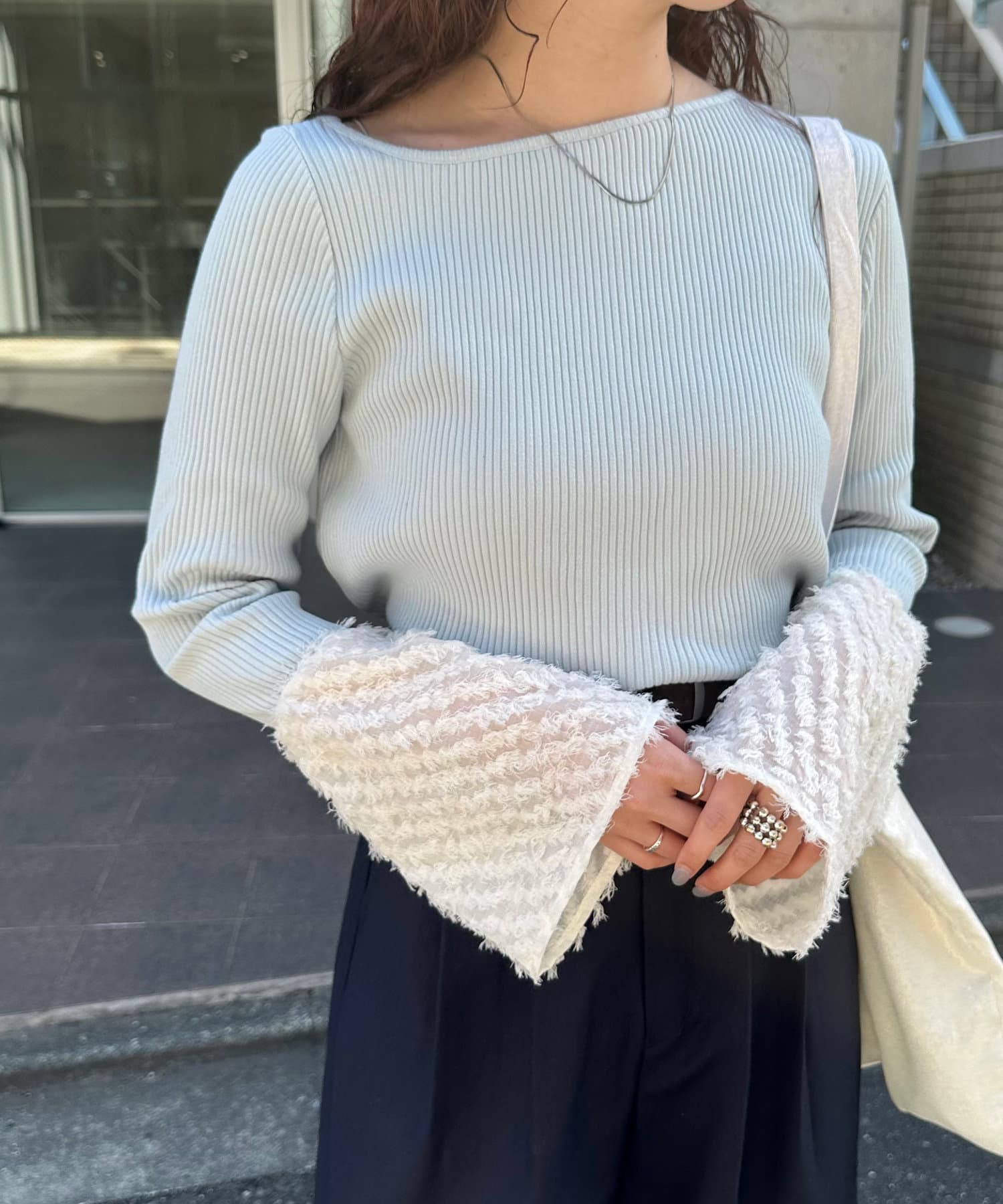 華やかな袖が目を惹くリブカットソー