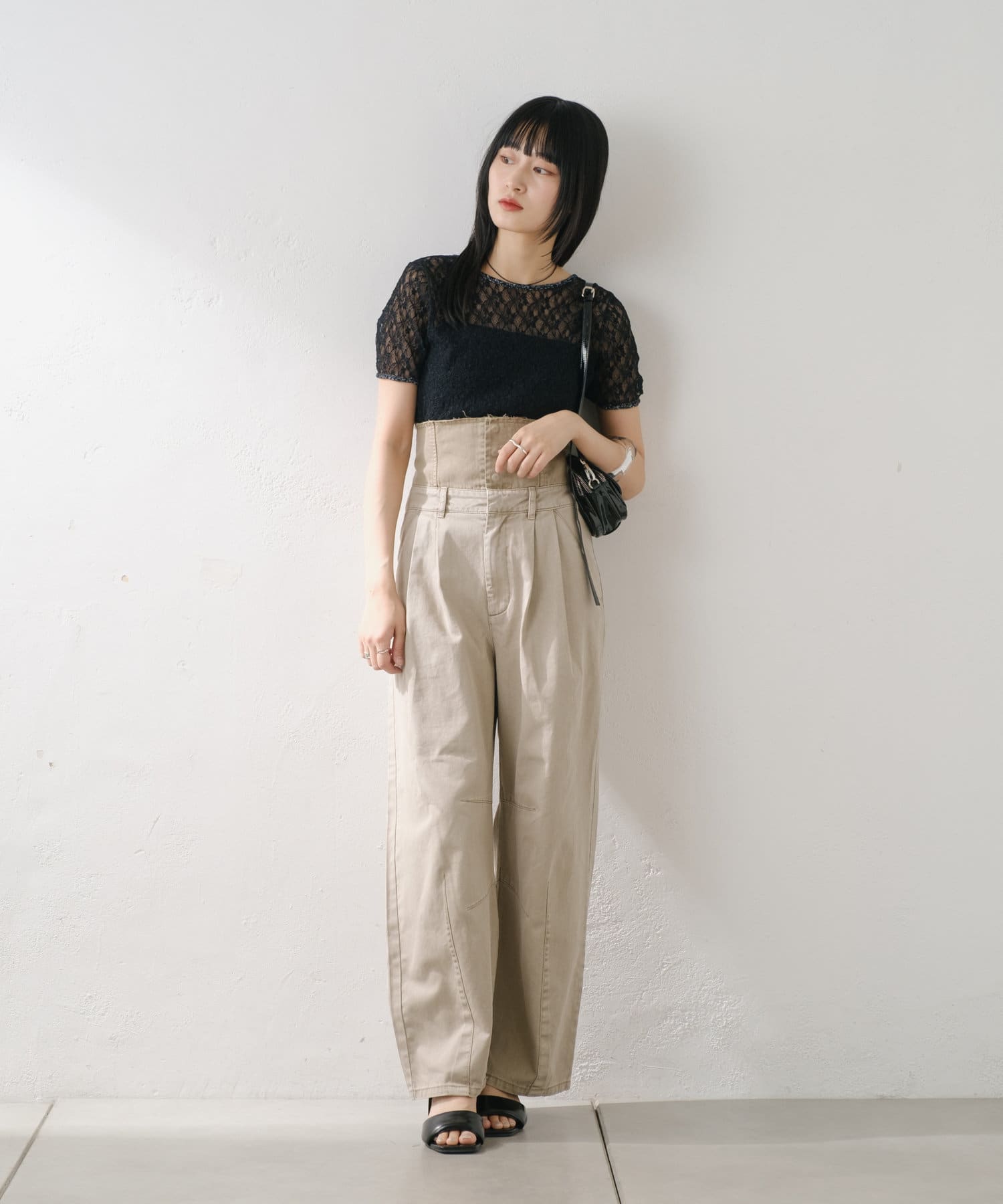 カジュアル見えするアイテムなのでレース素材など女性らしい素材や、肌見せできるデザインのアイテム合わせがオススメです。