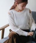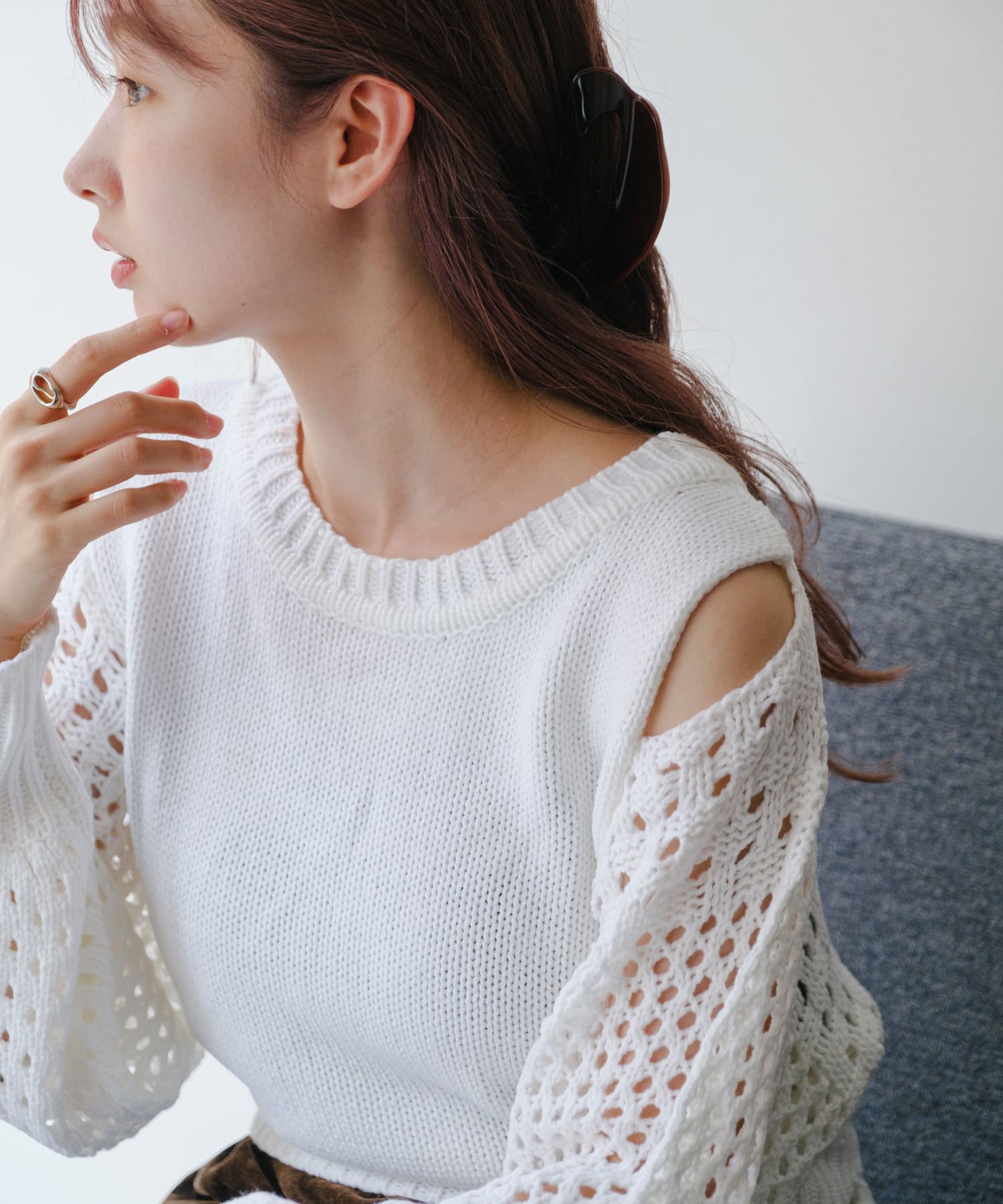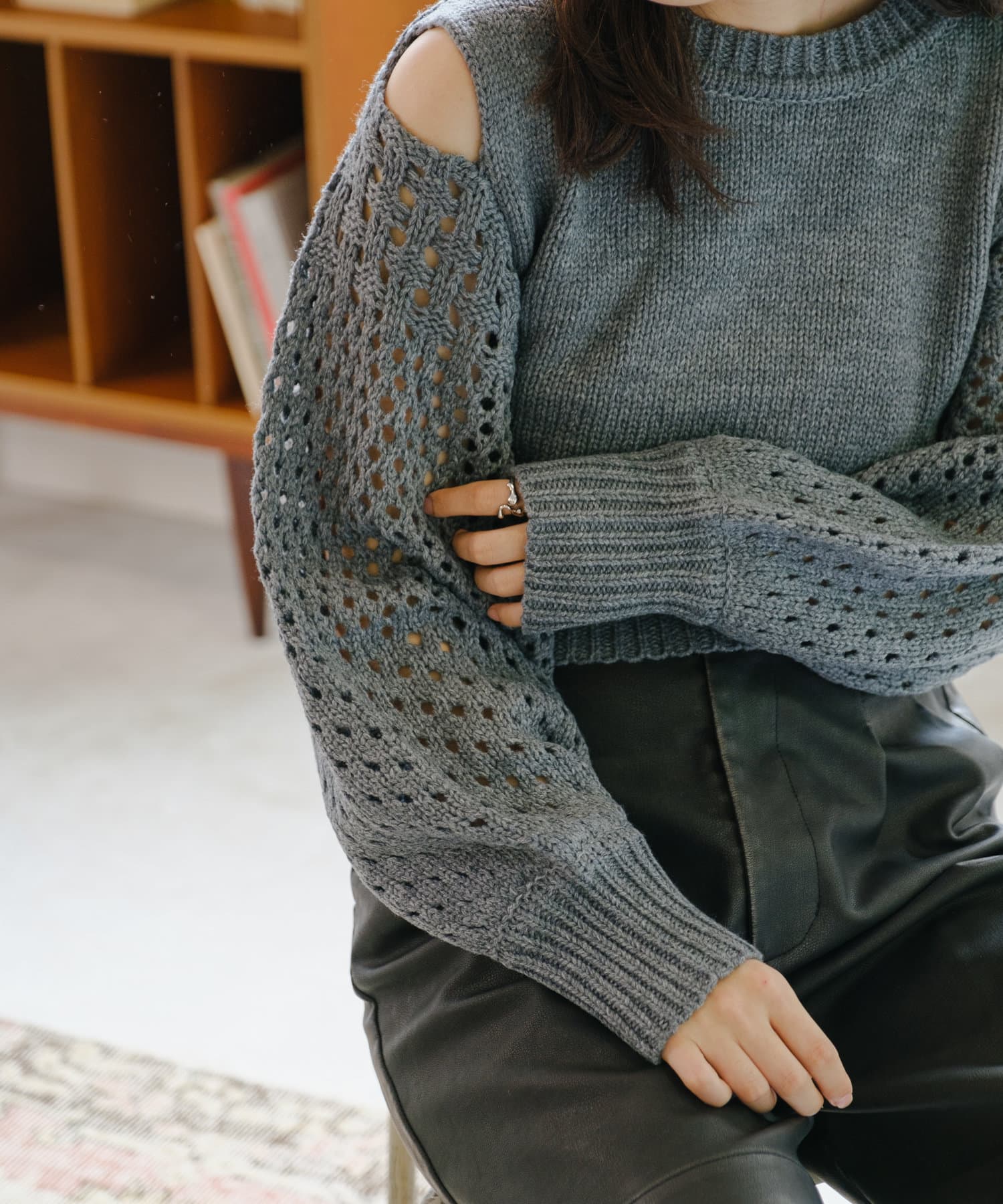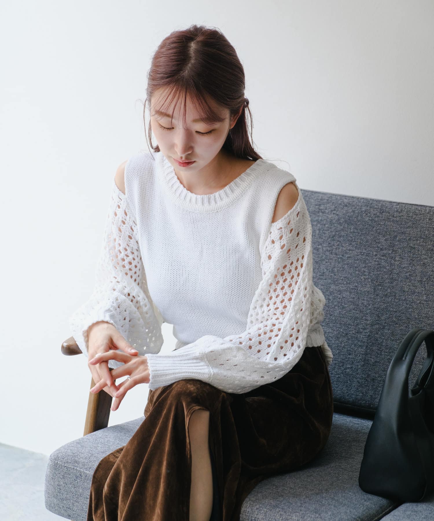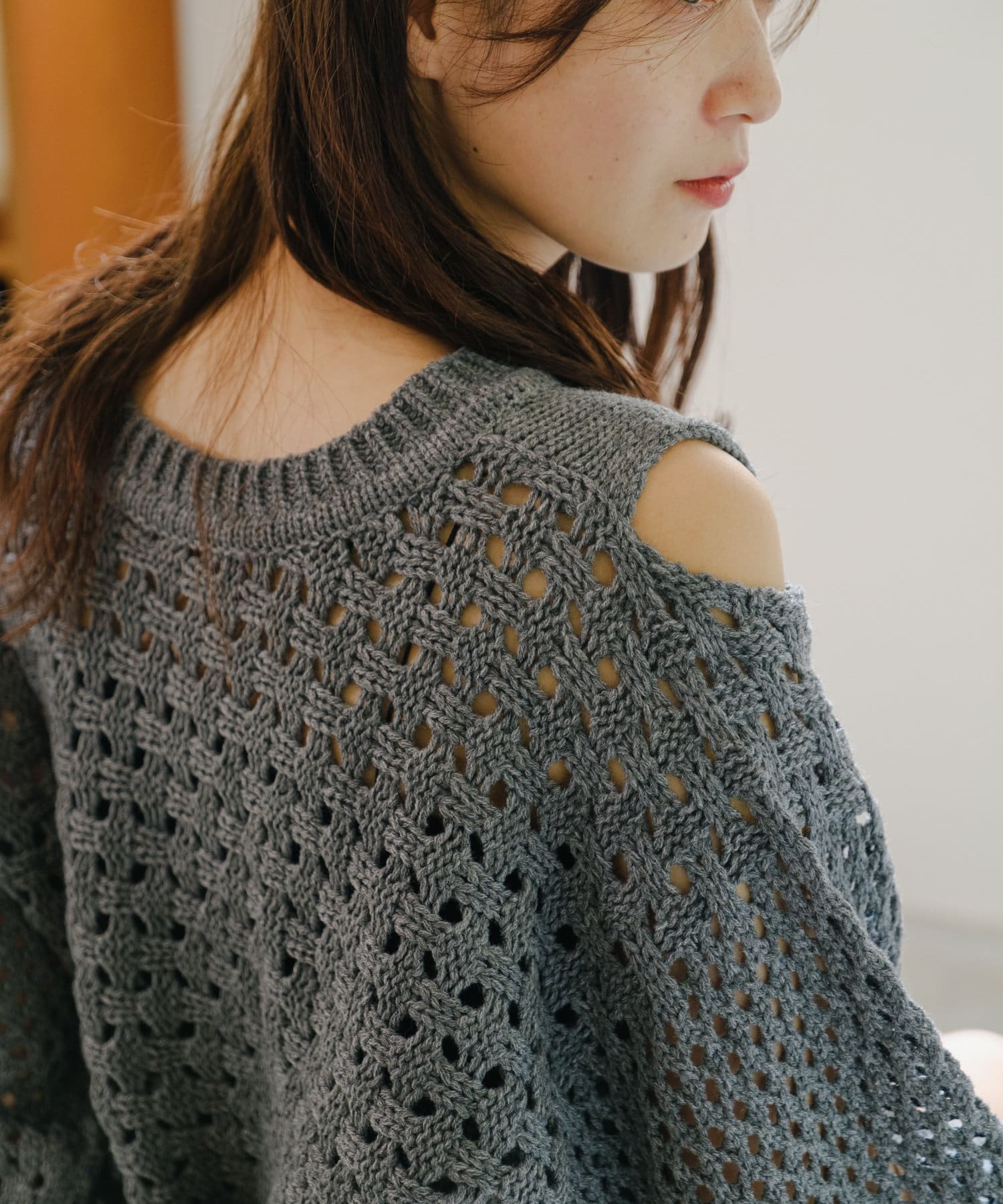 袖と背中が透かし編みなので抜け感がプラスされ、女性らしい印象になります。