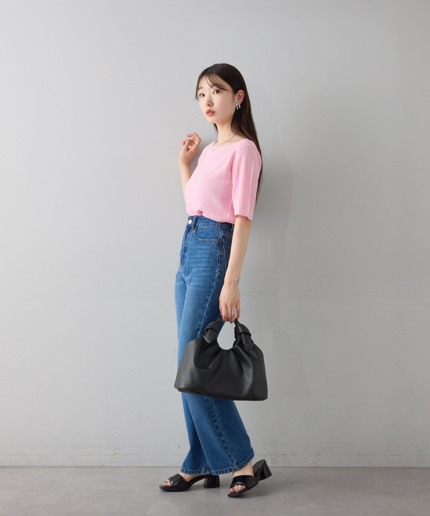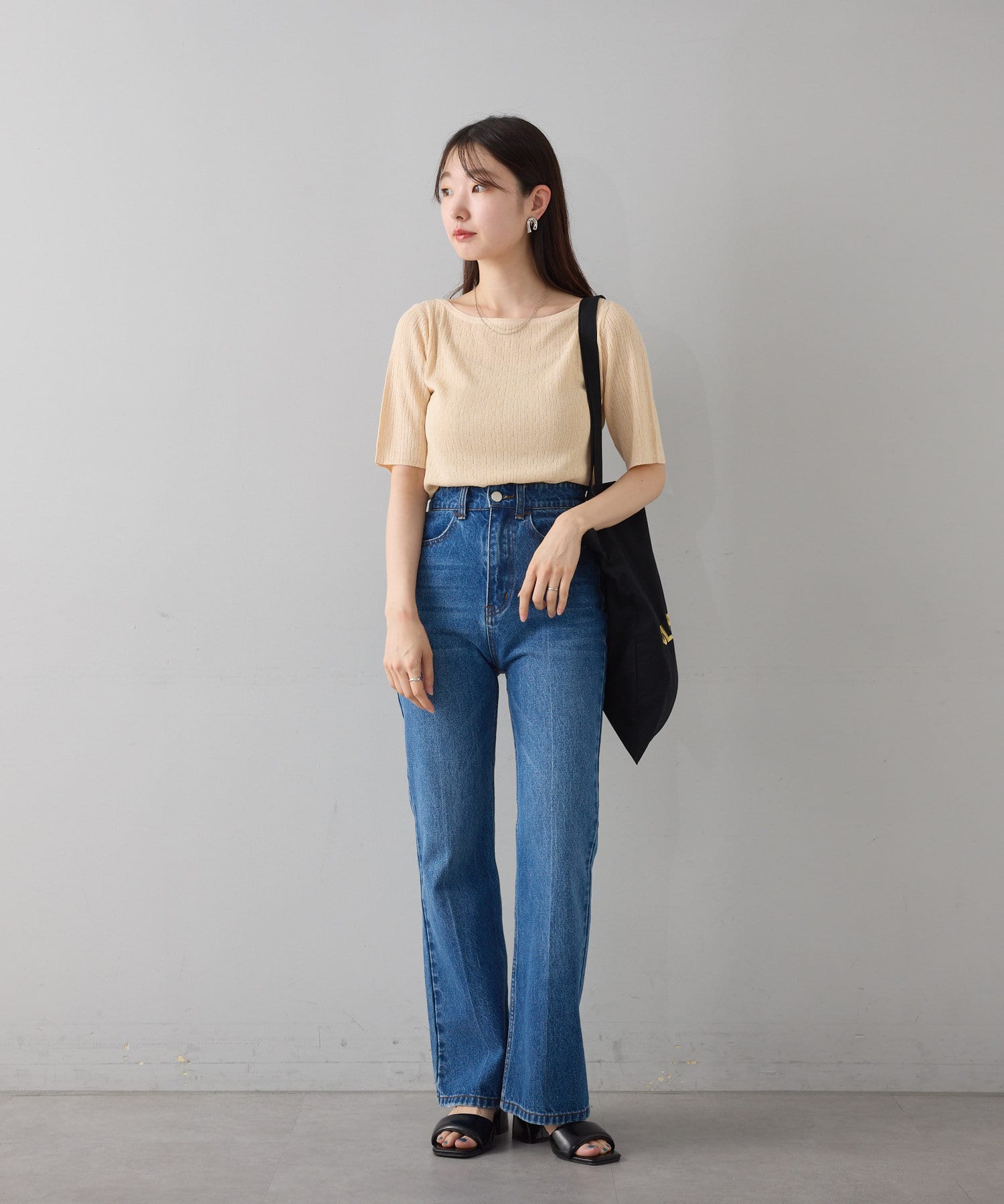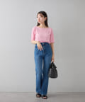 ハイウエストボトムにインして、女性らしさのあるスタイリングに。